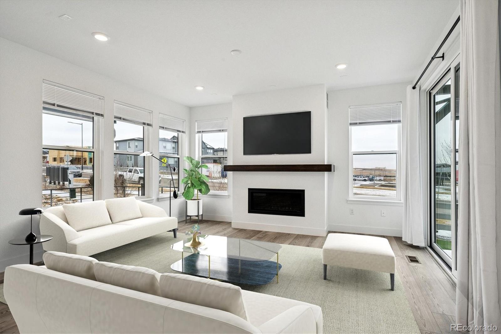 This stunning home completed in 2025 by Shea Homes is a 2-story CORNER LOT at Lyric in RidgeGate Storytellers Collection. This Eliot Plan has a contemporary design incl. a $25K premium lot offering mtn views and south-facing frontage overlooking a xeriscape greenspace corridor. HIGH-END WATERPROOF LUXURY VINYL PLANK FLOORING THROUGHOUT! A large covered front porch welcomes you inside to an open, bright, & thoughtfully designed floor plan. The sun-filled living room showcases a cozy gas fireplace w/mantle, seamlessly flowing into a spectacular kitchen complete w/QUARTZ countertops, oversized island, COMBO Micro/oven & Stove top/ovens! Abundant upgraded cabinetry & generous prep space. Just off the living area, enjoy a low-maintenance side yard w/emerald green turf w/add'l gas lines for your BBQ/FIREPIT! The main level also includes an office, spacious coat closet, guest powder bath, & direct access to the OVERSIZED 3.5 car garage. Upstairs, discover an expansive loft living area and 3 spacious bedrooms—each with an ensuite bathroom. HUGE BONUS ROOM was a $69K upgrade! The primary bedroom offers a private balcony access w/views. The upper-level laundry room includes a utility sink, ample storage. UPDGRADED finishes throughout, including designer lighting and horizontal iron railing. TWO HVAC & A/C systems, TWO Rinnai tankless hot water heaters & Quantum Fiber high-speed network by Lumen Technologies. SMART Interior/Exterior lighting w/dedicated fixtures for entertainment/special lights. Community amenities includes acres of parks, trails, & open space, + fitness center w/pool; future restaurant/bar; dog park; WALK to 2026/27 Elementary School under const. Located minutes from I-25, light rail, Sky Ridge Medical Center, premier shopping, dining, entertainment, championship golf, & major employers = Charles Schwab, Kiewit, & Lockheed Martin, located near Douglas County & private/charter schools. Why wait for new construction? This exceptional home is move-in ready now!