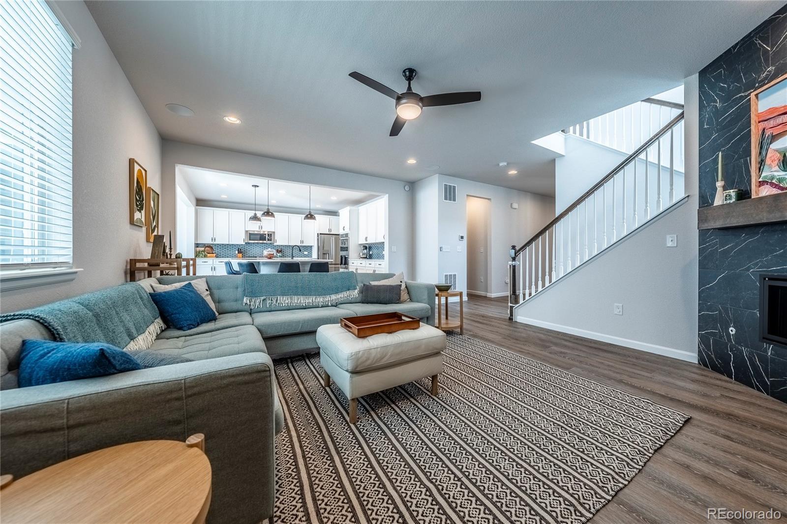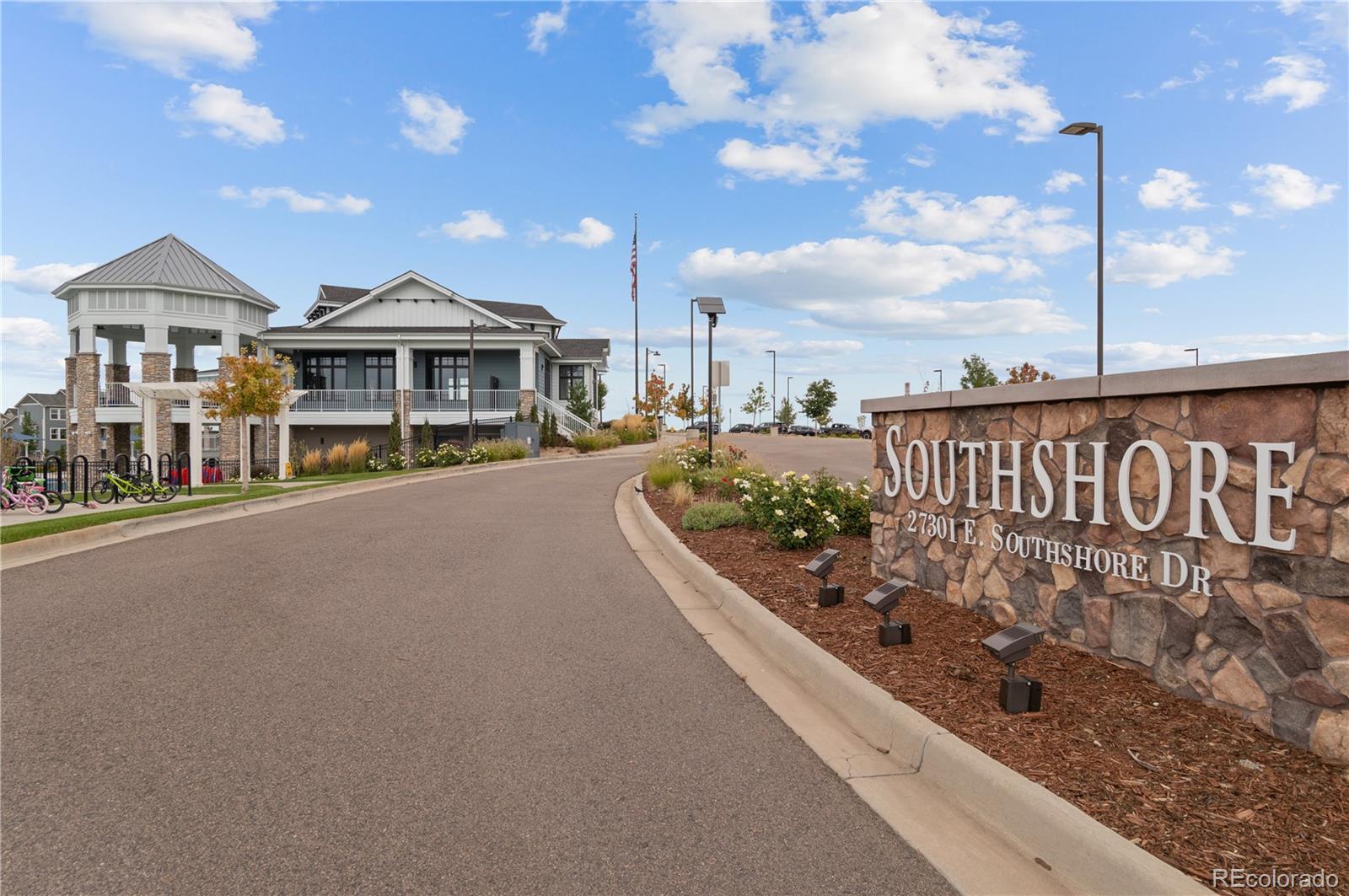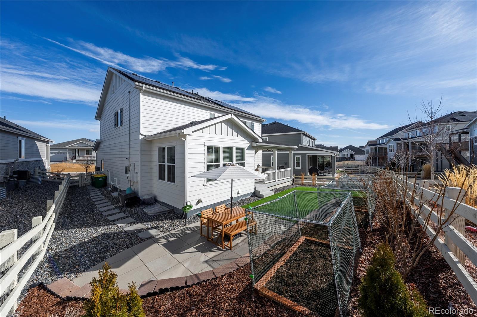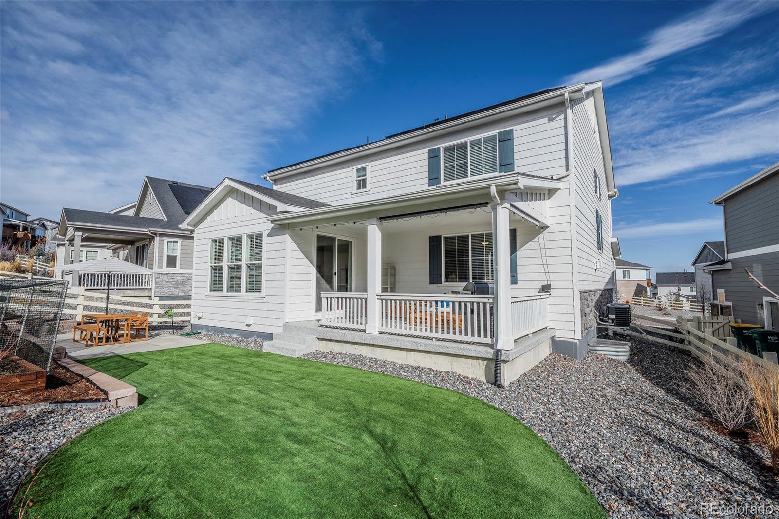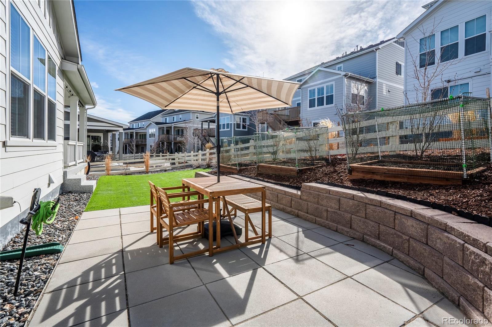 Welcome to your dream home in the highly sought-after Southshore community, where luxury, space, and lifestyle come together. This exceptional residence offers 5 bedrooms, 4 bathrooms, a main-floor office, a spacious loft, and a fully finished basement, providing flexibility for everyday living and entertaining. The open main level features luxury flooring throughout and a welcoming living room with a gas fireplace and striking tile detail. The gourmet kitchen is the heart of the home, showcasing an oversized island, white cabinetry, white stone countertops, double ovens, a gas range, and stainless steel appliances. The light-filled dining area flows seamlessly to the covered patio, creating ideal indoor and outdoor living. Upstairs, the primary suite serves as a private retreat with a spa-like bathroom. This level also includes a large loft, upstairs laundry, three additional well-sized bedrooms, and a full hall bathroom. The finished basement offers a large recreation space perfect for entertaining, a home gym, or additional living or work space, along with a bedroom, full bathroom, and generous storage. Outdoor living is thoughtfully designed with a covered patio featuring privacy screens, mature lilac bushes, vegetable garden boxes, high-end artificial turf, and an additional paved stone patio for entertaining. Additional highlights include tall ceilings, fully paid-off solar panels for low utility bills, and a two-car garage with epoxy flooring and ceiling-mounted storage. Southshore residents enjoy access to two community centers with fitness facilities, pools, splash pads, miles of scenic trails, and 120 acres of open space. The home is a short walk to Altitude Elementary School and minutes from Southlands shopping and dining.