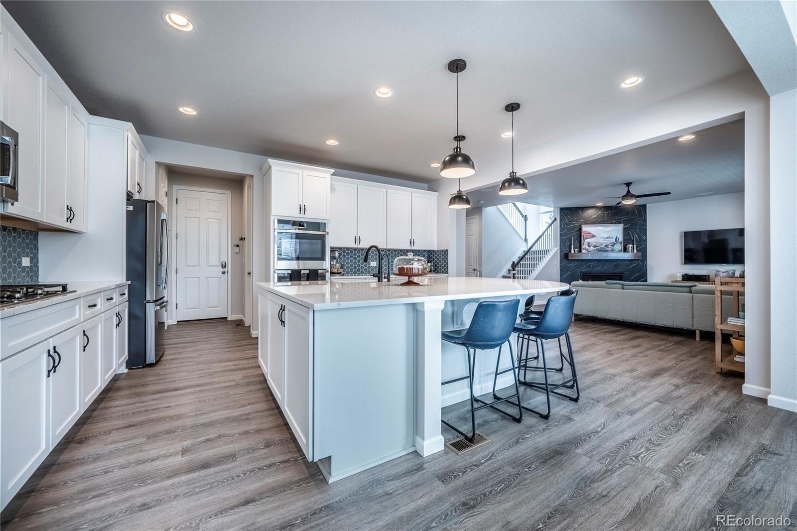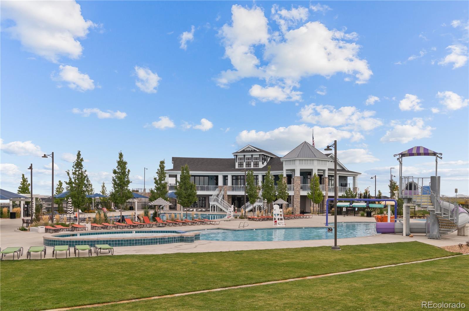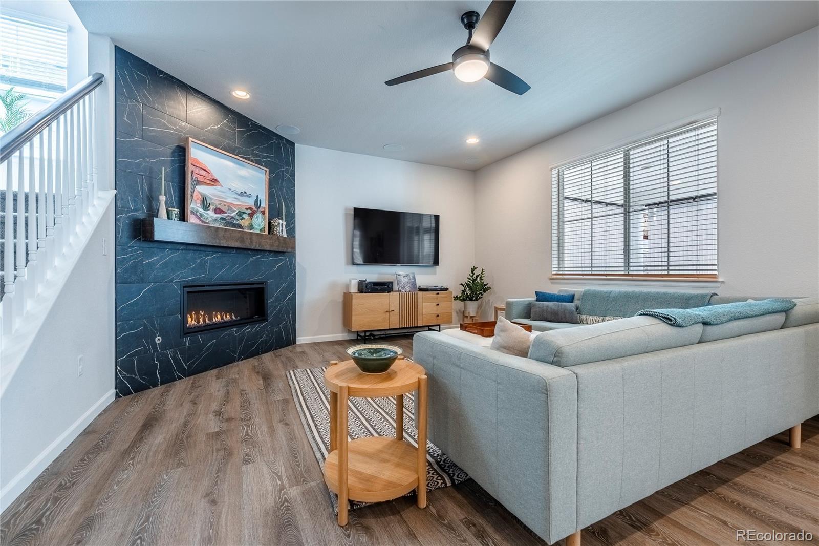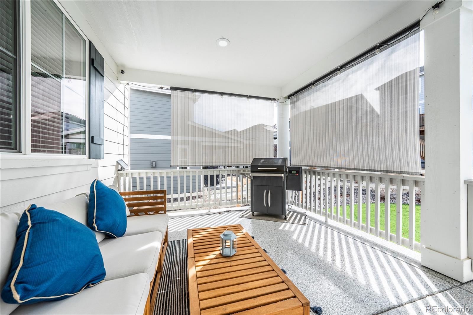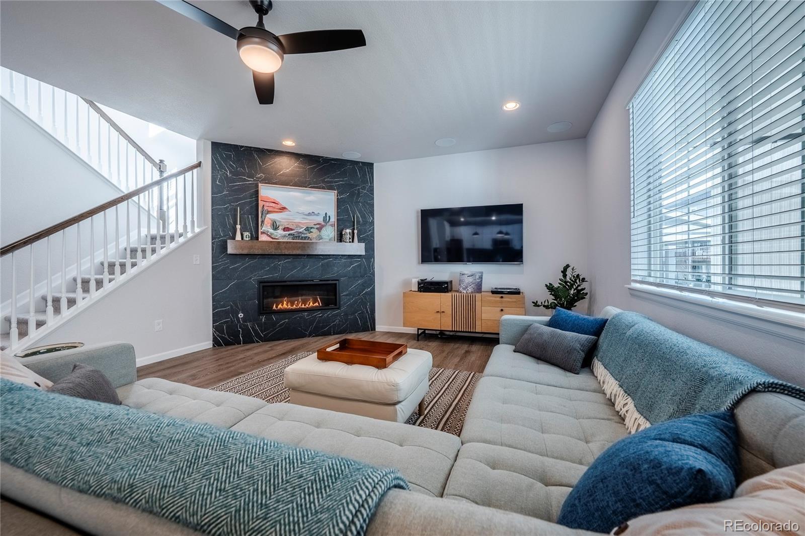 Welcome to your dream home in the highly sought-after Southshore community, where luxury, space, and lifestyle come together. This exceptional residence offers 5 bedrooms, 4 bathrooms, a main-floor office, a spacious loft, and a fully finished basement, providing flexibility for everyday living and entertaining. The open main level features luxury flooring throughout and a welcoming living room with a gas fireplace and striking tile detail. The gourmet kitchen is the heart of the home, showcasing an oversized island, white cabinetry, white stone countertops, double ovens, a gas range, and stainless steel appliances. The light-filled dining area flows seamlessly to the covered patio, creating ideal indoor and outdoor living. Upstairs, the primary suite serves as a private retreat with a spa-like bathroom. This level also includes a large loft, upstairs laundry, three additional well-sized bedrooms, and a full hall bathroom. The finished basement offers a large recreation space perfect for entertaining, a home gym, or additional living or work space, along with a bedroom, full bathroom, and generous storage. Outdoor living is thoughtfully designed with a covered patio featuring privacy screens, mature lilac bushes, vegetable garden boxes, high-end artificial turf, and an additional paved stone patio for entertaining. Additional highlights include tall ceilings, fully paid-off solar panels for low utility bills, and a two-car garage with epoxy flooring and ceiling-mounted storage. Southshore residents enjoy access to two community centers with fitness facilities, pools, splash pads, miles of scenic trails, and 120 acres of open space. The home is a short walk to Altitude Elementary School and minutes from Southlands shopping and dining.