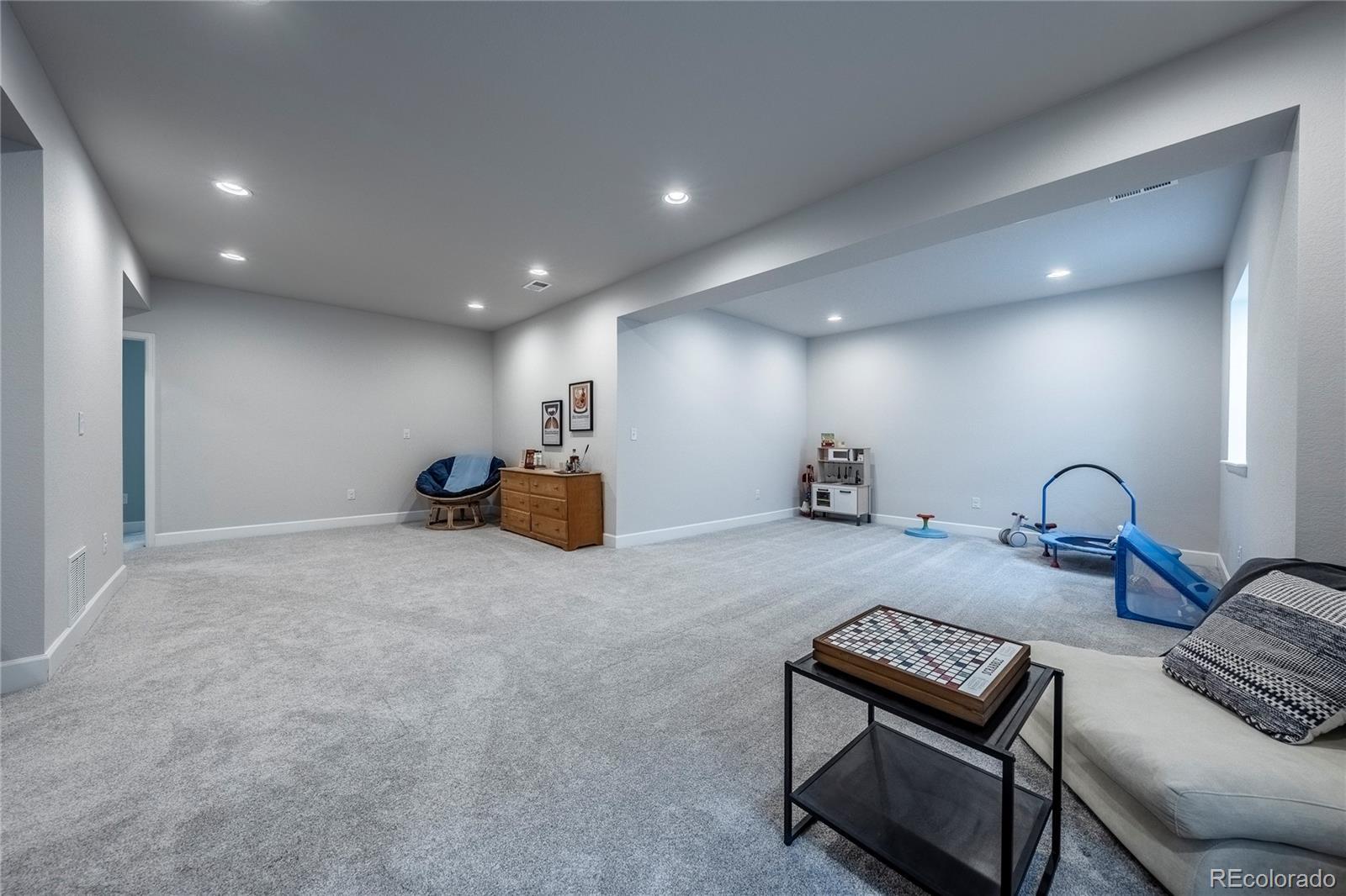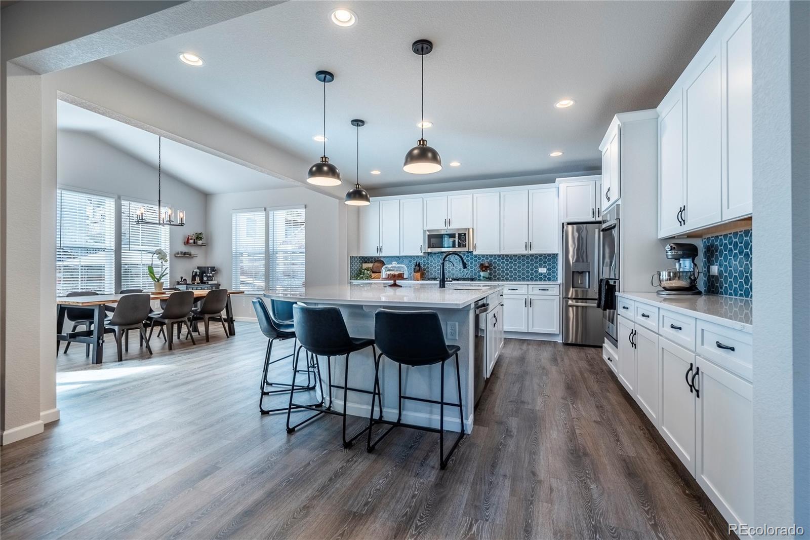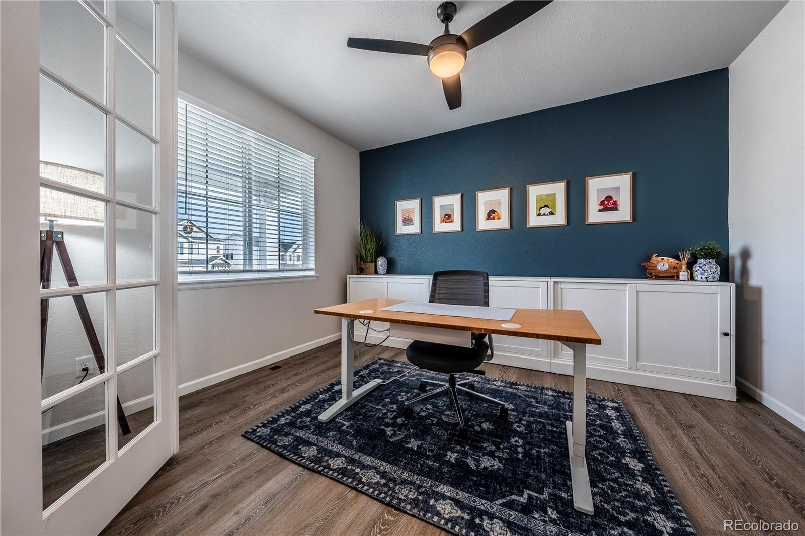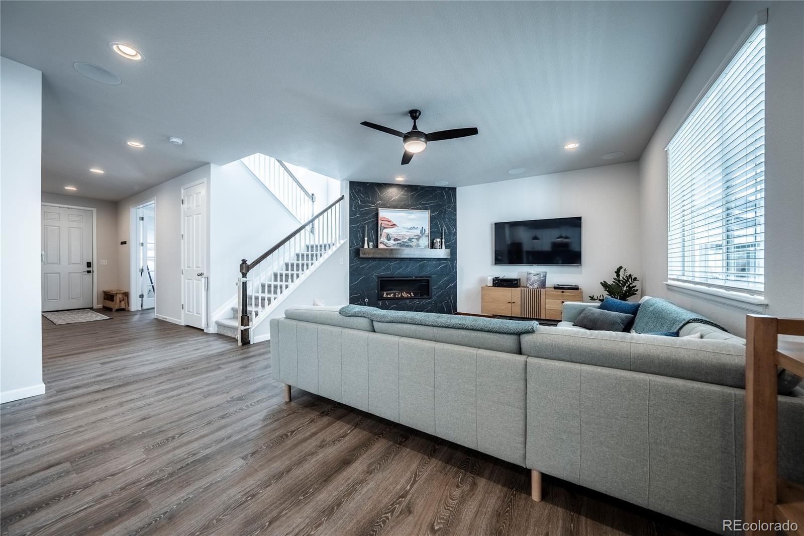 Welcome to your dream home in the highly sought-after Southshore community, where luxury, space, and lifestyle come together. This exceptional residence offers 5 bedrooms, 4 bathrooms, a main-floor office, a spacious loft, and a fully finished basement, providing flexibility for everyday living and entertaining. The open main level features luxury flooring throughout and a welcoming living room with a gas fireplace and striking tile detail. The gourmet kitchen is the heart of the home, showcasing an oversized island, white cabinetry, white stone countertops, double ovens, a gas range, and stainless steel appliances. The light-filled dining area flows seamlessly to the covered patio, creating ideal indoor and outdoor living. Upstairs, the primary suite serves as a private retreat with a spa-like bathroom. This level also includes a large loft, upstairs laundry, three additional well-sized bedrooms, and a full hall bathroom. The finished basement offers a large recreation space perfect for entertaining, a home gym, or additional living or work space, along with a bedroom, full bathroom, and generous storage. Outdoor living is thoughtfully designed with a covered patio featuring privacy screens, mature lilac bushes, vegetable garden boxes, high-end artificial turf, and an additional paved stone patio for entertaining. Additional highlights include tall ceilings, fully paid-off solar panels for low utility bills, and a two-car garage with epoxy flooring and ceiling-mounted storage. Southshore residents enjoy access to two community centers with fitness facilities, pools, splash pads, miles of scenic trails, and 120 acres of open space. The home is a short walk to Altitude Elementary School and minutes from Southlands shopping and dining.