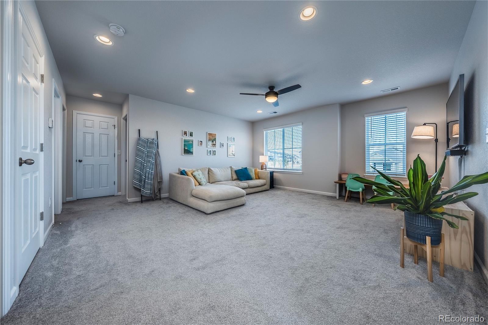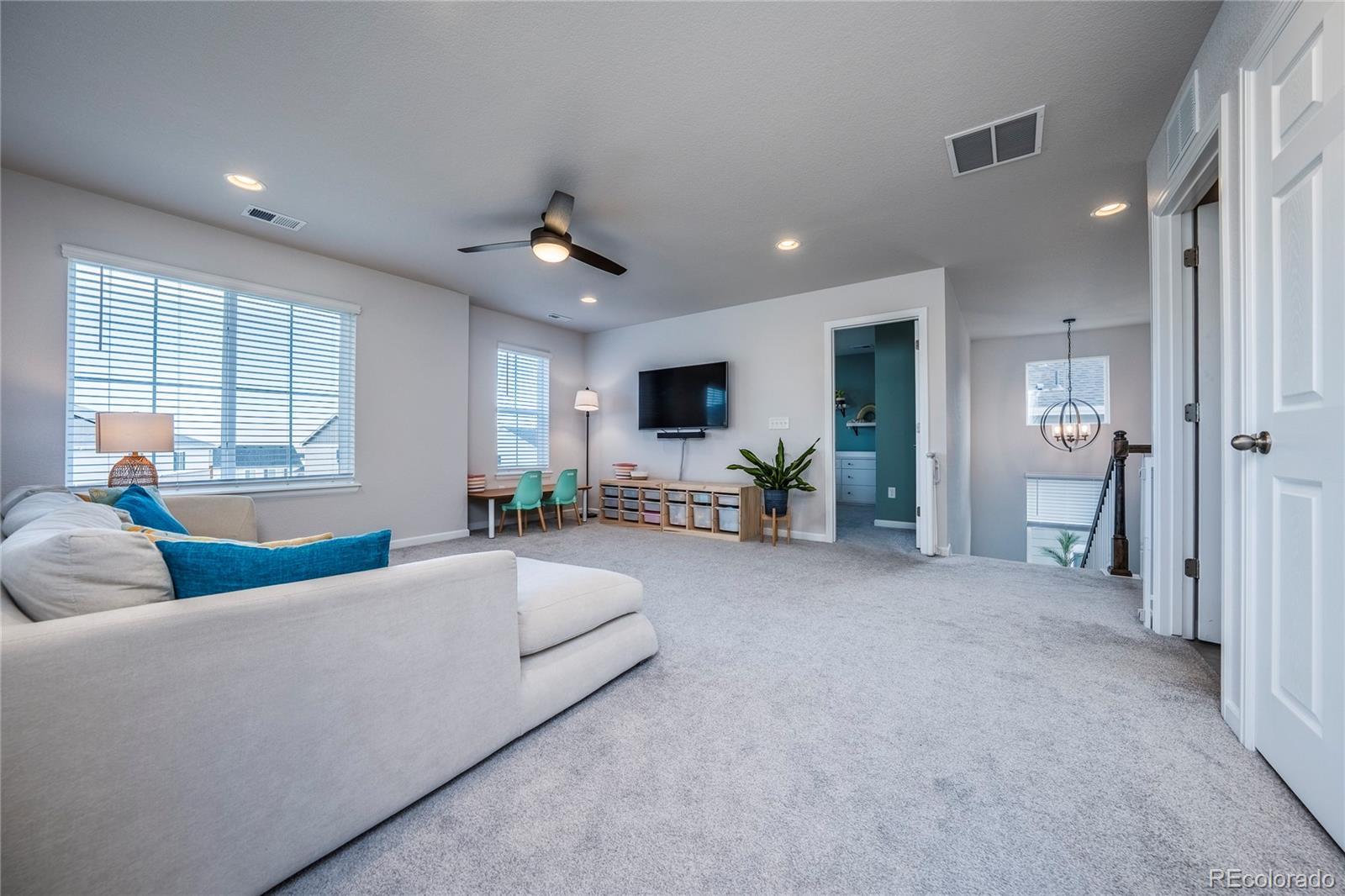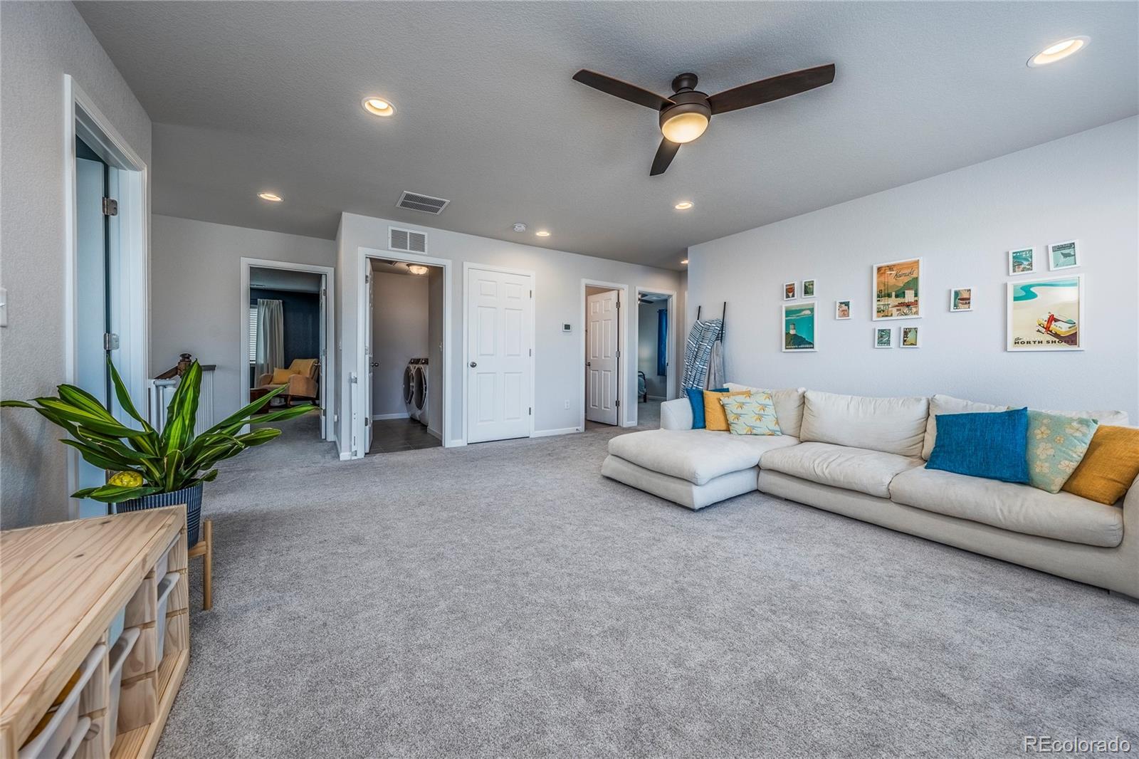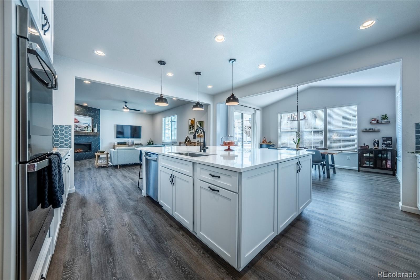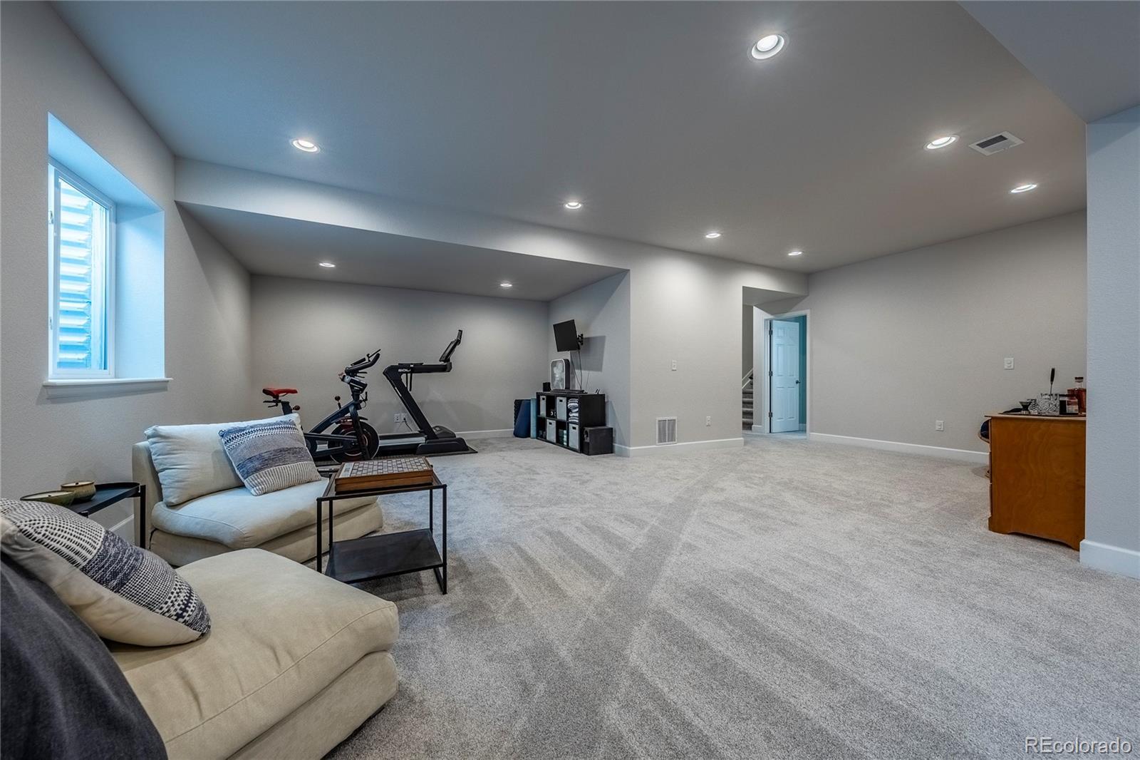 Welcome to your dream home in the highly sought-after Southshore community, where luxury, space, and lifestyle come together. This exceptional residence offers 5 bedrooms, 4 bathrooms, a main-floor office, a spacious loft, and a fully finished basement, providing flexibility for everyday living and entertaining. The open main level features luxury flooring throughout and a welcoming living room with a gas fireplace and striking tile detail. The gourmet kitchen is the heart of the home, showcasing an oversized island, white cabinetry, white stone countertops, double ovens, a gas range, and stainless steel appliances. The light-filled dining area flows seamlessly to the covered patio, creating ideal indoor and outdoor living. Upstairs, the primary suite serves as a private retreat with a spa-like bathroom. This level also includes a large loft, upstairs laundry, three additional well-sized bedrooms, and a full hall bathroom. The finished basement offers a large recreation space perfect for entertaining, a home gym, or additional living or work space, along with a bedroom, full bathroom, and generous storage. Outdoor living is thoughtfully designed with a covered patio featuring privacy screens, mature lilac bushes, vegetable garden boxes, high-end artificial turf, and an additional paved stone patio for entertaining. Additional highlights include tall ceilings, fully paid-off solar panels for low utility bills, and a two-car garage with epoxy flooring and ceiling-mounted storage. Southshore residents enjoy access to two community centers with fitness facilities, pools, splash pads, miles of scenic trails, and 120 acres of open space. The home is a short walk to Altitude Elementary School and minutes from Southlands shopping and dining.