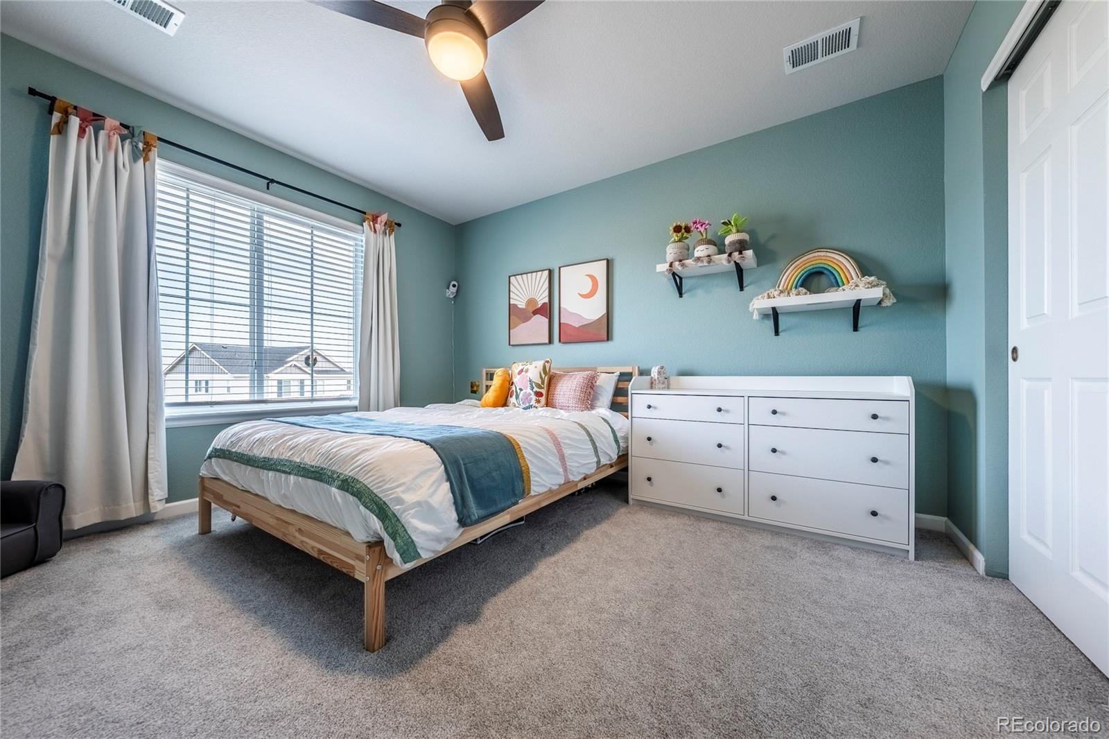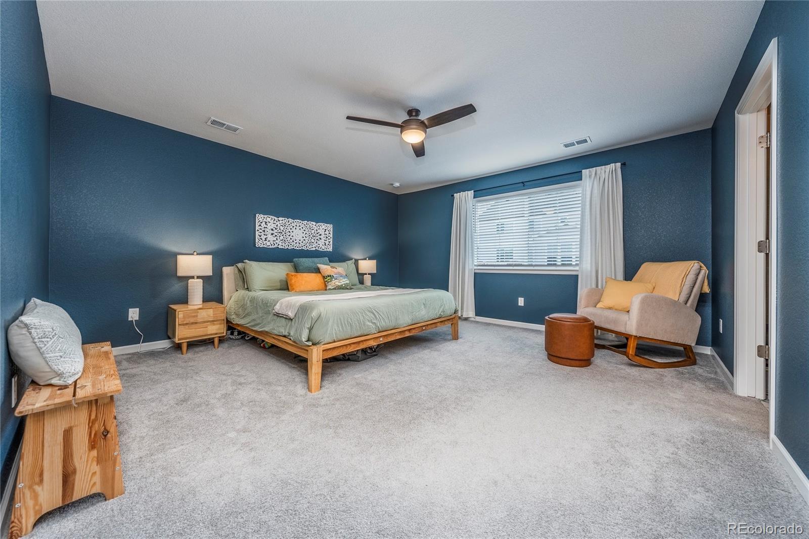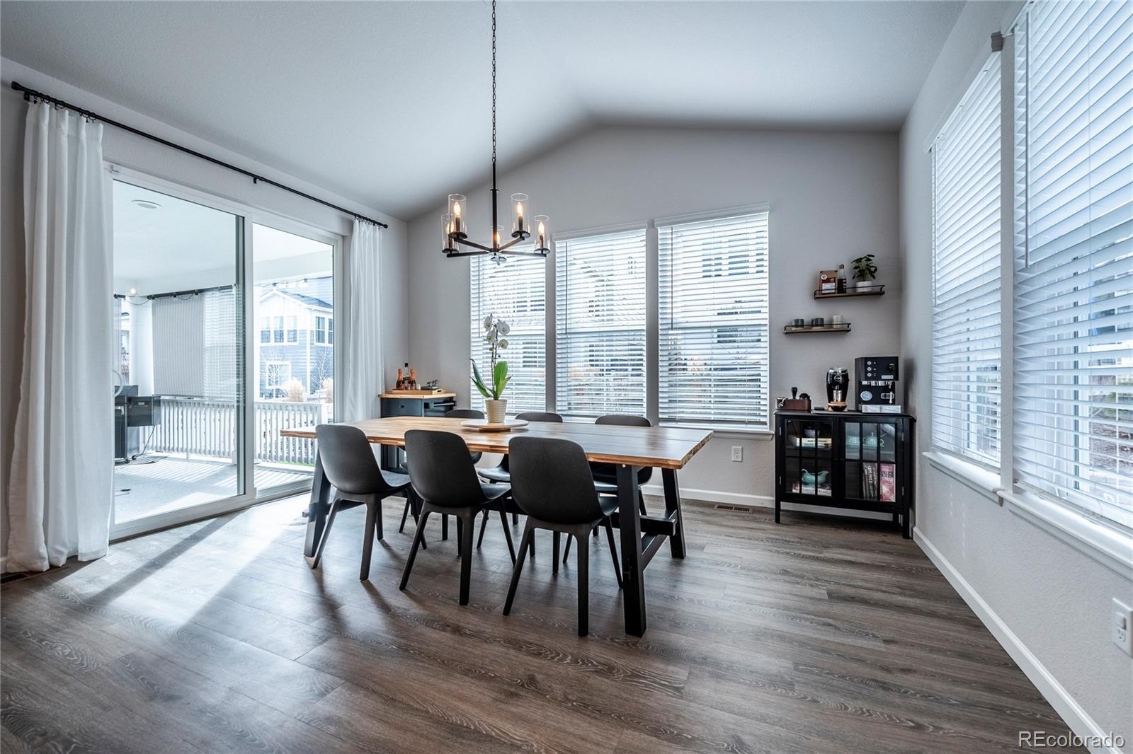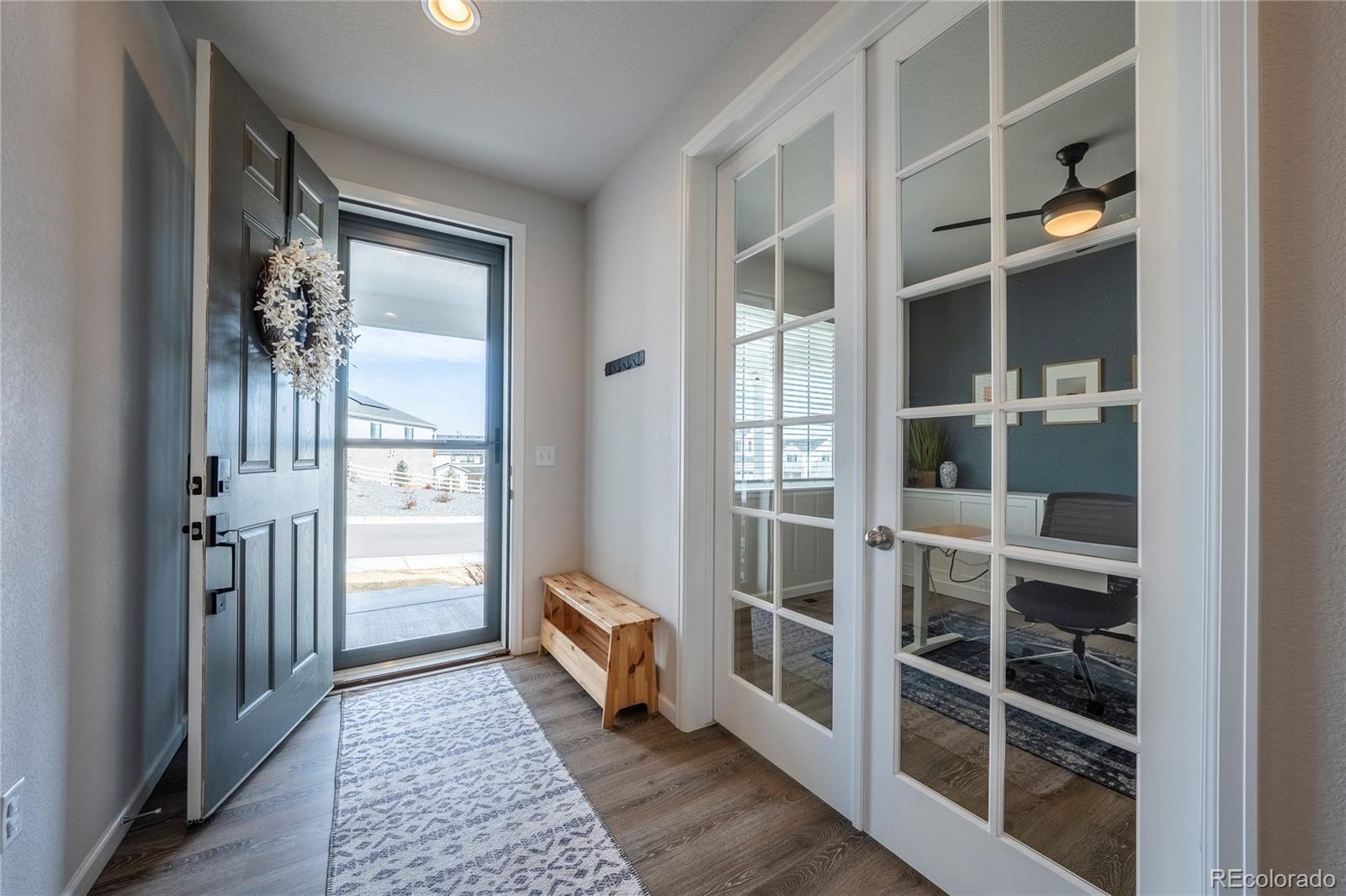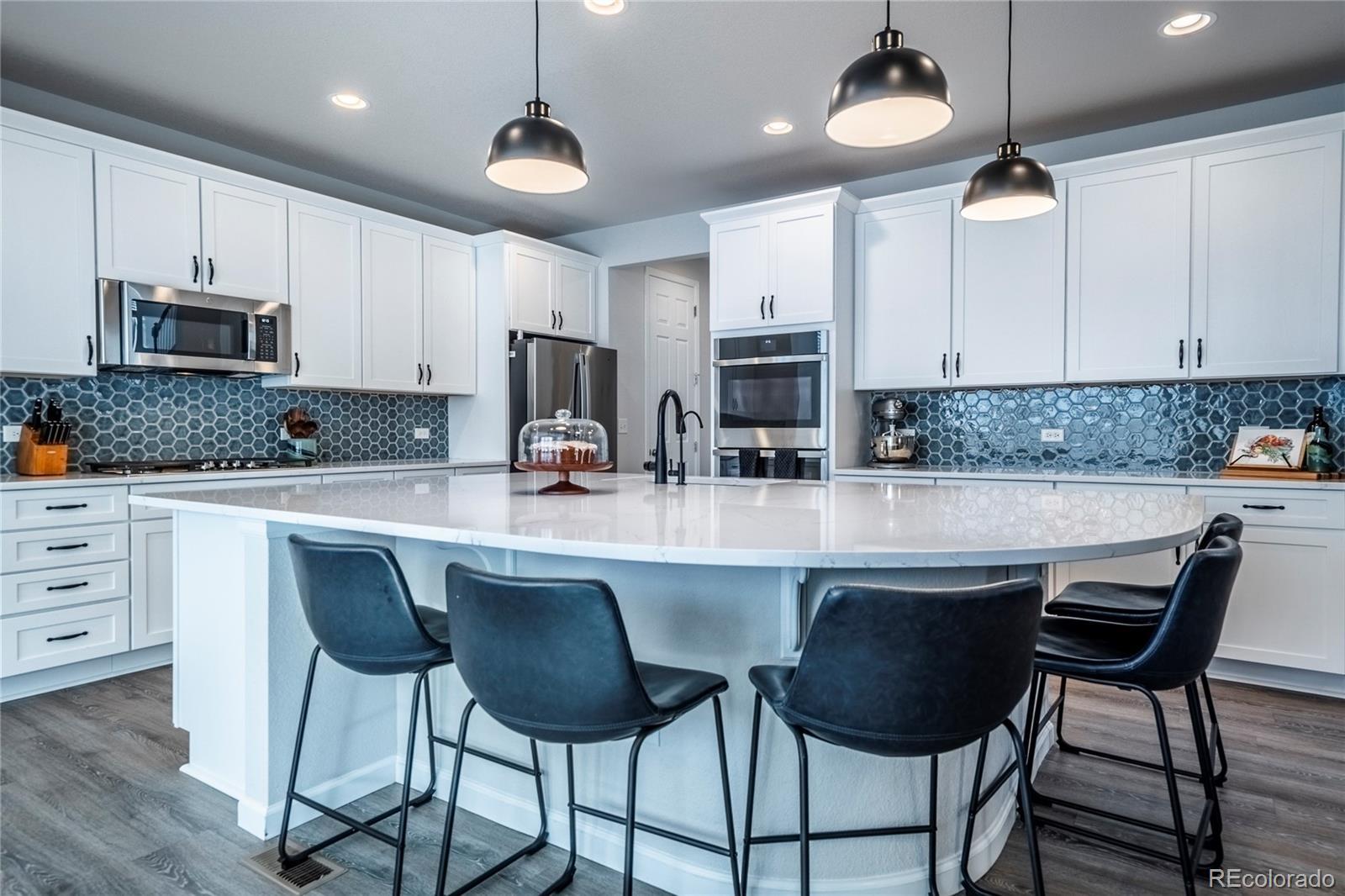 Welcome to your dream home in the highly sought-after Southshore community, where luxury, space, and lifestyle come together. This exceptional residence offers 5 bedrooms, 4 bathrooms, a main-floor office, a spacious loft, and a fully finished basement, providing flexibility for everyday living and entertaining. The open main level features luxury flooring throughout and a welcoming living room with a gas fireplace and striking tile detail. The gourmet kitchen is the heart of the home, showcasing an oversized island, white cabinetry, white stone countertops, double ovens, a gas range, and stainless steel appliances. The light-filled dining area flows seamlessly to the covered patio, creating ideal indoor and outdoor living. Upstairs, the primary suite serves as a private retreat with a spa-like bathroom. This level also includes a large loft, upstairs laundry, three additional well-sized bedrooms, and a full hall bathroom. The finished basement offers a large recreation space perfect for entertaining, a home gym, or additional living or work space, along with a bedroom, full bathroom, and generous storage. Outdoor living is thoughtfully designed with a covered patio featuring privacy screens, mature lilac bushes, vegetable garden boxes, high-end artificial turf, and an additional paved stone patio for entertaining. Additional highlights include tall ceilings, fully paid-off solar panels for low utility bills, and a two-car garage with epoxy flooring and ceiling-mounted storage. Southshore residents enjoy access to two community centers with fitness facilities, pools, splash pads, miles of scenic trails, and 120 acres of open space. The home is a short walk to Altitude Elementary School and minutes from Southlands shopping and dining.