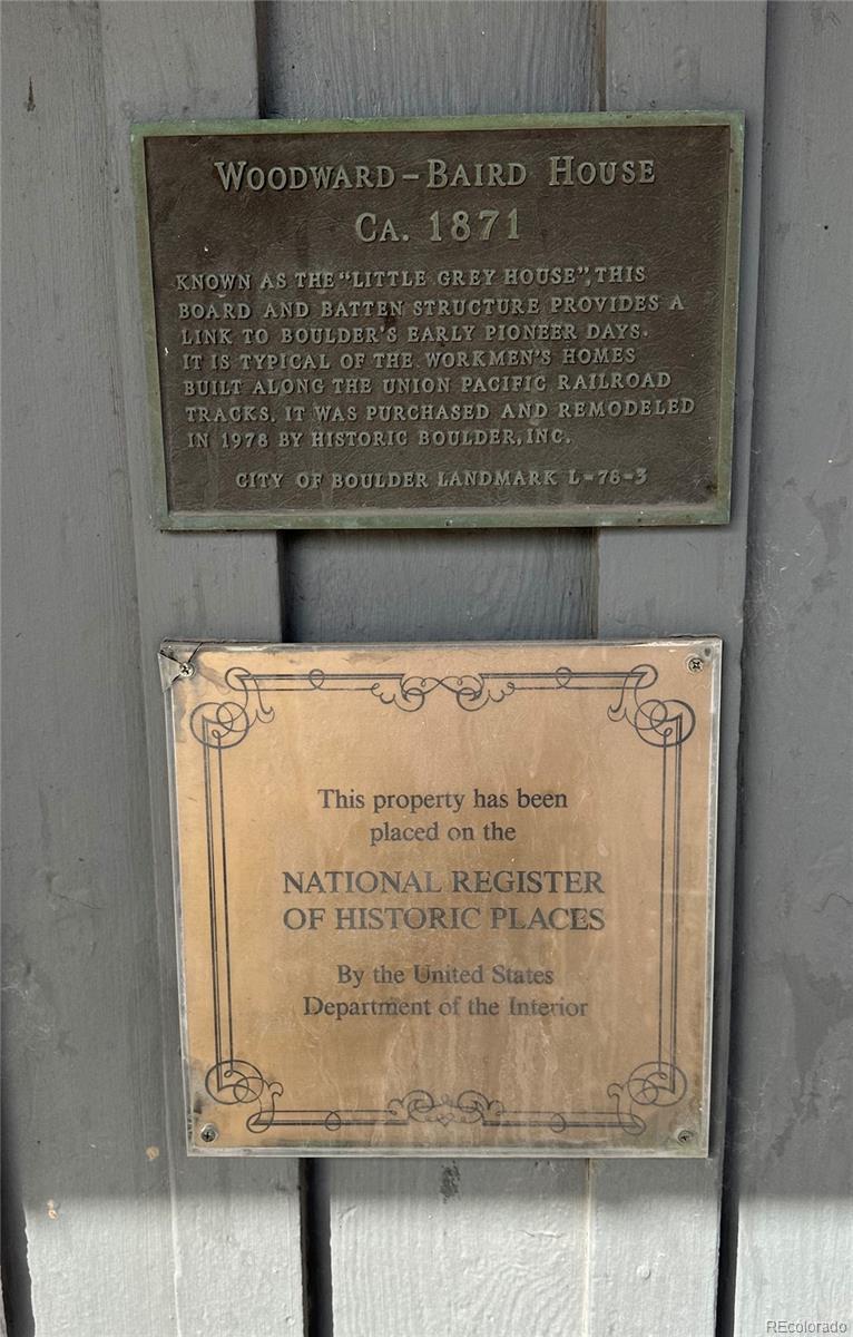 Rare opportunity to acquire a user/redevelopment property located two blocks from Pearl Street in downtown Boulder. Used and zoned for an office use, the “Little Grey House” is both a City of Boulder Landmark property in the Chamberlain Historic District and is on the National Register of Historic Places. Rich in history, the property was purchased by Historic Boulder in 1978 when it was remodeled and began its use as an office property. The property has been used as a private law firm office the past 25 years. The property is ideal for any small business owner who desires to be in downtown Boulder in their own private office building. Additionally, the RH-2 zoning provides for an opportunity to convert to offices to a residential use AND to potentially build an additional home ("dwelling unit") on the property. Set on a 6,500 sq ft lot, the office building, an excellent example of a vernacular wood framed house, is approximately 1,044 sq ft. with about 750 sq ft. on the main floor and an upper floor of nearly 300 sq ft. The building features 3 private offices, a waiting area, kitchen area, bathroom and file copy area. There is also a small metal storage shed on-site along with four parking spaces off the alley. Potential Development Opportunity to Convert to Residential Use and/or build additional residence on the property. Zoning: RH-2. Currently approved for office use. Conditional Approved uses include Medical Office, Art Studio, Personal Service, and Media Production. Disclosure: Broker is related to Seller.