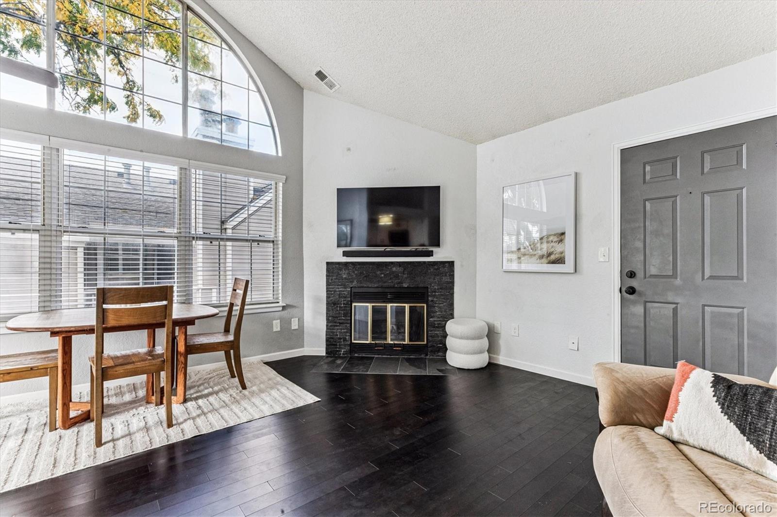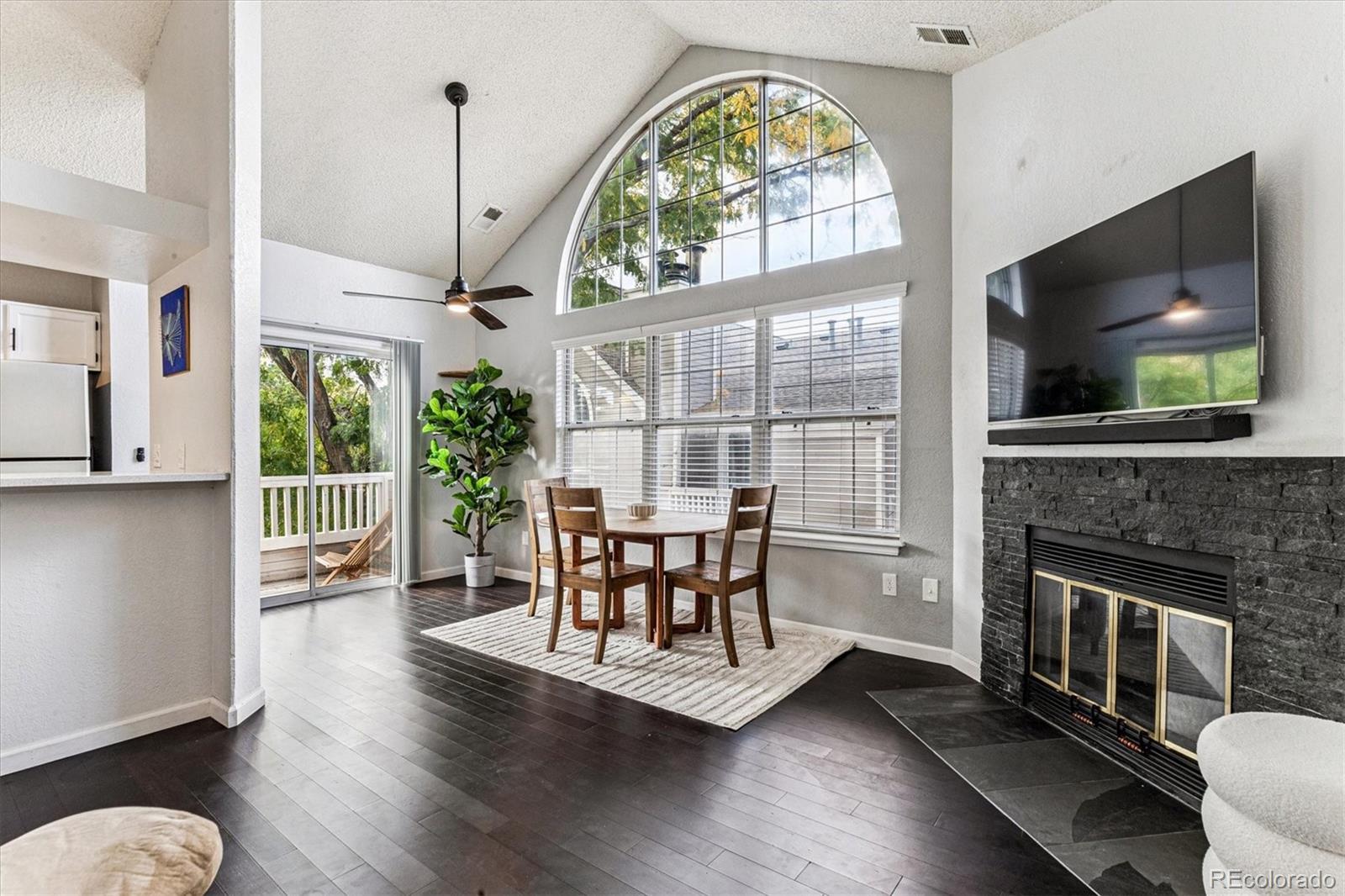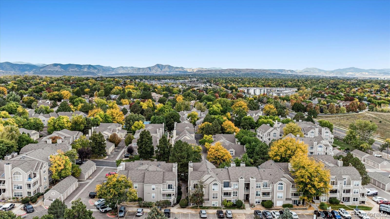 Come discover this beautifully refreshed top-floor condo in the sought-after Sunpointe at Lakewood Estates. Step inside to an airy, open living space where natural light pours through the dramatic arch window, accenting the 14-foot cathedral ceilings. A wood-burning fireplace creates a cozy centerpiece, while the newly updated kitchen impresses with quartz countertops, a sleek glass tile backsplash, stainless steel appliances, and an oversized sink that will make you rethink everyday living. The primary bedroom features its own vaulted ceiling and arch window with serene views of mature trees and the community pond, complete with a soothing water feature in the warmer months. The secondary bedroom connects to a stylishly updated bathroom showcasing a new tiled shower, marble-topped dual vanity, and ample storage. Step outside to the private deck—a perfect spot to relax, surrounded by greenery and fresh Colorado air. The community itself feels more like a neighborhood, with winding sidewalks for evening walks, lush landscaping, a pool, firepit, and gathering space. Despite the quiet setting, Belmar’s shops, restaurants, and entertainment are just minutes away, with countless other conveniences nearby. This home truly balances tranquility and accessibility—don’t miss the chance to make it yours!
