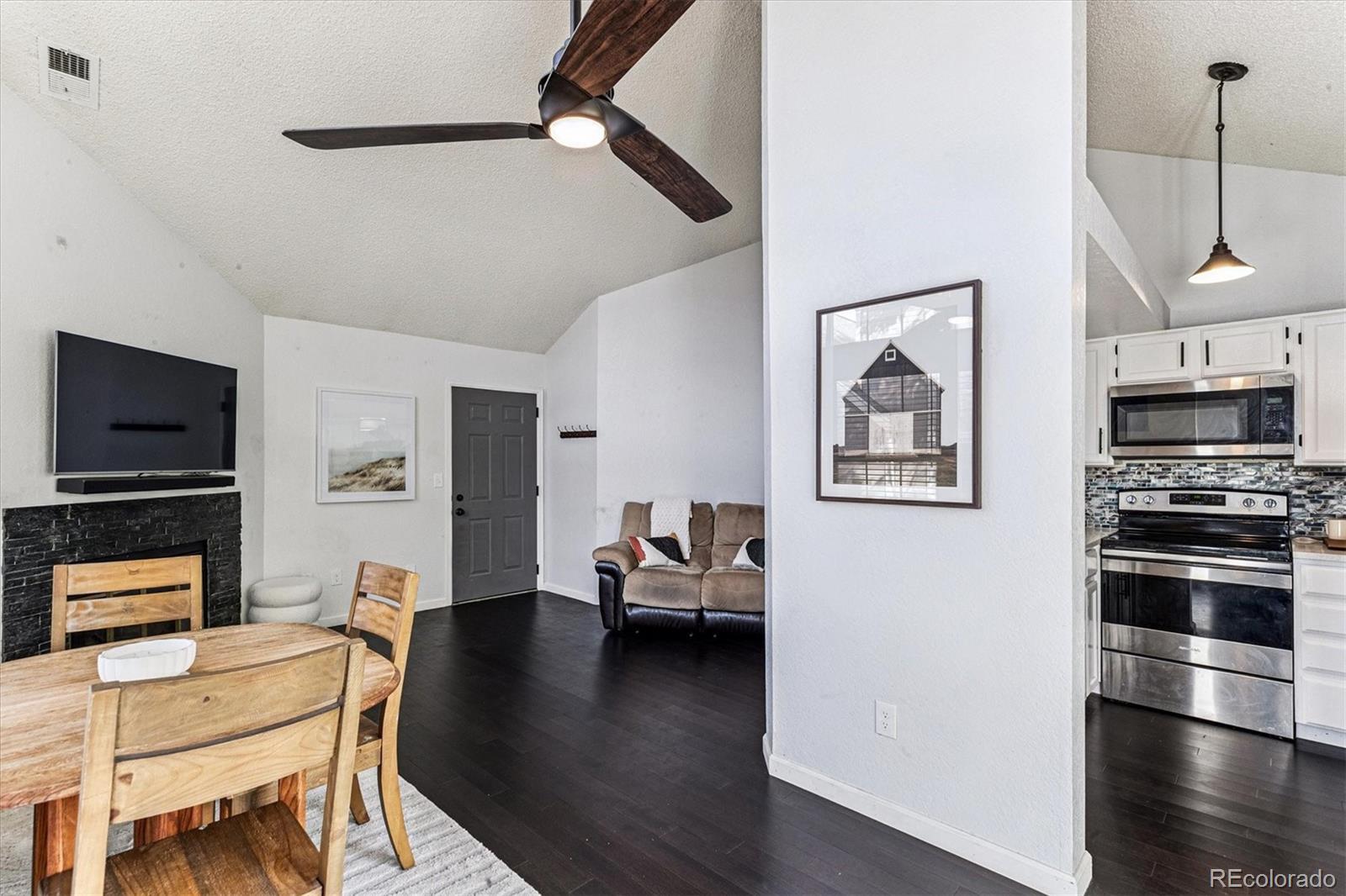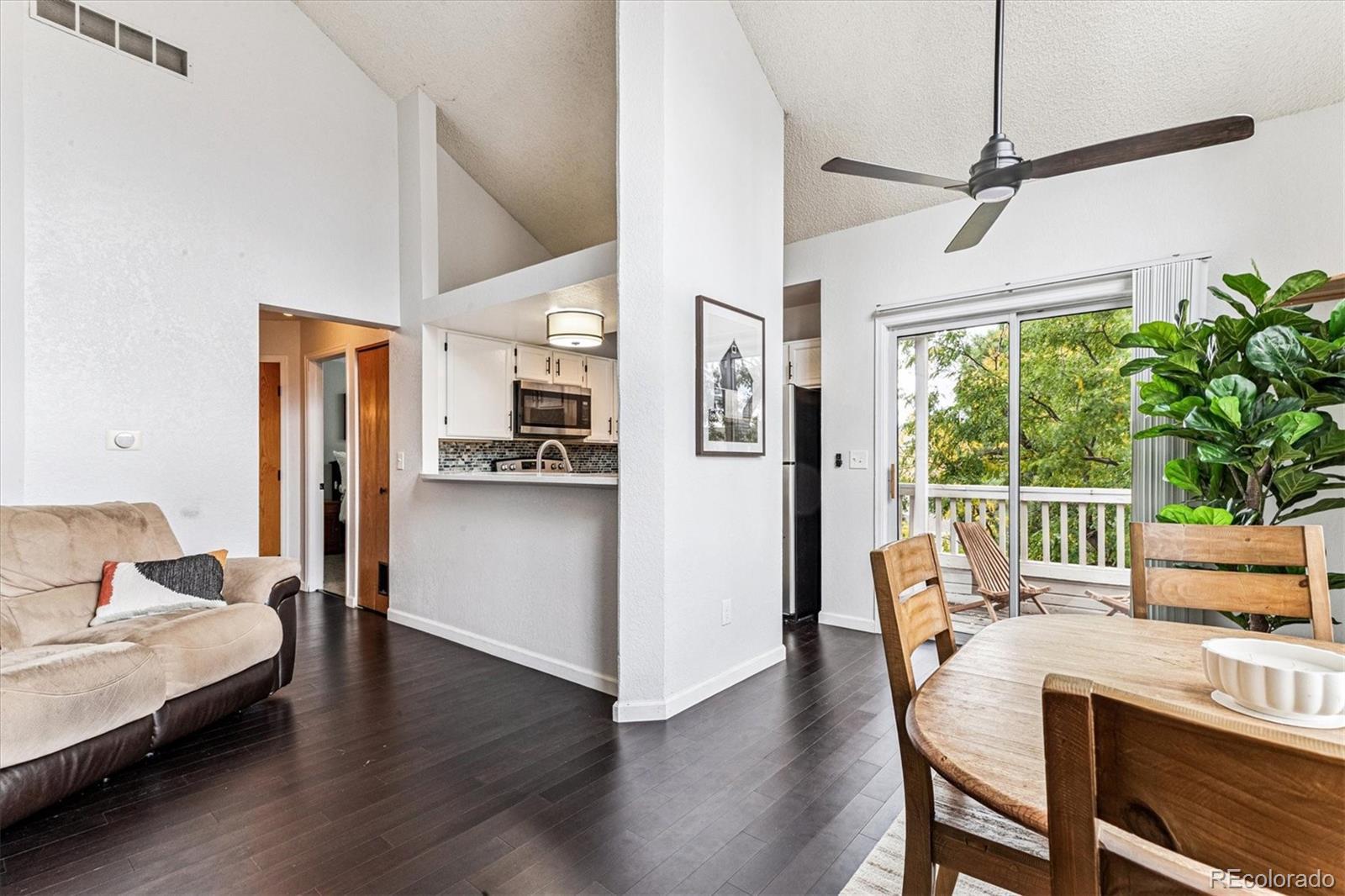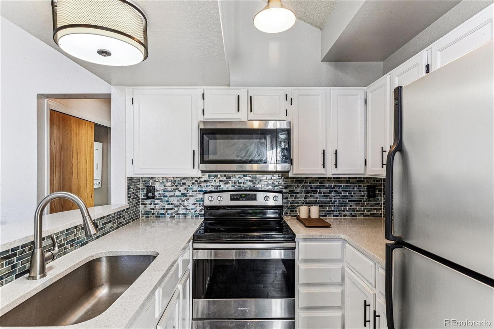 Come discover this beautifully refreshed top-floor condo in the sought-after Sunpointe at Lakewood Estates. Step inside to an airy, open living space where natural light pours through the dramatic arch window, accenting the 14-foot cathedral ceilings. A wood-burning fireplace creates a cozy centerpiece, while the newly updated kitchen impresses with quartz countertops, a sleek glass tile backsplash, stainless steel appliances, and an oversized sink that will make you rethink everyday living. The primary bedroom features its own vaulted ceiling and arch window with serene views of mature trees and the community pond, complete with a soothing water feature in the warmer months. The secondary bedroom connects to a stylishly updated bathroom showcasing a new tiled shower, marble-topped dual vanity, and ample storage. Step outside to the private deck—a perfect spot to relax, surrounded by greenery and fresh Colorado air. The community itself feels more like a neighborhood, with winding sidewalks for evening walks, lush landscaping, a pool, firepit, and gathering space. Despite the quiet setting, Belmar’s shops, restaurants, and entertainment are just minutes away, with countless other conveniences nearby. This home truly balances tranquility and accessibility—don’t miss the chance to make it yours!