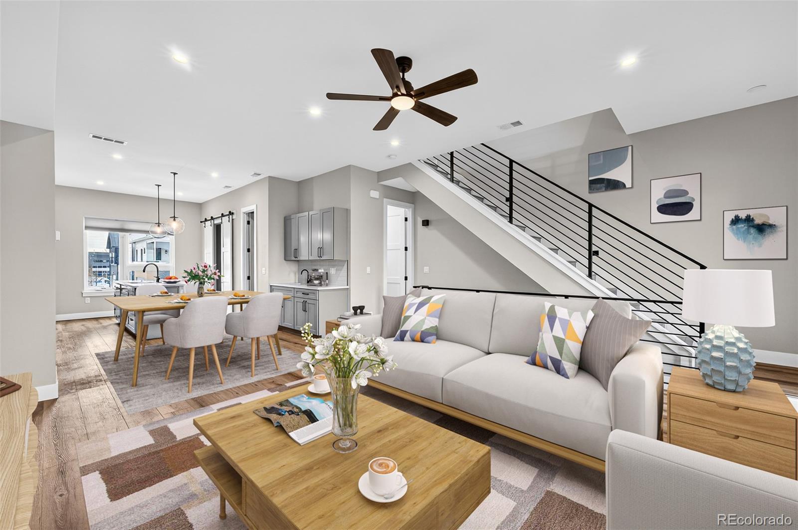 Architectural style meets everyday livability in this modern, west-facing townhome located in the heart of Central Park. A gated and fenced private front porch welcomes you inside, offering both privacy and curb appeal. Thoughtfully designed with high ceilings, abundant natural light, and a private outdoor space on every level, this home captures stunning mountain views and sunset light throughout. The flexible floorplan provides for ideal separation and functionality. The lower level includes a private bedroom with a ¾ bathroom and direct access from the attached two-car garage. The main living level is the centerpiece of the home, showcasing an open layout with high ceilings, a bonus room ideal for an office or dining space, its own ½ bathroom, walk-in pantry, wet bar, and a bright, west-facing living area that opens to a private balcony. Hunter Douglas Duette energy-efficient shades with a top-down/bottom-up system enhances both comfort and privacy throughout. Upstairs, the spacious primary suite enjoys mountain views, a full en suite bathroom, and convenient access to laundry. A second upper-level bedroom also features its own en suite bathroom, creating a true bedroom-plus-bathroom-for-every-room setup. Ceiling fans are installed in all bedrooms and the living room, and the home includes a washer and dryer. A crawl space provides exceptional additional storage. Additional highlights include an EV-ready 2-car garage and multiple private outdoor spaces. The location is equally impressive—just two blocks from the Central Park A-Line station with direct access to Downtown Denver and DIA, mere blocks from Central Park’s 80-acre green space, and within walking distance to restaurants, grocery stores, shops, trails, and Swigert Elementary. With easy access to I-70, this home offers the perfect balance of modern design, low-maintenance living, and unbeatable connectivity.