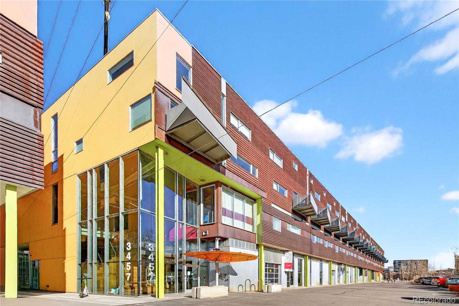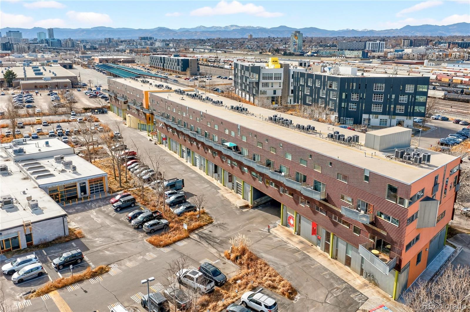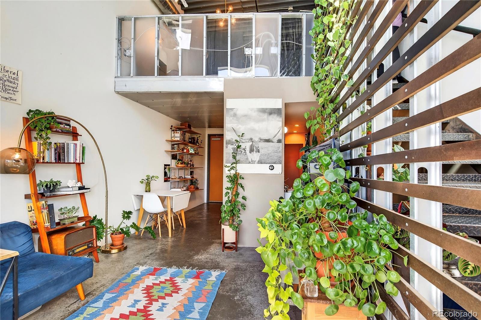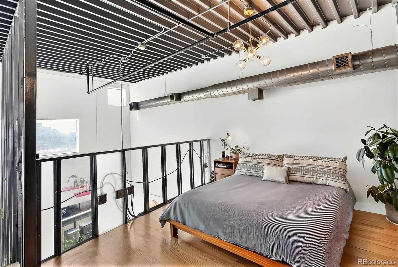 Discover stylish city living in this beautifully updated open light and bright 1-bed, 1-bath loft in the vibrant TAXI community - a dynamic live/work/play neighborhood in Denver’s sought-after RiNo Arts District. At 662 sf with 22 ft ceilings, this thoughtfully designed home pairs modern comfort with urban energy and endless lifestyle conveniences, in a serene and quiet building filled with harmonious architectural and aesthetic appointments at every turn. This unit has been modified to expand the upper bedroom over the kitchen, adding 60 sf to the original floor plan, which allows for a king sized bed with room to spare. The well-appointed kitchen features stainless steel counter tops and shelves, Bosch appliances, and soft-close drawers. Retreat up the custom designed industrial staircase to the bedroom sanctuary, complete with sprung hardwood floors, and a walk-in closet with an in-unit washer/dryer for true ease of living. On the main floor, the modern bathroom features clean, contemporary finishes. Living at TAXI means more than a great home - it’s a lifestyle. This unique mixed-use community celebrates creativity, collaboration, and connection with amenities designed to elevate daily life, including co-working spaces, on-site daycare, galleries, community garden, dog parks, EV charging stations, picnic and BBQ areas, a bar, a salon, a coffee shop, and many events and gatherings. Additionally gym and pool access are also available. For culinary fans, internationally recognized Michelin-star chef Johnny Curiel is opening an intimate tasting-menu restaurant, Maize, right on campus this spring, adding world-class dining just steps from your front door. Enjoy incredible mountain and river views, effortless access to the South Platte River Trail and downtown Denver, and so much more. There are few buildings in Denver that can match the uniqueness of the Taxi campus. With mixed used zoning, this loft can be used for a residence, business, or live/work.