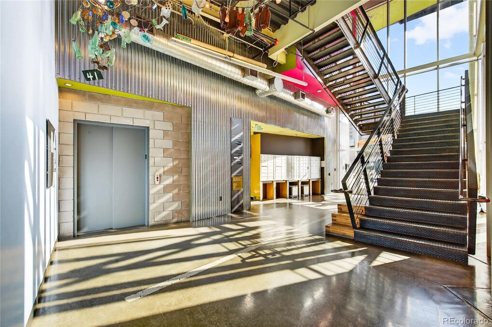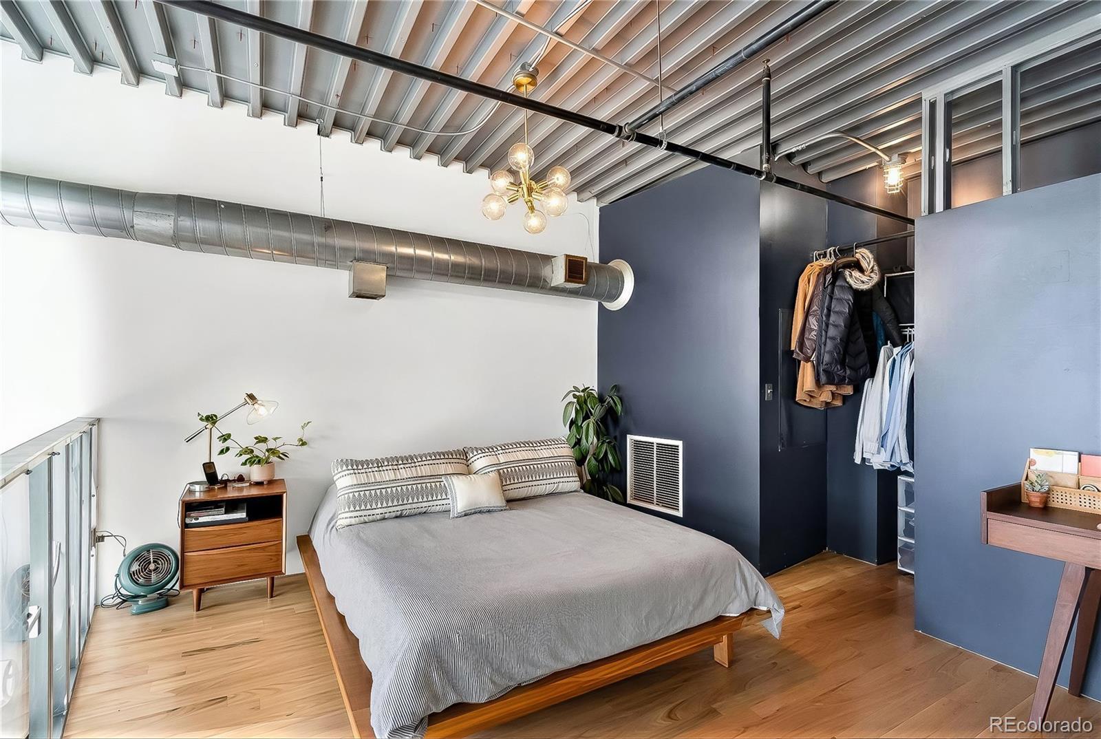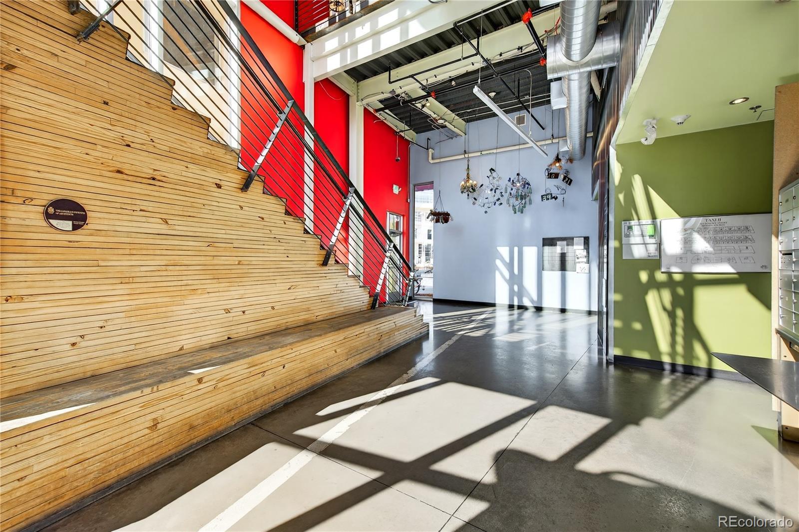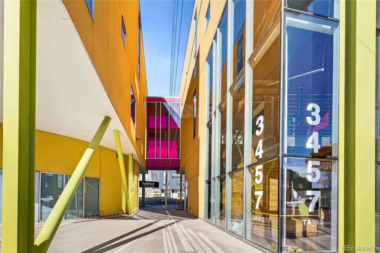 Discover stylish city living in this beautifully updated open light and bright 1-bed, 1-bath loft in the vibrant TAXI community - a dynamic live/work/play neighborhood in Denver’s sought-after RiNo Arts District. At 662 sf with 22 ft ceilings, this thoughtfully designed home pairs modern comfort with urban energy and endless lifestyle conveniences, in a serene and quiet building filled with harmonious architectural and aesthetic appointments at every turn. This unit has been modified to expand the upper bedroom over the kitchen, adding 60 sf to the original floor plan, which allows for a king sized bed with room to spare. The well-appointed kitchen features stainless steel counter tops and shelves, Bosch appliances, and soft-close drawers. Retreat up the custom designed industrial staircase to the bedroom sanctuary, complete with sprung hardwood floors, and a walk-in closet with an in-unit washer/dryer for true ease of living. On the main floor, the modern bathroom features clean, contemporary finishes. Living at TAXI means more than a great home - it’s a lifestyle. This unique mixed-use community celebrates creativity, collaboration, and connection with amenities designed to elevate daily life, including co-working spaces, on-site daycare, galleries, community garden, dog parks, EV charging stations, picnic and BBQ areas, a bar, a salon, a coffee shop, and many events and gatherings. Additionally gym and pool access are also available. For culinary fans, internationally recognized Michelin-star chef Johnny Curiel is opening an intimate tasting-menu restaurant, Maize, right on campus this spring, adding world-class dining just steps from your front door. Enjoy incredible mountain and river views, effortless access to the South Platte River Trail and downtown Denver, and so much more. There are few buildings in Denver that can match the uniqueness of the Taxi campus. With mixed used zoning, this loft can be used for a residence, business, or live/work.