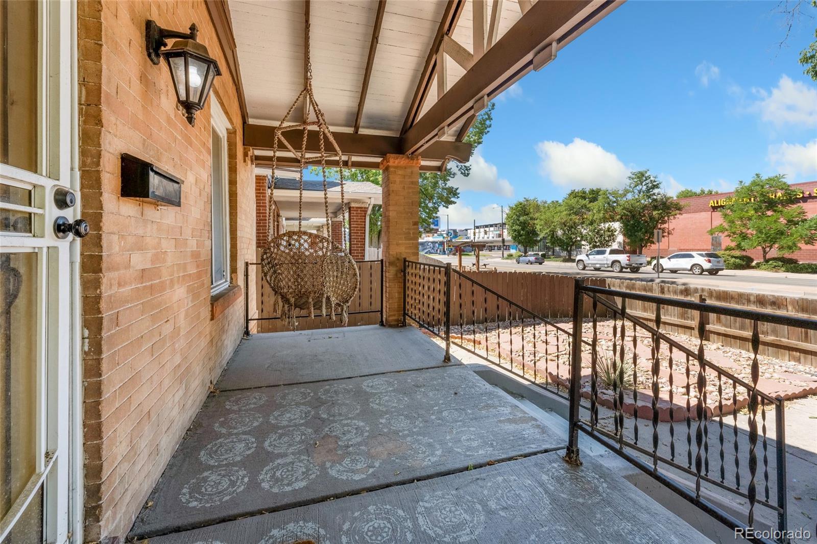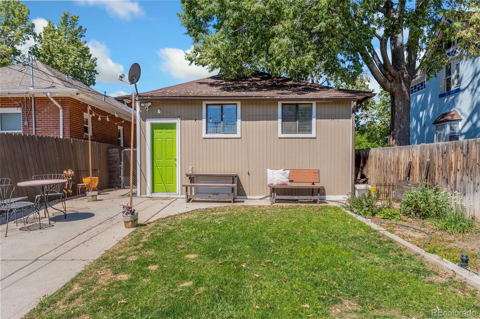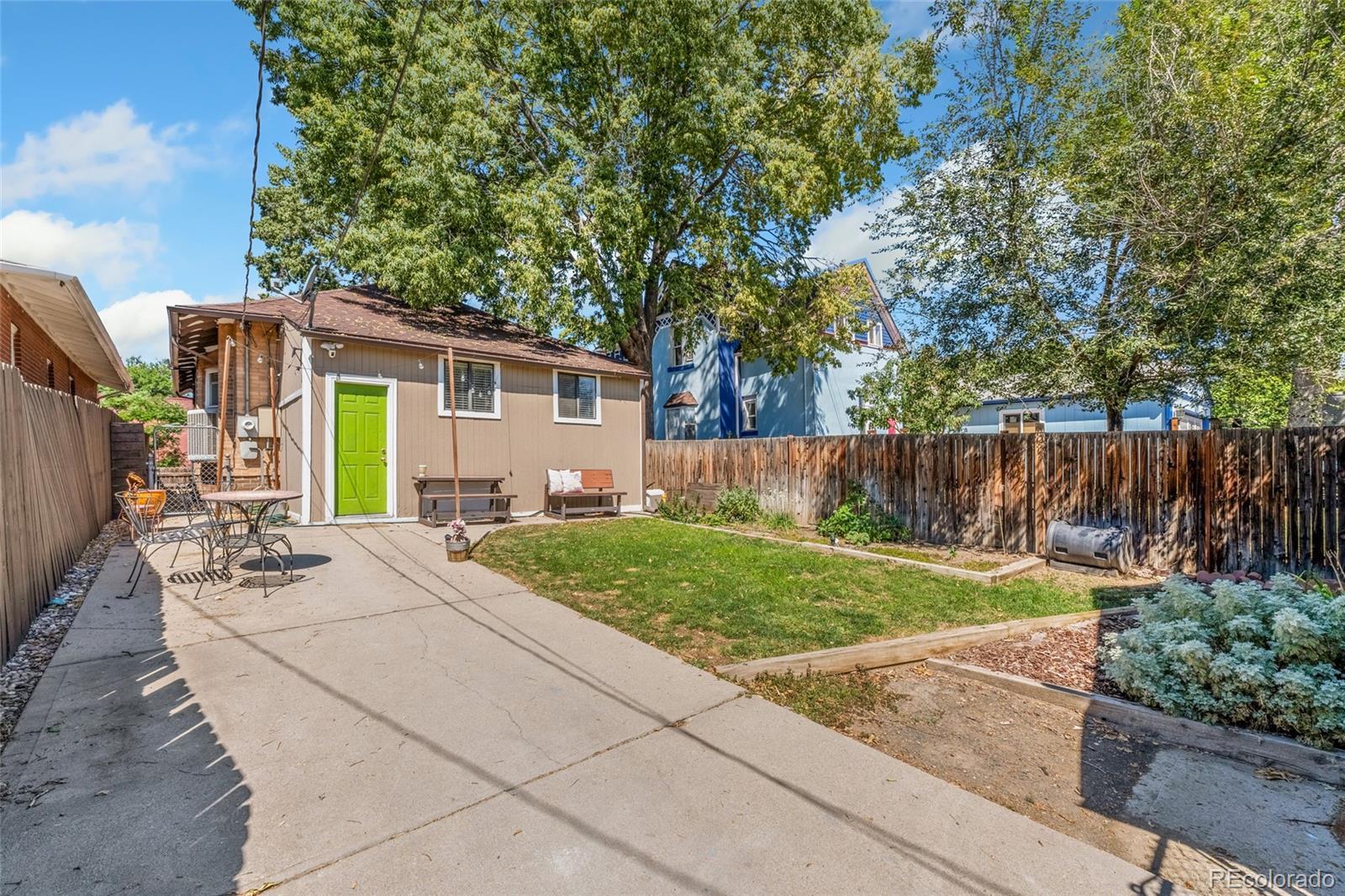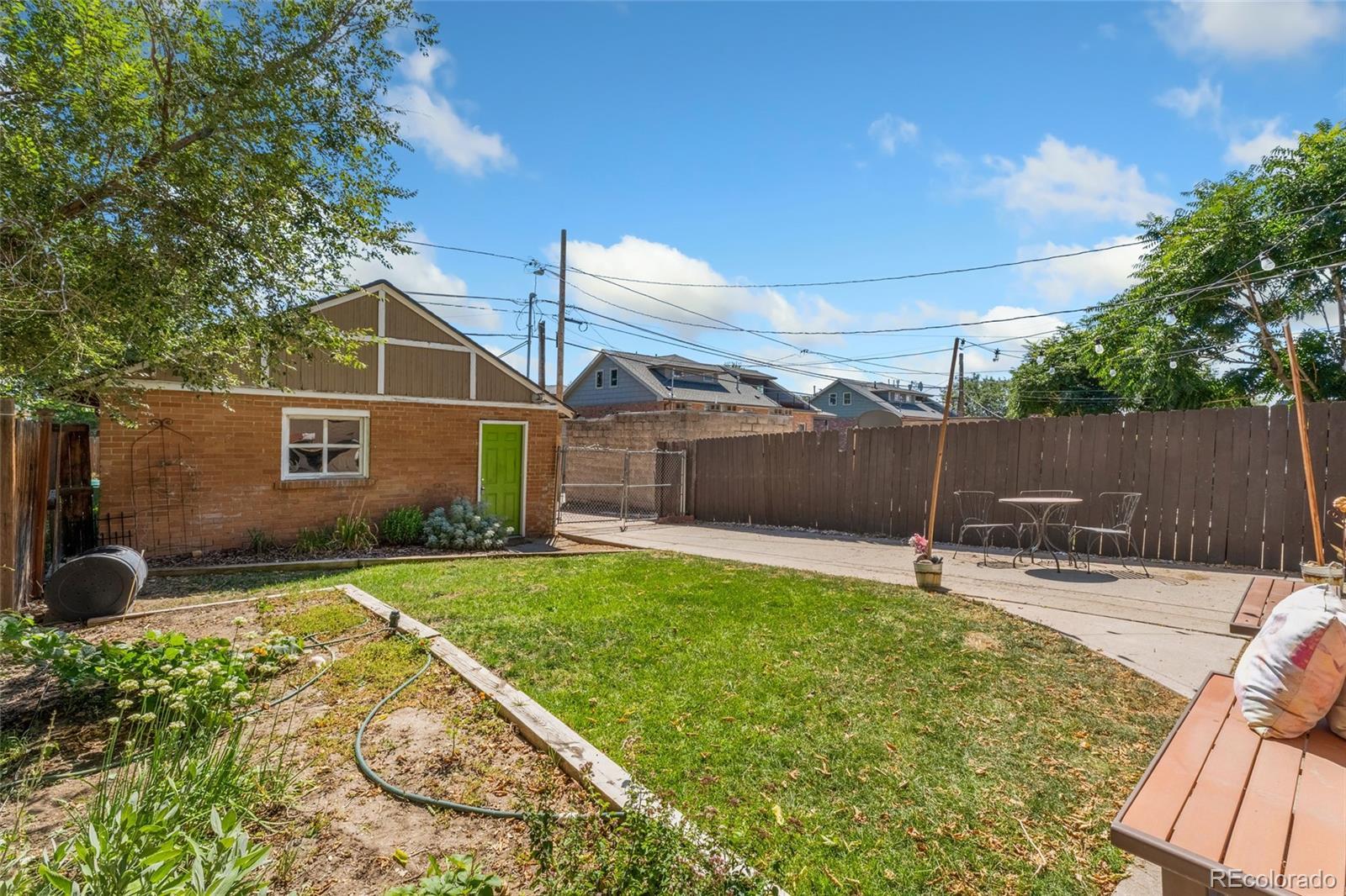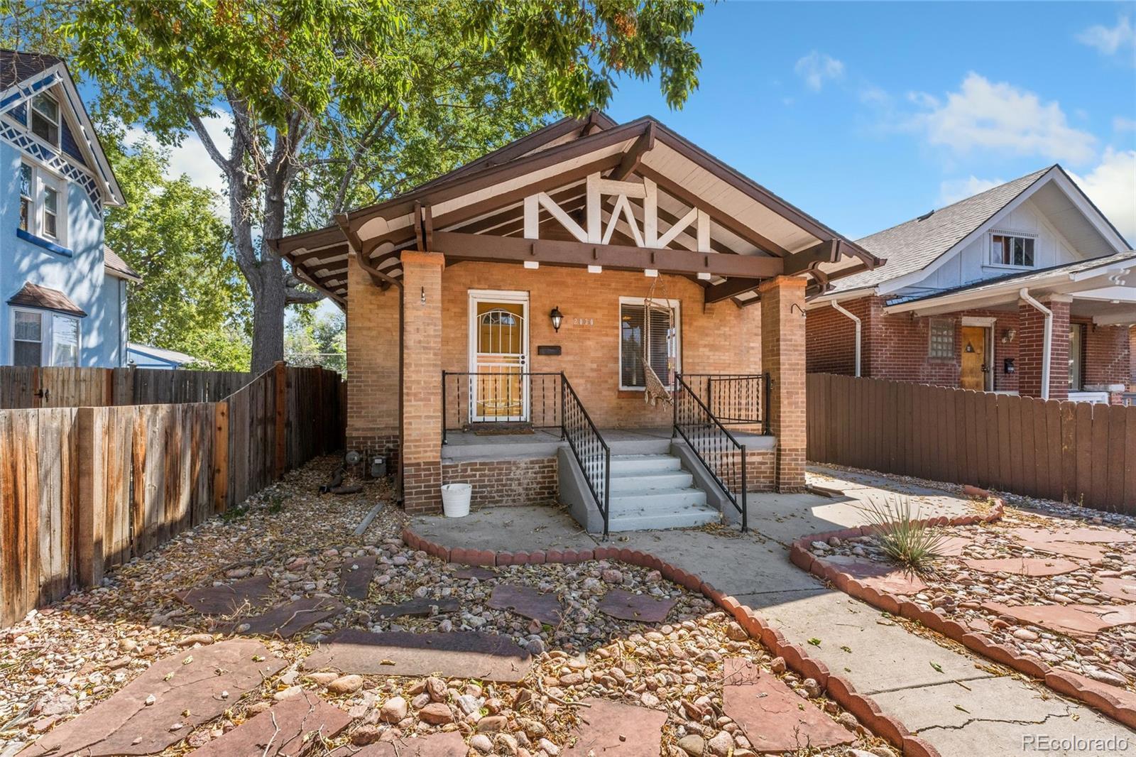 This perfect early 1900s brick bungalow blends timeless vintage charm with thoughtful modern updates in the highly desirable Jefferson Park neighborhood. Enjoy the convenience of nearby bike trails, excellent walkability, and quick access to downtown, entertainment venues, Jefferson Park itself, a variety of restaurants, Mile High Stadium, the light rail, and more. Zoned U-TU-B, the property allows for the option of building a detached accessory dwelling unit if desired. A charming front fence and inviting covered porch set the tone for the home’s warm character. Inside, a spacious entryway with new tile and ample storage leads to an open living and dining room, separated by a classic arched doorway. Abundant natural light fills the home, and the large dining room is ideal for hosting dinner parties. The updated kitchen offers modern conveniences, and a back entryway/mudroom—complete with new tile—provides a perfect landing spot for coats and shoes. A separate office adds functionality, while two bedrooms share a connecting full bath. Step outside to a private backyard with a garden, patio for summertime dining, and a detached brick garage featuring a charming green door that matches the backdoor of the home. Additional off-street parking is accessible from the alley. A partially finished basement offers flexible space for storage or potential living area. Recent updates include new kitchen countertops and sink, new exterior bib and pipe, an added backflow eliminator (2025), and an installed ceiling fan. This move-in-ready gem offers historic character, modern comfort, and an unbeatable location. Buyer/Buyer's agent is responsible for verifying all information, measurements, schools.