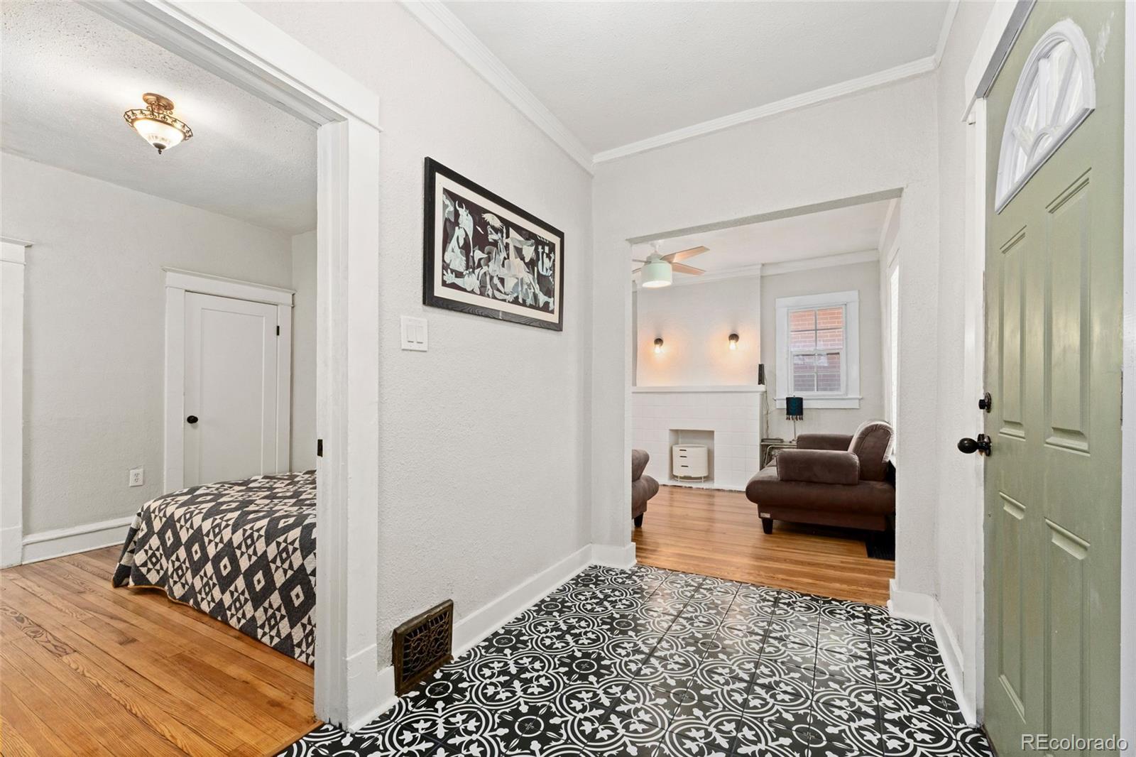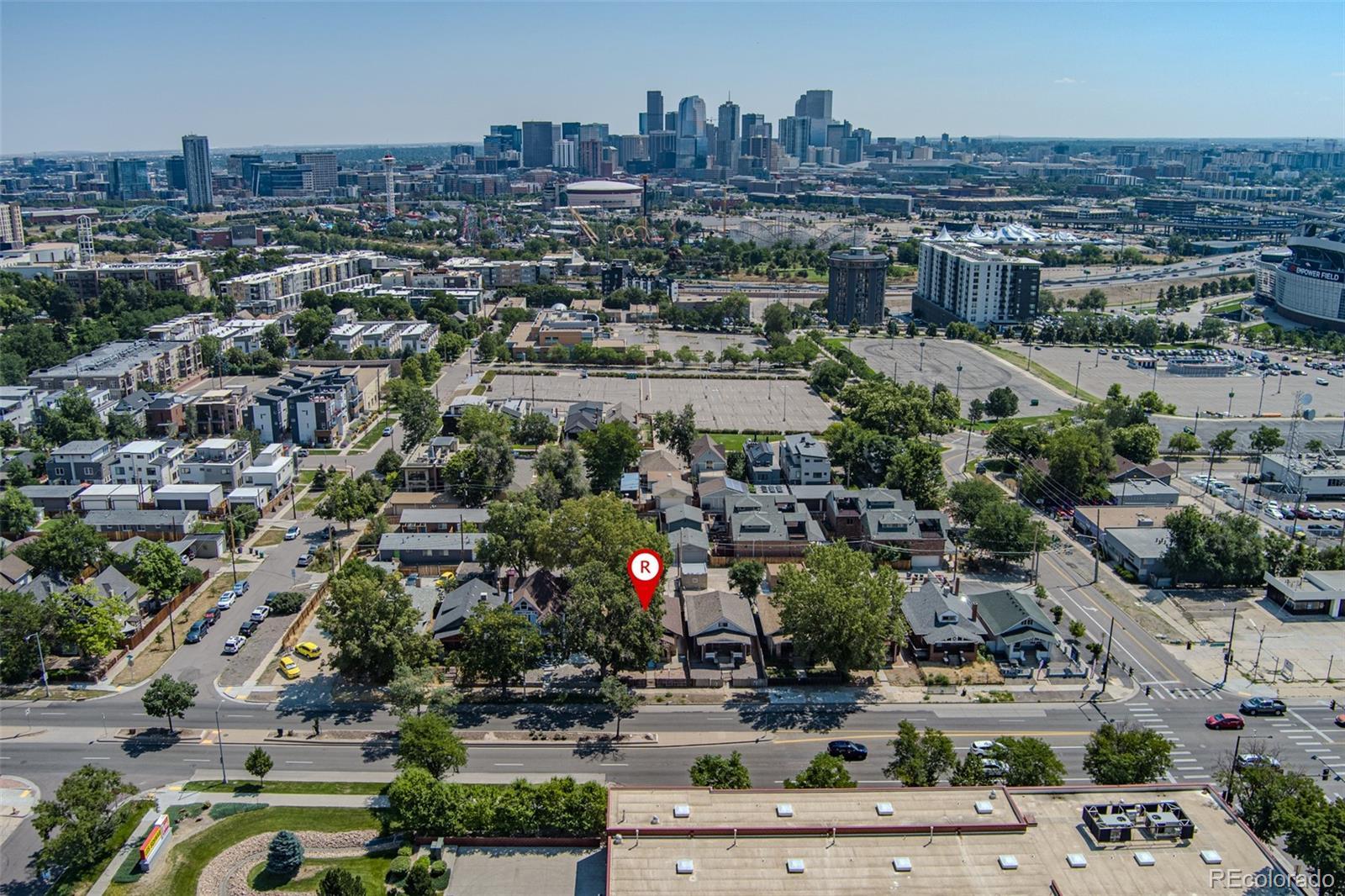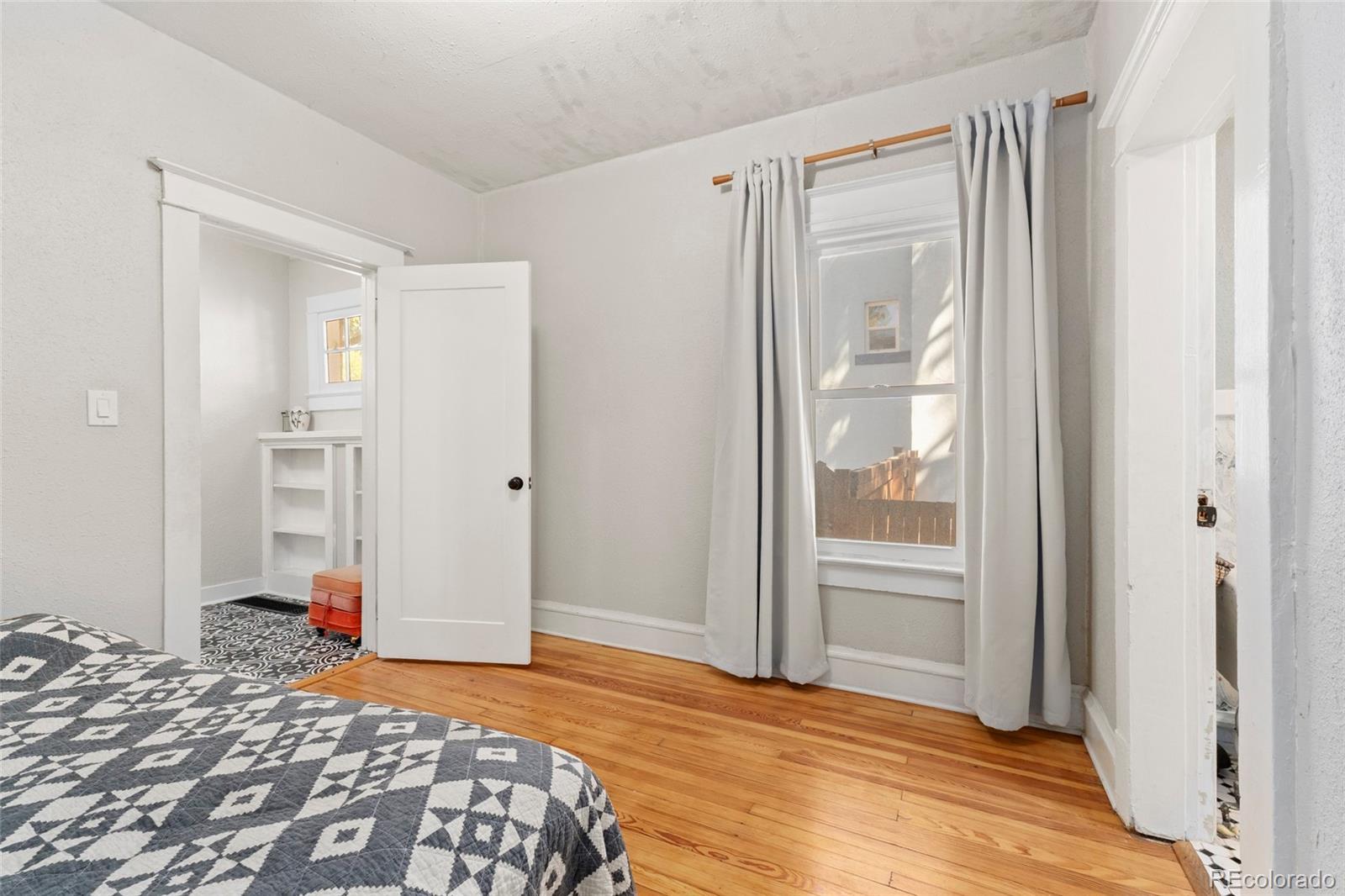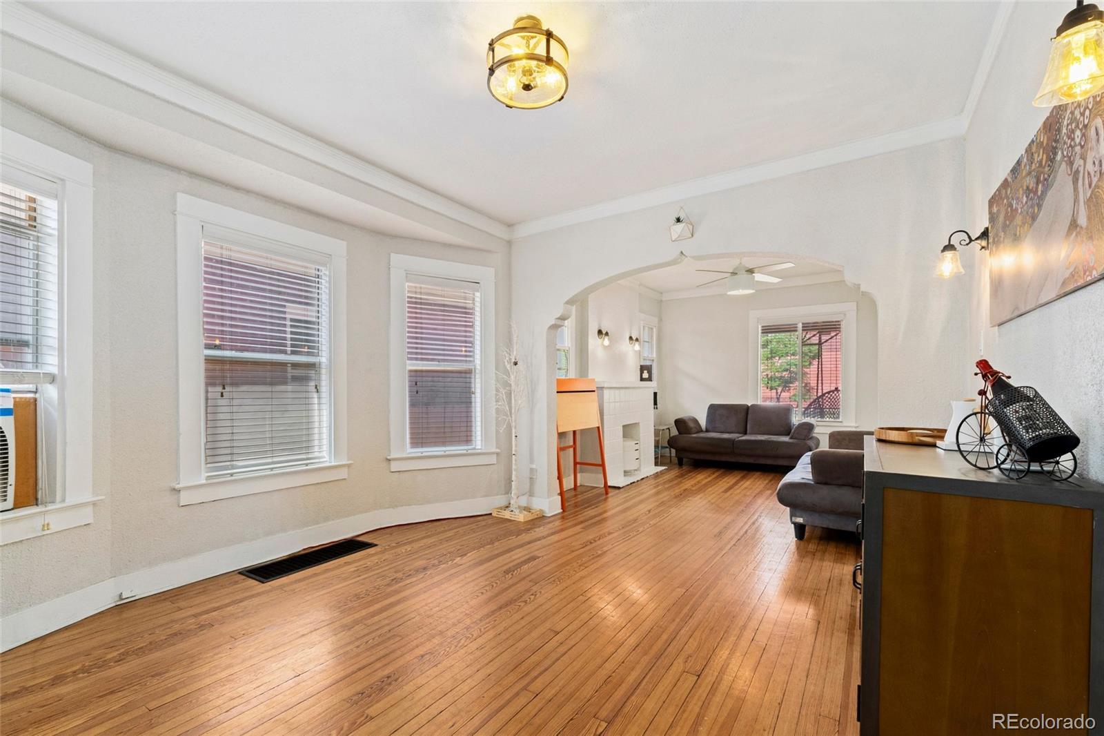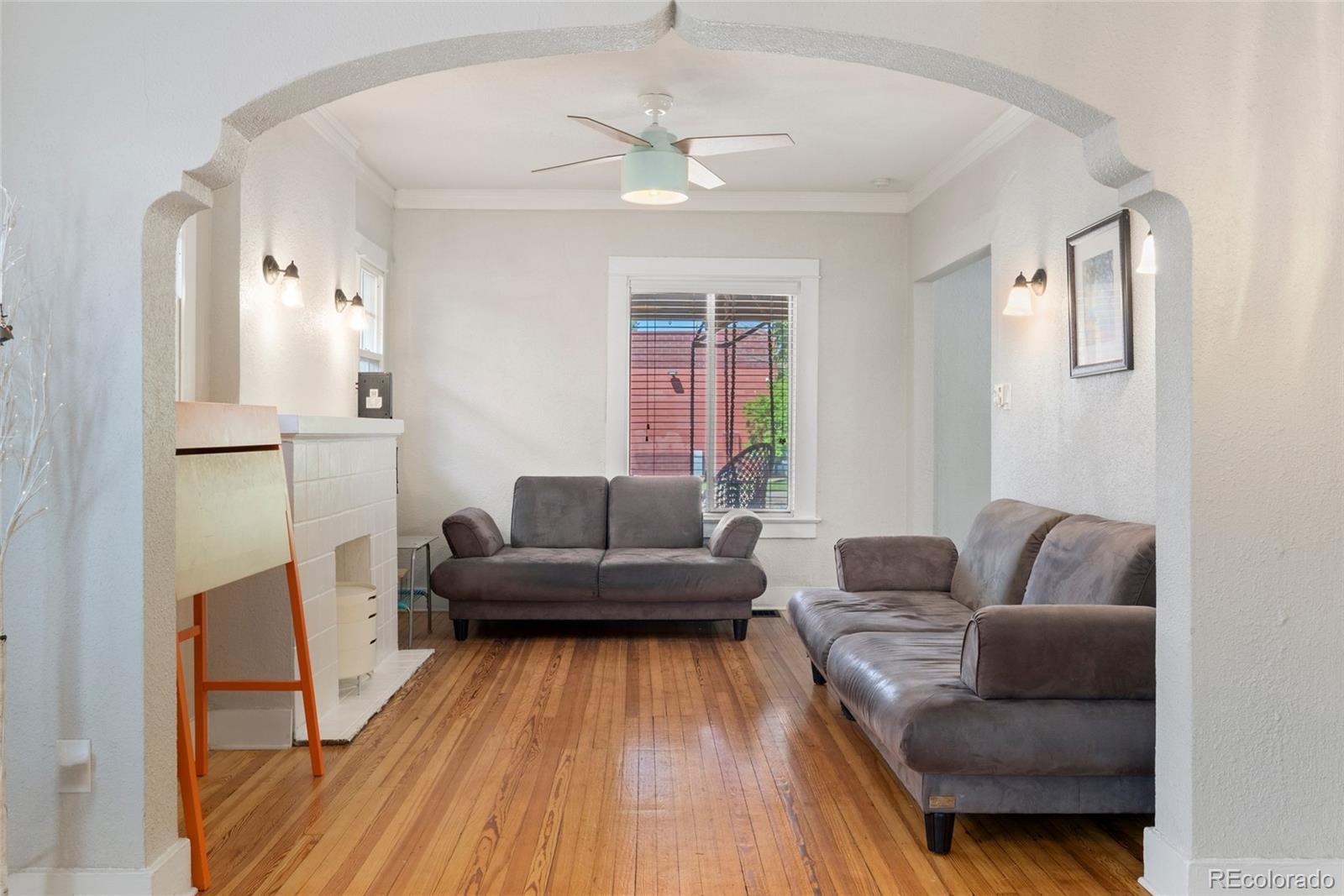This perfect early 1900s brick bungalow blends timeless vintage charm with thoughtful modern updates in the highly desirable Jefferson Park neighborhood. Enjoy the convenience of nearby bike trails, excellent walkability, and quick access to downtown, entertainment venues, Jefferson Park itself, a variety of restaurants, Mile High Stadium, the light rail, and more. Zoned U-TU-B, the property allows for the option of building a detached accessory dwelling unit if desired. A charming front fence and inviting covered porch set the tone for the home’s warm character. Inside, a spacious entryway with new tile and ample storage leads to an open living and dining room, separated by a classic arched doorway. Abundant natural light fills the home, and the large dining room is ideal for hosting dinner parties. The updated kitchen offers modern conveniences, and a back entryway/mudroom—complete with new tile—provides a perfect landing spot for coats and shoes. A separate office adds functionality, while two bedrooms share a connecting full bath. Step outside to a private backyard with a garden, patio for summertime dining, and a detached brick garage featuring a charming green door that matches the backdoor of the home. Additional off-street parking is accessible from the alley. A partially finished basement offers flexible space for storage or potential living area. Recent updates include new kitchen countertops and sink, new exterior bib and pipe, an added backflow eliminator (2025), and an installed ceiling fan. This move-in-ready gem offers historic character, modern comfort, and an unbeatable location. Buyer/Buyer's agent is responsible for verifying all information, measurements, schools.