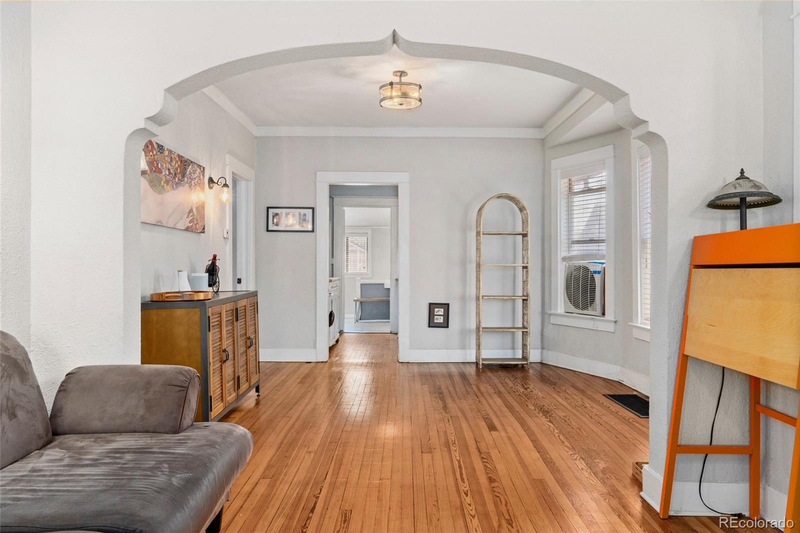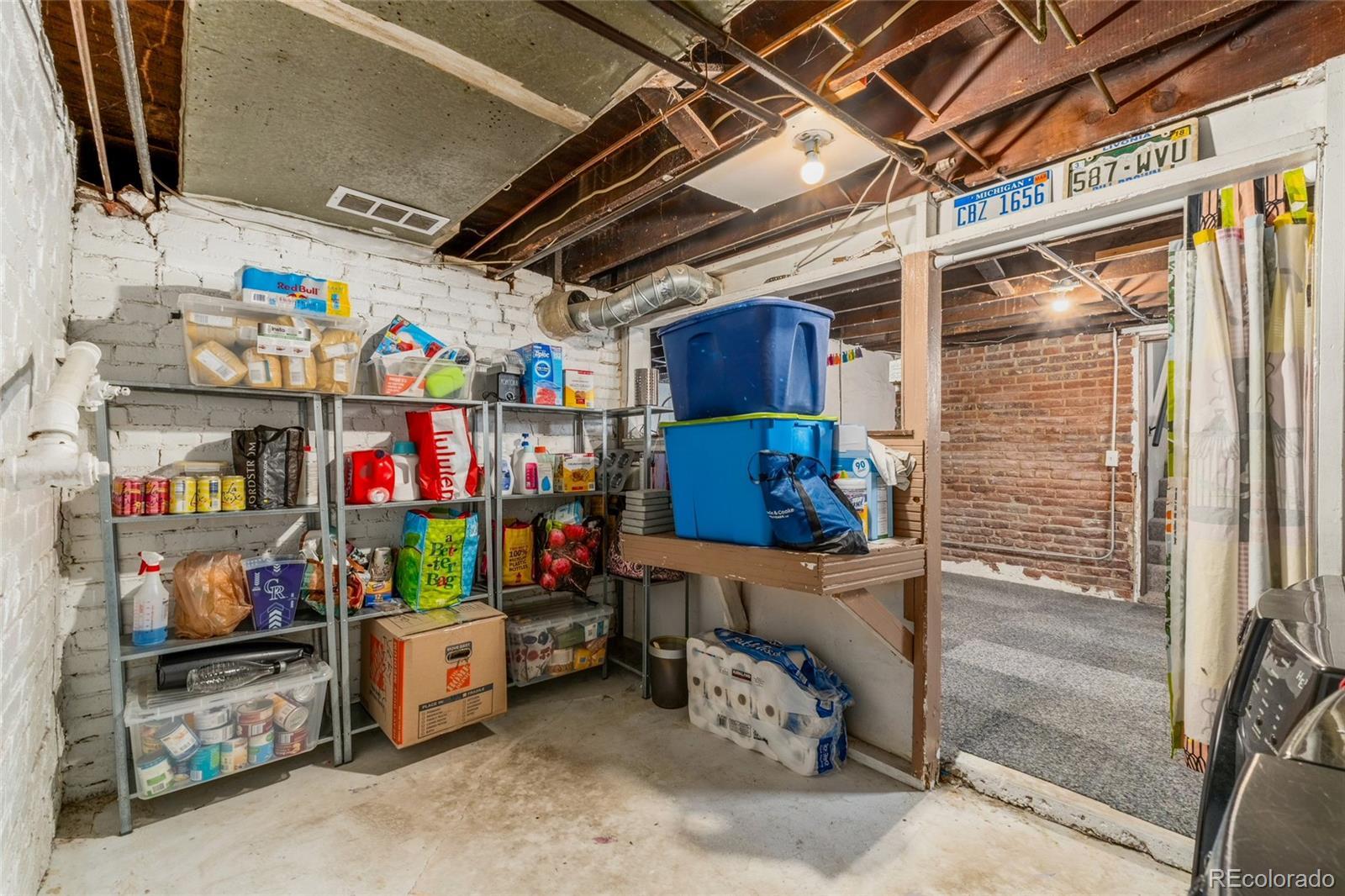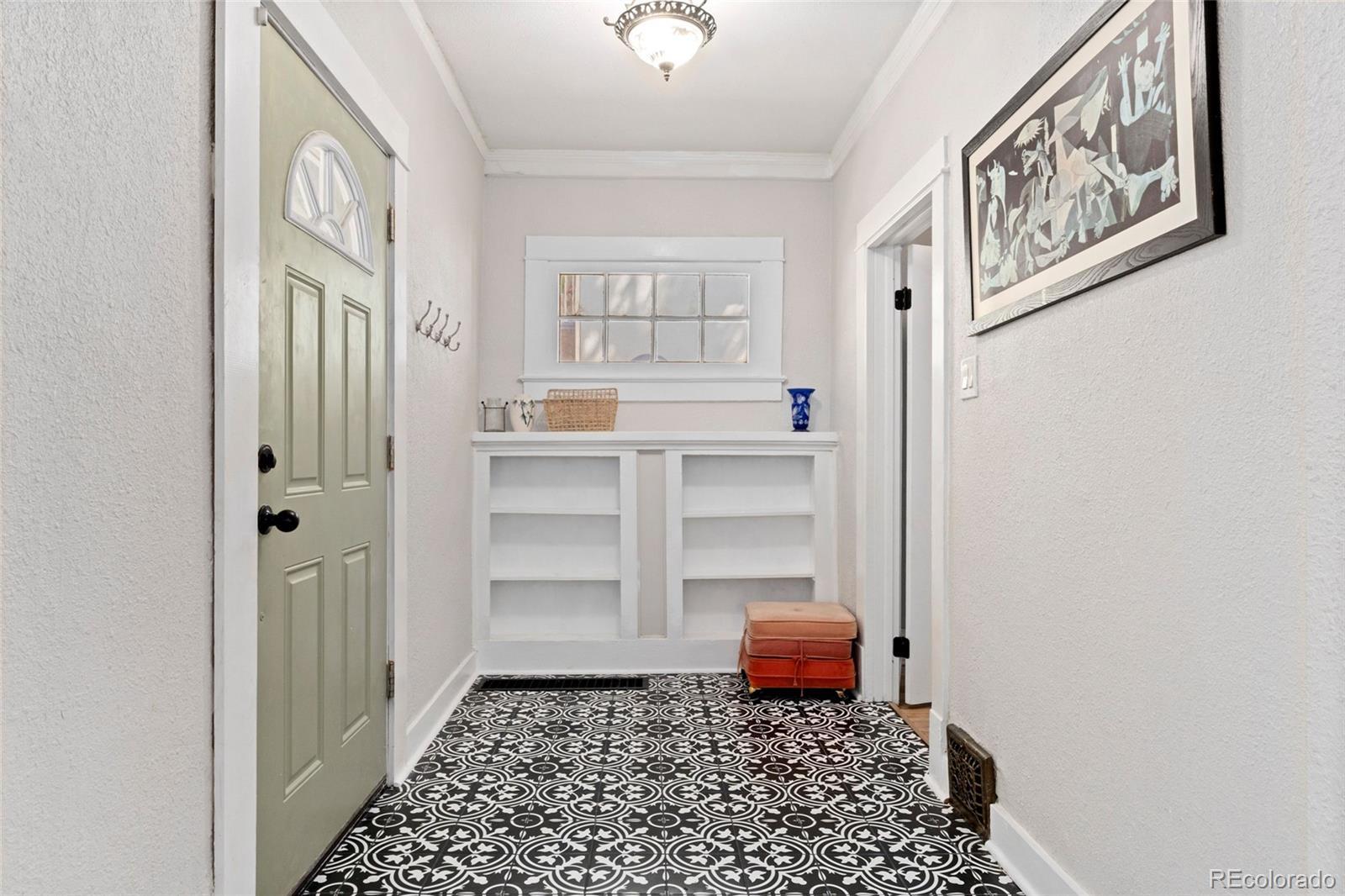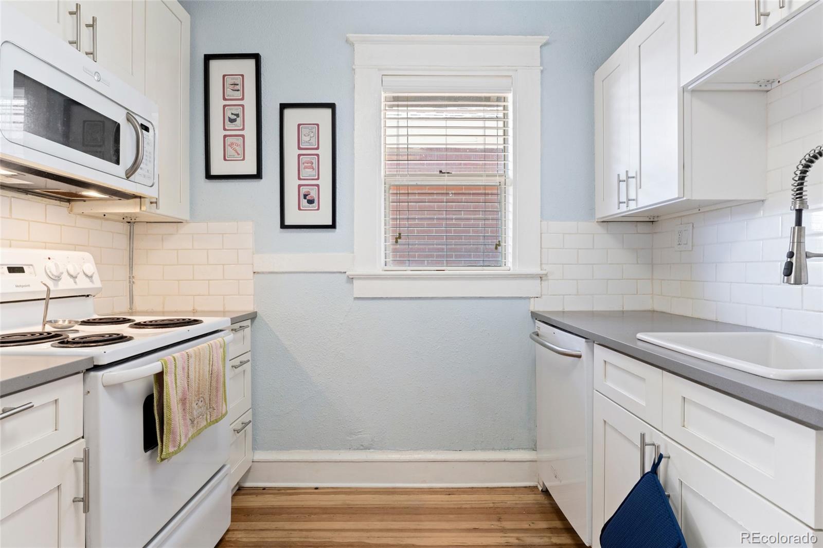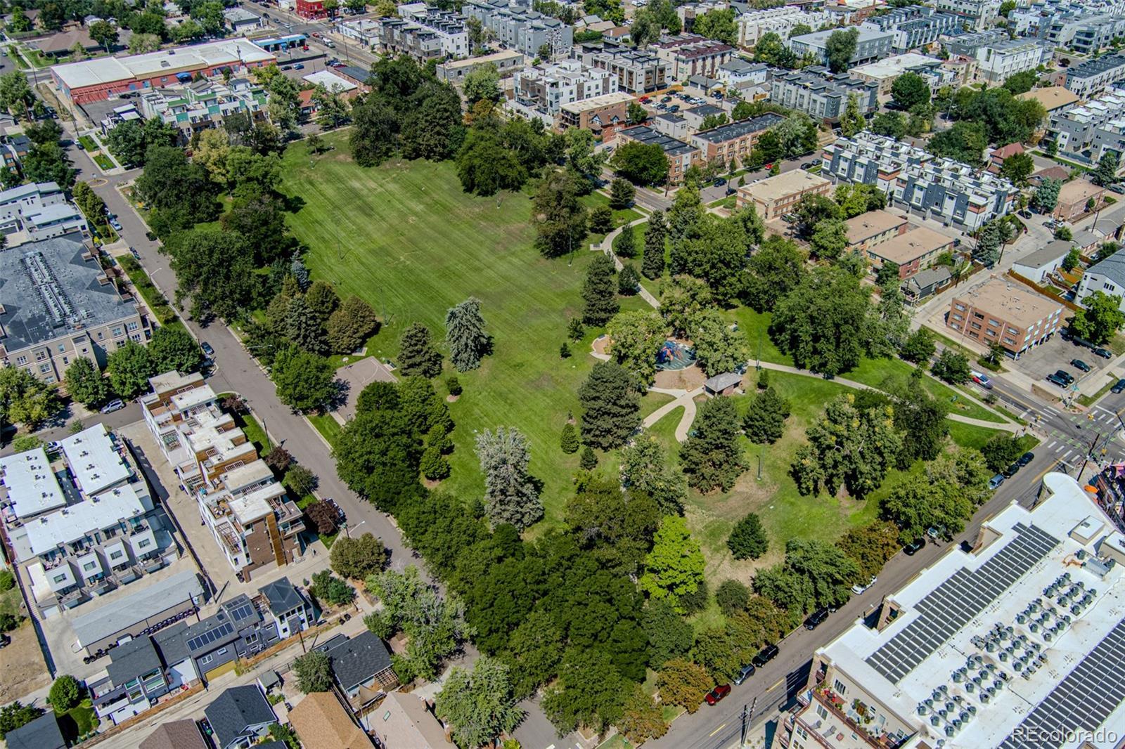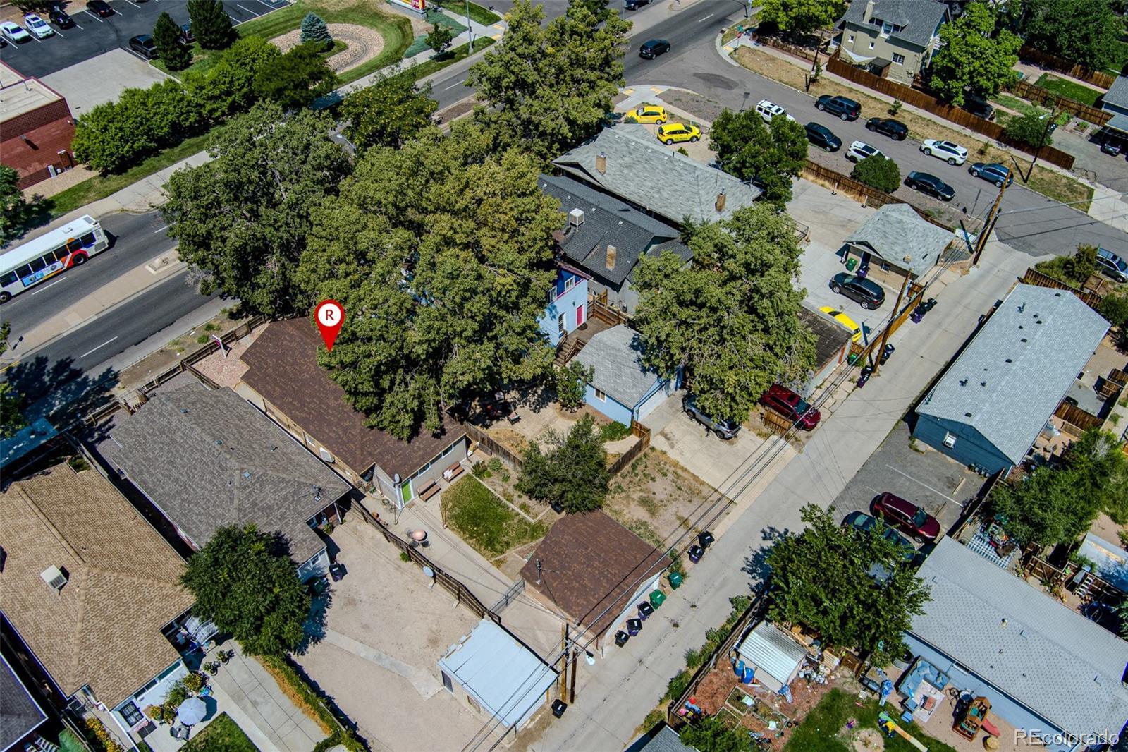 This perfect early 1900s brick bungalow blends timeless vintage charm with thoughtful modern updates in the highly desirable Jefferson Park neighborhood. Enjoy the convenience of nearby bike trails, excellent walkability, and quick access to downtown, entertainment venues, Jefferson Park itself, a variety of restaurants, Mile High Stadium, the light rail, and more. Zoned U-TU-B, the property allows for the option of building a detached accessory dwelling unit if desired. A charming front fence and inviting covered porch set the tone for the home’s warm character. Inside, a spacious entryway with new tile and ample storage leads to an open living and dining room, separated by a classic arched doorway. Abundant natural light fills the home, and the large dining room is ideal for hosting dinner parties. The updated kitchen offers modern conveniences, and a back entryway/mudroom—complete with new tile—provides a perfect landing spot for coats and shoes. A separate office adds functionality, while two bedrooms share a connecting full bath. Step outside to a private backyard with a garden, patio for summertime dining, and a detached brick garage featuring a charming green door that matches the backdoor of the home. Additional off-street parking is accessible from the alley. A partially finished basement offers flexible space for storage or potential living area. Recent updates include new kitchen countertops and sink, new exterior bib and pipe, an added backflow eliminator (2025), and an installed ceiling fan. This move-in-ready gem offers historic character, modern comfort, and an unbeatable location. Buyer/Buyer's agent is responsible for verifying all information, measurements, schools.
