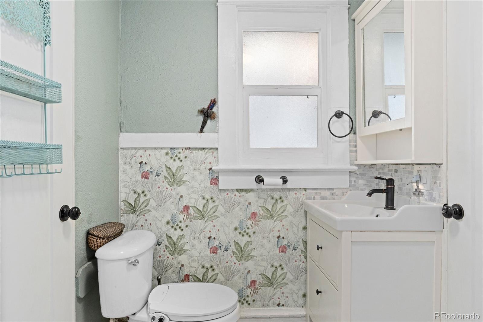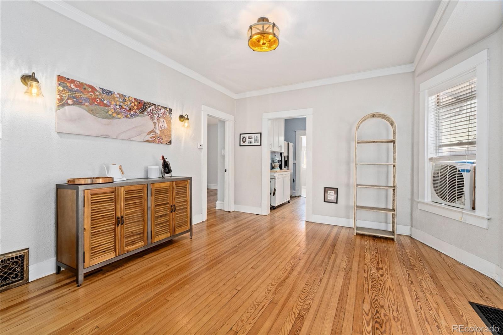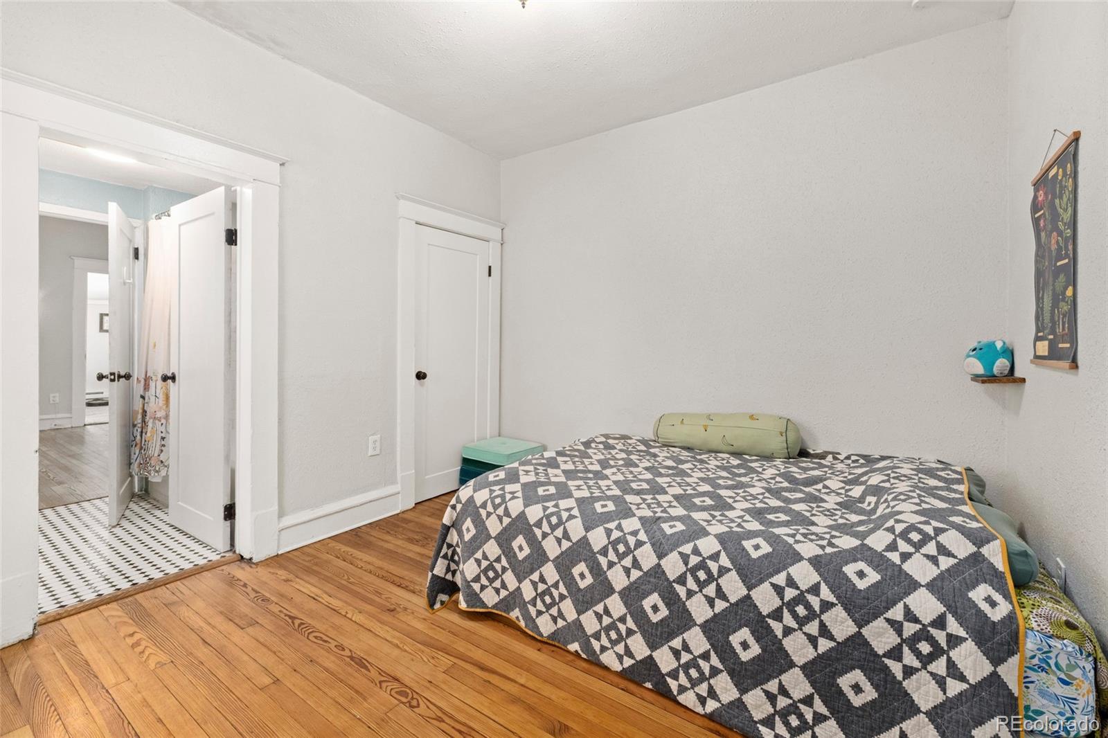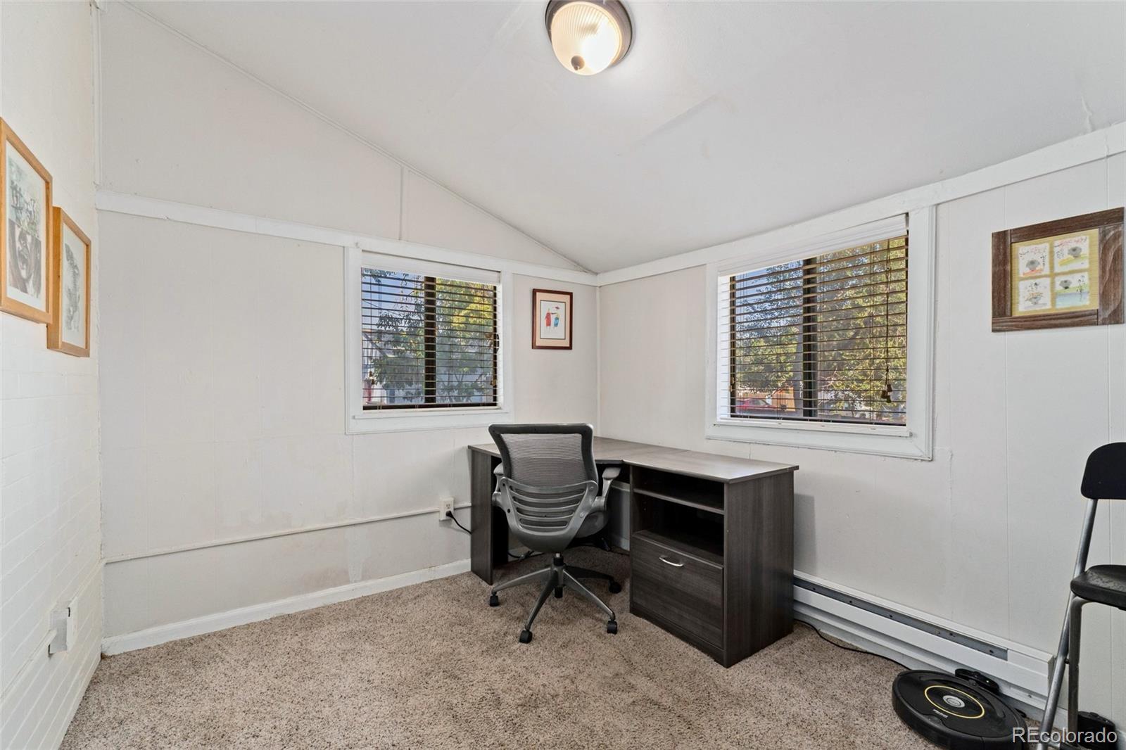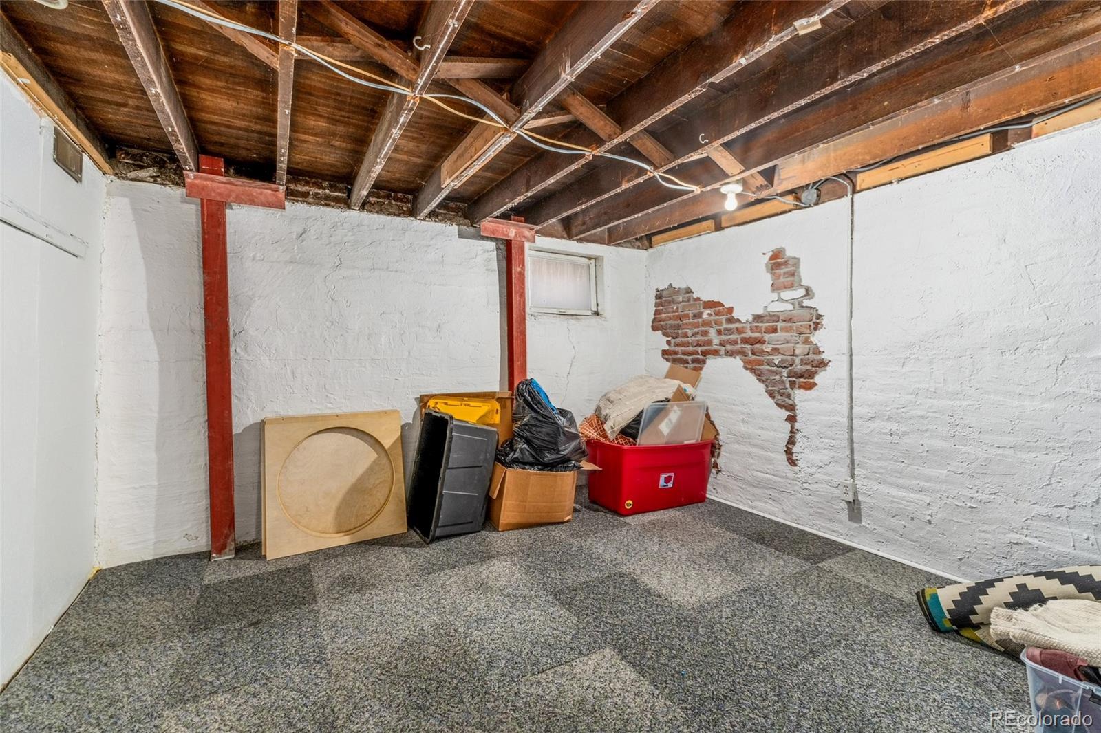 This perfect early 1900s brick bungalow blends timeless vintage charm with thoughtful modern updates in the highly desirable Jefferson Park neighborhood. Enjoy the convenience of nearby bike trails, excellent walkability, and quick access to downtown, entertainment venues, Jefferson Park itself, a variety of restaurants, Mile High Stadium, the light rail, and more. Zoned U-TU-B, the property allows for the option of building a detached accessory dwelling unit if desired. A charming front fence and inviting covered porch set the tone for the home’s warm character. Inside, a spacious entryway with new tile and ample storage leads to an open living and dining room, separated by a classic arched doorway. Abundant natural light fills the home, and the large dining room is ideal for hosting dinner parties. The updated kitchen offers modern conveniences, and a back entryway/mudroom—complete with new tile—provides a perfect landing spot for coats and shoes. A separate office adds functionality, while two bedrooms share a connecting full bath. Step outside to a private backyard with a garden, patio for summertime dining, and a detached brick garage featuring a charming green door that matches the backdoor of the home. Additional off-street parking is accessible from the alley. A partially finished basement offers flexible space for storage or potential living area. Recent updates include new kitchen countertops and sink, new exterior bib and pipe, an added backflow eliminator (2025), and an installed ceiling fan. This move-in-ready gem offers historic character, modern comfort, and an unbeatable location. Buyer/Buyer's agent is responsible for verifying all information, measurements, schools.