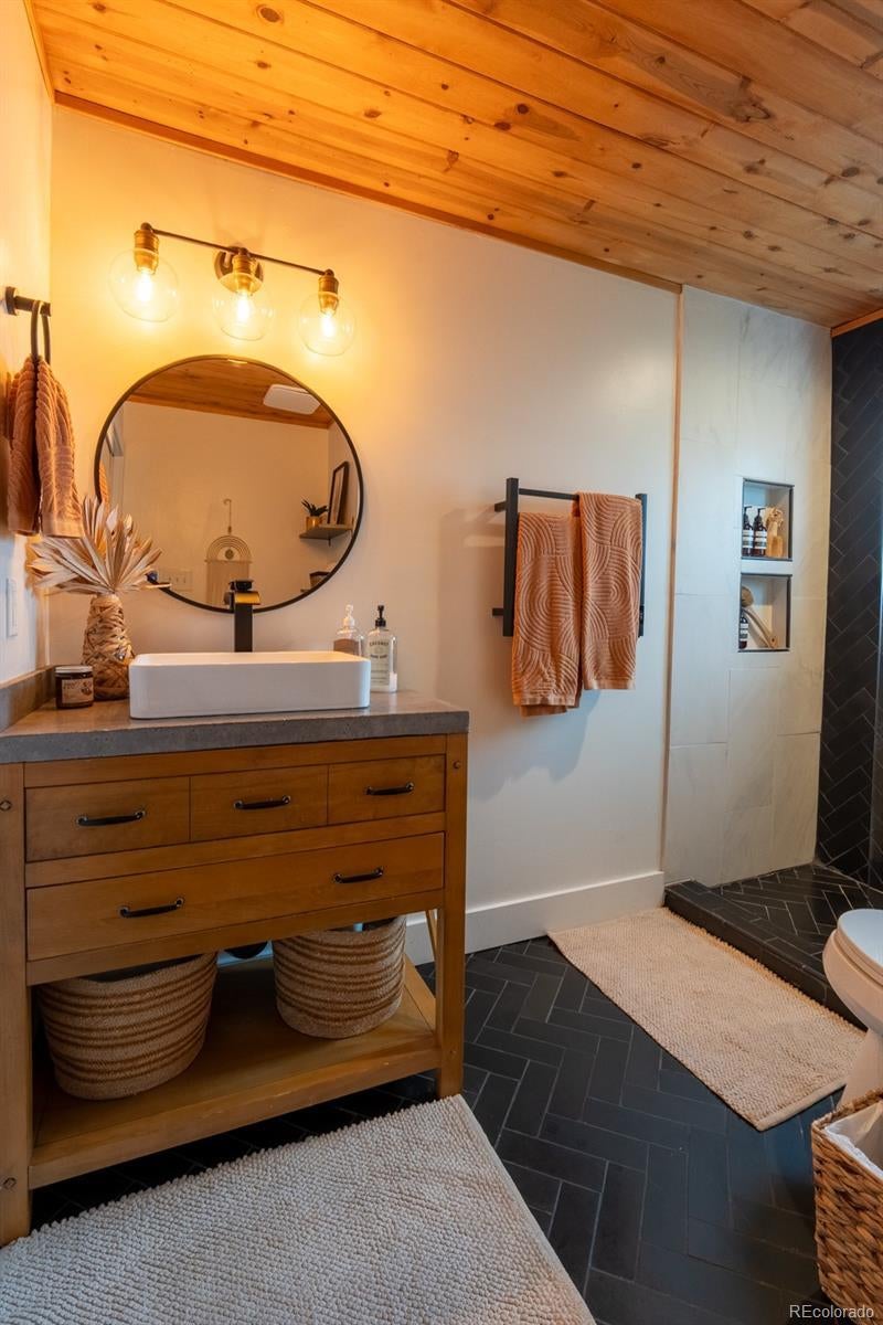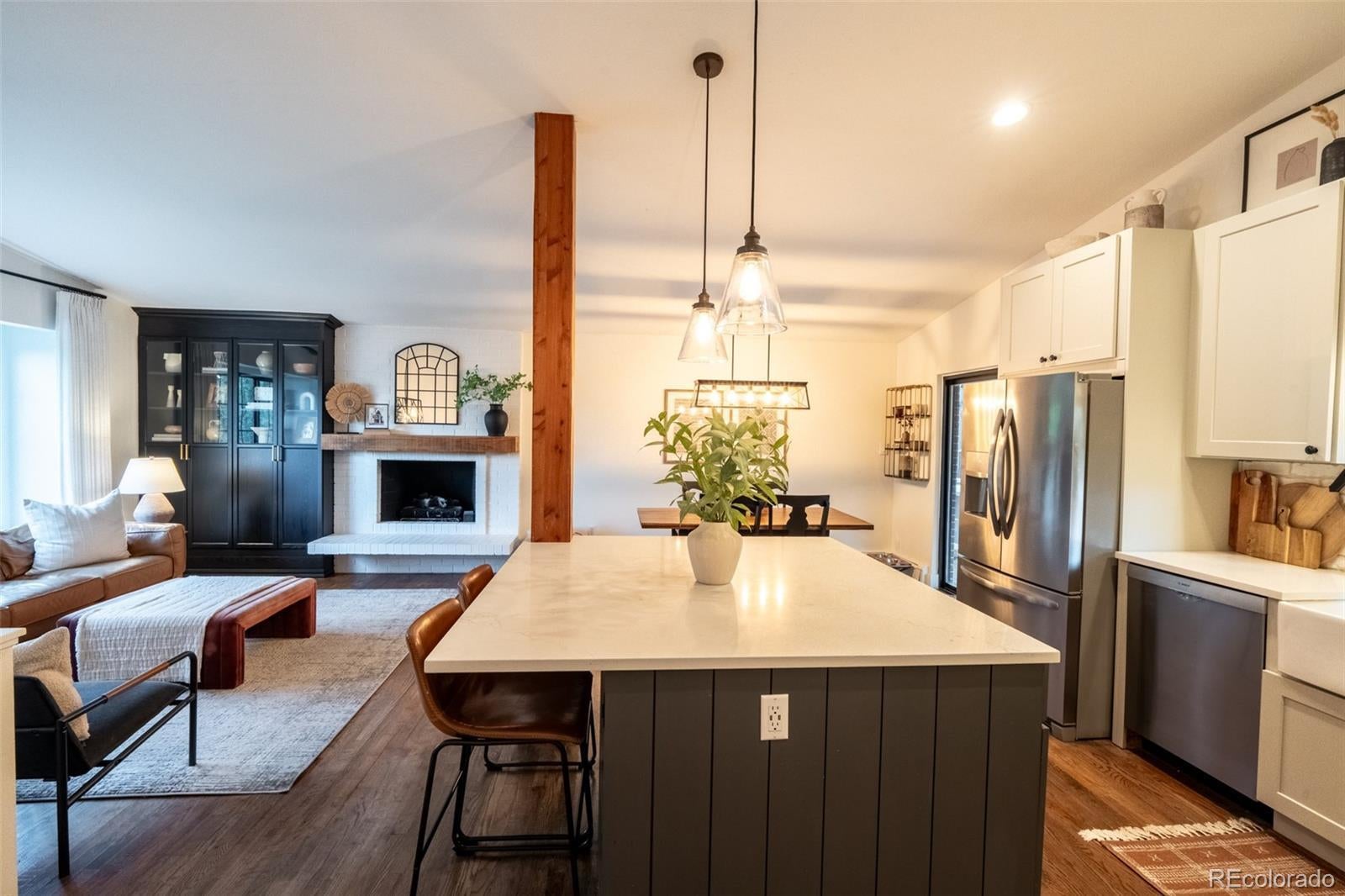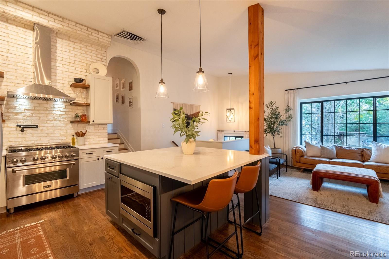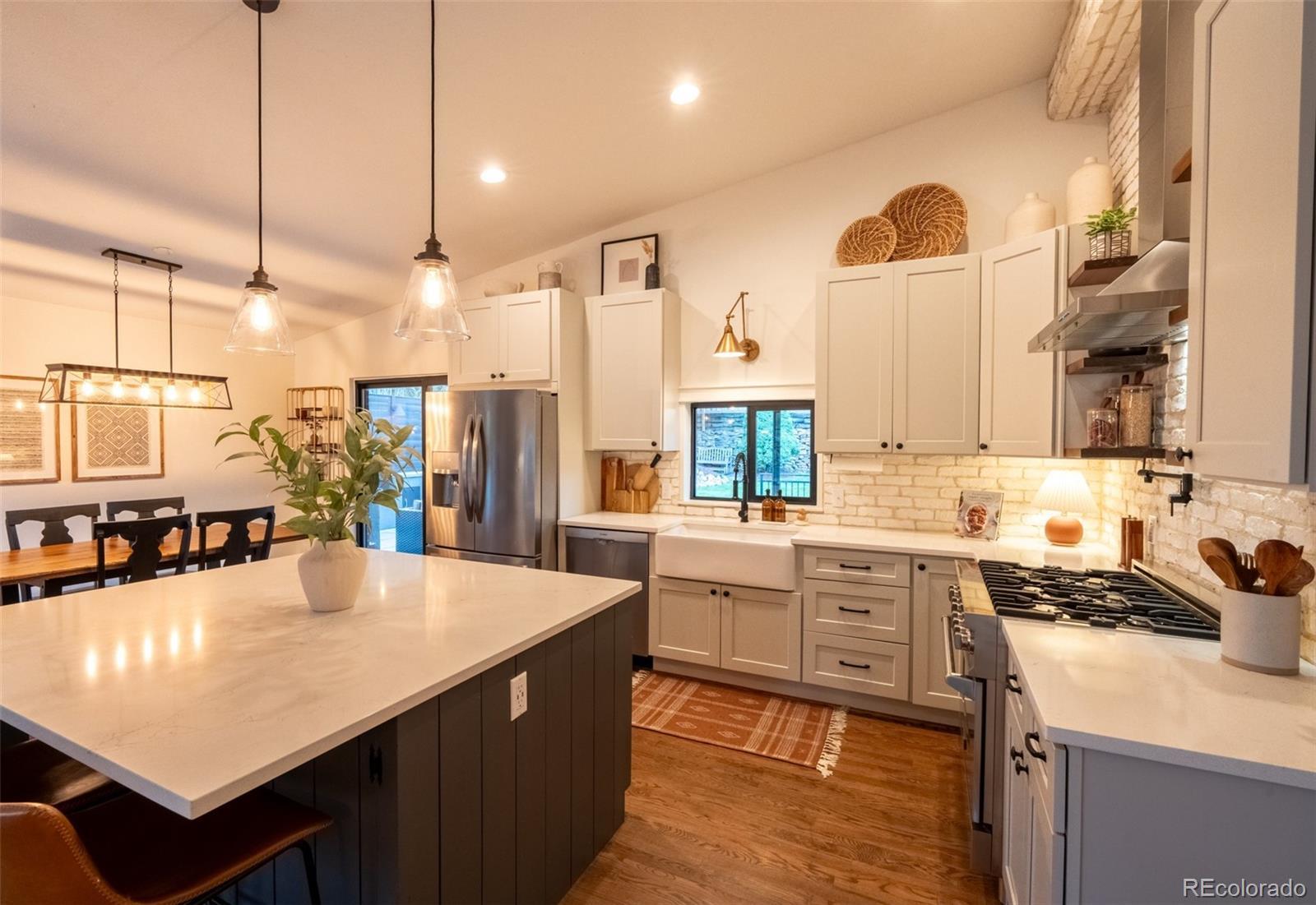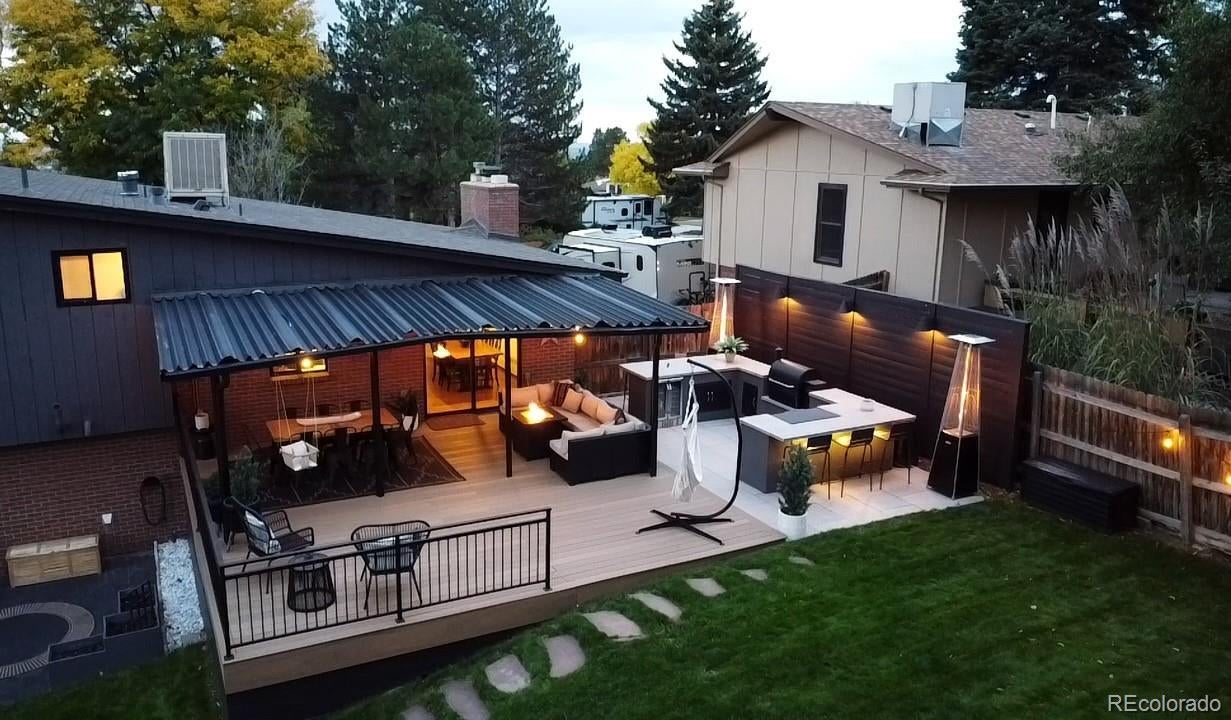 Green mountain living at its best in this stunning 3-bedroom, 2-bath retreat, where modern luxury meets timeless charm. Every corner of this thoughtfully updated home has been designed for comfort, functionality, and style. Step inside to an open, airy main level featuring vaulted ceilings, refinished original hardwood floors, a cozy gas fireplace, and built-in cabinetry. The living and dining areas flow seamlessly into the fully renovated chef’s kitchen and serene backyard sanctuary. The dream kitchen boasts stainless steel appliances, a 36” professional range, quartz countertops, a large farmhouse sink, and an oversized island with clever hidden storage for all your large kitchen appliances. At the entrance to the home, the mudroom is as functional as it is beautiful, featuring custom cabinetry, herringbone brick flooring, and hidden storage for a vacuum and charging station to keep everything tidy and organized. A huge lower-level family room with a wood burning fireplace provides flexible living space for media, play, or fitness. Upstairs, unwind in the primary suite, your personal retreat with a spa-inspired en suite bathroom showcasing marble and travertine tile, heated floors, a curbless shower, and discreet built-in storage. The guest bathroom continues the theme of comfort and sophistication; fully renovated including heated floors and a heated towel rack for that luxury hotel feel. Step outside into your private backyard oasis, designed for unforgettable gatherings. Enjoy a brand-new TimberTech deck, tranquil water feature, and a fully equipped outdoor kitchen complete with a wine/beer fridge, Traeger, and Blackstone grill. Nestled on a quiet street at the top of Green Mountain, this home offers peace, privacy, and proximity to nature, with nearby trail access just steps away. Additional highlights include: New concrete RV pad, City views from the bedrooms, Two fireplaces, and Two outdoor sheds for ample storage.