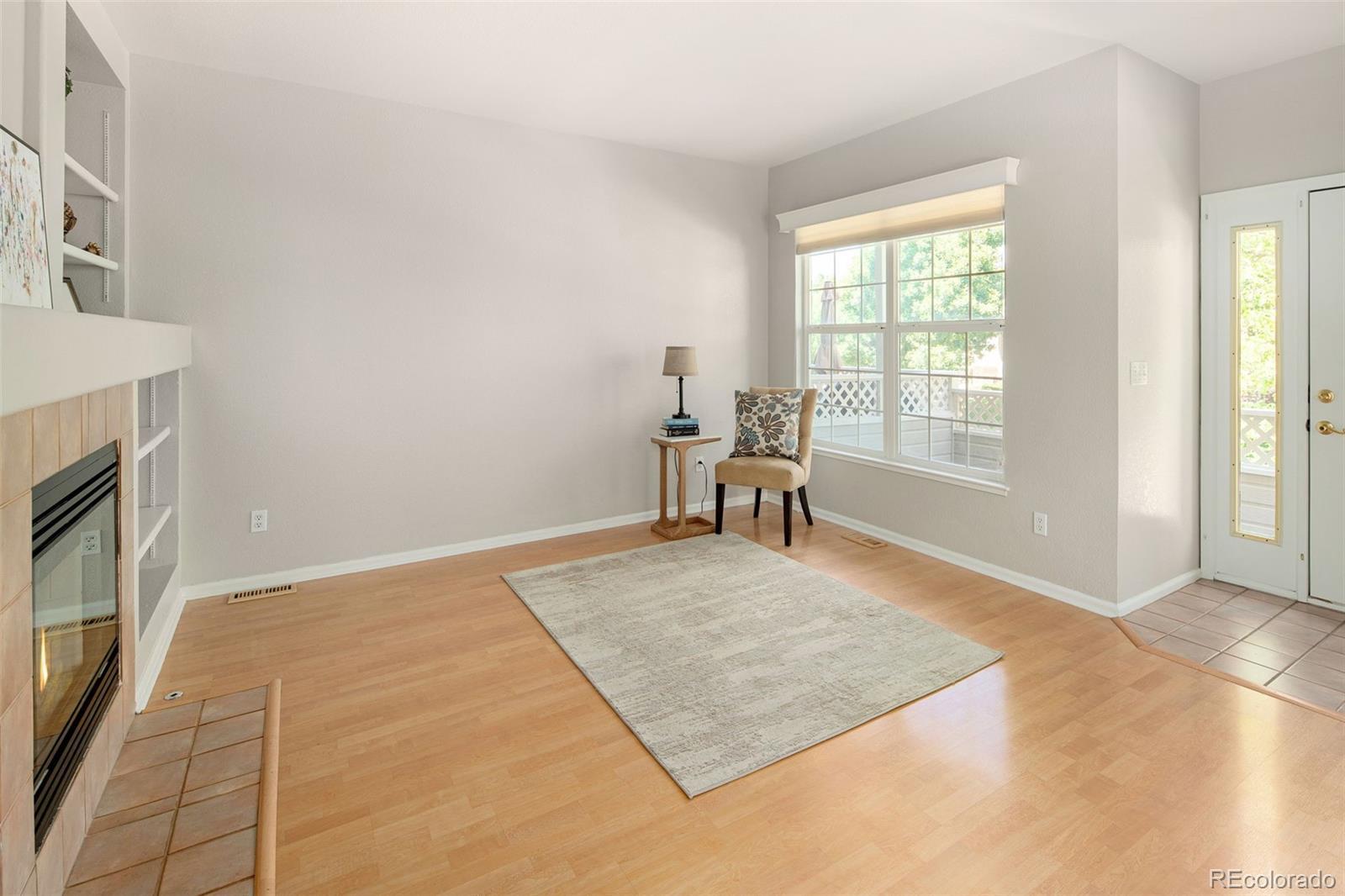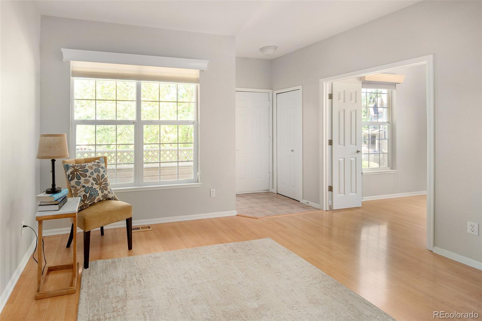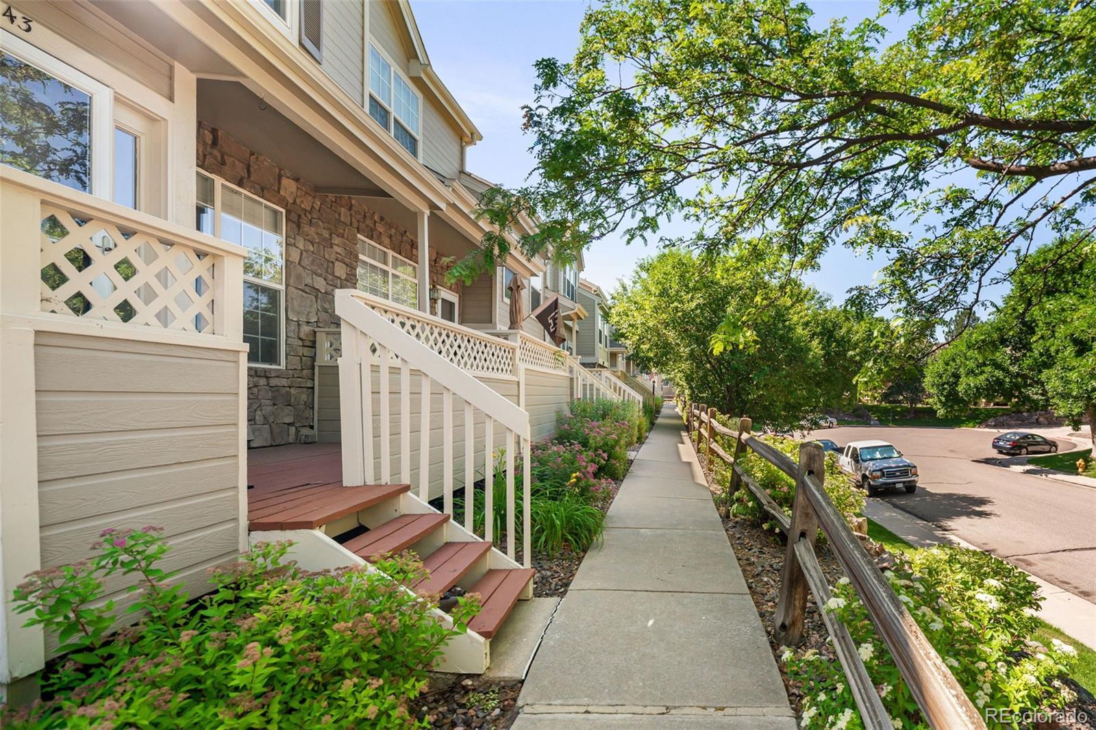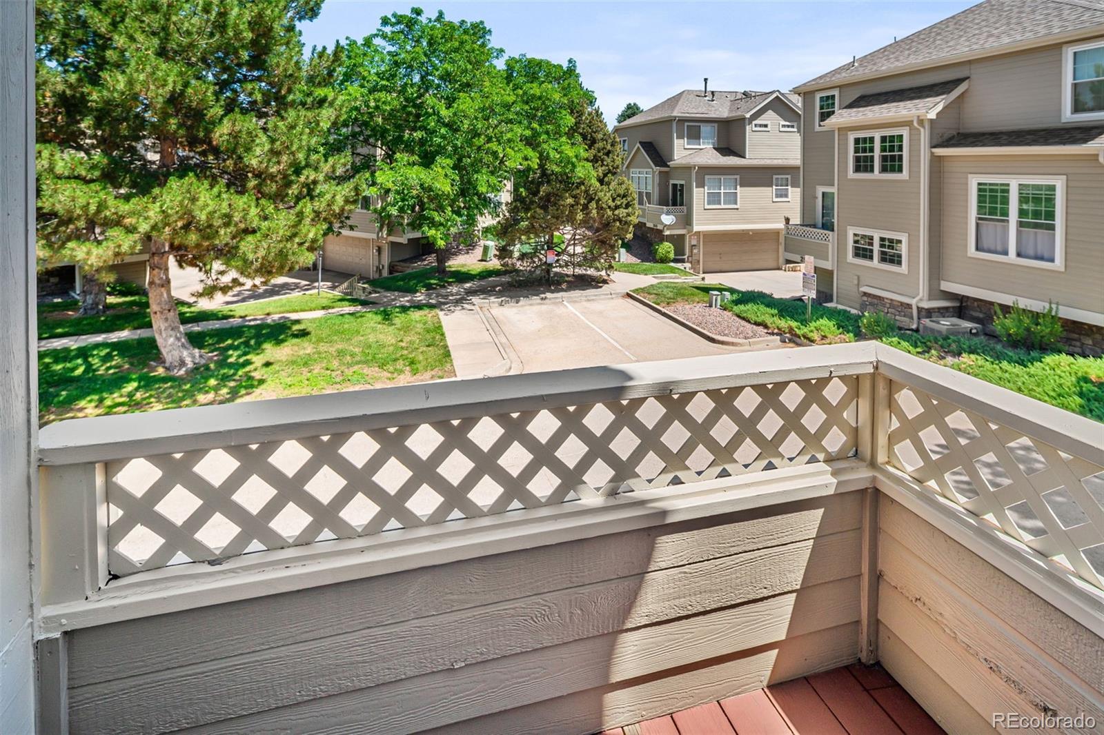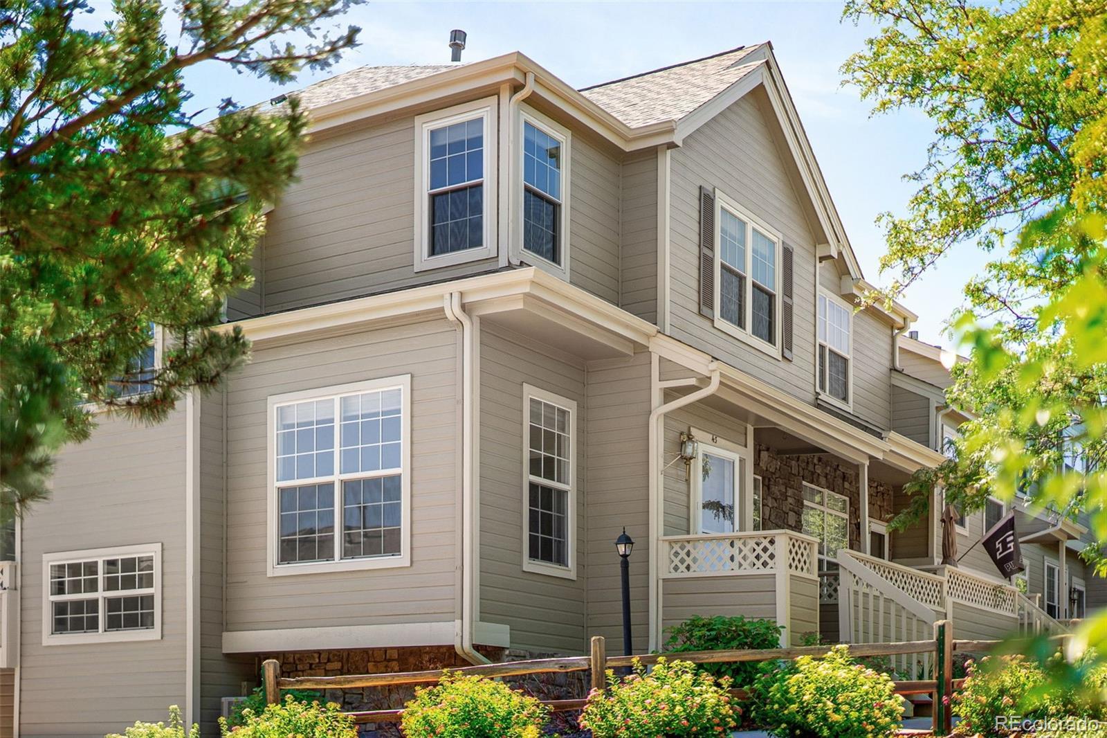 This bright and inviting end-unit townhome stands out with its extra privacy, natural light, and an attached oversized garage with built-in shelving and generous storage. Upstairs, the vaulted-ceiling primary suite offers a true retreat with a walk-in closet featuring a custom organization system and an ensuite bath with a soaking tub and added shelving. Inside, the open floor plan creates a warm, functional living space. The living room features a cozy gas fireplace, built-in bookshelves, and large windows that fill the home with natural light. French doors open to a versatile office or flex room, ideal for remote work. The dining area, accented by a stylish new light fixture, connects to a private balcony overlooking mature, HOA-maintained landscaping—perfect for morning coffee or evening relaxation. The thoughtfully designed kitchen provides ample cabinetry, generous counter space, and a full-size refrigerator. A main-floor laundry room with washer and dryer included adds everyday convenience. Two additional upstairs bedrooms offer bright, comfortable spaces, accompanied by an updated full bathroom. Additional highlights include multiple storage closets, a covered front porch, and well-maintained surroundings—all in a quiet Littleton location close to shopping, dining, parks, and major commuting routes. Move-in ready and beautifully maintained, this home offers comfort, style, and an unbeatable location.