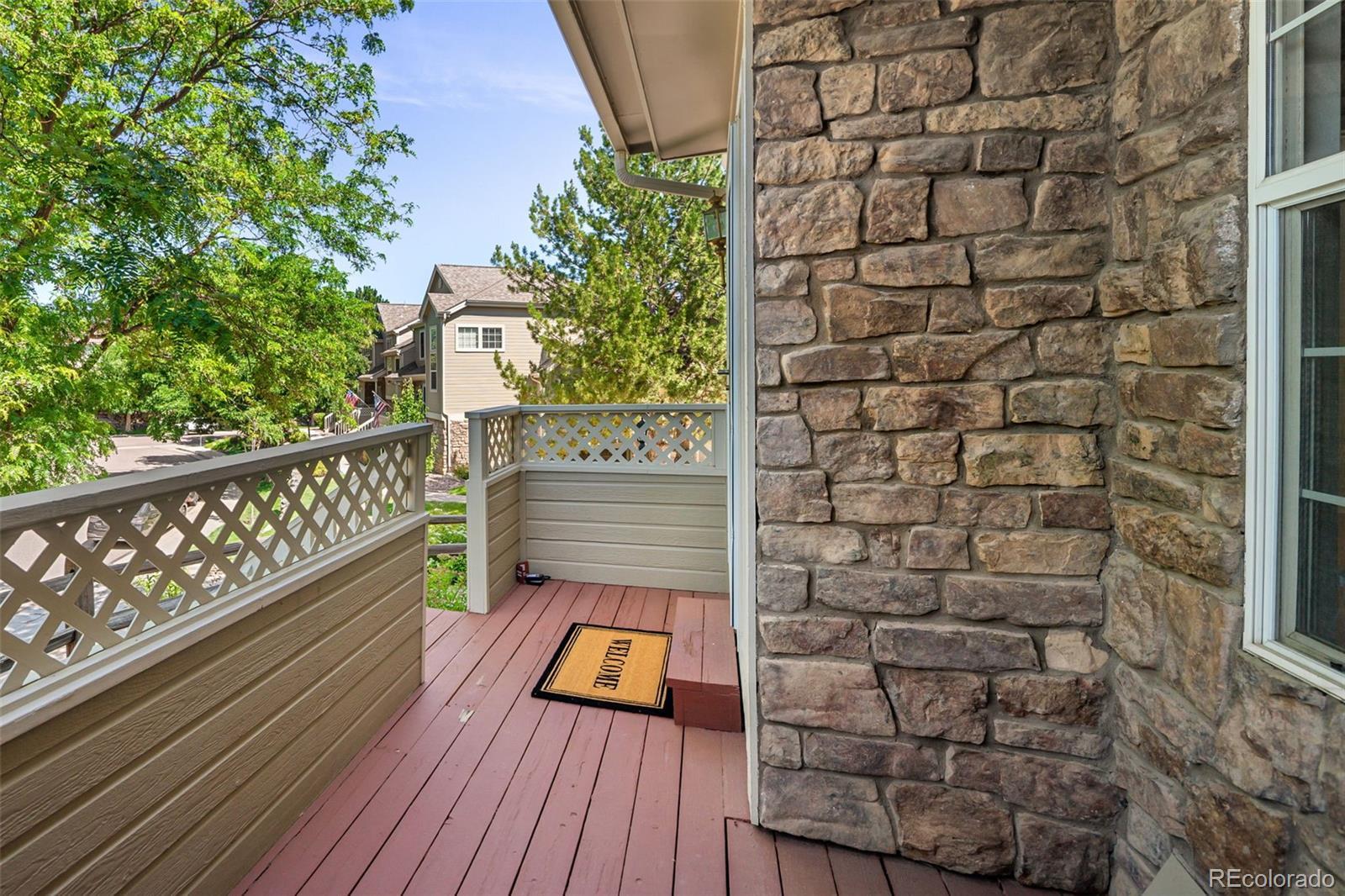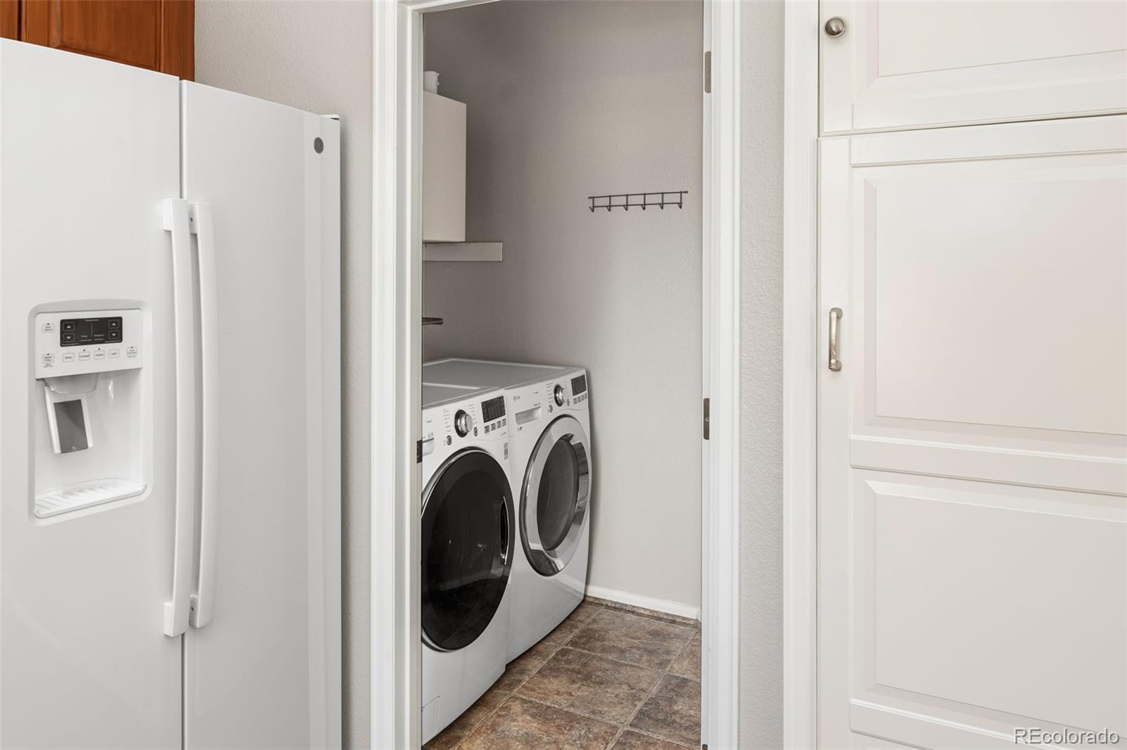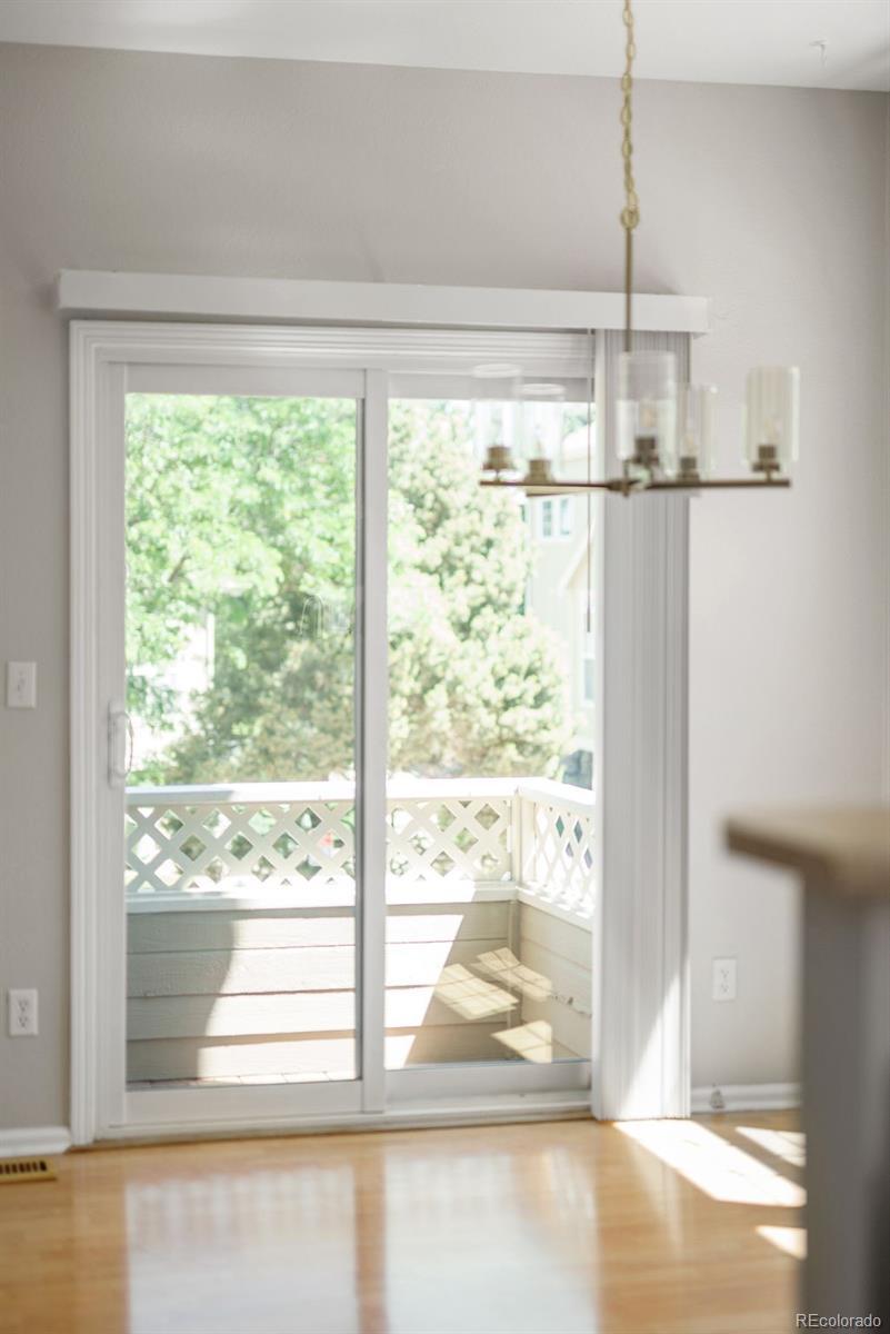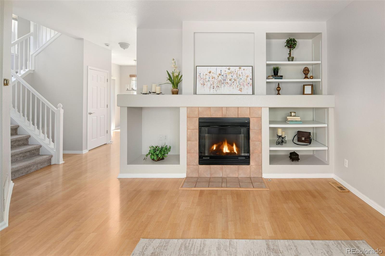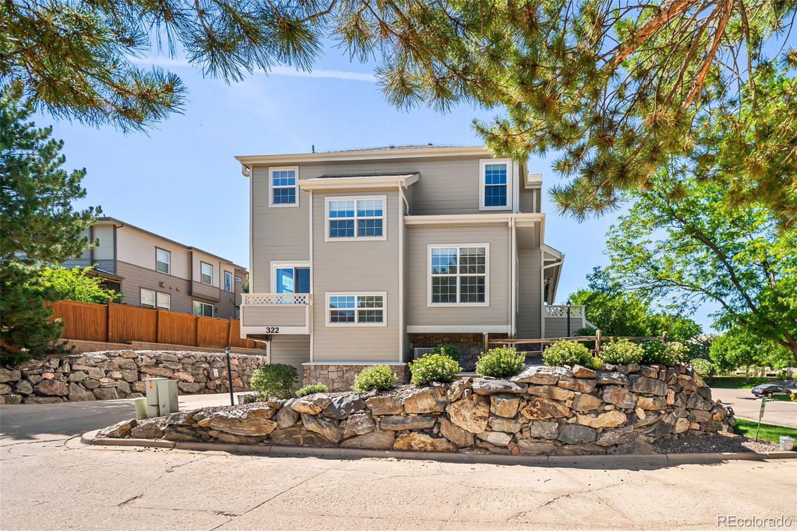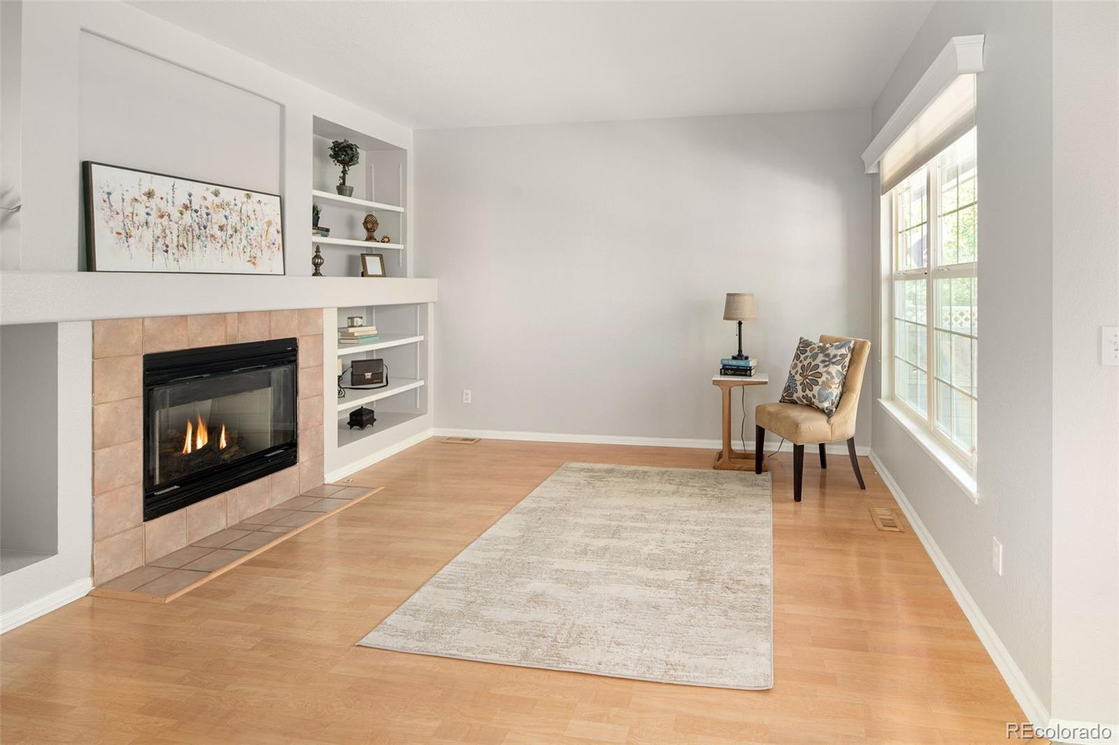 This bright and inviting end-unit townhome stands out with its extra privacy, natural light, and an attached oversized garage with built-in shelving and generous storage. Upstairs, the vaulted-ceiling primary suite offers a true retreat with a walk-in closet featuring a custom organization system and an ensuite bath with a soaking tub and added shelving. Inside, the open floor plan creates a warm, functional living space. The living room features a cozy gas fireplace, built-in bookshelves, and large windows that fill the home with natural light. French doors open to a versatile office or flex room, ideal for remote work. The dining area, accented by a stylish new light fixture, connects to a private balcony overlooking mature, HOA-maintained landscaping—perfect for morning coffee or evening relaxation. The thoughtfully designed kitchen provides ample cabinetry, generous counter space, and a full-size refrigerator. A main-floor laundry room with washer and dryer included adds everyday convenience. Two additional upstairs bedrooms offer bright, comfortable spaces, accompanied by an updated full bathroom. Additional highlights include multiple storage closets, a covered front porch, and well-maintained surroundings—all in a quiet Littleton location close to shopping, dining, parks, and major commuting routes. Move-in ready and beautifully maintained, this home offers comfort, style, and an unbeatable location.