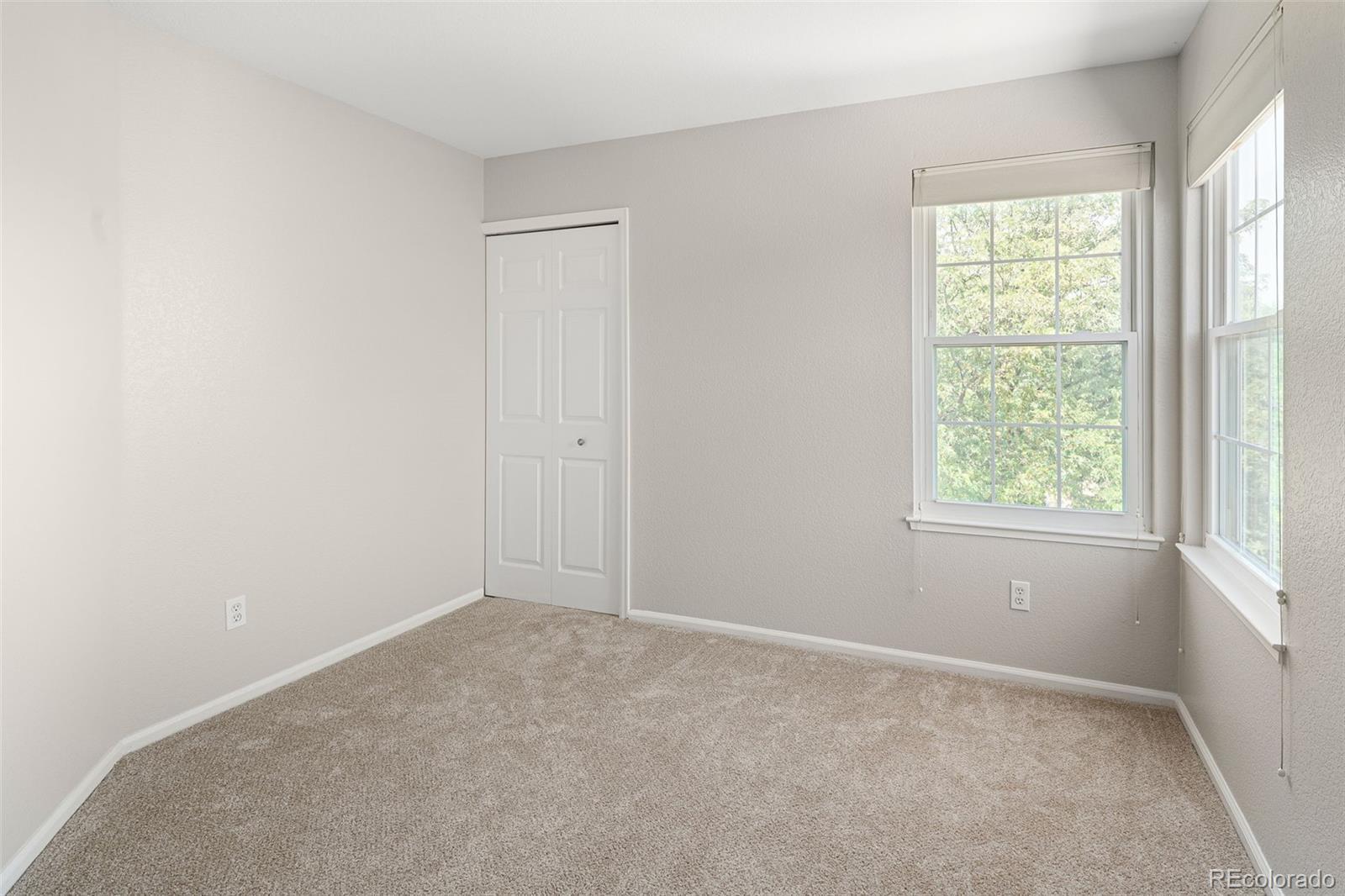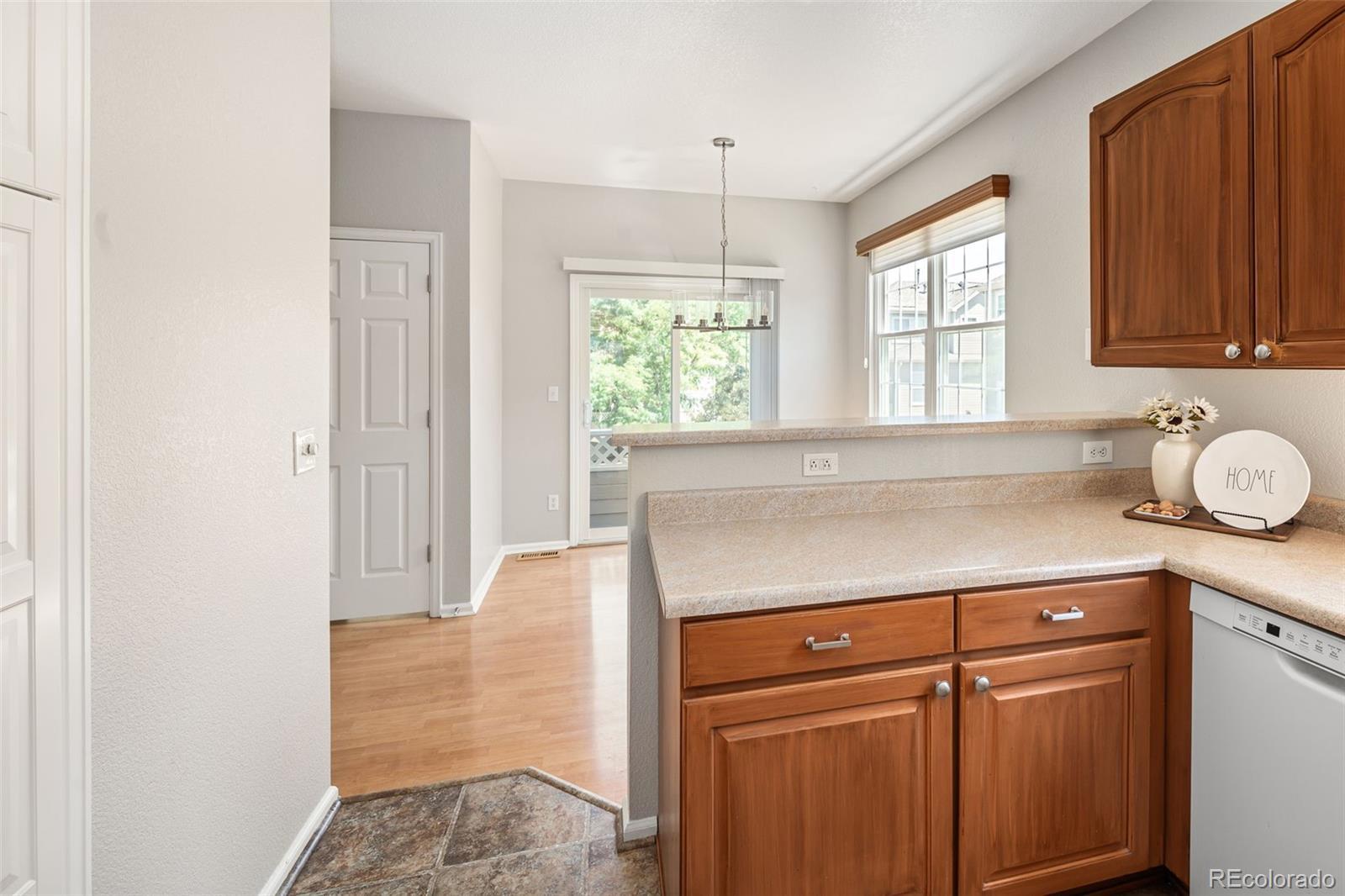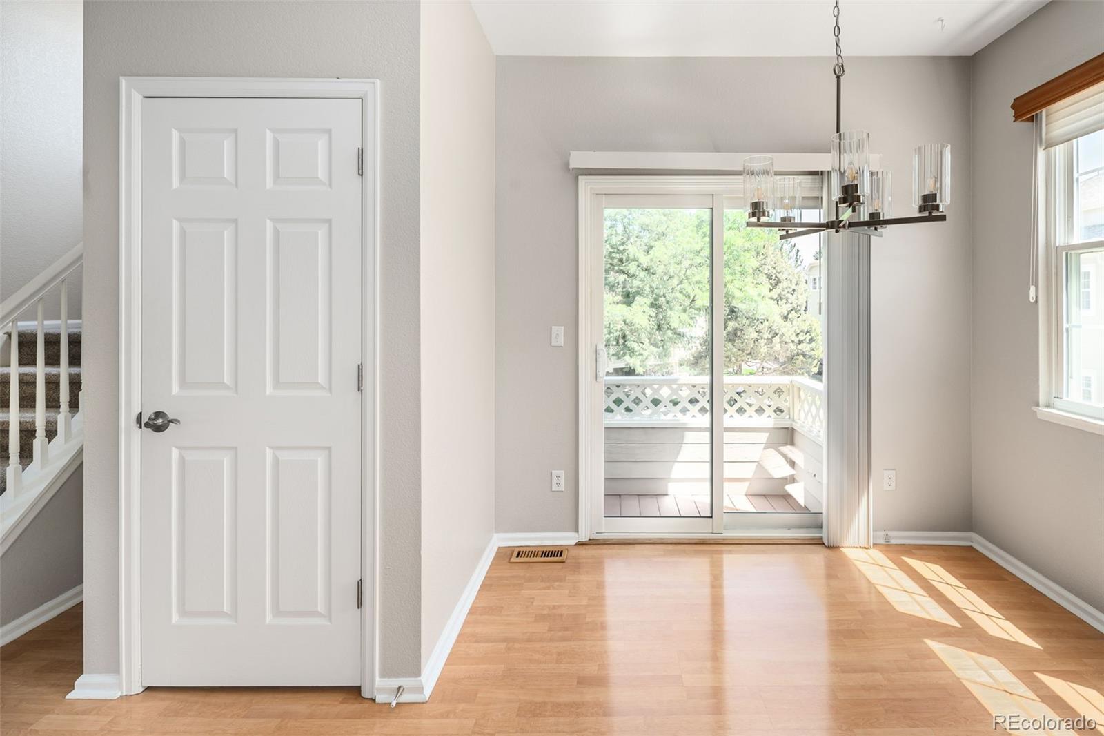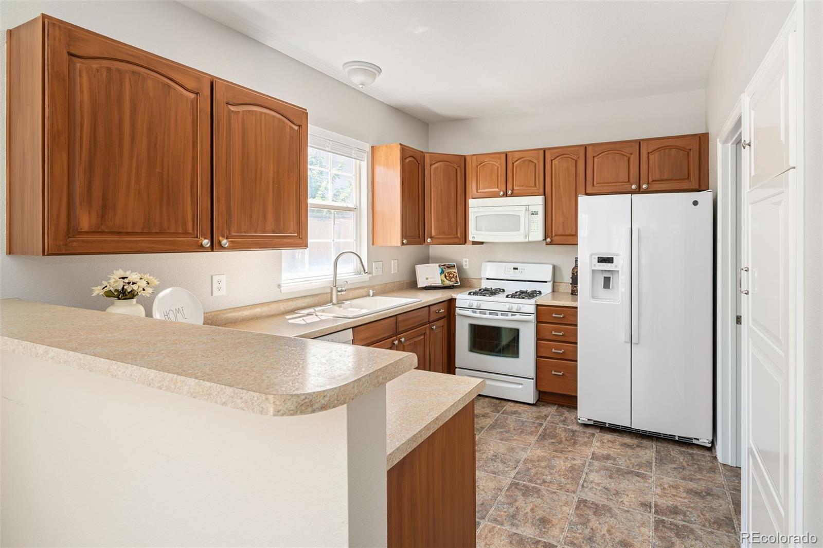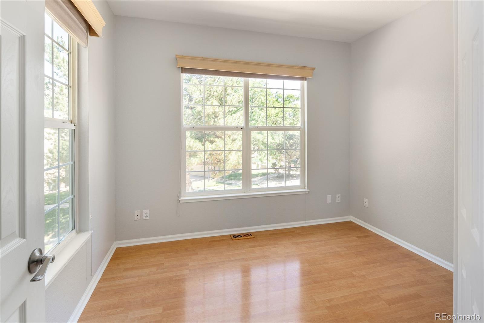 This bright and inviting end-unit townhome stands out with its extra privacy, natural light, and an attached oversized garage with built-in shelving and generous storage. Upstairs, the vaulted-ceiling primary suite offers a true retreat with a walk-in closet featuring a custom organization system and an ensuite bath with a soaking tub and added shelving. Inside, the open floor plan creates a warm, functional living space. The living room features a cozy gas fireplace, built-in bookshelves, and large windows that fill the home with natural light. French doors open to a versatile office or flex room, ideal for remote work. The dining area, accented by a stylish new light fixture, connects to a private balcony overlooking mature, HOA-maintained landscaping—perfect for morning coffee or evening relaxation. The thoughtfully designed kitchen provides ample cabinetry, generous counter space, and a full-size refrigerator. A main-floor laundry room with washer and dryer included adds everyday convenience. Two additional upstairs bedrooms offer bright, comfortable spaces, accompanied by an updated full bathroom. Additional highlights include multiple storage closets, a covered front porch, and well-maintained surroundings—all in a quiet Littleton location close to shopping, dining, parks, and major commuting routes. Move-in ready and beautifully maintained, this home offers comfort, style, and an unbeatable location.