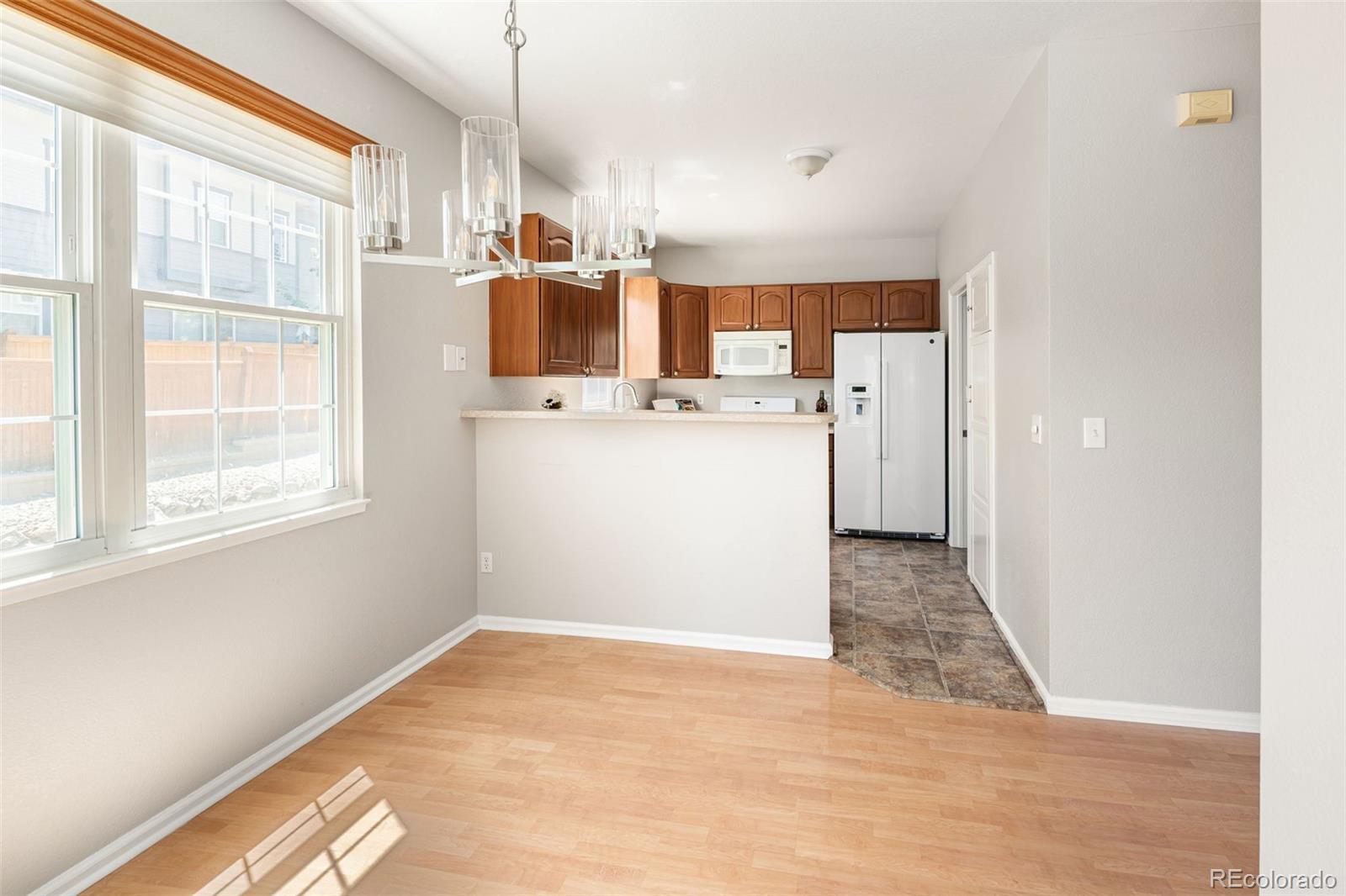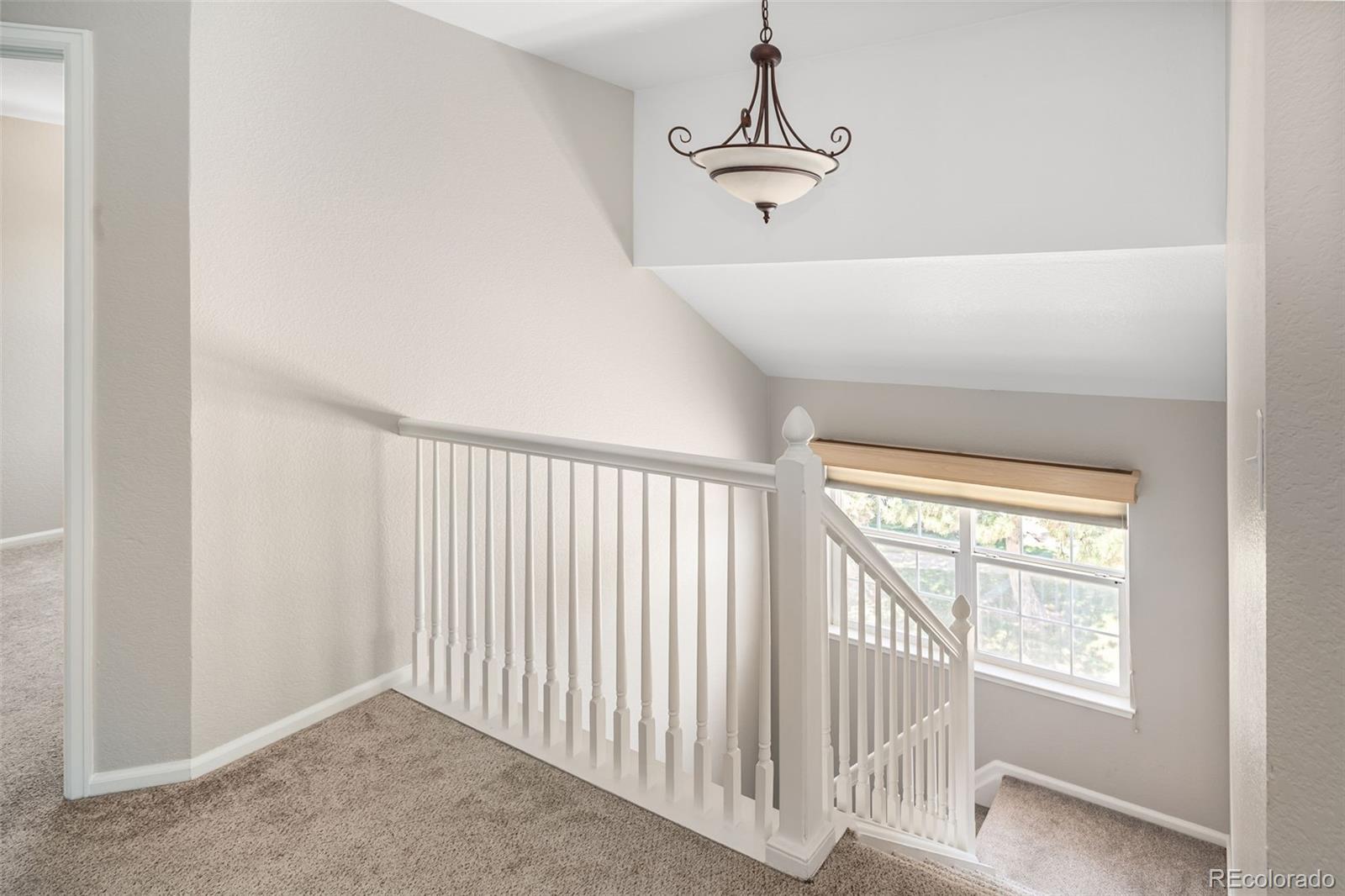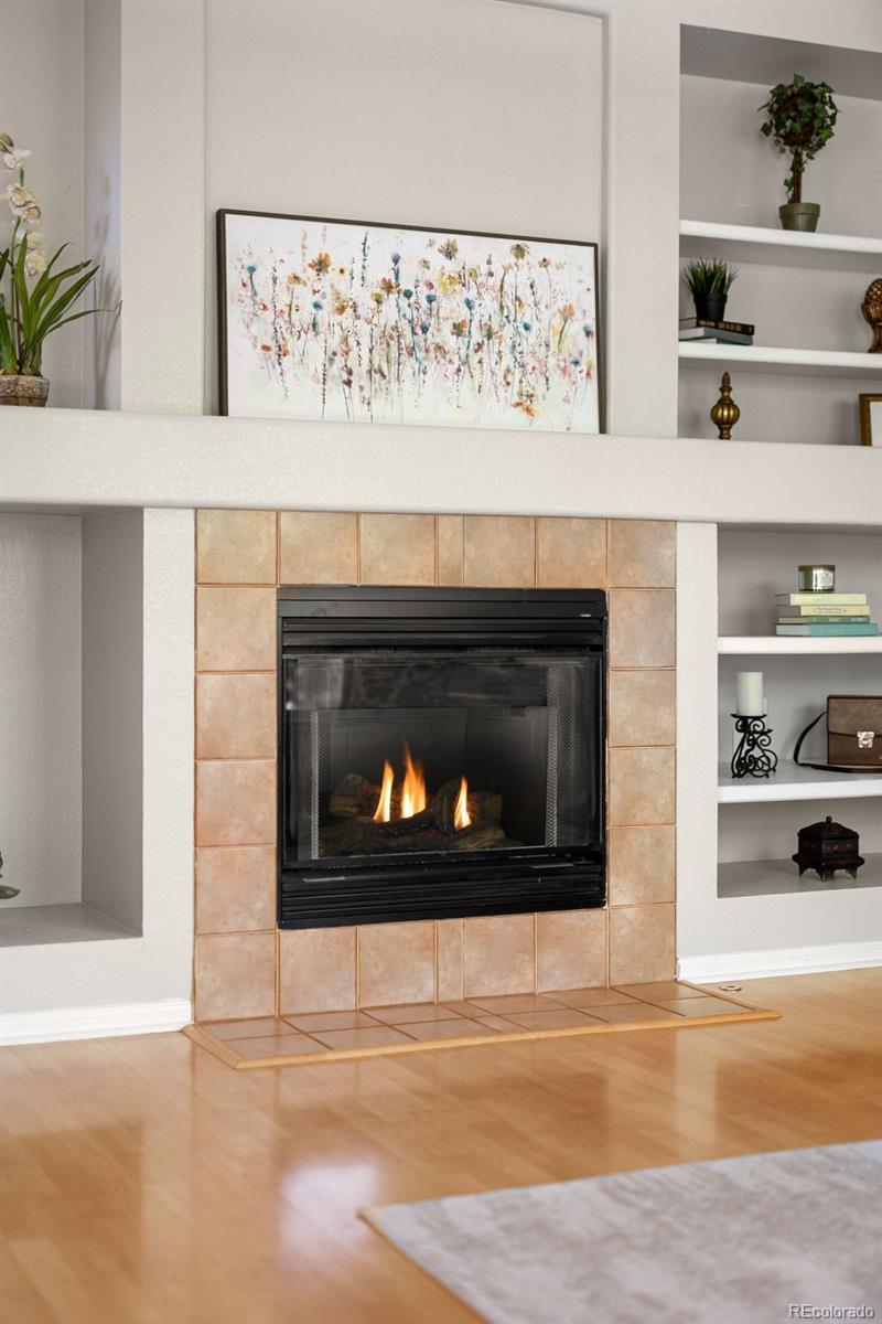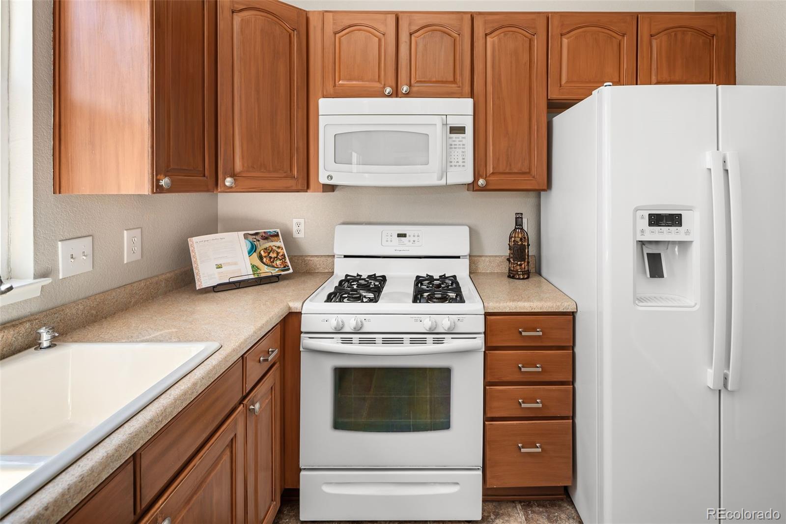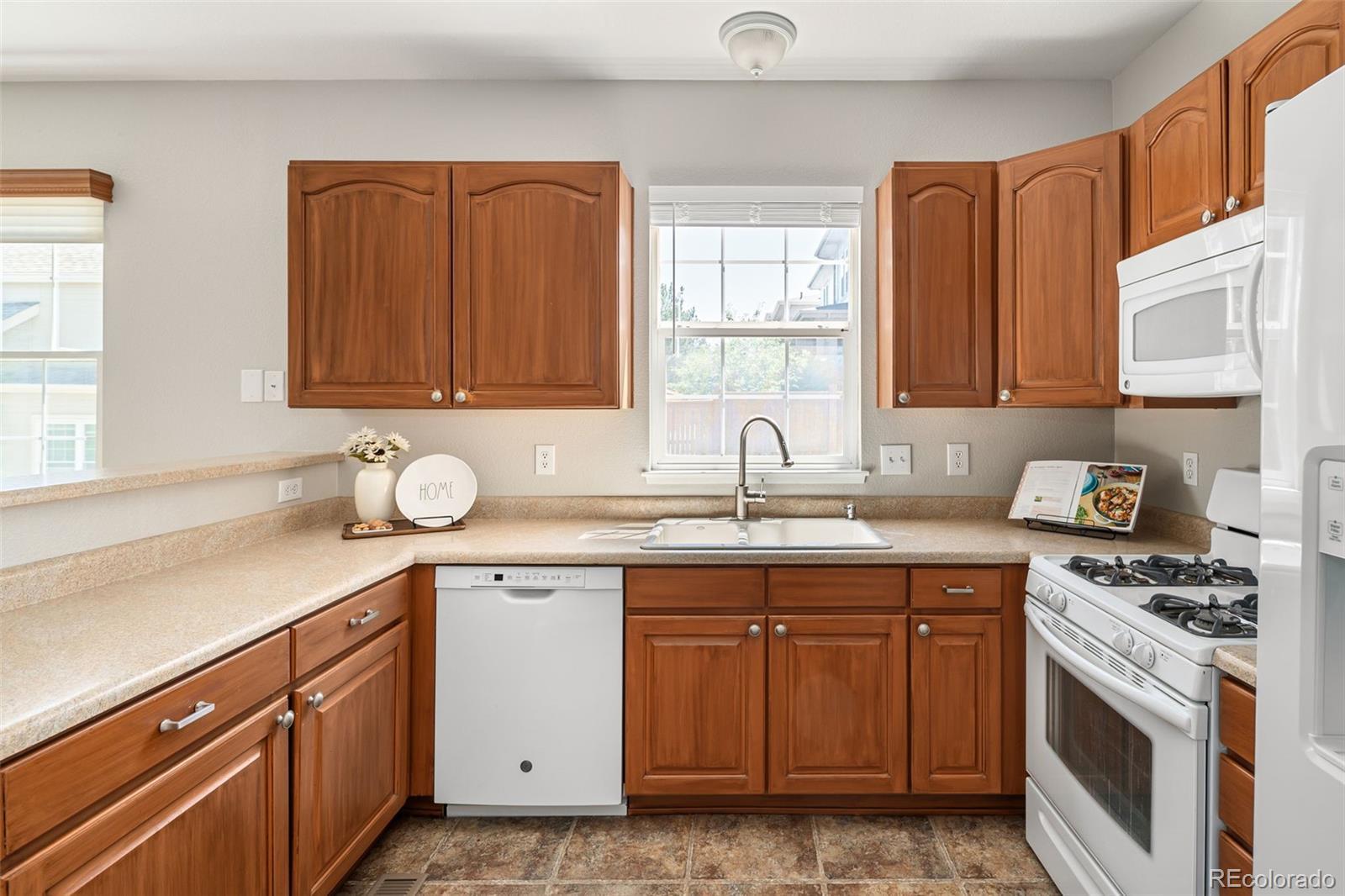 This bright and inviting end-unit townhome stands out with its extra privacy, natural light, and an attached oversized garage with built-in shelving and generous storage. Upstairs, the vaulted-ceiling primary suite offers a true retreat with a walk-in closet featuring a custom organization system and an ensuite bath with a soaking tub and added shelving. Inside, the open floor plan creates a warm, functional living space. The living room features a cozy gas fireplace, built-in bookshelves, and large windows that fill the home with natural light. French doors open to a versatile office or flex room, ideal for remote work. The dining area, accented by a stylish new light fixture, connects to a private balcony overlooking mature, HOA-maintained landscaping—perfect for morning coffee or evening relaxation. The thoughtfully designed kitchen provides ample cabinetry, generous counter space, and a full-size refrigerator. A main-floor laundry room with washer and dryer included adds everyday convenience. Two additional upstairs bedrooms offer bright, comfortable spaces, accompanied by an updated full bathroom. Additional highlights include multiple storage closets, a covered front porch, and well-maintained surroundings—all in a quiet Littleton location close to shopping, dining, parks, and major commuting routes. Move-in ready and beautifully maintained, this home offers comfort, style, and an unbeatable location.