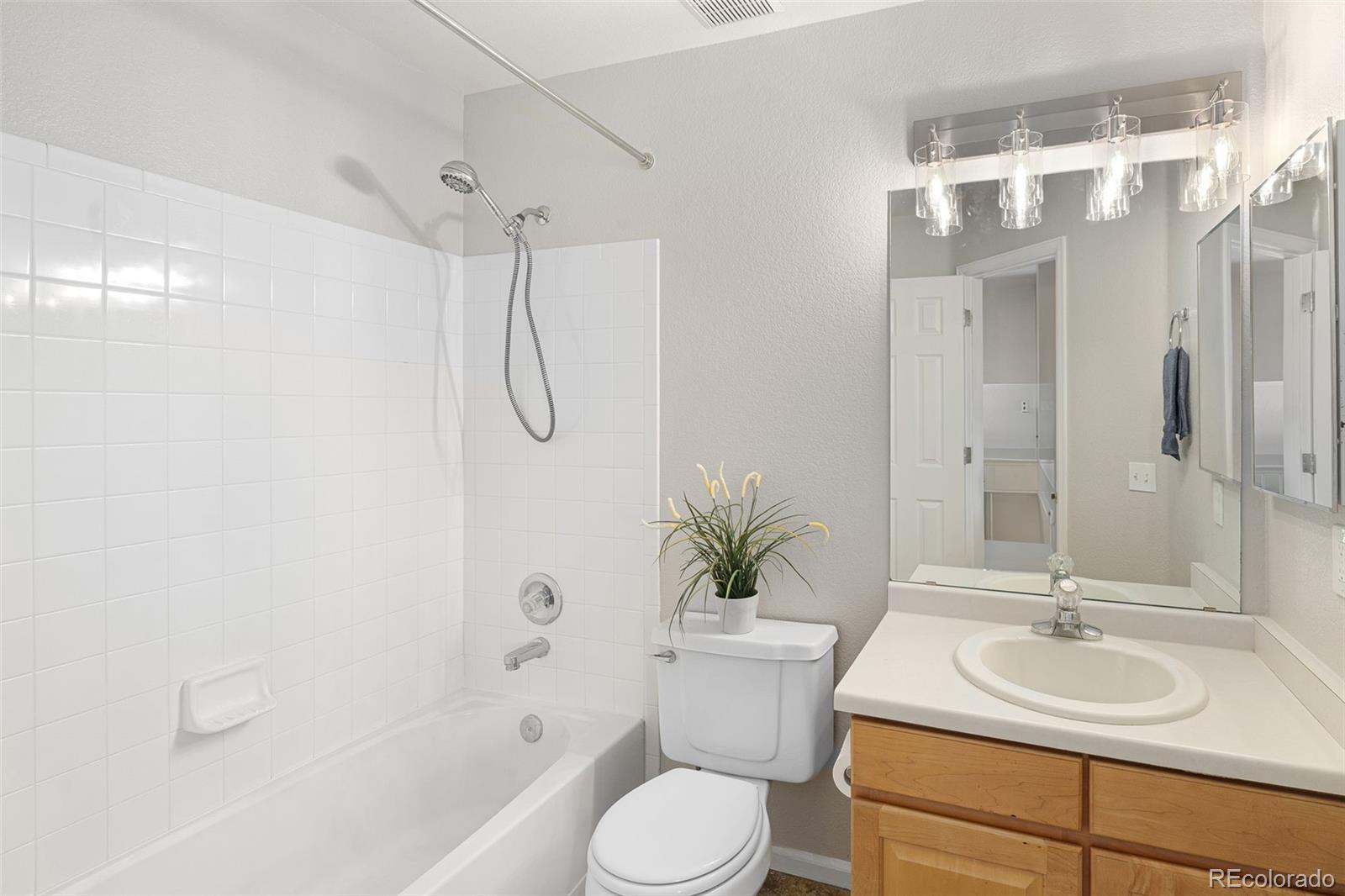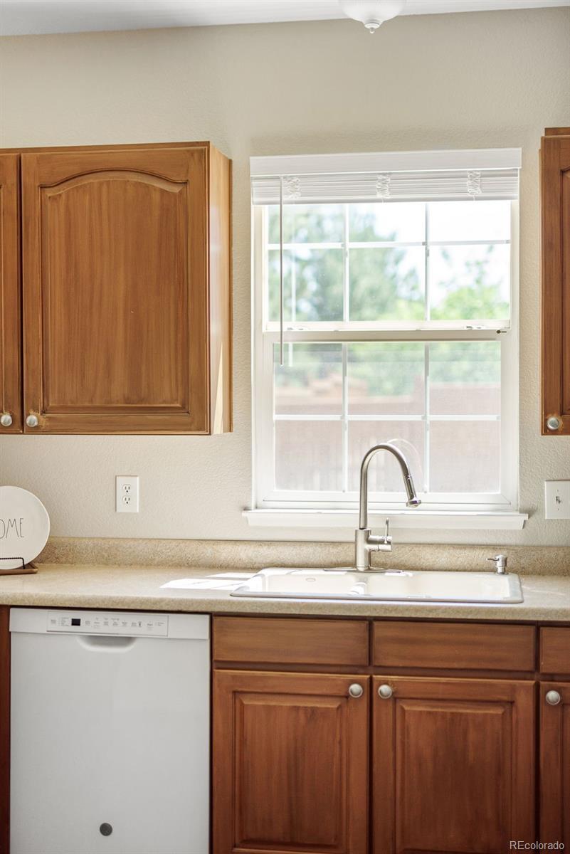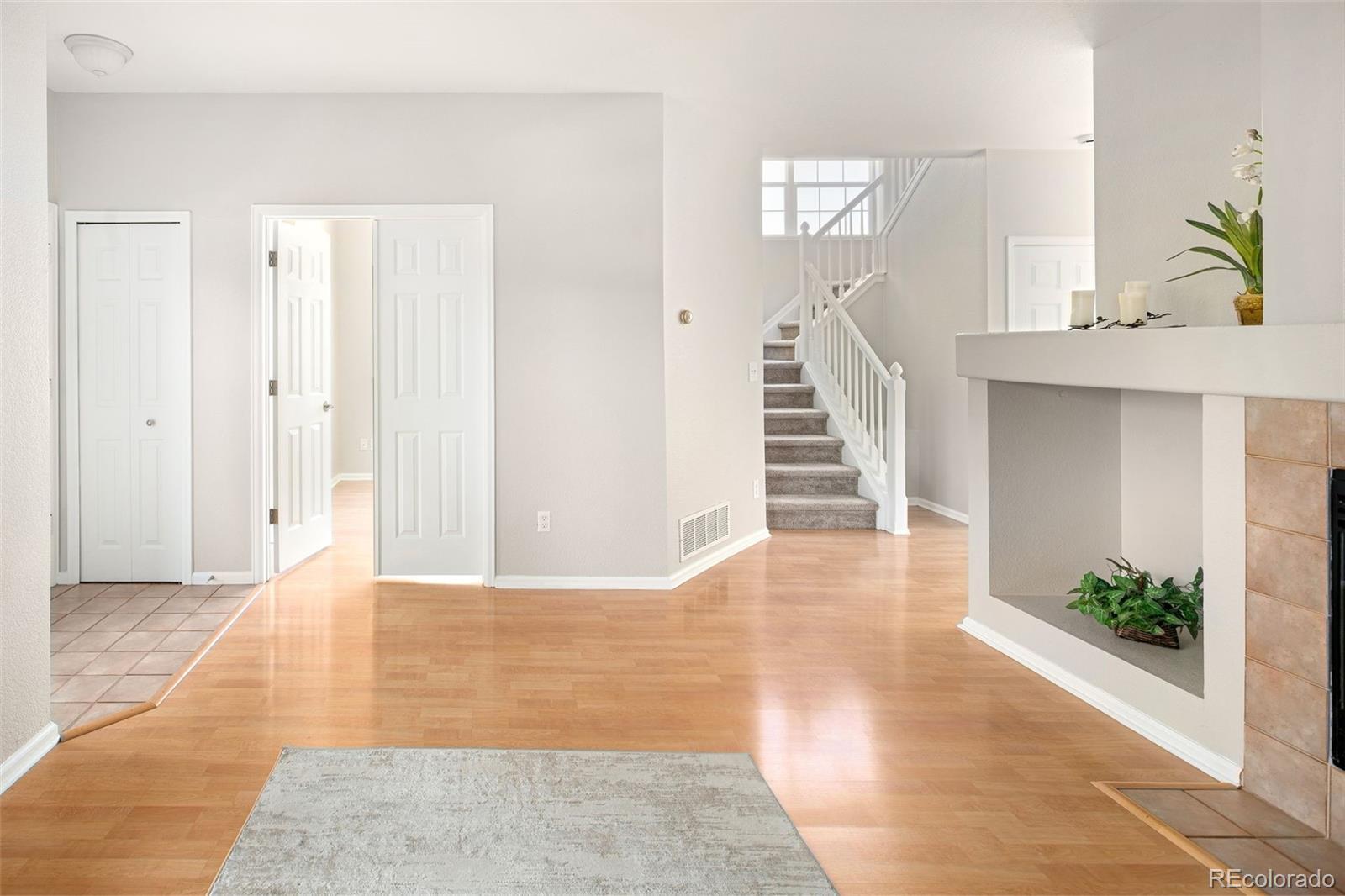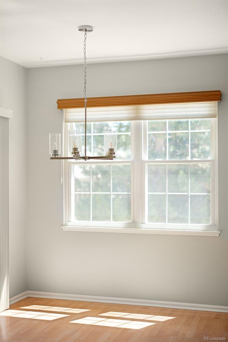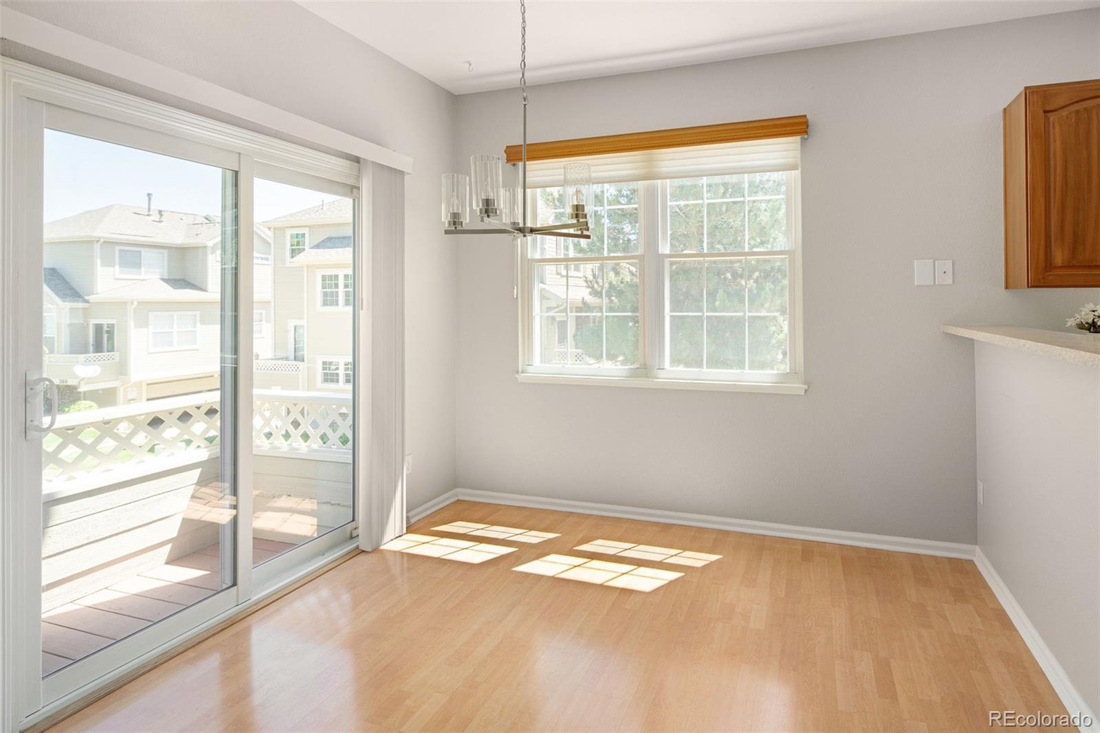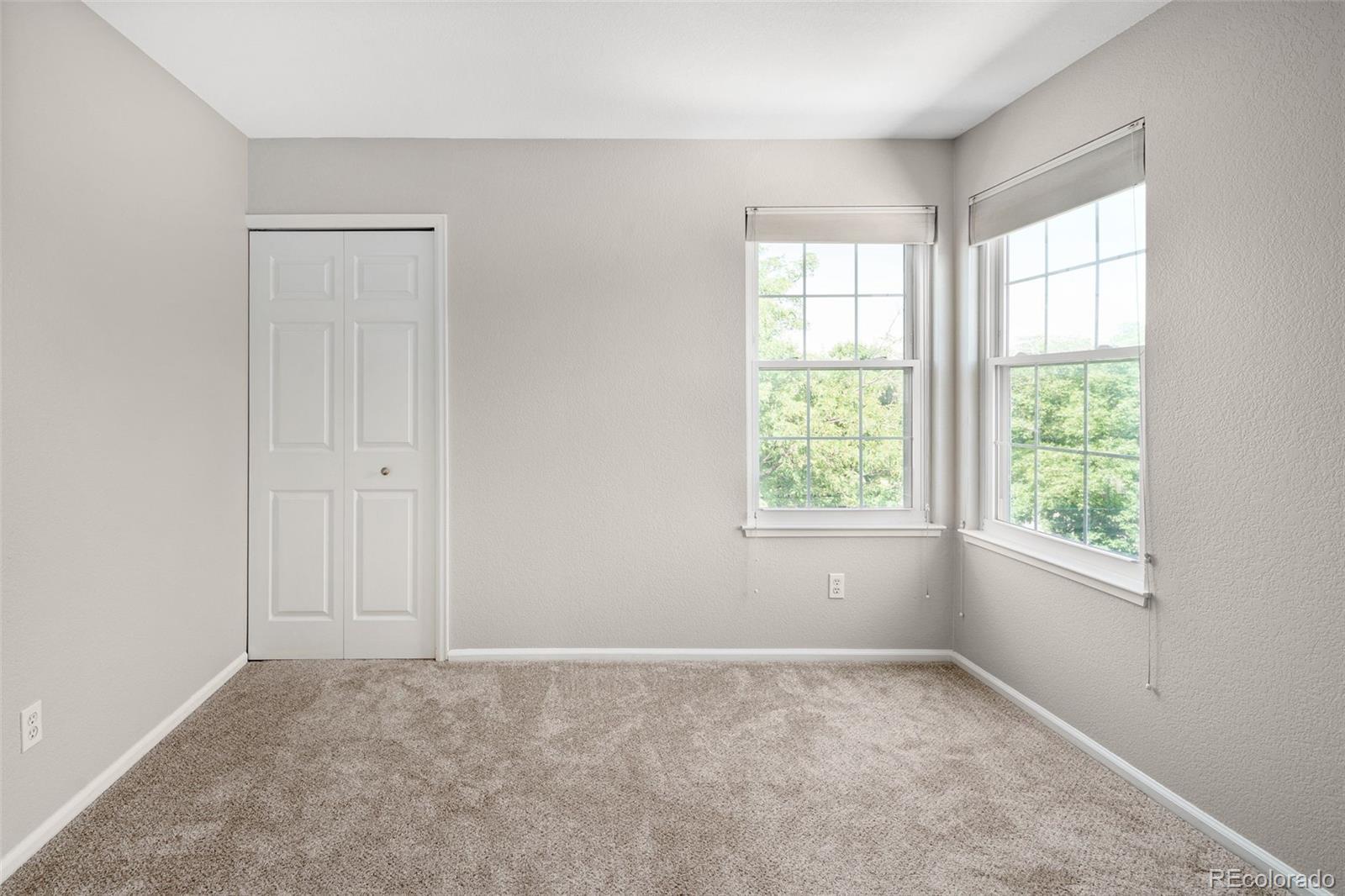 This bright and inviting end-unit townhome stands out with its extra privacy, natural light, and an attached oversized garage with built-in shelving and generous storage. Upstairs, the vaulted-ceiling primary suite offers a true retreat with a walk-in closet featuring a custom organization system and an ensuite bath with a soaking tub and added shelving. Inside, the open floor plan creates a warm, functional living space. The living room features a cozy gas fireplace, built-in bookshelves, and large windows that fill the home with natural light. French doors open to a versatile office or flex room, ideal for remote work. The dining area, accented by a stylish new light fixture, connects to a private balcony overlooking mature, HOA-maintained landscaping—perfect for morning coffee or evening relaxation. The thoughtfully designed kitchen provides ample cabinetry, generous counter space, and a full-size refrigerator. A main-floor laundry room with washer and dryer included adds everyday convenience. Two additional upstairs bedrooms offer bright, comfortable spaces, accompanied by an updated full bathroom. Additional highlights include multiple storage closets, a covered front porch, and well-maintained surroundings—all in a quiet Littleton location close to shopping, dining, parks, and major commuting routes. Move-in ready and beautifully maintained, this home offers comfort, style, and an unbeatable location.