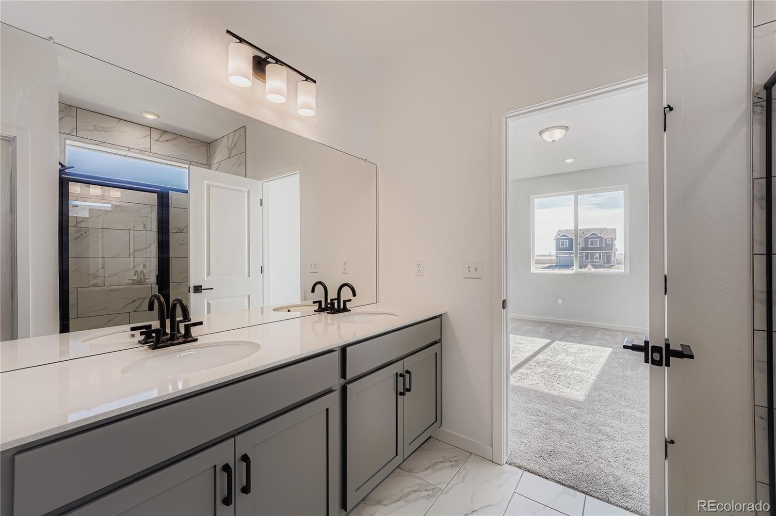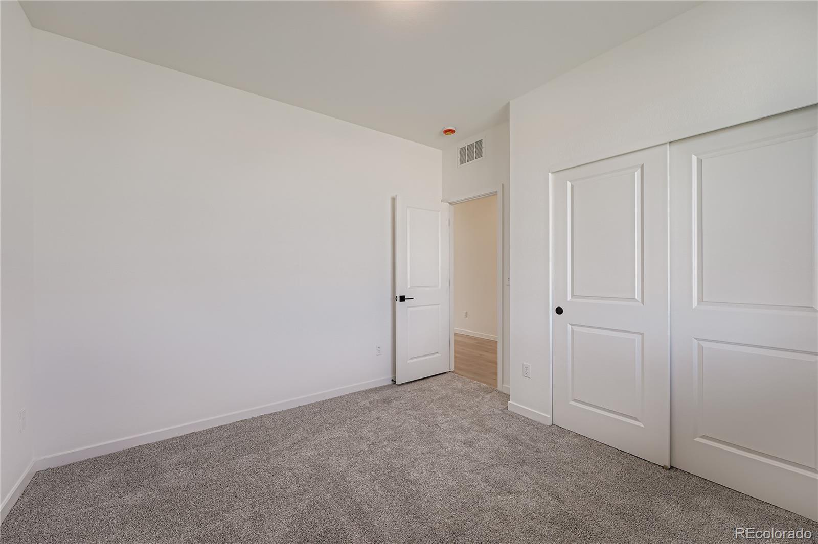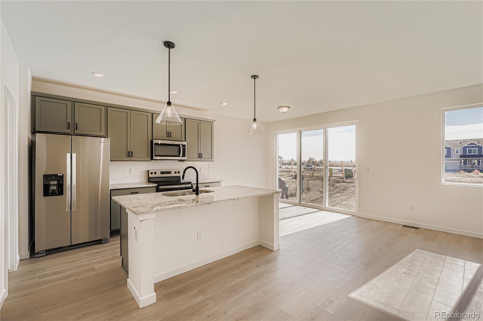 Great financing incentives available! MOVE-IN READY! Beautiful new single story, 3-bedroom, 2-bath home with 1,700 square feet. Located in the heart of Strasburg, CO, this home combines modern comfort with small-town living just 30 minutes from Denver. Step inside to an open-concept main level featuring bright natural light and a spacious living area that flows effortlessly into the kitchen and dining space. The 9’ ceilings create a bright and airy living space. The kitchen boasts stainless steel appliances, a large island with seating, plenty of counter space, beautiful dark gray 42” upper cabinets, granite countertops, and built in microwave. The home also includes a private primary suite with oversized walk-in closet and ensuite bathroom featuring dual vanities. Wolf Creek offers the tranquility of remote living with an easy commute to the Denver metro area.