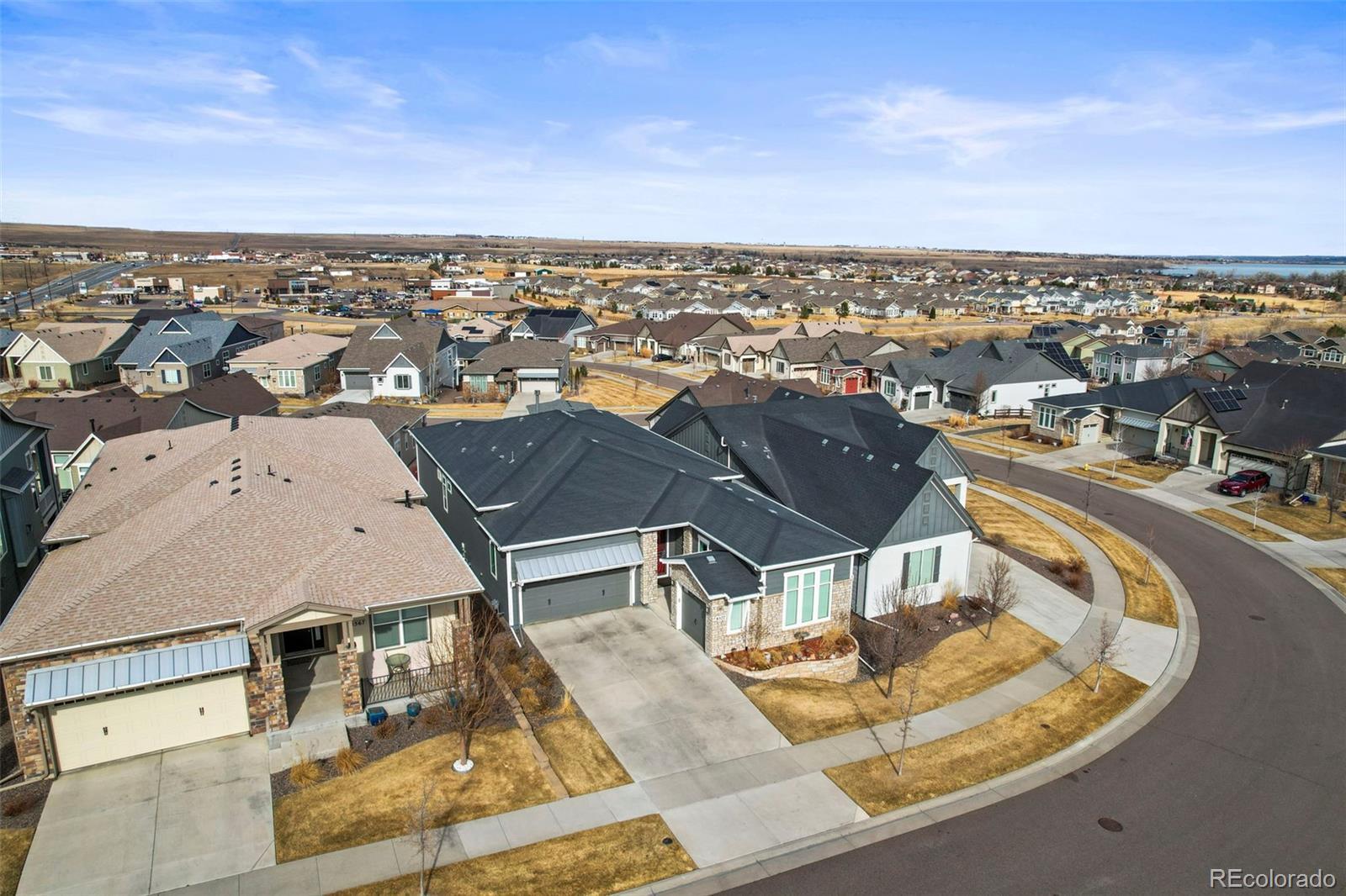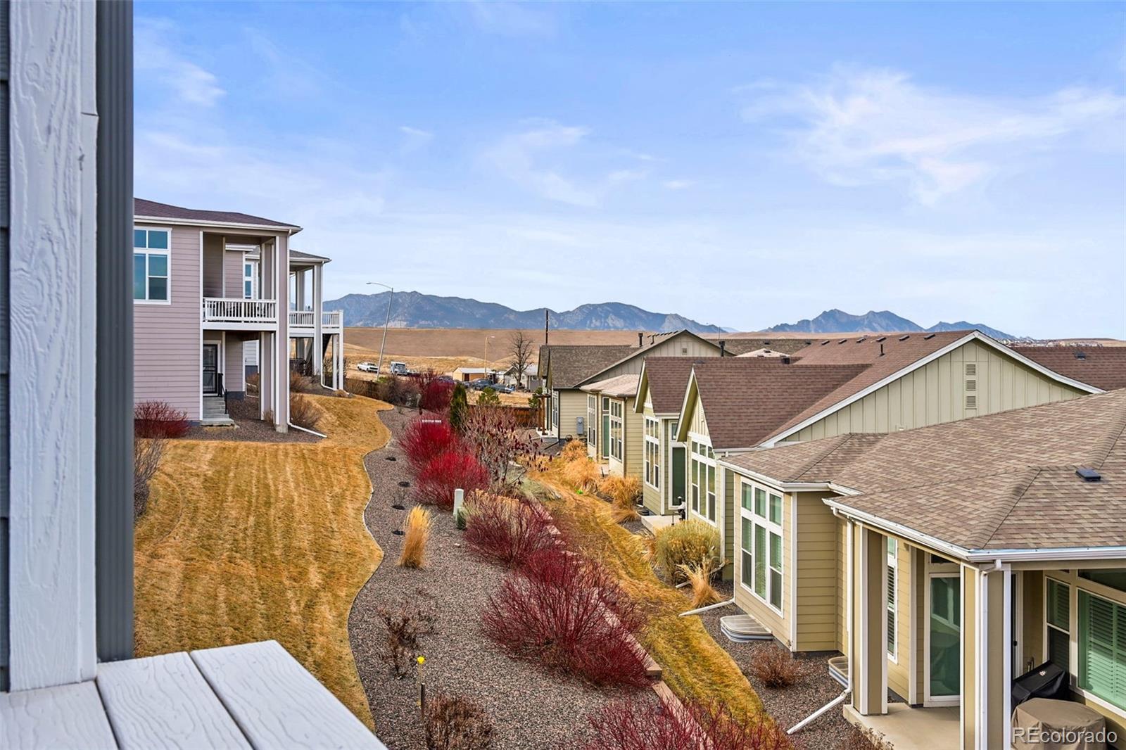 Stunning patio home with incredible mountain views and a walkout basement. Perfectly positioned to capture the Flatirons, you can enjoy breathtaking sunsets and wide-open skies from the upper deck. The open floor plan is filled with natural light and soaring ceilings that create a bright, spacious feel throughout. Beautiful hardwood floors extend across the main living areas, adding warmth and elegance. The gourmet kitchen is truly the heart of the home, featuring a large island, abundant cabinetry, stainless steel appliances, double ovens, and stunning quartz countertops that seamlessly flow into a full-height backsplash. A gorgeous fireplace in the living room creates a cozy focal point and enhances the inviting atmosphere. The kitchen flows effortlessly into the dining and living areas, making it ideal for both everyday living and entertaining. The main floor includes a spacious primary suite with beautiful mountain views. An arched entry leads into the luxurious primary bath, featuring a large, beautifully tiled shower, double vanity, and upper windows that bring in wonderful natural light. A secondary bedroom and full bath on the main level are perfect for guests, while the dedicated main floor office offers excellent flexibility for working from home. The finished walkout lower level includes a large family room, two additional bedrooms, and direct outdoor access, providing exceptional space for guests, hobbies, or extended living. Complete with a 3-car garage and designed for low-maintenance living, this exceptional patio home offers comfort, functionality, and spectacular Colorado mountain views.