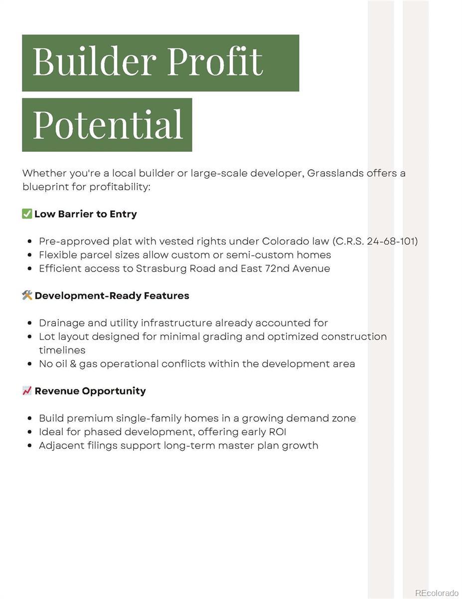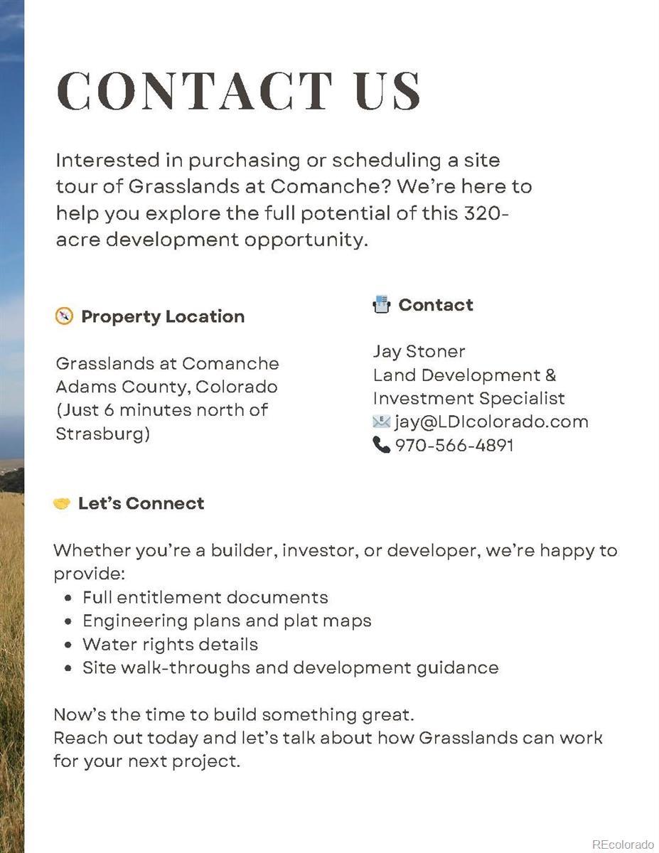 ATTENTION BUILDER DEVELOPERS!! Shovel ready residential acreage development just east of DIA and 5 miles north of Strasburg Colorado. Price includes 34 lots fully approved and ready to develop. Plus 56 paper lots not yet ready to develop. All 90 lots include the water rights allowing each lot to drill a domestic well. Lots vary is size from 2.5 acres to 7.26 acres. The first two phases of 28 lots have been successfully sold out and most of the existing lots have beautiful custom homes on them. Very peaceful and quiet community but conveniently located just 30 minutes to DIA and 40 minutes to Denver. Please call or email Jay Stoner for additional information and to schedule a site visit.