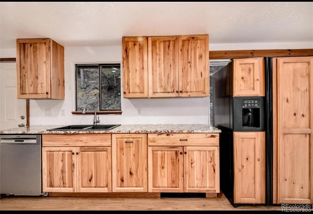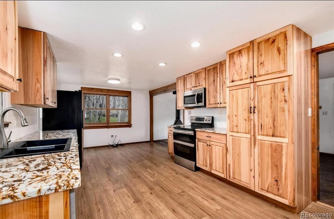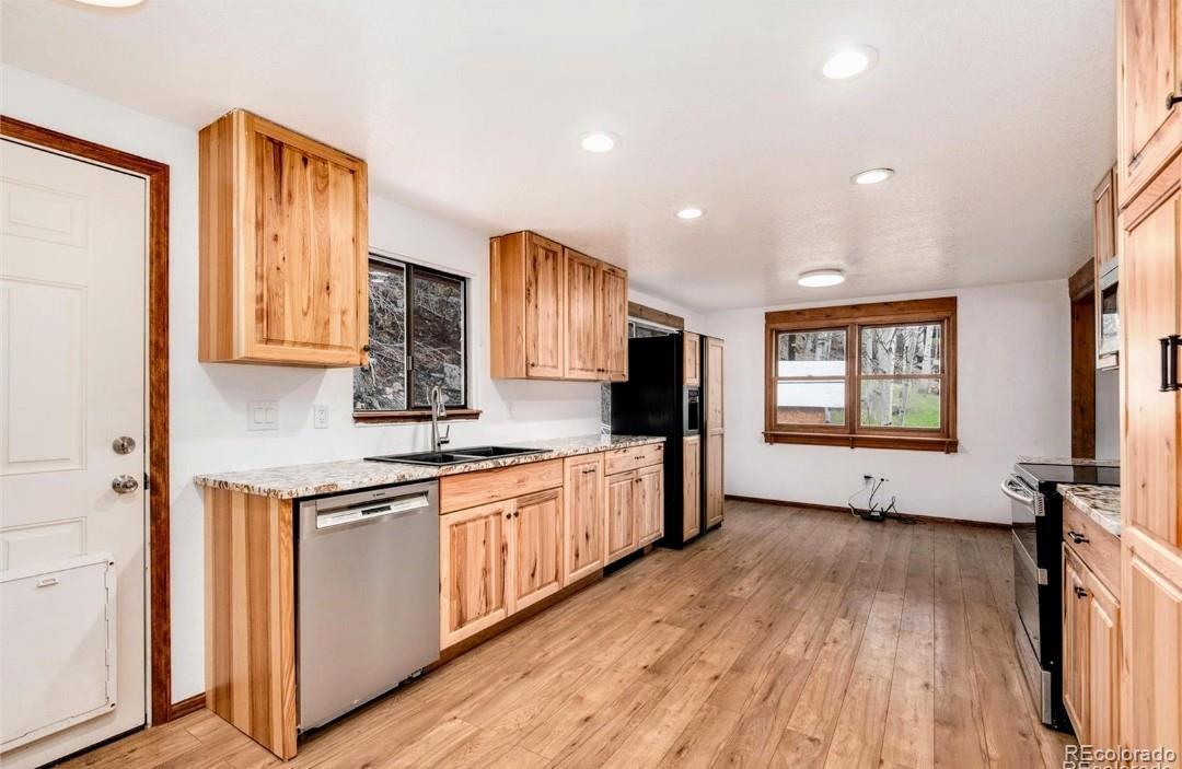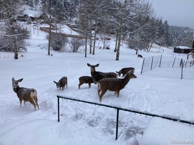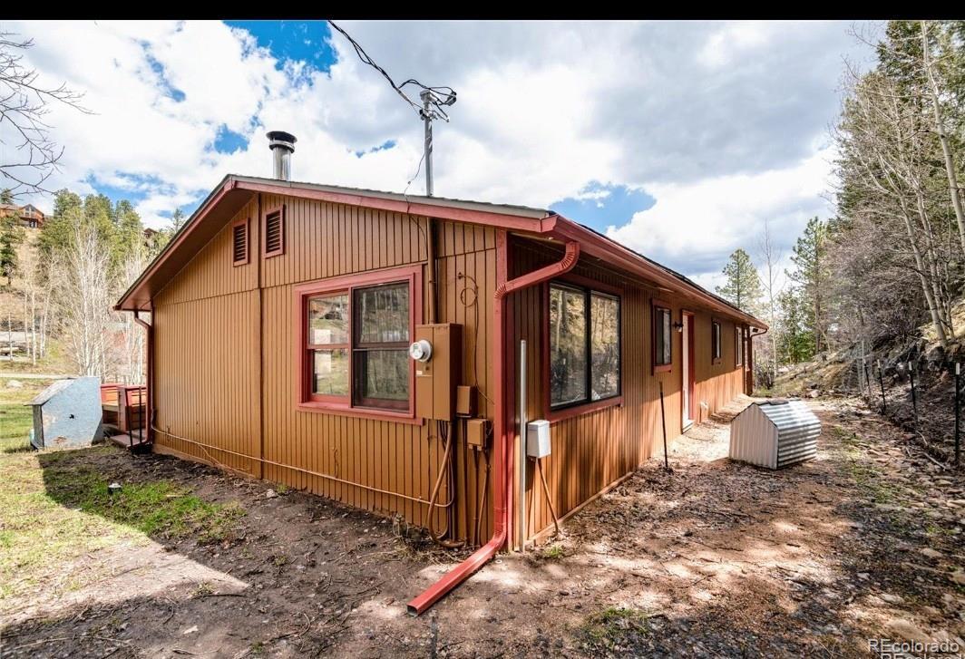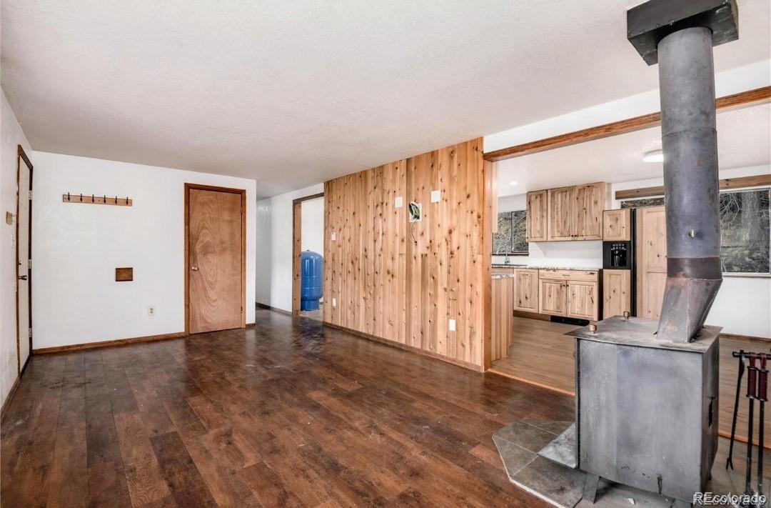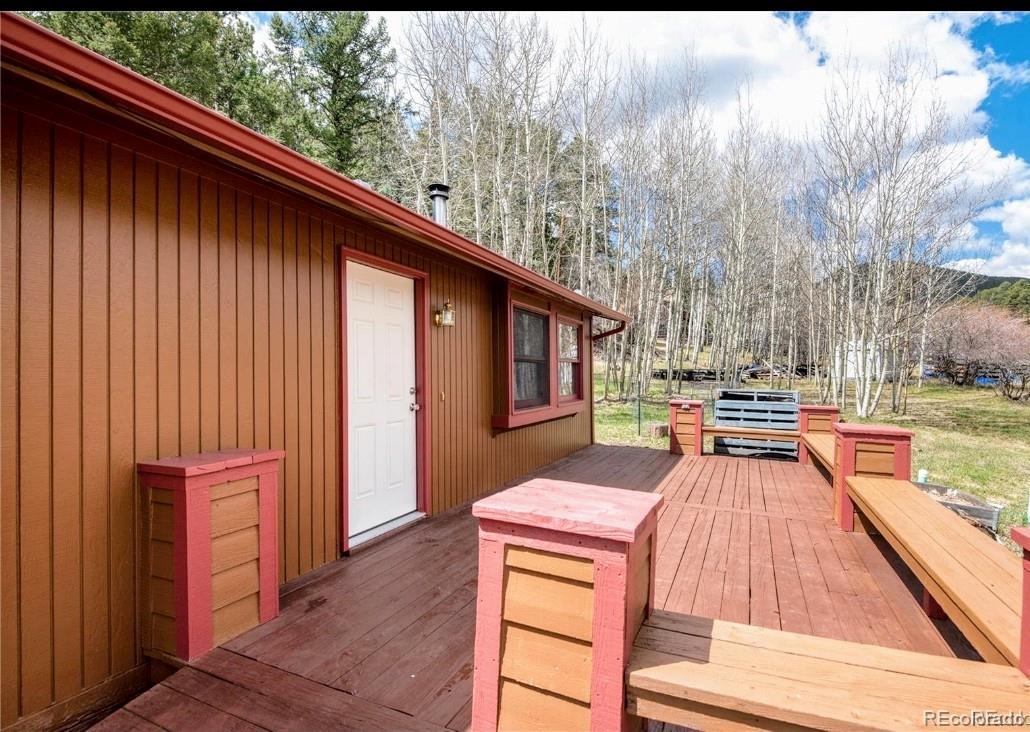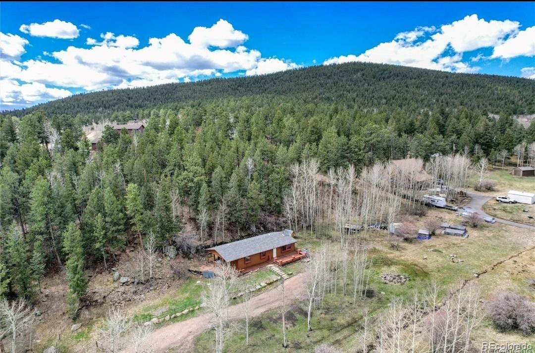 3 Bed 3 Bath Ranch Style Home 1150 sqft. 4 minutes from 285. House is Clean, Bright and Move in Ready. 1.2 Flat Acre with Aspen Trees / Grove. Seasonal Stream at front of property. Wildlife Abundant. Remodeled Kitchen and Baths. Primary bath has double shower. New Paint and Carpet in bedrooms. On Demand Tankless Water Heater. Wood floors in living area. Each bedroom has individual ceiling radiant heat source. Plus, Wood Burn Stove. Double Pane Windows. Easy driveway access to property. Plenty of room for vehicles and toys. Fenced large yard area for dogs. Zoning allows small livestock. Property is HUD Tagged for Easy Loan Accesability.