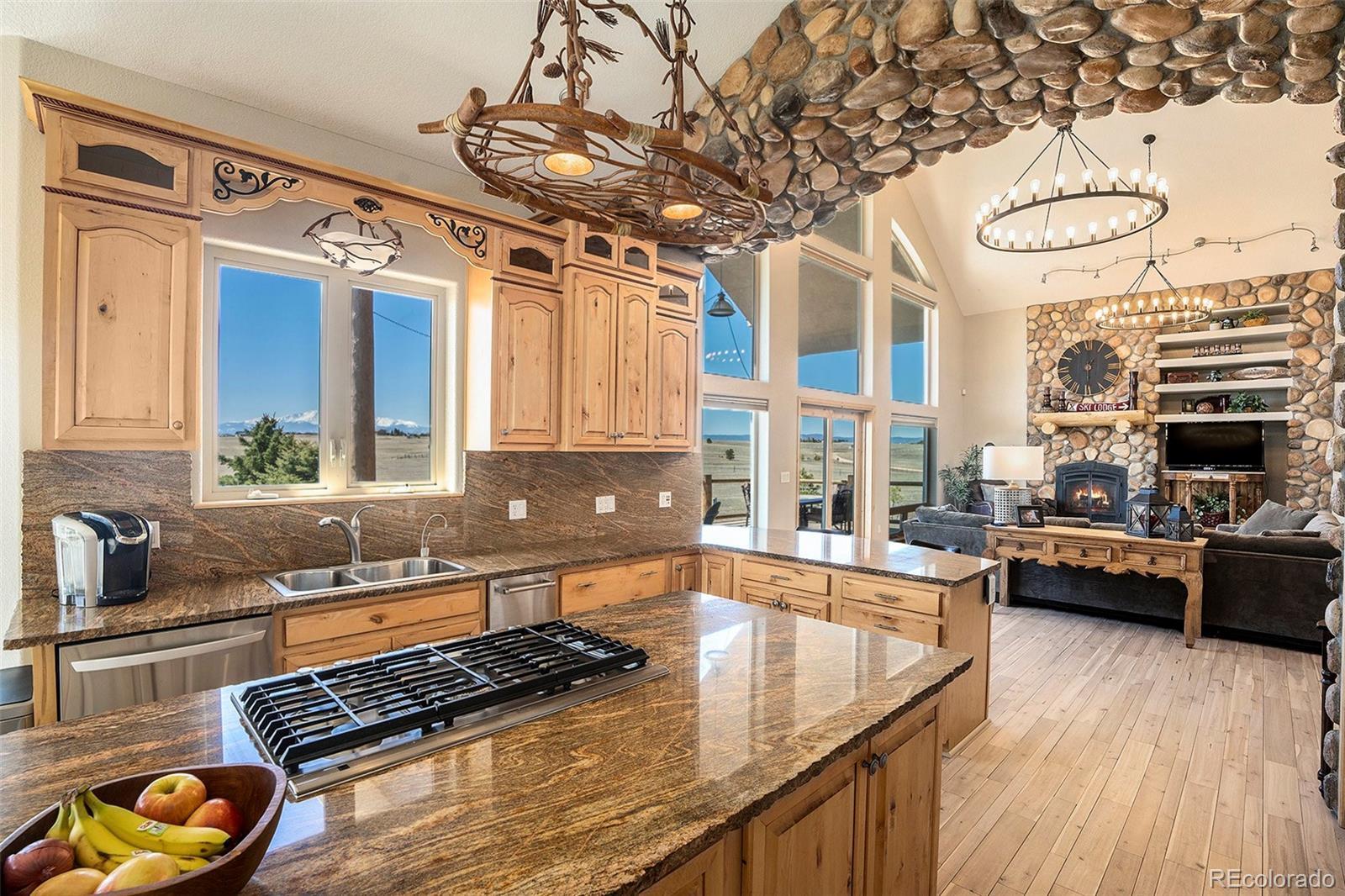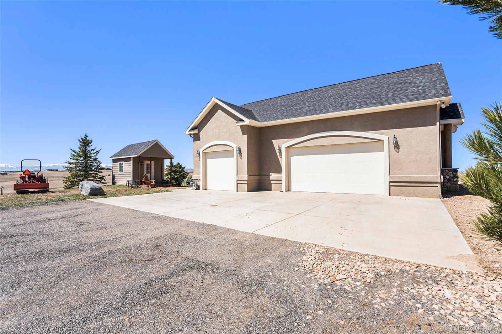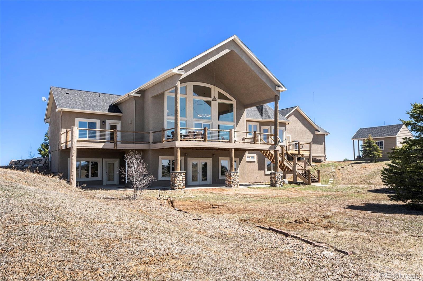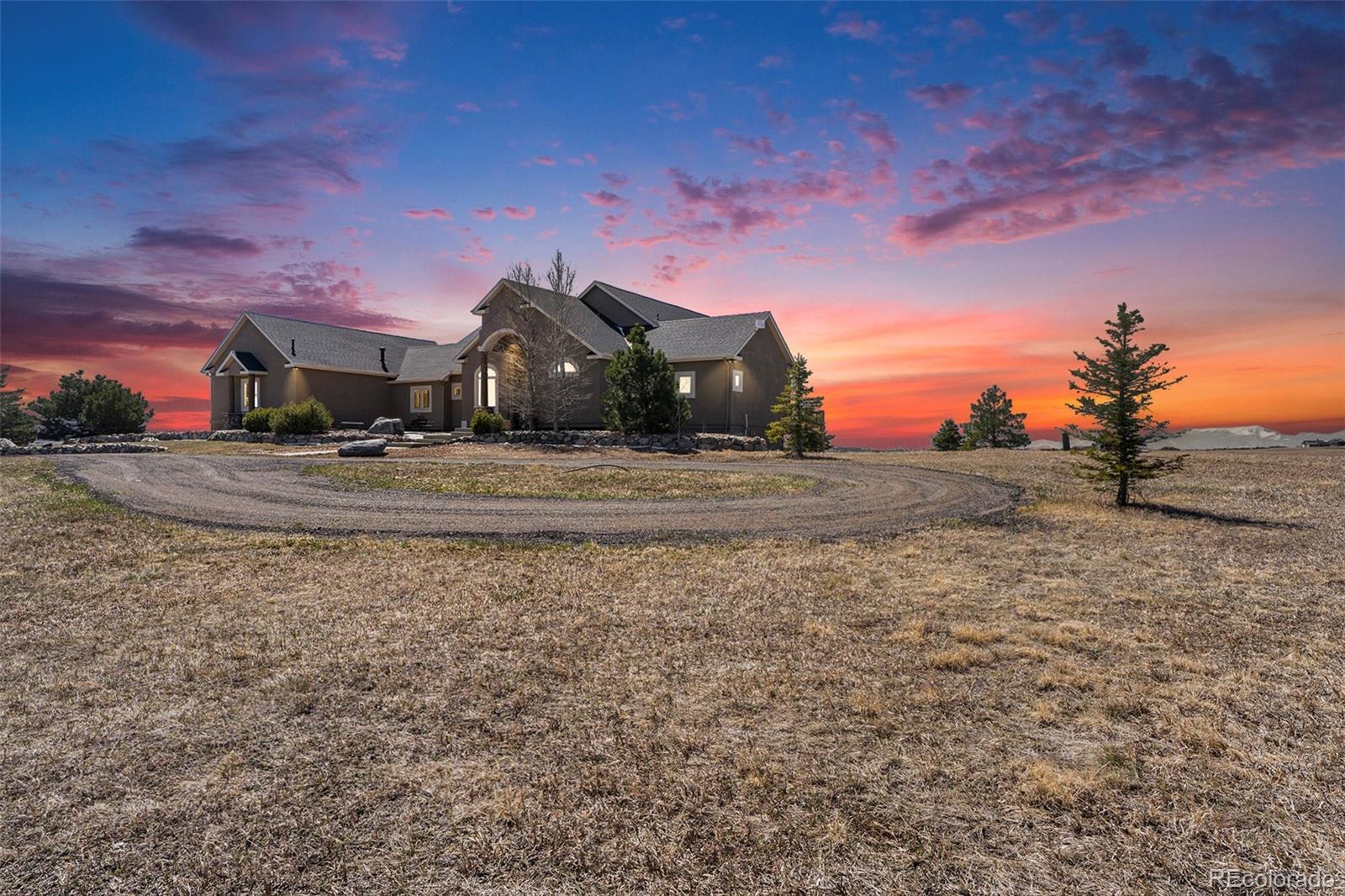 Your Private Colorado Retreat Nestled on over 35 acres with panoramic Pikes Peak views from nearly every room, this elegant home offers the perfect balance of privacy and proximity—just minutes from town. The light-filled great room features a cozy fireplace and mountain vistas. The kitchen includes a 5-burner gas island cooktop, built-in grill, warming drawer, custom cabinetry, and an eat-in nook with unobstructed views. A formal dining room with high ceilings and a view of the front pasture adds an elegant touch. The Owner’s Suite offers a private fireplace and spa-style en-suite. A second main-level bedroom, spacious laundry room, and thoughtful layout complete the main floor. The finished walk-out basement is ideal for entertaining or multi-generational living, with three en-suite bedrooms, a second full kitchen, dining space, and a third fireplace—all with continued mountain views. Equestrian features include fenced and cross-fenced pastures, loafing shed, 2-stall barn with tack room (room to expand), oversized RV garage door, 4+ vehicle parking, and plumbed water and electric throughout. Recent upgrades: new wood flooring and carpet, roof, deck railing, interior/exterior paint, remodeled Owner’s bath, new sprinkler system, new road base, and more. A rare opportunity to own space, luxury, and Colorado beauty in one remarkable property.