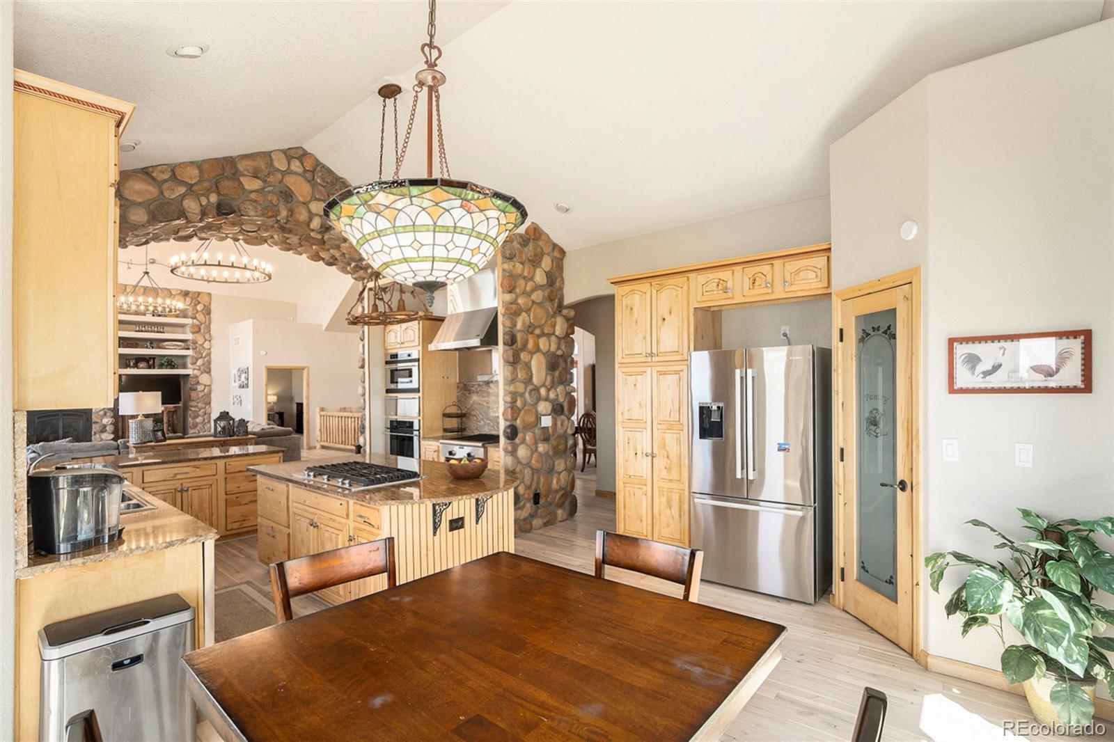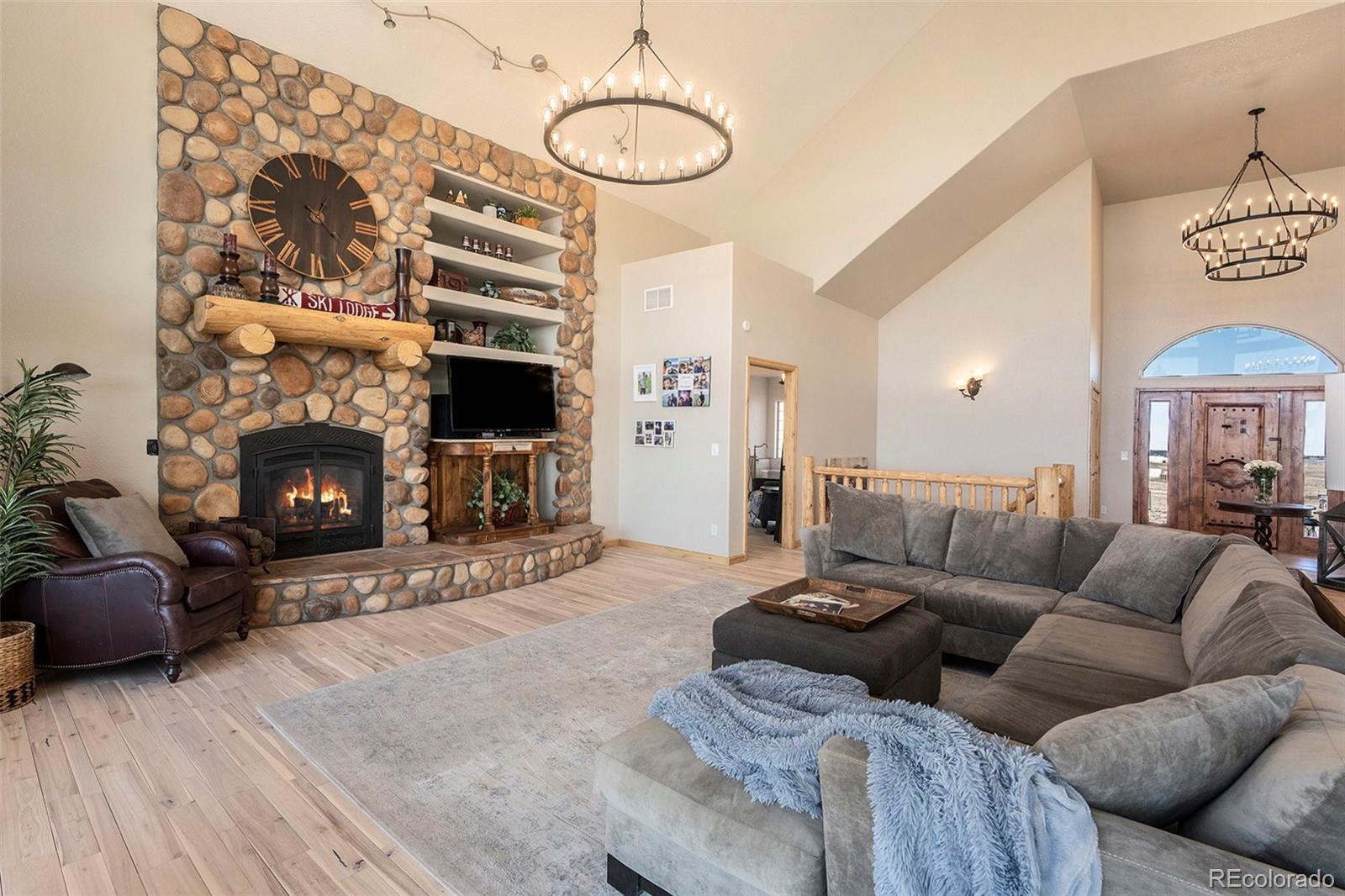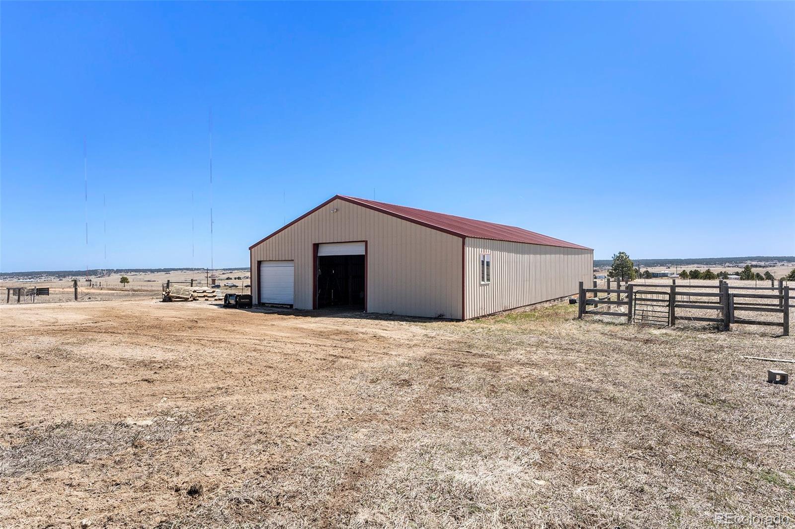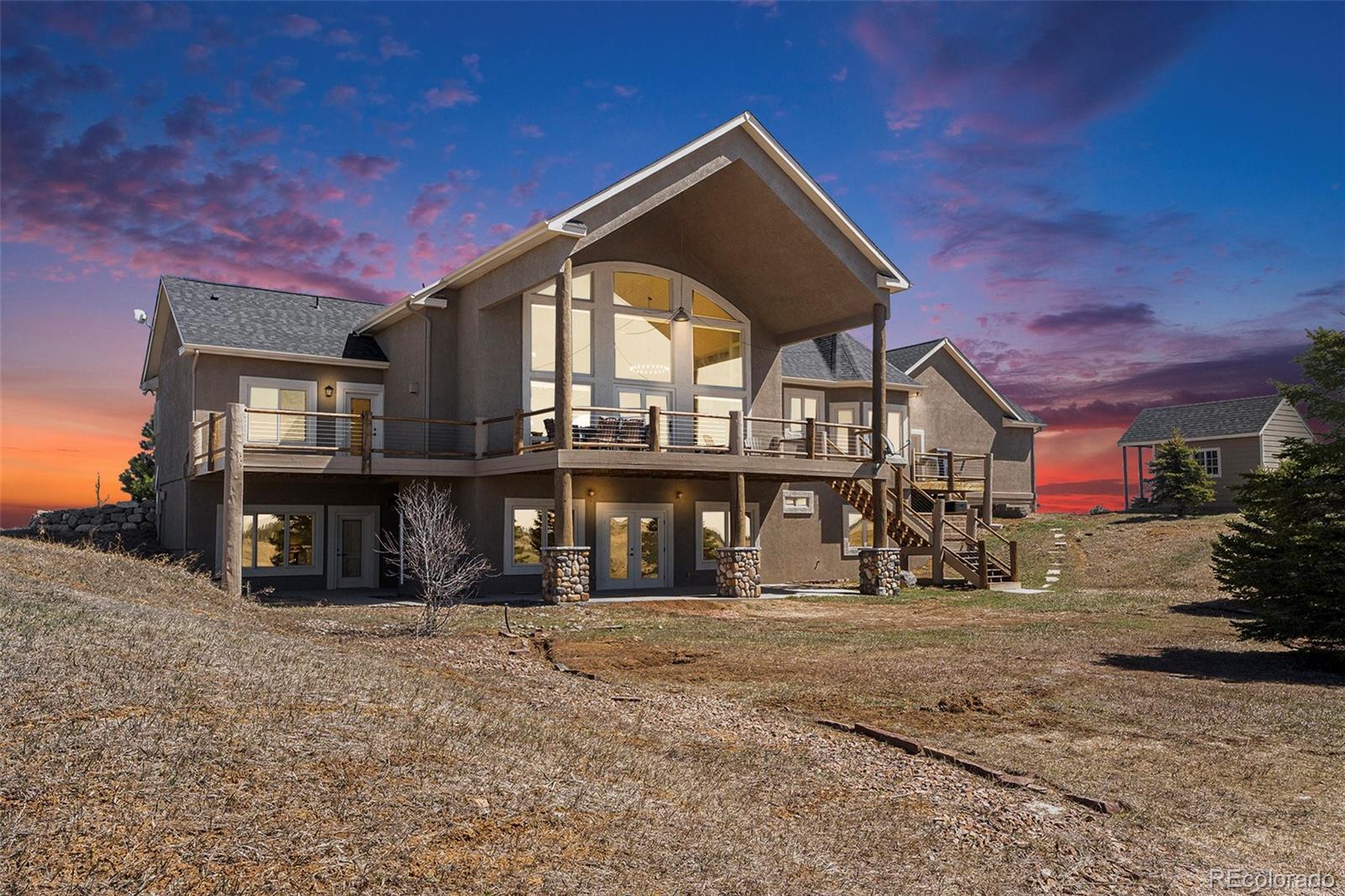 Your Private Colorado Retreat Nestled on over 35 acres with panoramic Pikes Peak views from nearly every room, this elegant home offers the perfect balance of privacy and proximity—just minutes from town. The light-filled great room features a cozy fireplace and mountain vistas. The kitchen includes a 5-burner gas island cooktop, built-in grill, warming drawer, custom cabinetry, and an eat-in nook with unobstructed views. A formal dining room with high ceilings and a view of the front pasture adds an elegant touch. The Owner’s Suite offers a private fireplace and spa-style en-suite. A second main-level bedroom, spacious laundry room, and thoughtful layout complete the main floor. The finished walk-out basement is ideal for entertaining or multi-generational living, with three en-suite bedrooms, a second full kitchen, dining space, and a third fireplace—all with continued mountain views. Equestrian features include fenced and cross-fenced pastures, loafing shed, 2-stall barn with tack room (room to expand), oversized RV garage door, 4+ vehicle parking, and plumbed water and electric throughout. Recent upgrades: new wood flooring and carpet, roof, deck railing, interior/exterior paint, remodeled Owner’s bath, new sprinkler system, new road base, and more. A rare opportunity to own space, luxury, and Colorado beauty in one remarkable property.