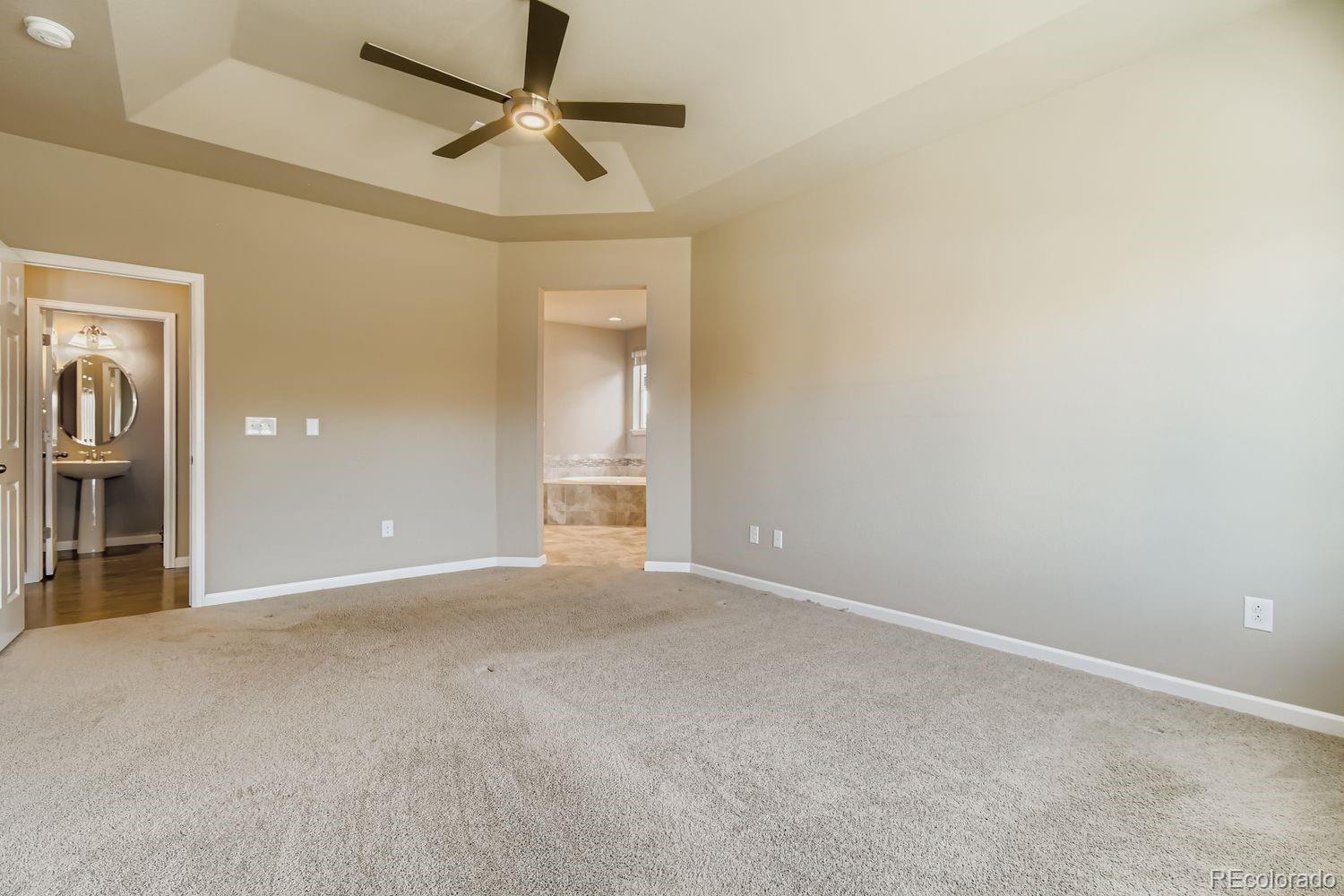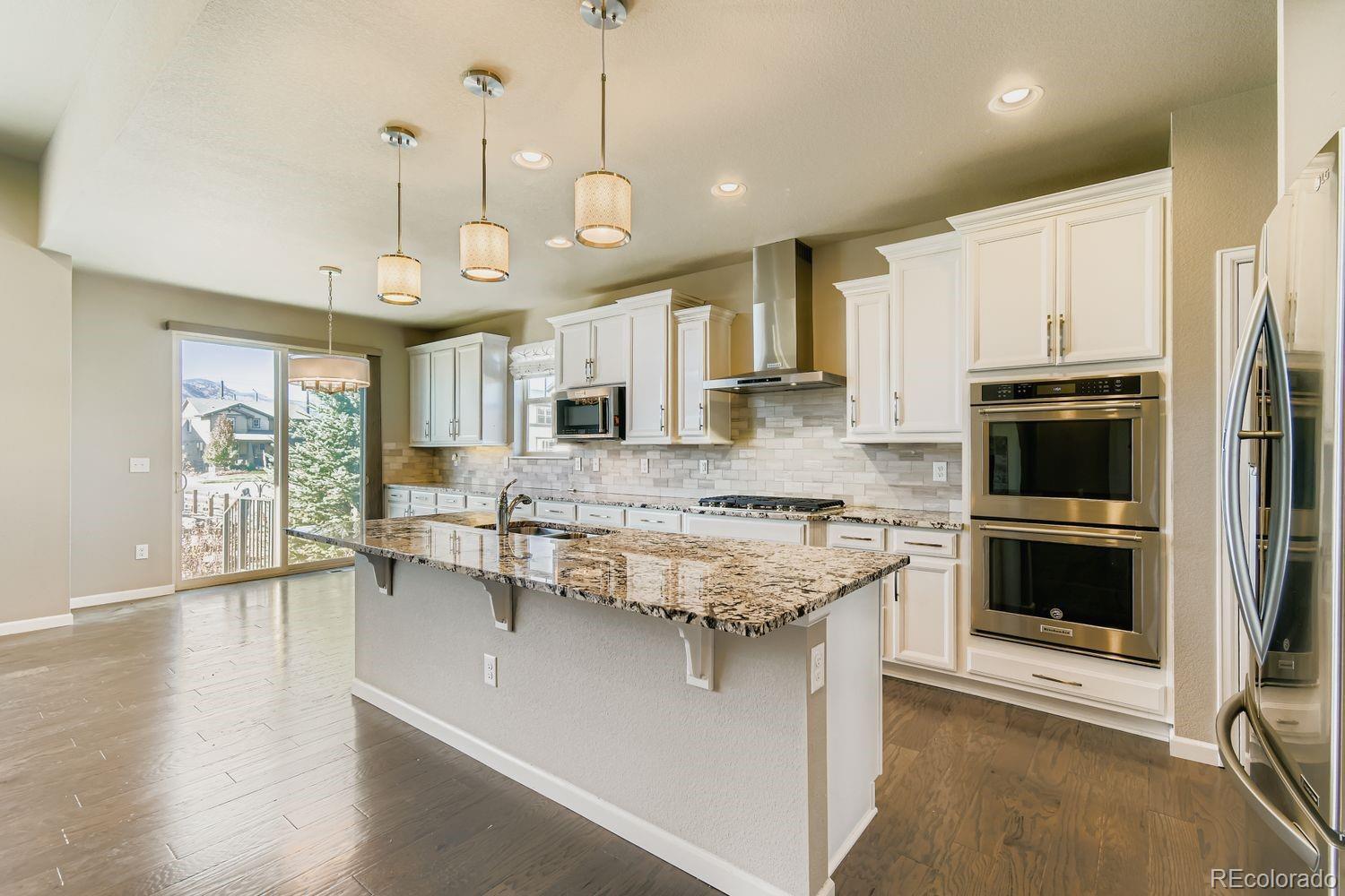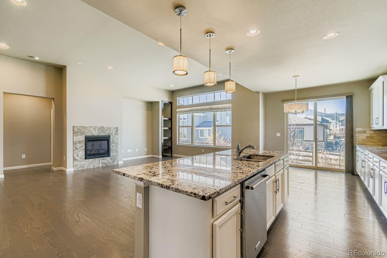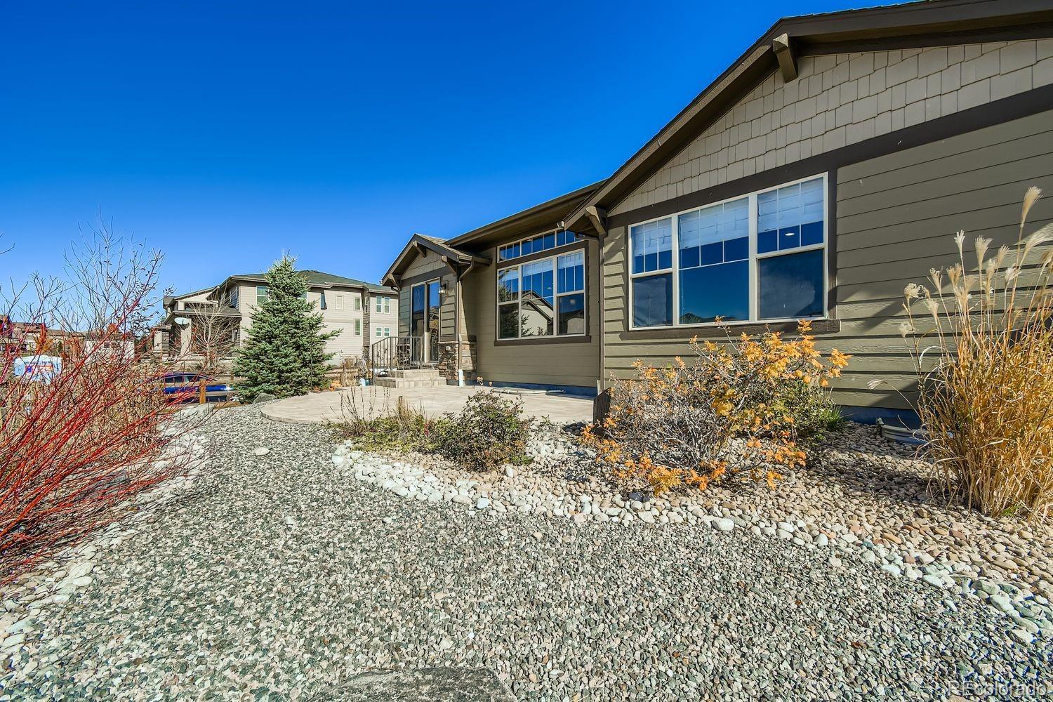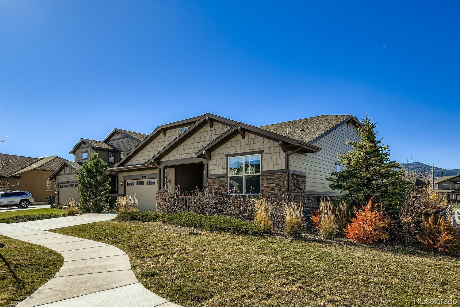 Welcome to beautifully designed 8793 Flattop Street, a sprawling ranch-style home that blends Colorado comfort with modern sophistication. It totals 4,728 square feet, 2,364 Sqft finished on the main level and 2,364 ready for your finishing touch in the full basement. Situated on a large .176-acre corner lot in one of Arvada’s most desirable neighborhoods with highly rated schools, this true single-level ease home offers bright, open spaces, and comfort with quality. At the heart of the home is the 10-foot-tall central great room filled with natural light, featuring large bright windows and a cozy fireplace for ideal lively gatherings. The chef-inspired kitchen boasts upgrade-level granite countertops, Kitchen-Aid appliances, and a generous island ideal for entertaining and everyday living. The primary suite offers a serene retreat with two spacious walk-in closets and big 5-piece en-suite bath, providing both luxury and practicality while the 2nd bedroom also includes a private en-suite bath, offering flexibility for residents or guests, as an additional office, or hobbies. The functional 3-car Tandem Garage provides easy parking for longer vehicles/toys, workshop, or storage — a rare find that adds convenience and value. Outside, enjoy your patio or covered front porch on the low-maintenance landscaped .176-acre corner lot, offering the perfect setting for morning coffee, weekend barbecues, or peaceful evenings under the Colorado sky. Leyden Rock includes a community pool ( Summer League Swim Team), clubhouse, playgrounds, parks, baseball field, and basketball court for amenities. Easy access to trails, mountains, rivers, Golden, Boulder, Denver, and everywhere. Exterior was recently painted in 2024.