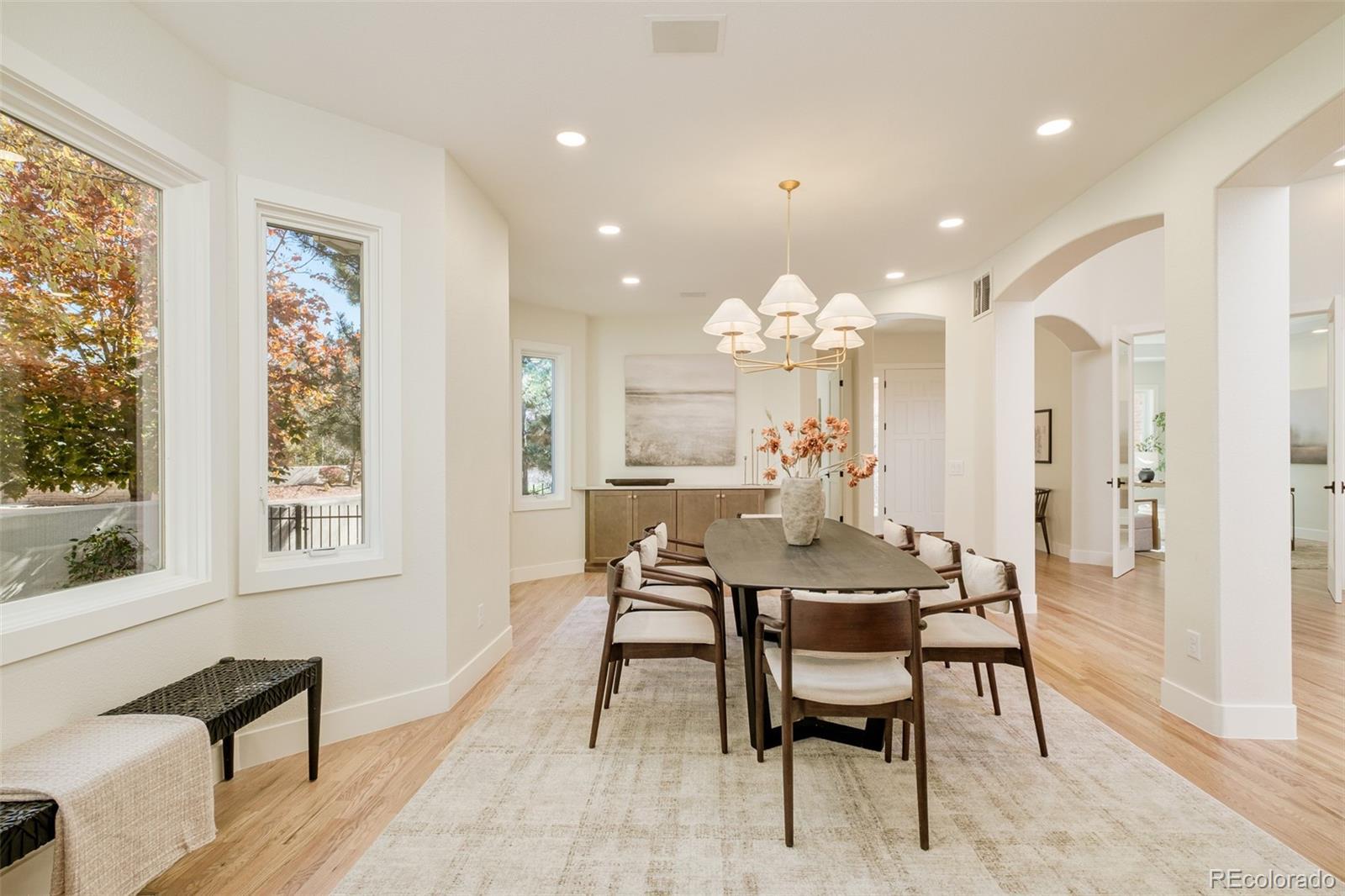Experience the thoughtfully reimagined ranch-style residence in the serene enclave of Bateleur at the Preserve. This stunning home, completely renovated in 2025, artfully blends transitional style with modern living. The main floor unfolds with inviting hardwood floors, featuring a private office with French doors that create an inspiring workspace. The formal dining room flows seamlessly into the chef's kitchen, complete with new appliances, an induction cooktop, a walk-in pantry, and a casual eating area, all connected through a stylish Butler's pantry with refrigerated drawers. The living room serves as a central gathering spot, centered around a gas fireplace with custom built-ins, and boasts views of the tranquil outdoor living spaces that overlook the open space beyond. The primary suite offers a peaceful retreat with a sitting area, west-facing deck access, and a luxurious 5-piece bath paired with a generous walk-in closet. Two additional main-floor bedrooms, along with a stylish ¾ en suite bath and a convenient powder room, complete this level. The laundry room, equipped with a sink and garage access, adds to everyday ease. Expanding the living experience, the finished basement includes a family room with a wet bar and wine storage, a media room, a bonus room with a cedar-lined closet, and an additional bedroom and ¾ bath with a sauna for ultimate relaxation. Modern updates include a Sonos sound system with 23 speakers, a new furnace, a new water heater, and a radon mitigation system. With an attached 2-car garage and a low-maintenance lifestyle, this exceptional offering perfectly balances modern luxury and timeless tranquility in one of Greenwood Village’s most sought-after communities.