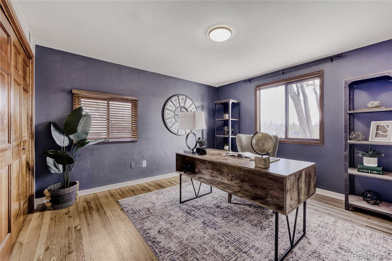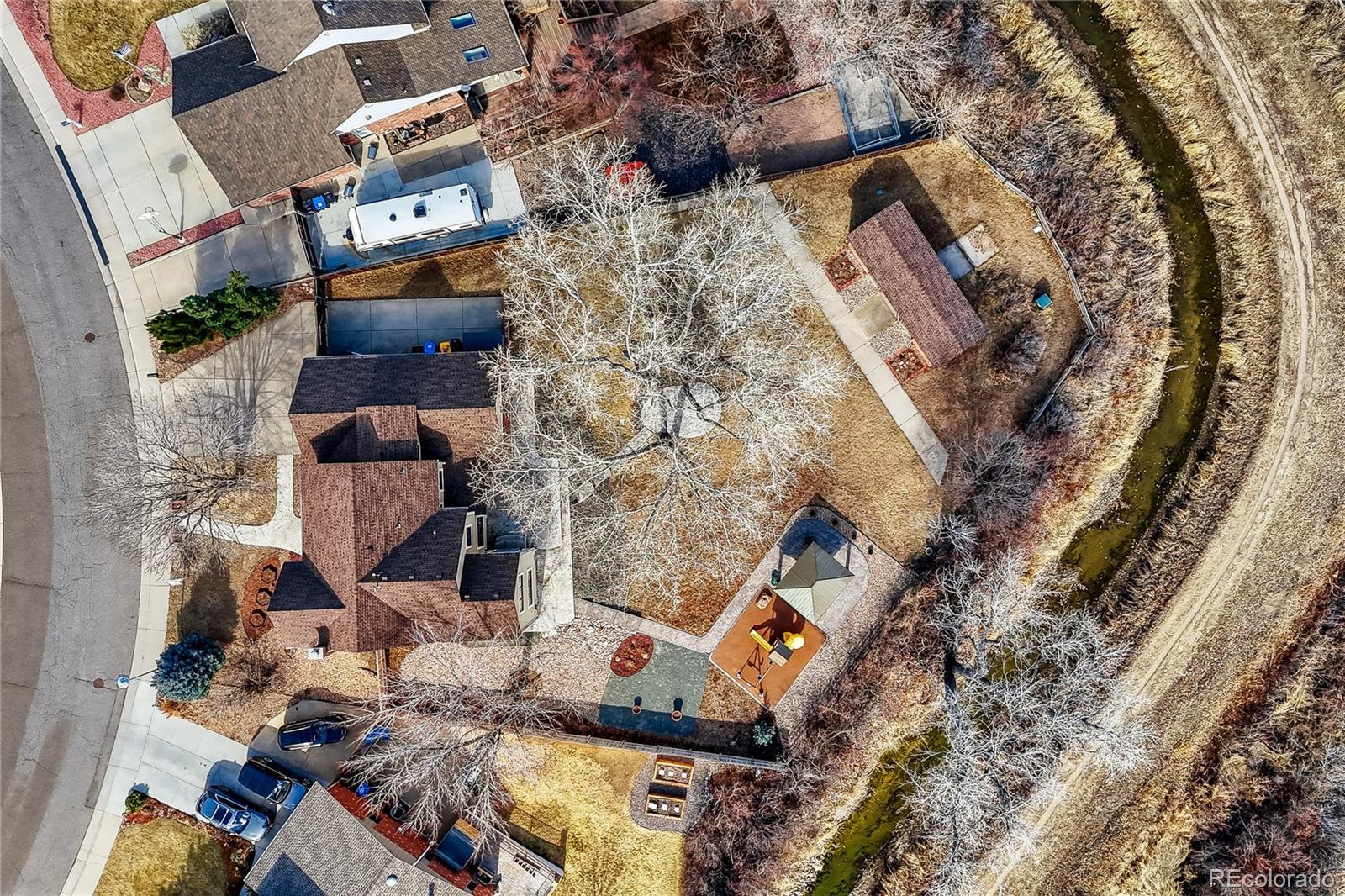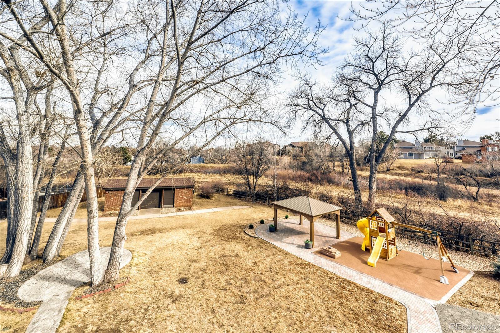 This 5BD 5BA home with charming curb appeal is located on a quiet cul-de-sac in one of Arvada's favorite neighborhoods. Be greeted in the foyer leading to a formal living room warmed by a wood burning fireplace and a formal dining room ready for gatherings. Continue forward and step into the expanded kitchen with informal dining space and adjacent great room, adding a desired modernized layout to an otherwise traditional four square floor plan. The hardwood floors throughout are beautiful and hypoallergenic. The main floor also includes the laundry room and Office/Guest Suite with adjacent 3/4 bath. You can access the main patio from the great room which has beautiful views of the back yard and open space where the Croke & Farmers High-line Canals carry water to Standley Lake. Follow a path into the back yard where an additional patio under the enormous shade trees make a perfect place for a hot tub or patio table. The back yard also boasts a newly constructed gazebo and play area with play set included. The primary bedroom includes a large walk-in closet and an attractive, recently updated, 5 piece bath. The addition that expanded the main level also added the upper level 4th bedroom including an en-suite 3/4 bath. Also included upstairs is a loft area (book nook) with built in shelving and space for comfy chairs. In the basement you'll find a rec-room with built in office/hobby space and a 3/4 bathroom making it a suite of its own if needed. The basement also includes a large unfinished storage space. There's an attached 2 car garage and adjacent gated RV/boat storage. The solidly built detached barn is roughly 33x12 and could be easily converted into a second home office, art studio or workshop. NO HOA! .45 Acres in a great city, top rated schools, an easy commute and a great home. What more can you ask for?