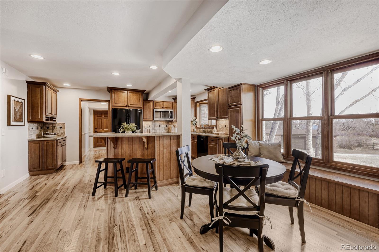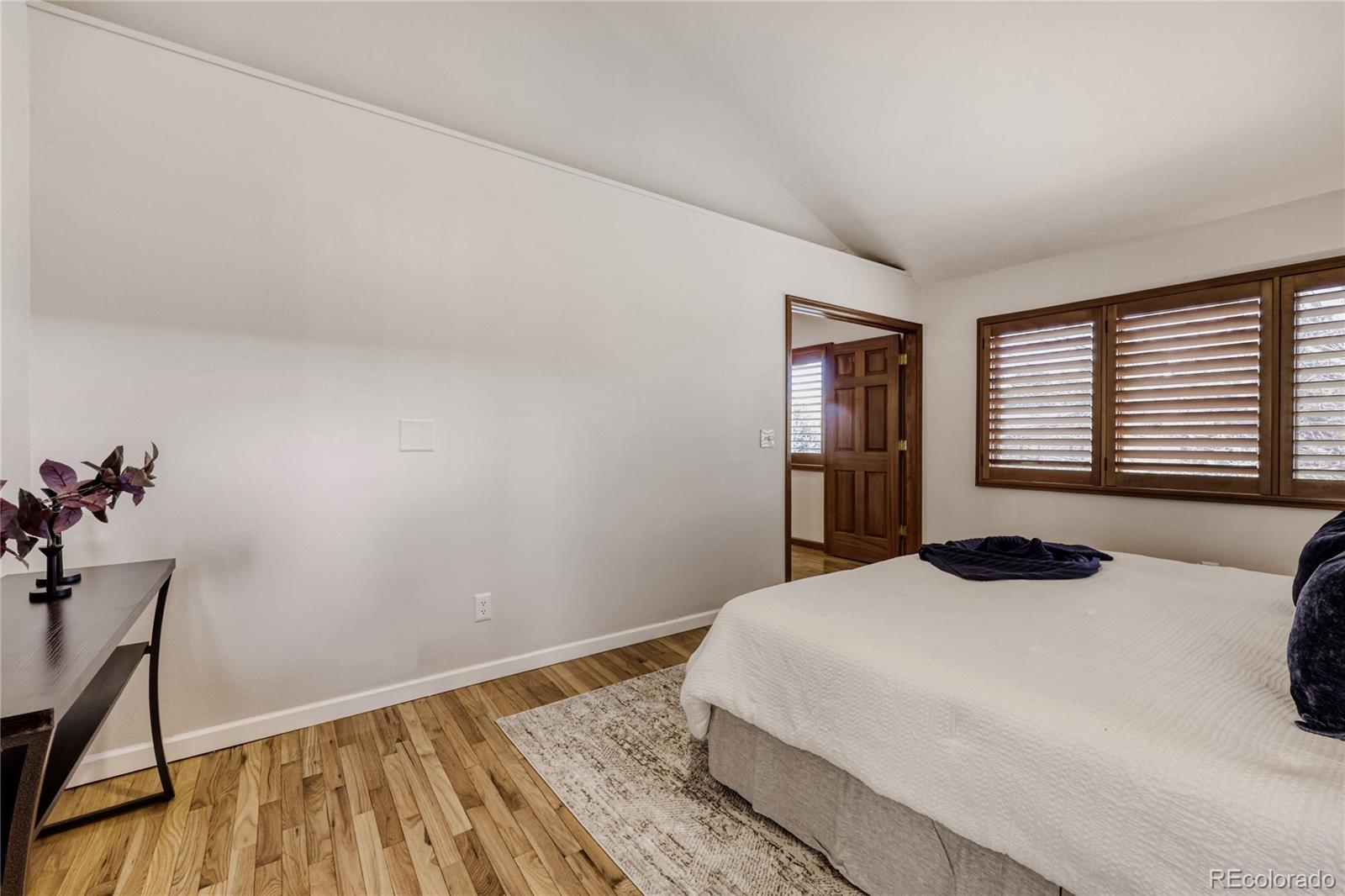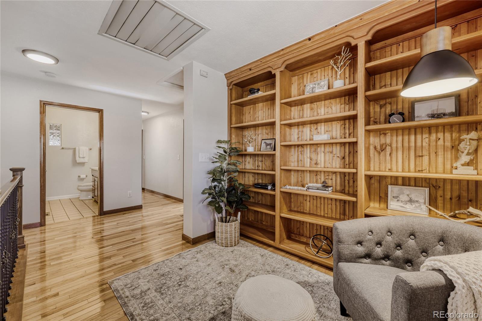 This 5BD 5BA home with charming curb appeal is located on a quiet cul-de-sac in one of Arvada's favorite neighborhoods. Be greeted in the foyer leading to a formal living room warmed by a wood burning fireplace and a formal dining room ready for gatherings. Continue forward and step into the expanded kitchen with informal dining space and adjacent great room, adding a desired modernized layout to an otherwise traditional four square floor plan. The hardwood floors throughout are beautiful and hypoallergenic. The main floor also includes the laundry room and Office/Guest Suite with adjacent 3/4 bath. You can access the main patio from the great room which has beautiful views of the back yard and open space where the Croke & Farmers High-line Canals carry water to Standley Lake. Follow a path into the back yard where an additional patio under the enormous shade trees make a perfect place for a hot tub or patio table. The back yard also boasts a newly constructed gazebo and play area with play set included. The primary bedroom includes a large walk-in closet and an attractive, recently updated, 5 piece bath. The addition that expanded the main level also added the upper level 4th bedroom including an en-suite 3/4 bath. Also included upstairs is a loft area (book nook) with built in shelving and space for comfy chairs. In the basement you'll find a rec-room with built in office/hobby space and a 3/4 bathroom making it a suite of its own if needed. The basement also includes a large unfinished storage space. There's an attached 2 car garage and adjacent gated RV/boat storage. The solidly built detached barn is roughly 33x12 and could be easily converted into a second home office, art studio or workshop. NO HOA! .45 Acres in a great city, top rated schools, an easy commute and a great home. What more can you ask for?