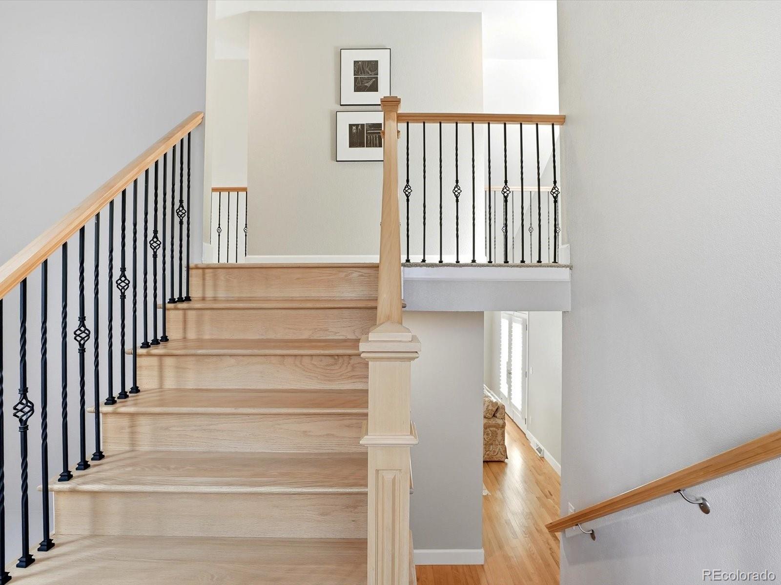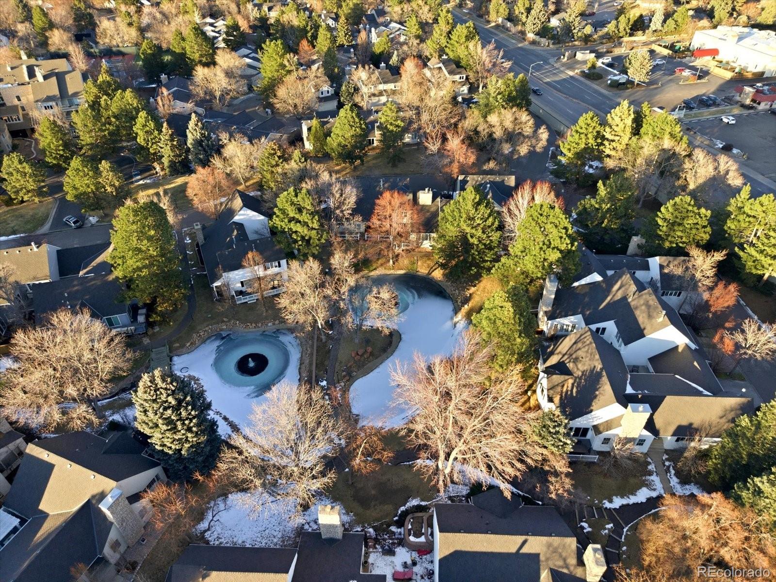 This thoughtfully designed home offers timeless elegance in one of the most desirable locations within Stoney Brook, overlooking lush landscaping and a serene double pond with fountain. Enjoy a truly walkable lifestyle with DTC, shopping, restaurants, parks, and Wallace Park just steps away, plus direct access from the new deck to trails, open space, and ponds. The home features two separate furnace and A/C systems serving the upper level and the main/basement levels, a completely remodeled kitchen with upgraded KitchenAid appliances, convection microwave, shaker cabinetry, tile backsplash, under-cabinet lighting, quartz countertops, a spacious eat-in island, and a dramatic two-story great room with a gas fireplace, new mantle, abundant natural light, and tranquil pond views. The primary suite boasts a fully remodeled bath with double granite-topped vanities, an oversized custom shower with frameless glass, designer fixtures, pressure controls, handheld wand, and a custom closet system. Additional highlights include custom interior railings, hardwood stairs, hardwood floors throughout the main level, fully remodeled bathrooms, new carpeting, plantation shutters, a new driveway and garage doors, store room shelving, a retractable awning, updated front walkway and landscaping, scenic pond views throughout, and all appliances included, including a basement refrigerator/freezer.