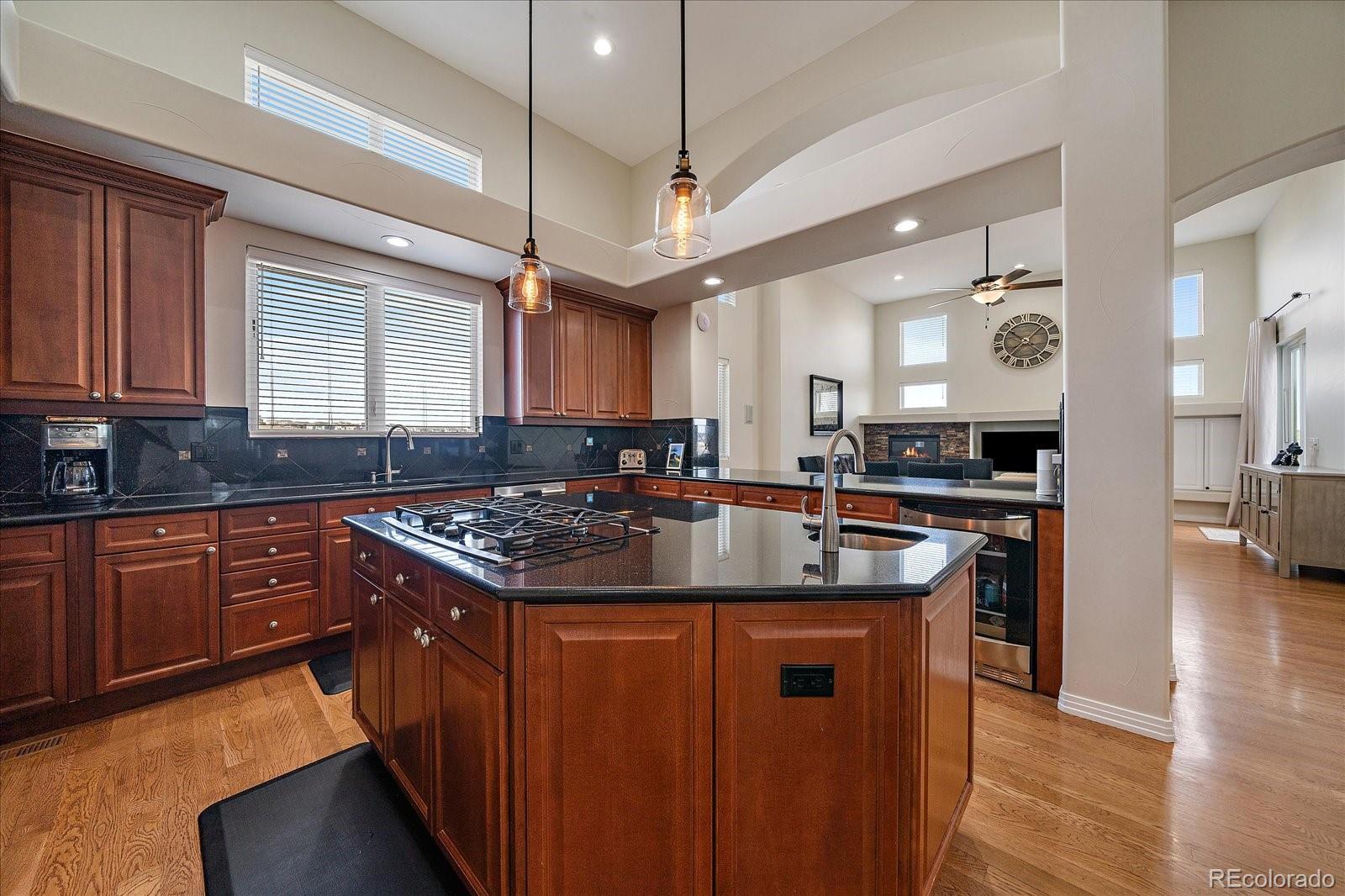 Set in the gated Vistancia enclave of Pradera, this 7-bedroom, 6-bath walkout ranch sits on one of the most private lots in the neighborhood, backing and siding to open space. The home offers nearly 7,000 square feet of comfortable, well-designed living with easy access to golf, trails, schools, the community pool, and downtown Parker. The main level makes a strong first impression with a 16-foot vaulted ceiling, warm hardwood floors, and big windows that frame the open space views. The primary suite is a quiet retreat with a 5-piece bath, large walk-in closet, and direct access to the deck. The kitchen has plenty of storage, a large island, walk in pantry, and opens to a casual dining area, and parlor room anchored with one of 4 fireplaces. Three additional main-level bedrooms or flex spaces sit just off the kitchen wing. Completing the main level are a guest half-bath and laundry/mudroom with access to the side-loaded 4-car garage with 15-foot tall ceilings, perfect for the car and gear enthusiast. The walkout lower level is ideal for multigenerational living or an au pair, offering three more bedroom suites, a second kitchen, a large family room, a game room, and generous storage. A second set of laundry appliances adds additional convenience. Outdoor living is a highlight with a half-acre lot, covered patio, new Trex deck, fenced yard, garden beds, and wide open views in every direction. Don’t miss this rare combination of space, privacy, and thoughtful design in Pradera’s most sought-after gated communities.