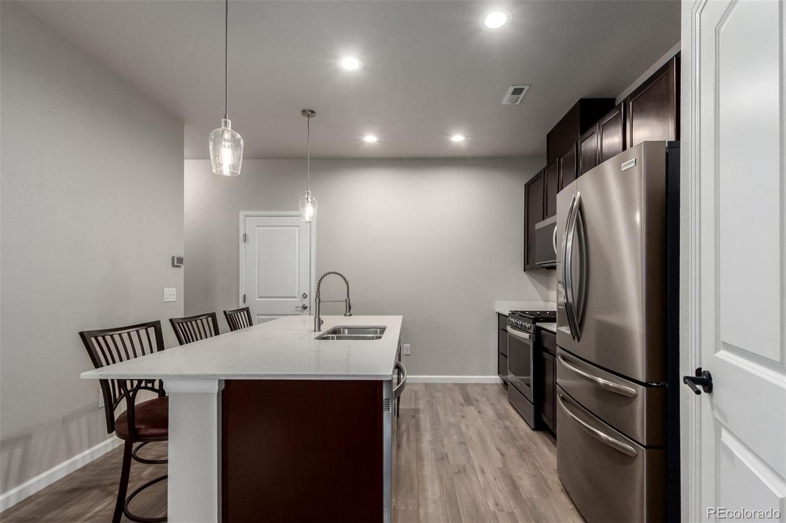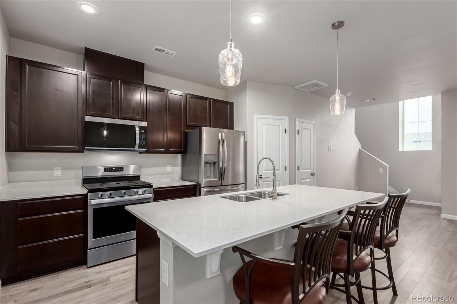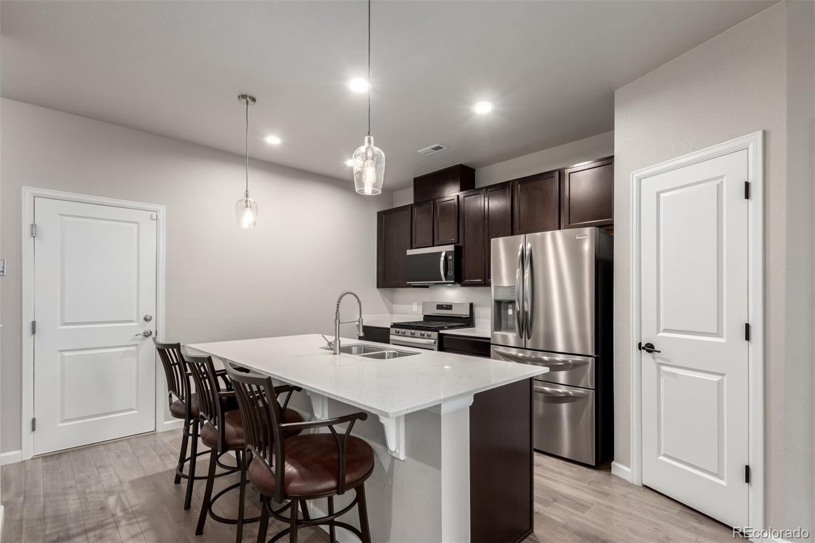 Step inside and feel instantly at home. This 2 bedroom 3 bath townhouse perfectly balances cozy comfort with modern sophistication. From its inviting front porch to the open light-filled interior, every corner feels designed for connection, relaxation, and style. Whether you’re hosting friends for dinner or enjoying a quiet morning coffee, this home makes everyday living feel special. Step through the covered front porch and into a bright, open living space designed for connection and comfort. The spacious great room features large windows that let in an abundance of natural light, fresh neutral tones, and durable luxury vinyl plank flooring that perfectly complements any décor. The open floor plan flows right into a gourmet inspired kitchen with gleaming quartz countertops, espresso cabinetry, stainless steel appliances, and a generous island that invites guests to pull up a stool and stay awhile. Upstairs, you’ll find two spacious bedroom suites, each offering its own private bathroom for ultimate comfort and convenience. The primary suite feels like a true retreat, featuring soft carpeting, a generous walk-in closet, and a spa-inspired bathroom with dual vanities, sleek tilework, and a glass-enclosed shower. The second suite is just as charming, bright, and perfect for guests, family, or even a stylish home office. Convenience continues with a laundry area upstairs, a main floor powder bath, and an attached two car garage. Step outside to enjoy the community’s scenic surroundings. This property is just steps from Big Dry Creek Trail, lush parks, and a playground, perfect for evening strolls or weekend picnics. Public off street parking is available close by as well. This home truly has it all, modern finishes, thoughtful layout, and a location that balances tranquility with accessibility. Whether you’re entertaining, relaxing, or exploring the neighborhood, this townhouse offers the perfect blend of style and simplicity. Come and check it out today!