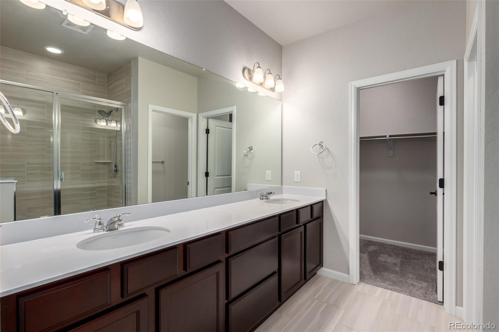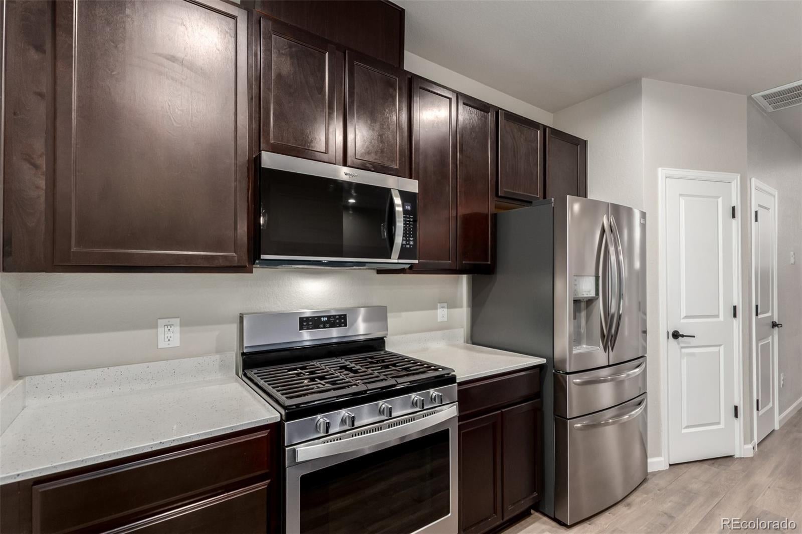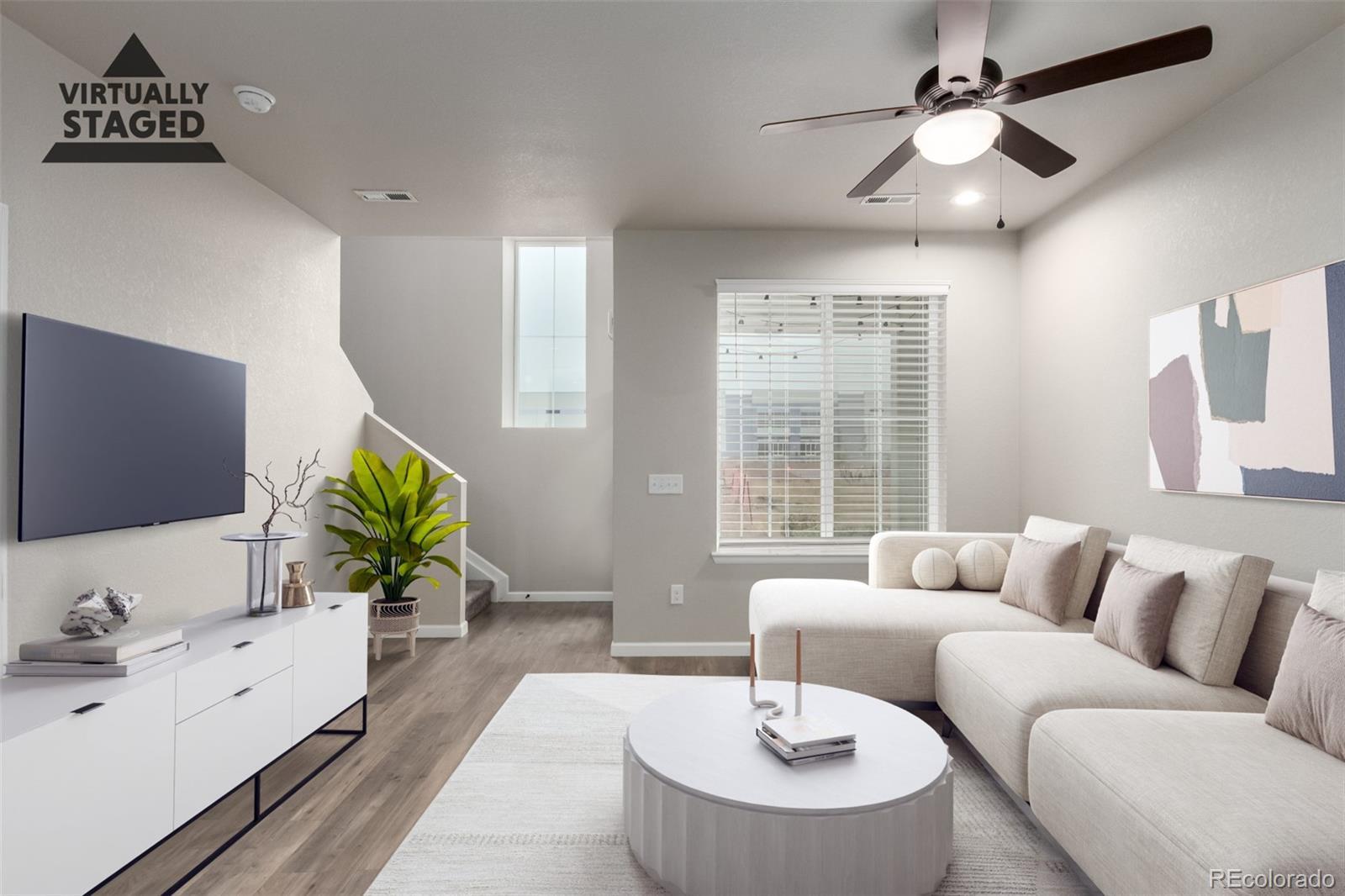 Step inside and feel instantly at home. This 2 bedroom 3 bath townhouse perfectly balances cozy comfort with modern sophistication. From its inviting front porch to the open light-filled interior, every corner feels designed for connection, relaxation, and style. Whether you’re hosting friends for dinner or enjoying a quiet morning coffee, this home makes everyday living feel special. Step through the covered front porch and into a bright, open living space designed for connection and comfort. The spacious great room features large windows that let in an abundance of natural light, fresh neutral tones, and durable luxury vinyl plank flooring that perfectly complements any décor. The open floor plan flows right into a gourmet inspired kitchen with gleaming quartz countertops, espresso cabinetry, stainless steel appliances, and a generous island that invites guests to pull up a stool and stay awhile. Upstairs, you’ll find two spacious bedroom suites, each offering its own private bathroom for ultimate comfort and convenience. The primary suite feels like a true retreat, featuring soft carpeting, a generous walk-in closet, and a spa-inspired bathroom with dual vanities, sleek tilework, and a glass-enclosed shower. The second suite is just as charming, bright, and perfect for guests, family, or even a stylish home office. Convenience continues with a laundry area upstairs, a main floor powder bath, and an attached two car garage. Step outside to enjoy the community’s scenic surroundings. This property is just steps from Big Dry Creek Trail, lush parks, and a playground, perfect for evening strolls or weekend picnics. Public off street parking is available close by as well. This home truly has it all, modern finishes, thoughtful layout, and a location that balances tranquility with accessibility. Whether you’re entertaining, relaxing, or exploring the neighborhood, this townhouse offers the perfect blend of style and simplicity. Come and check it out today!