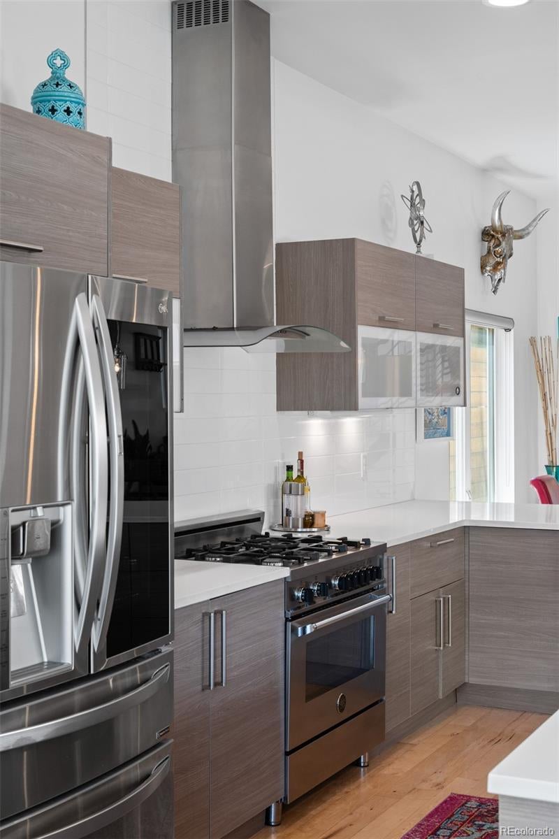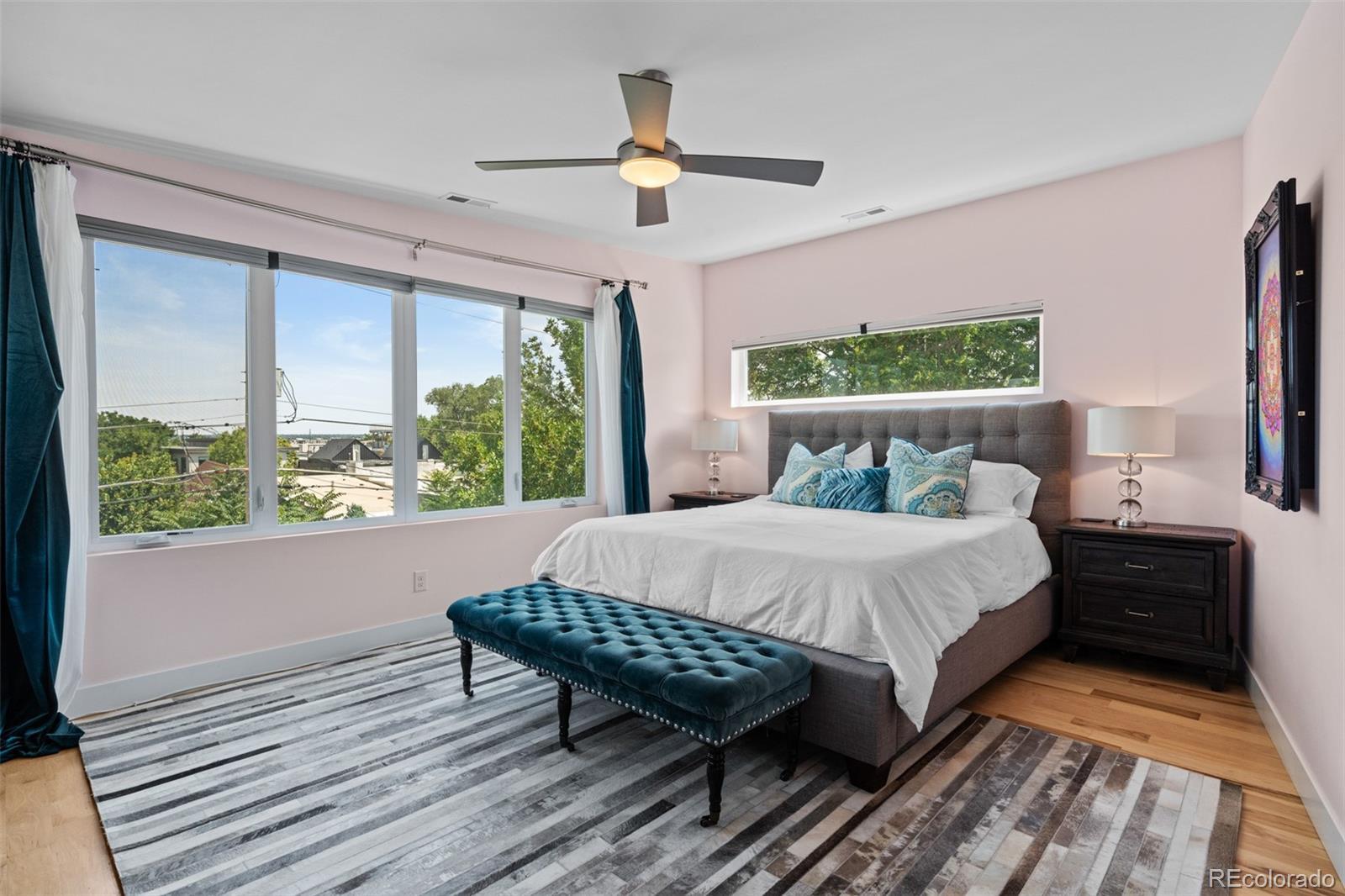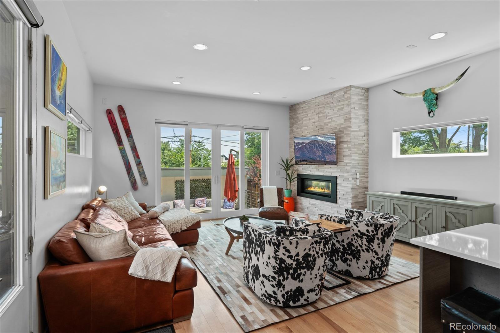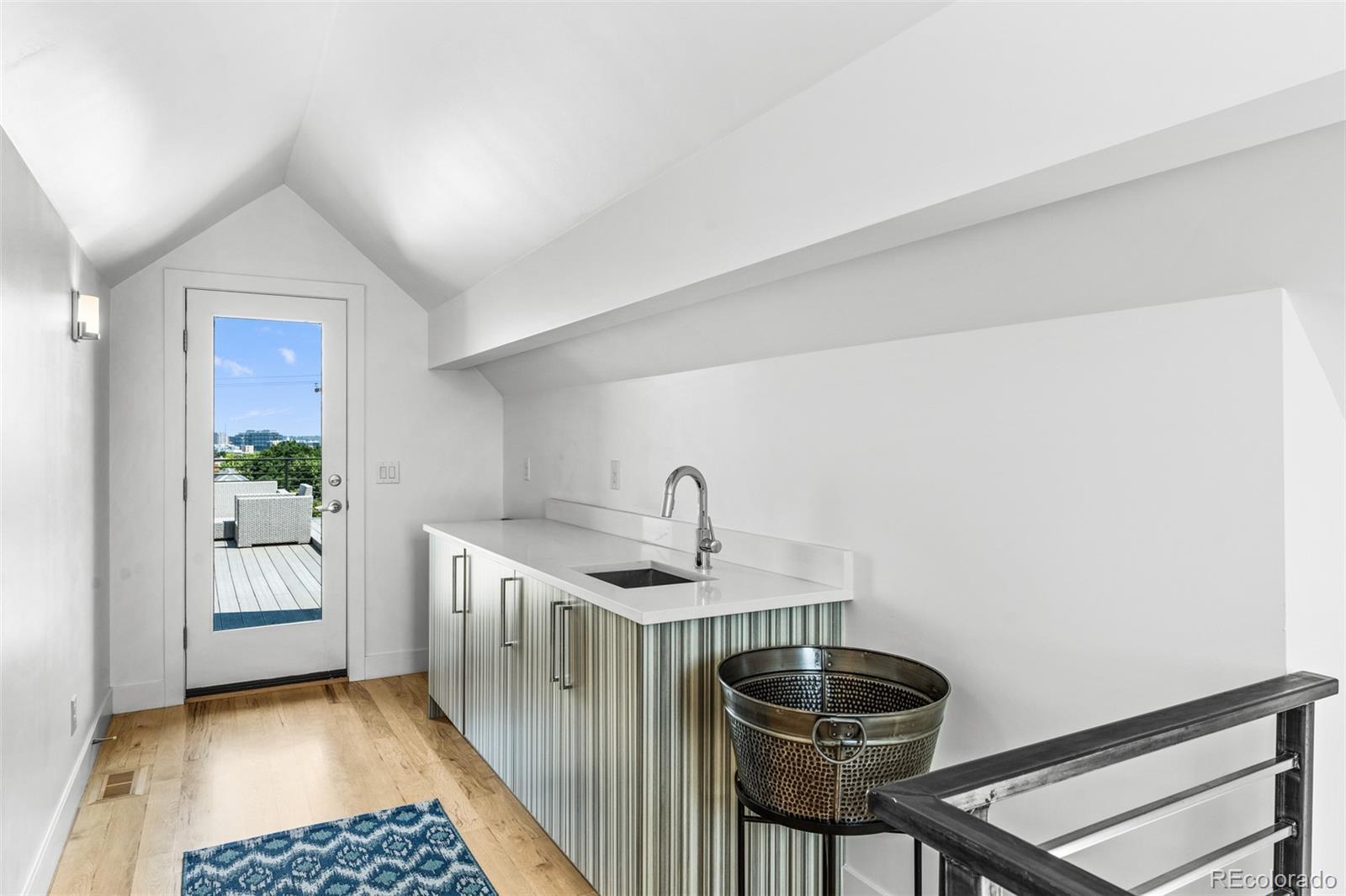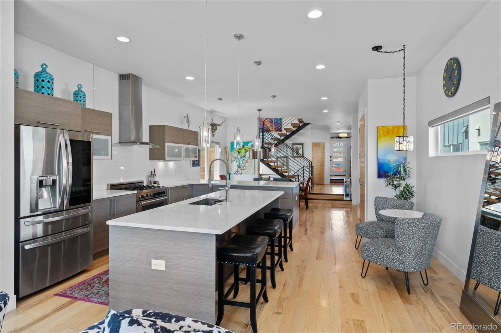 Schedule your private showing today for this exceptional contemporary residence in the heart of LoHi! The main level of the home features bright and airy spaces with tall ceilings, an open layout, hickory hardwood floors, a wonderful chef's kitchen with Corian counters/stainless steel appliances/a large island/two areas for counter seating, a dining area, a living room with a gas fireplace and sliding doors to the back patio, a main level office (great place to work from home), a full bathroom, and a wet bar. A floating staircase takes you to the second level where you'll find the primary suite and its luxurious five-piece en suite bathroom and spacious walk-in closet, a second bedroom with a large west-facing balcony, a full hallway bathroom, a third bedroom, and a laundry room. The third level features a wet bar and rooftop deck with downtown views. The basement has extra tall ceilings, a large open living space with a pool table (negotiable), a wet bar, and storage/mechanicals. In addition to offering all of the luxurious finishes you've been looking for, all of the furniture is negotiable! The back patio is the perfect place for indoor/outdoor living and entertaining, and the oversized garage keeps your vehicles dry on cold and wet days! Close to some of the best restaurants and bars that Denver has to offer in the heart of LoHi with easy access to downtown Denver, I-25, and I-70 to the mountains and the airport. Schedule your private showing today before it is gone! Buyer to verify all information.