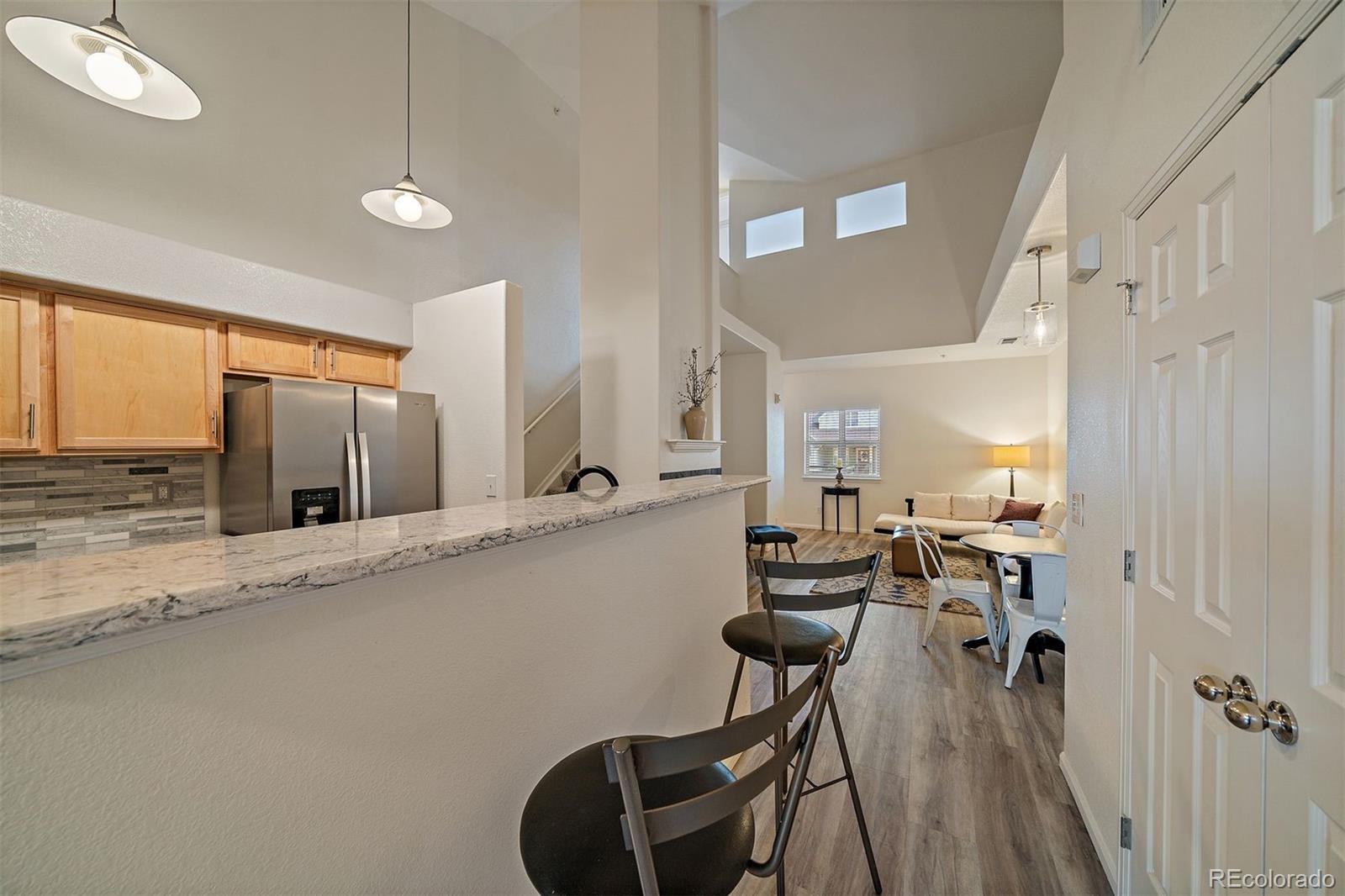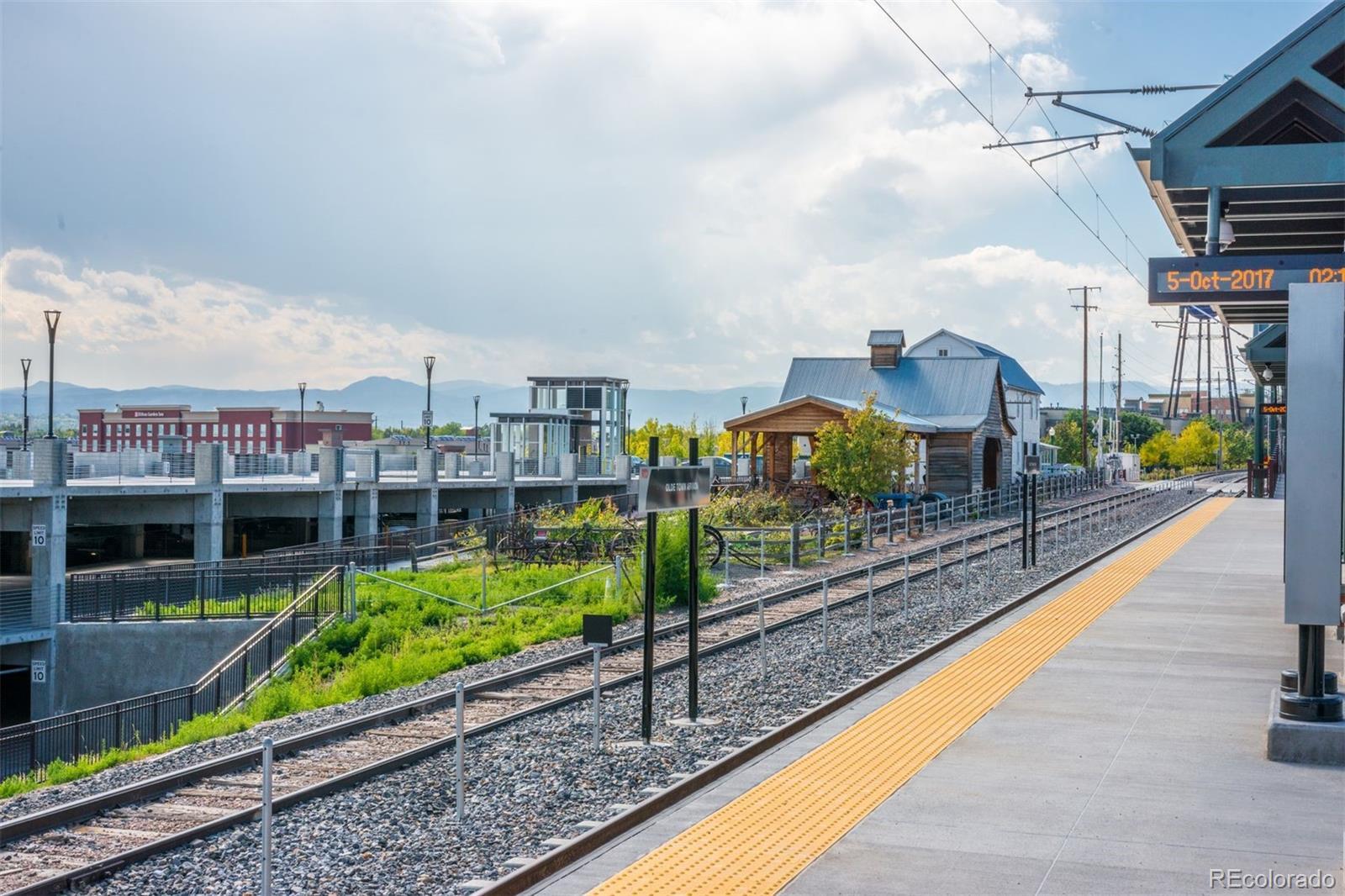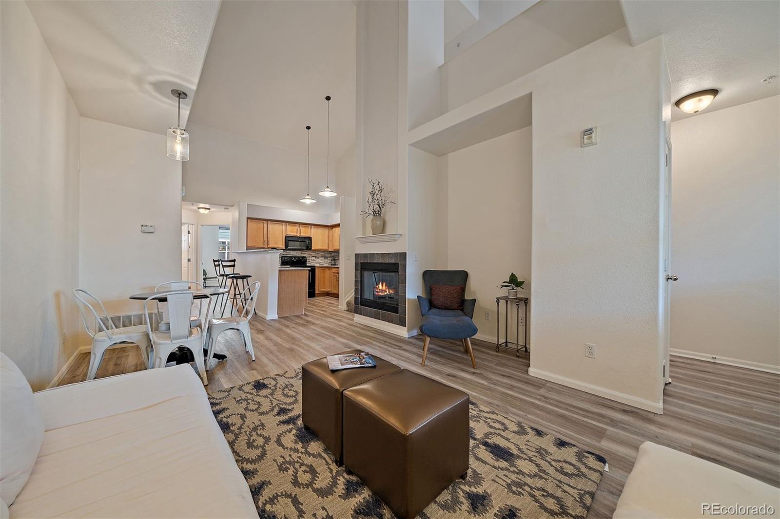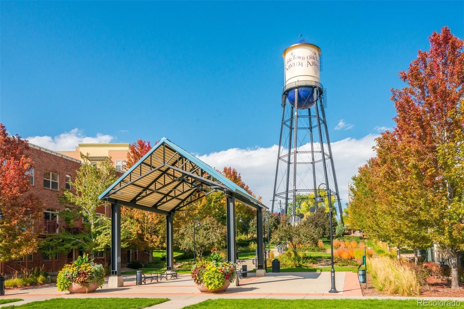 Beautiful with open floorplan, vaulted ceilings allows for ample natural light, with a neutral palette the living area is spacious w/ a cozy gas fireplace. Brand New luxury vinyl plank flooring makes for a clean flow thru the living spaces and primary bedroom. The kitchen has quartz countertops & tile backsplash with separate entertaining space. The main level bedroom has high ceilings and allows for large bedroom sets. The full bath includes spacious vanity space and tub to soak and relax. The second bedroom upstairs has a large window, walk-in closet and could also be an office. Oversized garage with included cabinetry has finished walls, bike hooks, & storage closet as well as interior access to unit. Water heater and refrigerator are less than a few years old & all appliances included! HOA includes monthly water usage & maintains all exterior maintenance while offering a clubhouse, fitness center, hot tub and swimming pool. Prime location steps to Olde Town, breweries, dining, parks & light rail. easy access to Denver & I-70 Corridor. **This home qualifies for the community reinvestment act providing 1.75% of the loan amount (up to $7000 max) from Sunflower bank as a credit towards buyers closing costs for clients approved and using them for lending, pre-paids and discount points. Contact listing agent for more details.**