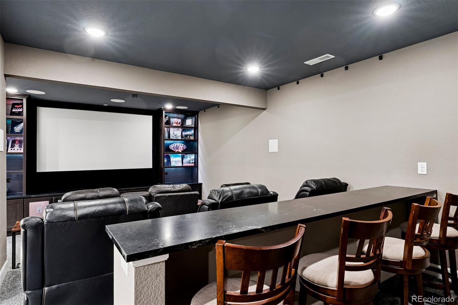 Welcome to the Regency neighborhood of Montaine, a vibrant 55+ community in Castle Rock, recently named one of the nation’s top cities for quality of life. Discover refined living in this Toll Brothers Boyd floorplan, offering 5 bedrooms, 3 bathrooms, and 3,707 square feet of beautifully designed space. This 2021-built home is a rare find. Entertainment at its best. The fully finished basement is an entertainer’s dream, featuring a stylish mini kitchen/bar that makes hosting effortless. Step into your own state-of-the-art home theater, complete with projection video and immersive surround sound system that transforms every night into a movie night. Thoughtful upgrades and finishes throughout. With over $200,000 in post-construction upgrades, this home radiates luxury. The primary suite closet system adds smart organization, while custom built-in shelving and stonework framing the fireplace elevate the living room. The epoxy-finished two-car garage keeps things tidy, while the gorgeous custom bar brings warmth and character to gatherings. Designed for easy living. Low-maintenance landscaping makes this the ideal lock-and-leave retreat for snowbirds and travelers. A fenced yard provides peace of mind for your pets, while the greenbelt backdrop ensures both privacy and tranquility. After a day exploring nearby trails like Plum Creek or Castlewood Canyon State Park, relax and rejuvenate in your soaking tub in the primary retreat. Lifestyle and location at it’s best. Regency at Montaine is more than a neighborhood—it’s a lifestyle. Residents enjoy resort-style amenities including a clubhouse with full-time event coordinator, pool, hot tub, fitness center, tennis and pickleball courts, and miles of trails. With stunning mountain views and easy access to I-25, commuting or traveling is a breeze.