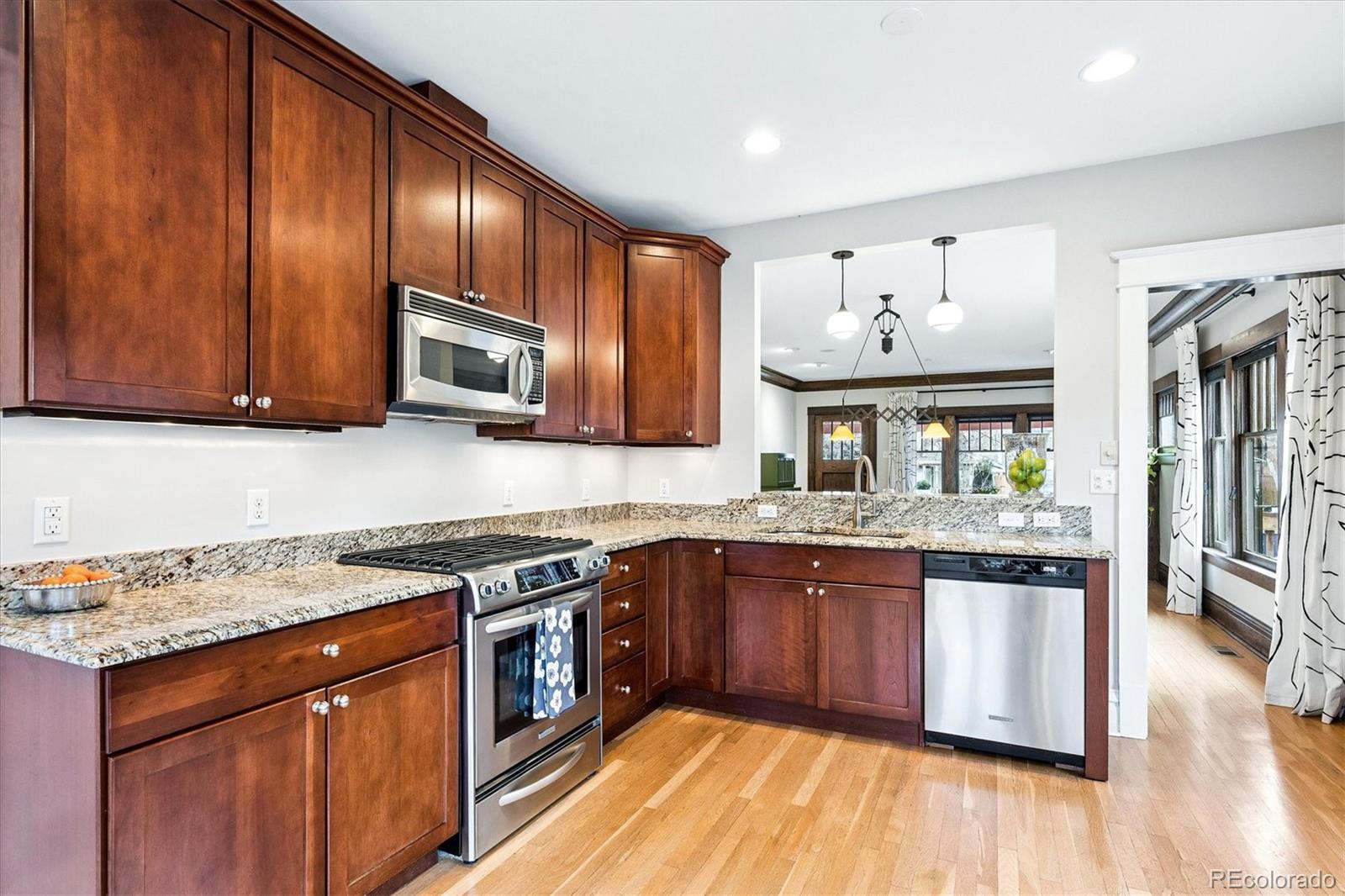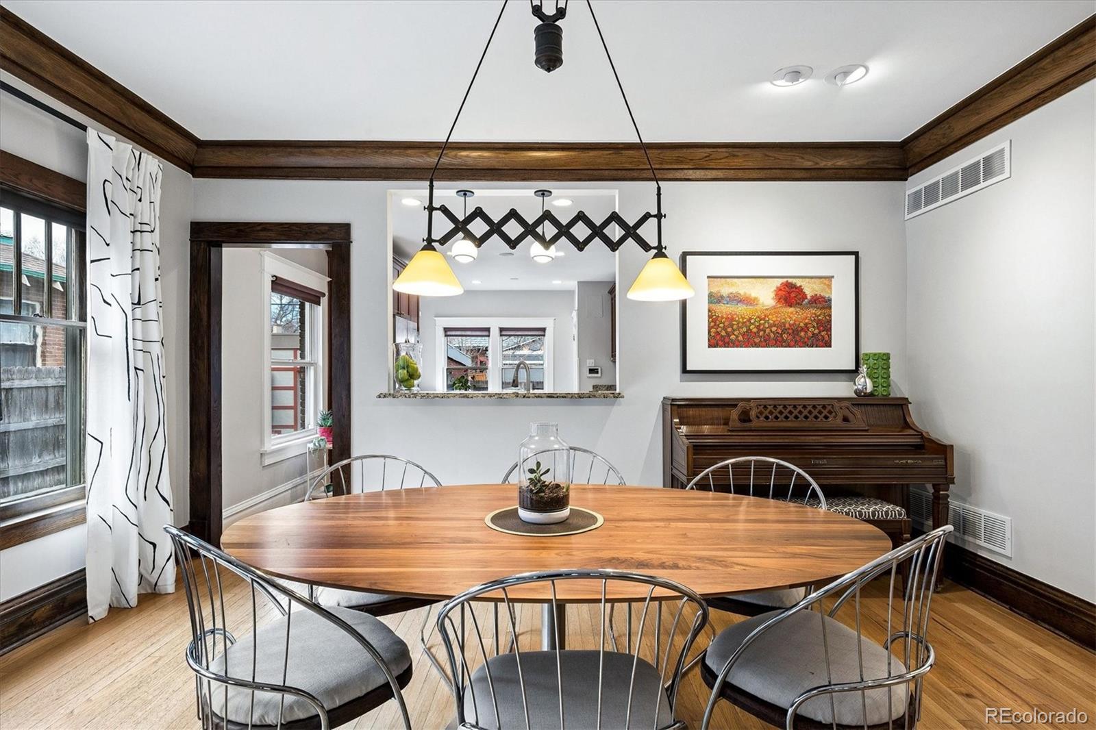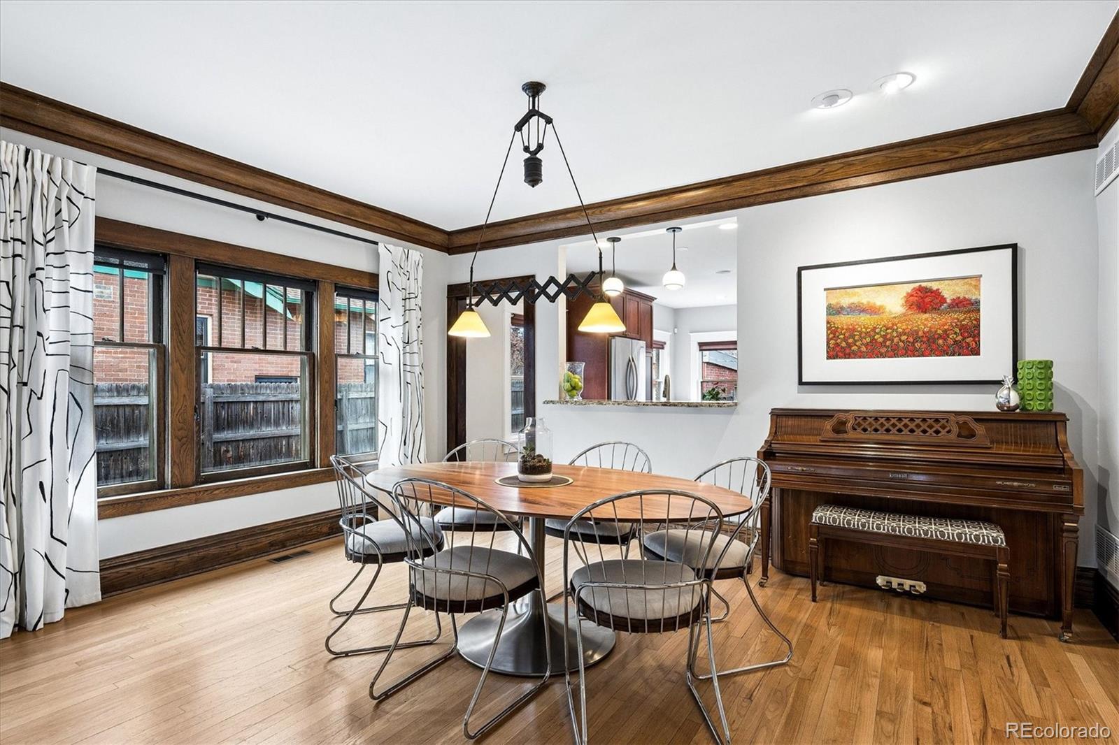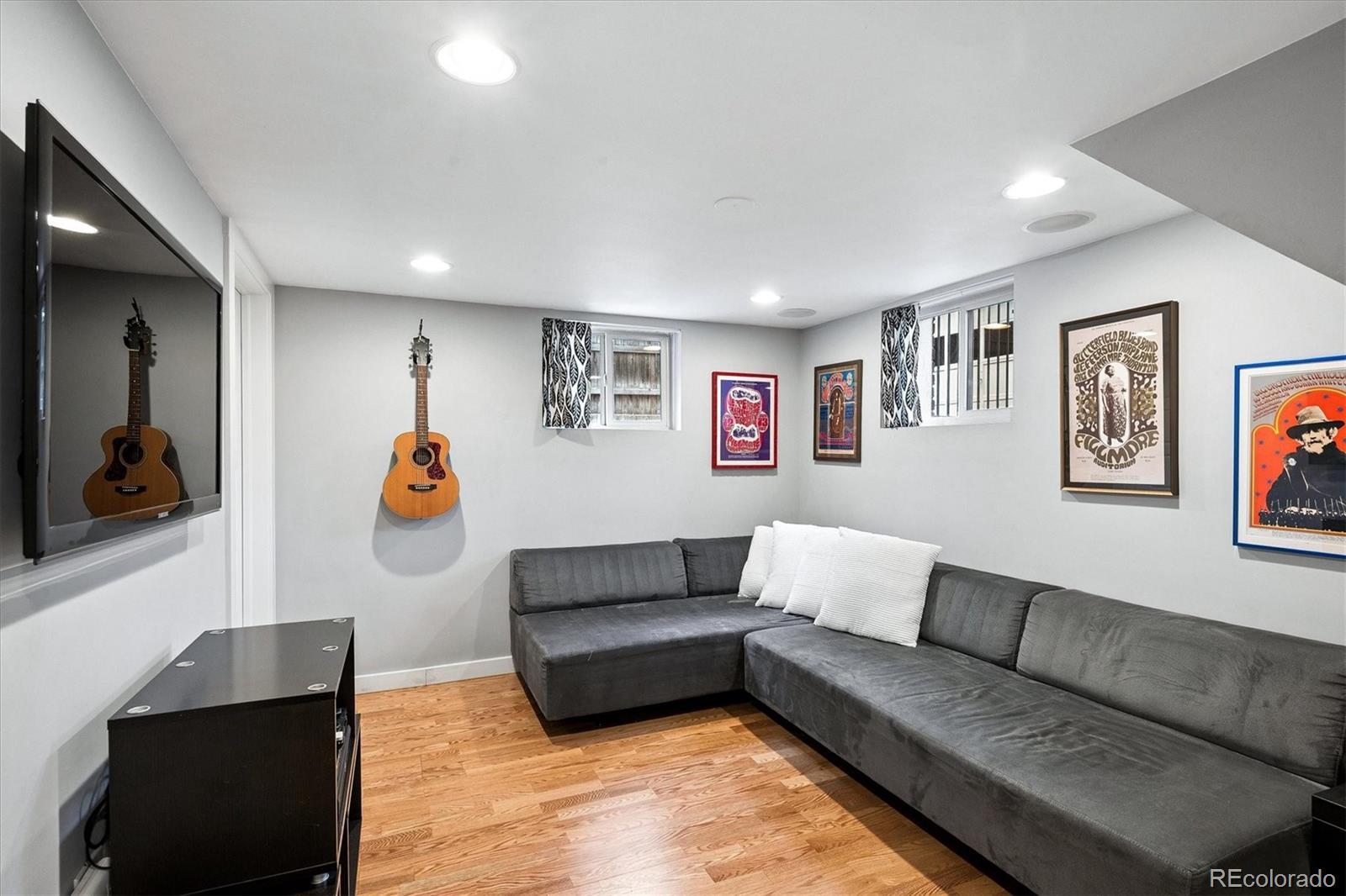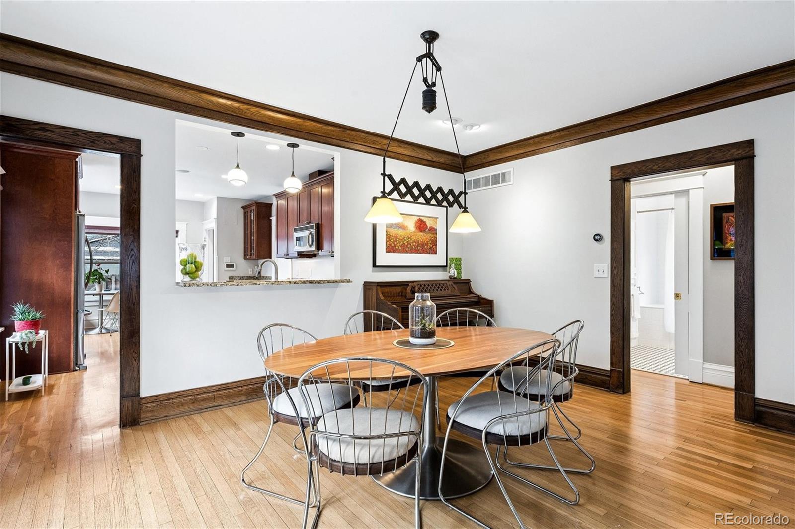 Located in the heart of Congress Park, this beautiful bungalow blends classic character with modern charm. Flooded with natural light, this home showcases original crown molding and hardwood floors throughout. The spacious main floor offers a large kitchen open to the dining room and cozy living room with a fireplace. The main floor also boasts three bedrooms and a remodeled bathroom, with a fourth bedroom and an en suite bathroom in the basement. The layout of this home offers plenty of versatility. A second living space in the basement is great for a media room or playroom. Sitting on a generous lot, the professionally irrigated landscape features mature, region-appropriate perennials and a productive fruit garden—designed for beauty, sustainability, and low maintenance. Eco-conscious upgrades include fully owned solar panels and a NACS/Tesla EV charger, which significantly reduce utility costs. A front-accessible driveway leads to a garage for convenient parking and storage. Enjoy indoor-outdoor living with a large covered front porch, a flagstone patio, and a fully fenced yard, ideal for entertaining or relaxing on a fabulous Colorado evening! Property Highlights: Four Bedrooms, two bathrooms, spacious floor plan, tons of original charm with modern updates, large laundry room with utility sink, and private backyard. This home is just blocks from Congress Park/Pool, the Denver Botanic Gardens, Cherry Creek North, the shops on 9th and CO, along with the historic theaters along Colfax Ave. Easy access to downtown Denver!