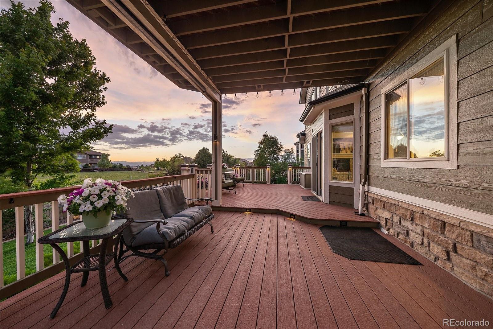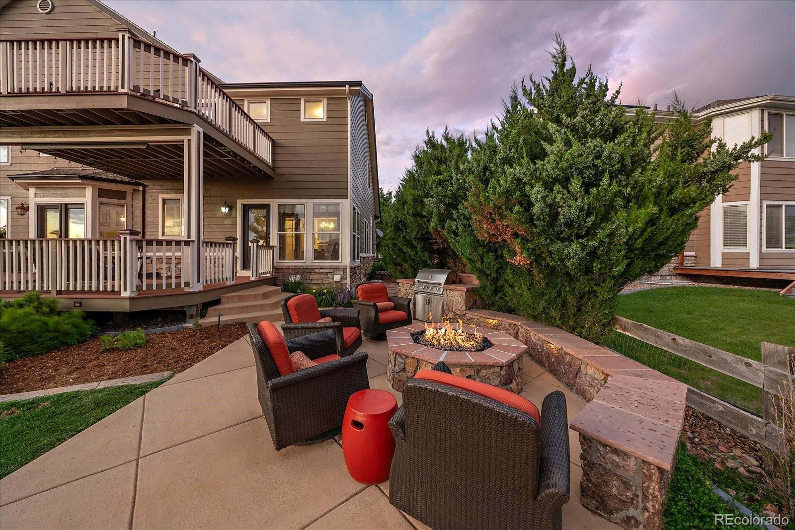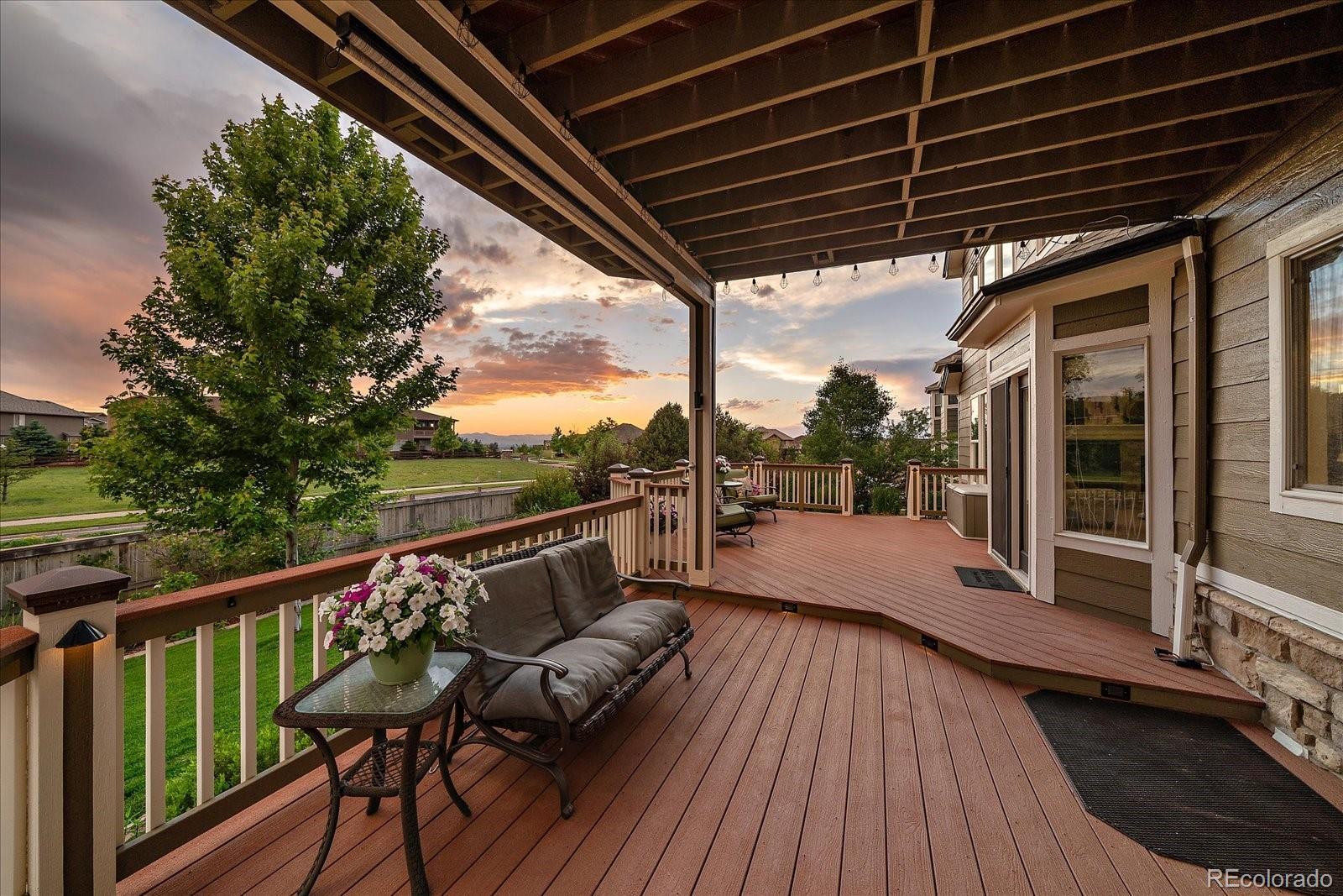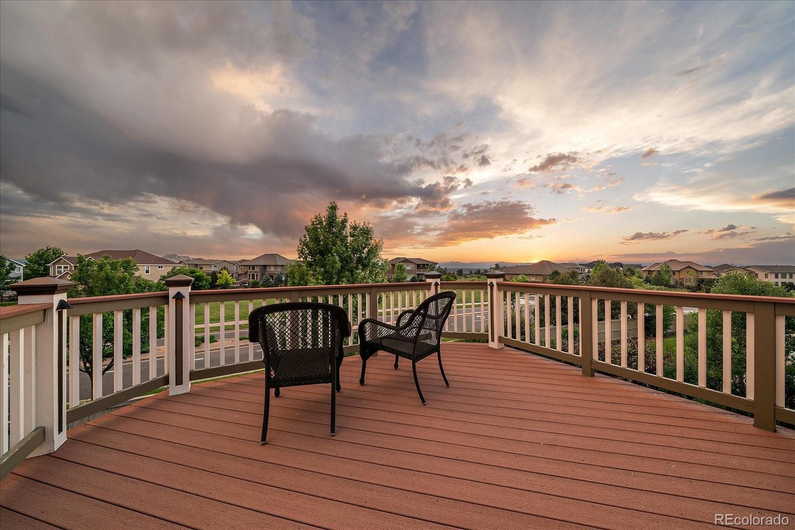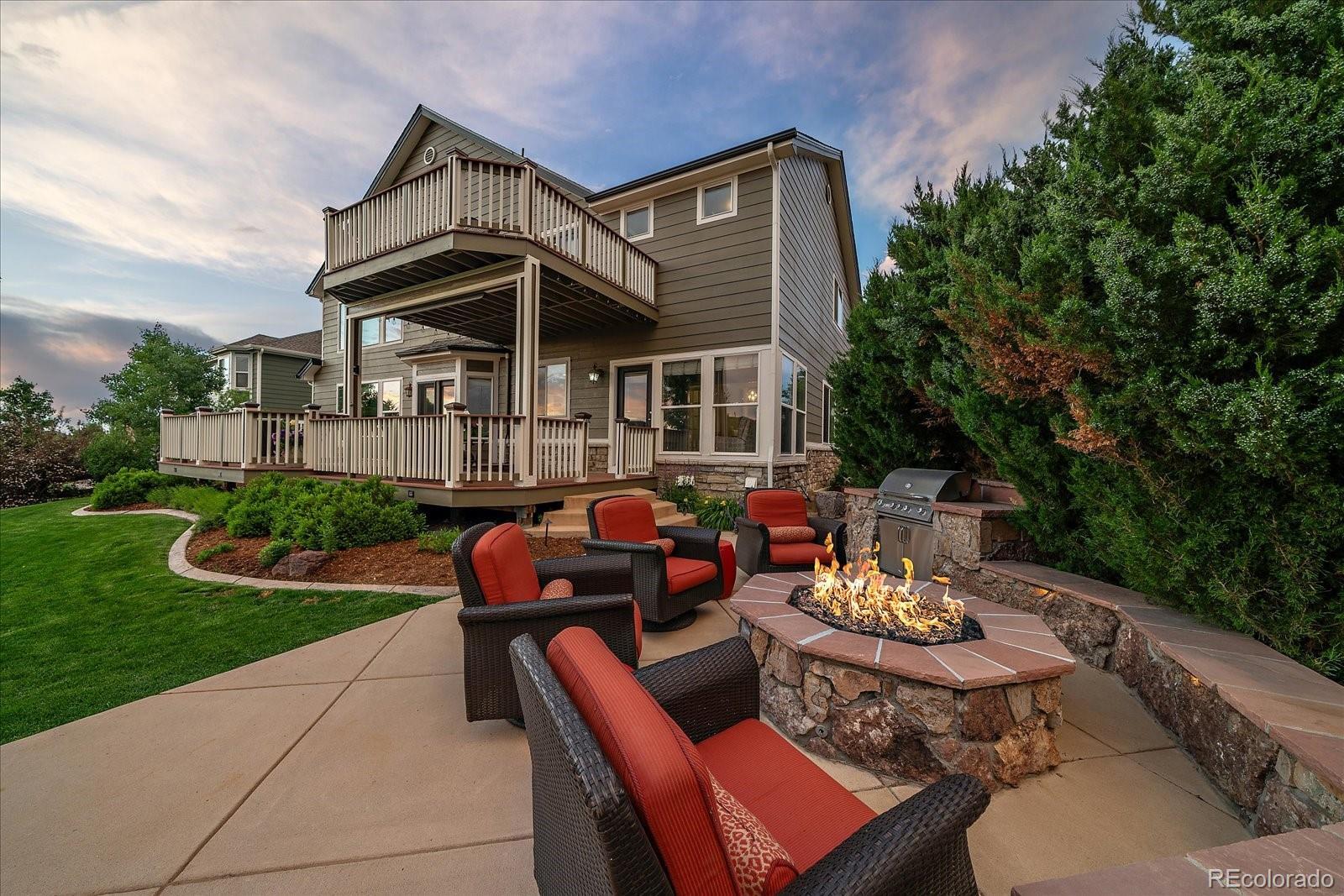 Perfectly perched to take in stunning mountain views, this four-bedroom, four-bathroom gem is the entertainer’s dream you’ve been waiting for. From the moment you enter, you're greeted with dramatic vaulted ceilings, an elegant curved staircase, and sophisticated finishes throughout. The open-concept main level boasts a spacious formal living and dining area, a large private office with hardwood floors, a sunroom and an effortless flow into the heart of the home—an updated kitchen featuring sleek stainless-steel appliances, a double oven, gas range in the island, and granite countertops. Gather in the spacious family room with a cozy gas fireplace and large windows that flood the space with natural light. Just outside, your Colorado outdoor lifestyle awaits—a massive custom deck with breathtaking mountain views, concrete patio featuring an outdoor grill and fire pit connected to natural gas, outdoor audio system, a calming water feature and meticulously manicured landscaping that truly sets the scene. Upstairs, your generously sized primary retreat includes a spa-inspired ensuite with dual vanities, jetted tub, and a large walk-in shower—plus private deck to soak in those gorgeous Colorado sunsets. Three additional spacious bedrooms with large closets including one with an ensuite bathroom, and another full bath with dual vanities round out the upper level. The 1800+ sq ft unfinished basement is ready for your finishes. Recent updates include a Class 4 roof installed in 2023, the exterior of the home and deck painted in 2022, multiple new windows, and the majority of the upper level was just painted in 2025. This home blends elegance, comfort, and a truly unbeatable setting. Come see it before someone else calls it theirs.