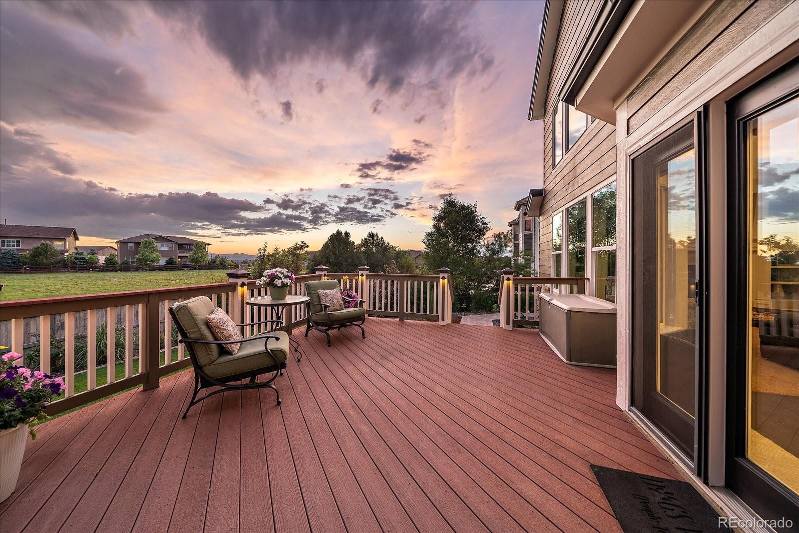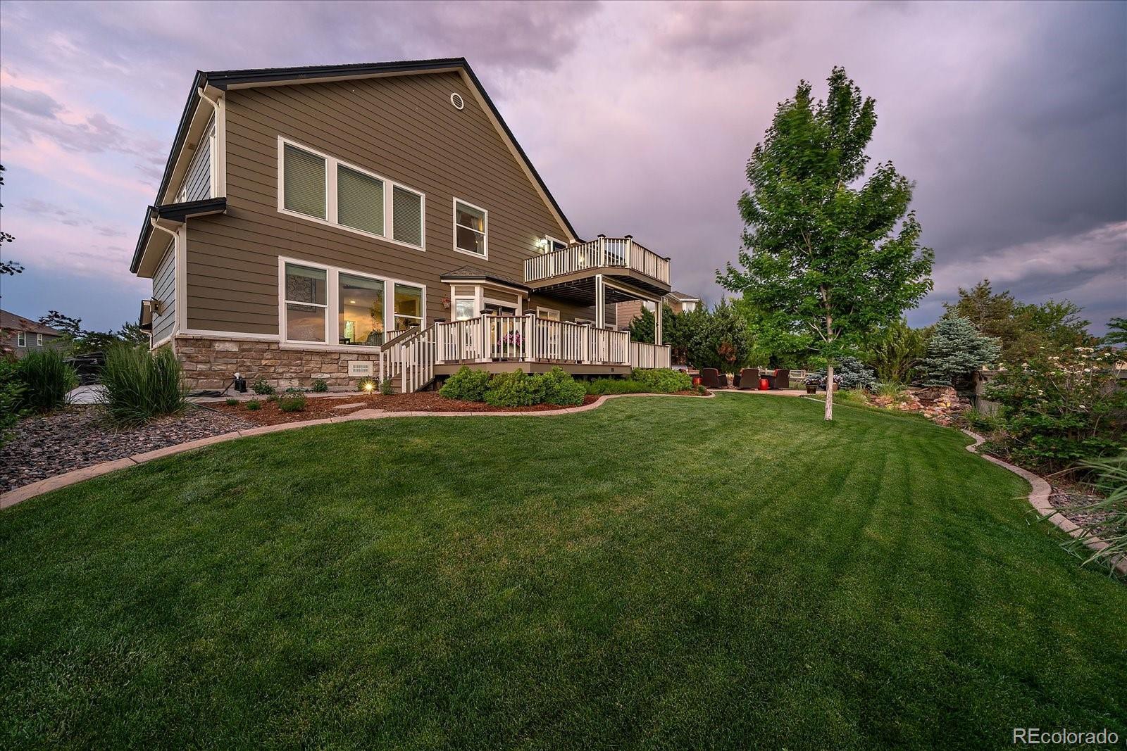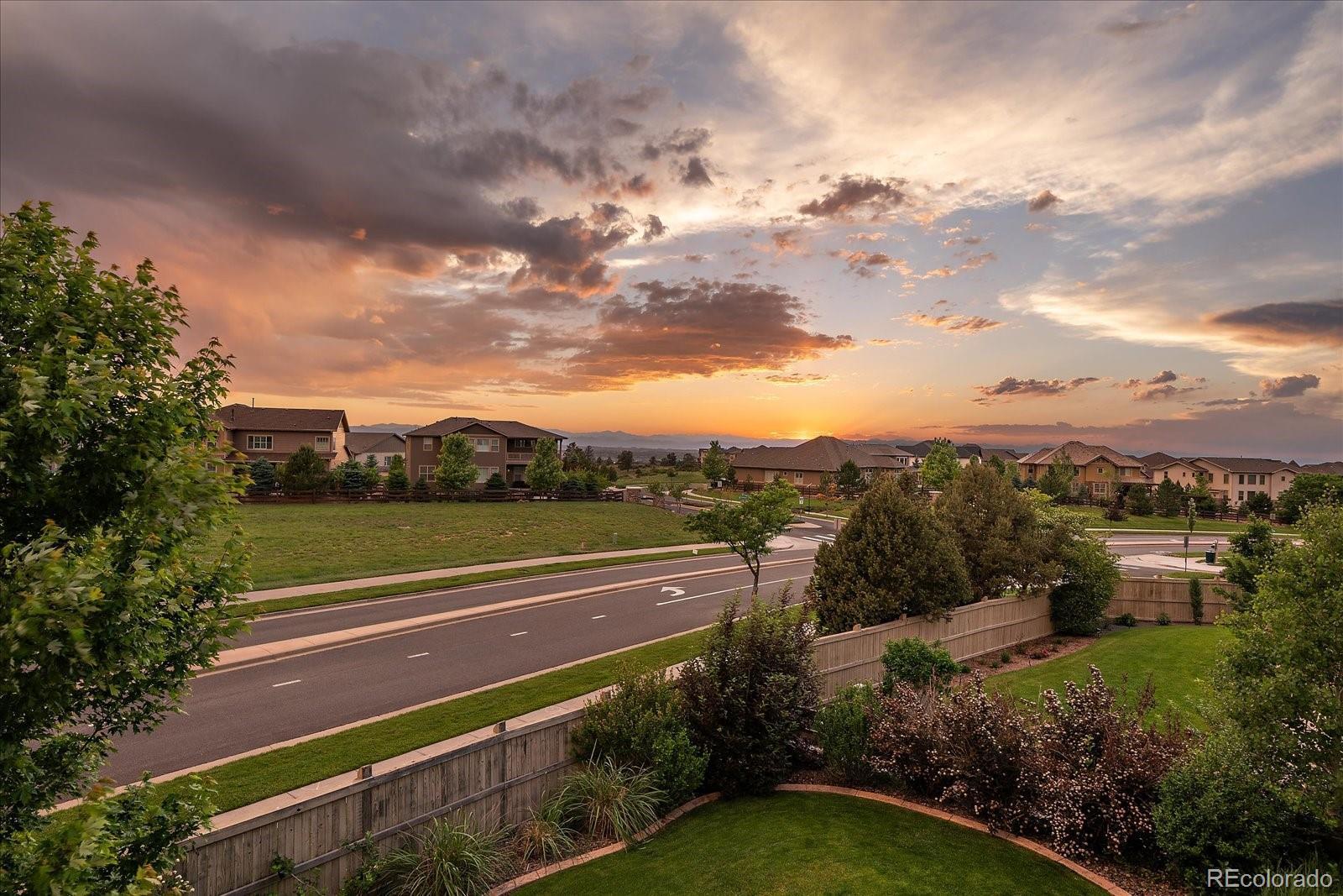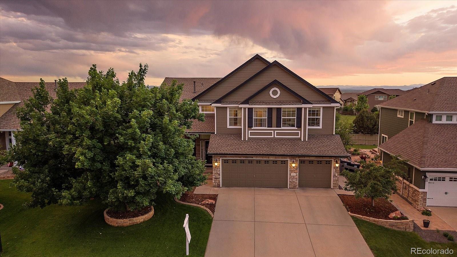 Perfectly perched to take in stunning mountain views, this four-bedroom, four-bathroom gem is the entertainer’s dream you’ve been waiting for. From the moment you enter, you're greeted with dramatic vaulted ceilings, an elegant curved staircase, and sophisticated finishes throughout. The open-concept main level boasts a spacious formal living and dining area, a large private office with hardwood floors, a sunroom and an effortless flow into the heart of the home—an updated kitchen featuring sleek stainless-steel appliances, a double oven, gas range in the island, and granite countertops. Gather in the spacious family room with a cozy gas fireplace and large windows that flood the space with natural light. Just outside, your Colorado outdoor lifestyle awaits—a massive custom deck with breathtaking mountain views, concrete patio featuring an outdoor grill and fire pit connected to natural gas, outdoor audio system, a calming water feature and meticulously manicured landscaping that truly sets the scene. Upstairs, your generously sized primary retreat includes a spa-inspired ensuite with dual vanities, jetted tub, and a large walk-in shower—plus private deck to soak in those gorgeous Colorado sunsets. Three additional spacious bedrooms with large closets including one with an ensuite bathroom, and another full bath with dual vanities round out the upper level. The 1800+ sq ft unfinished basement is ready for your finishes. Recent updates include a Class 4 roof installed in 2023, the exterior of the home and deck painted in 2022, multiple new windows, and the majority of the upper level was just painted in 2025. This home blends elegance, comfort, and a truly unbeatable setting. Come see it before someone else calls it theirs.