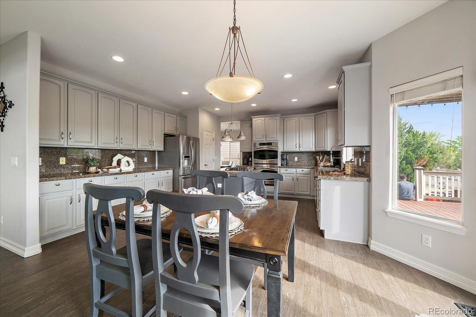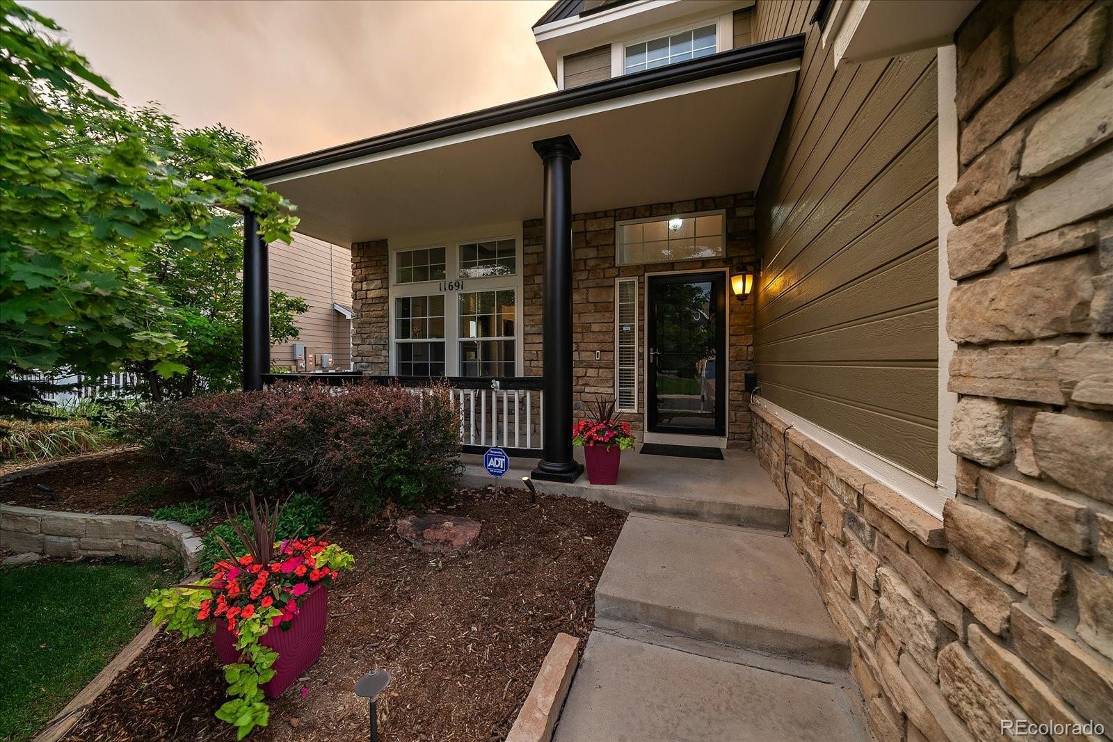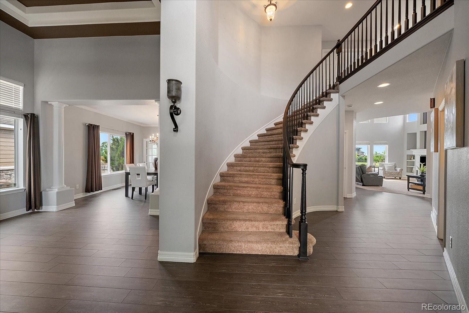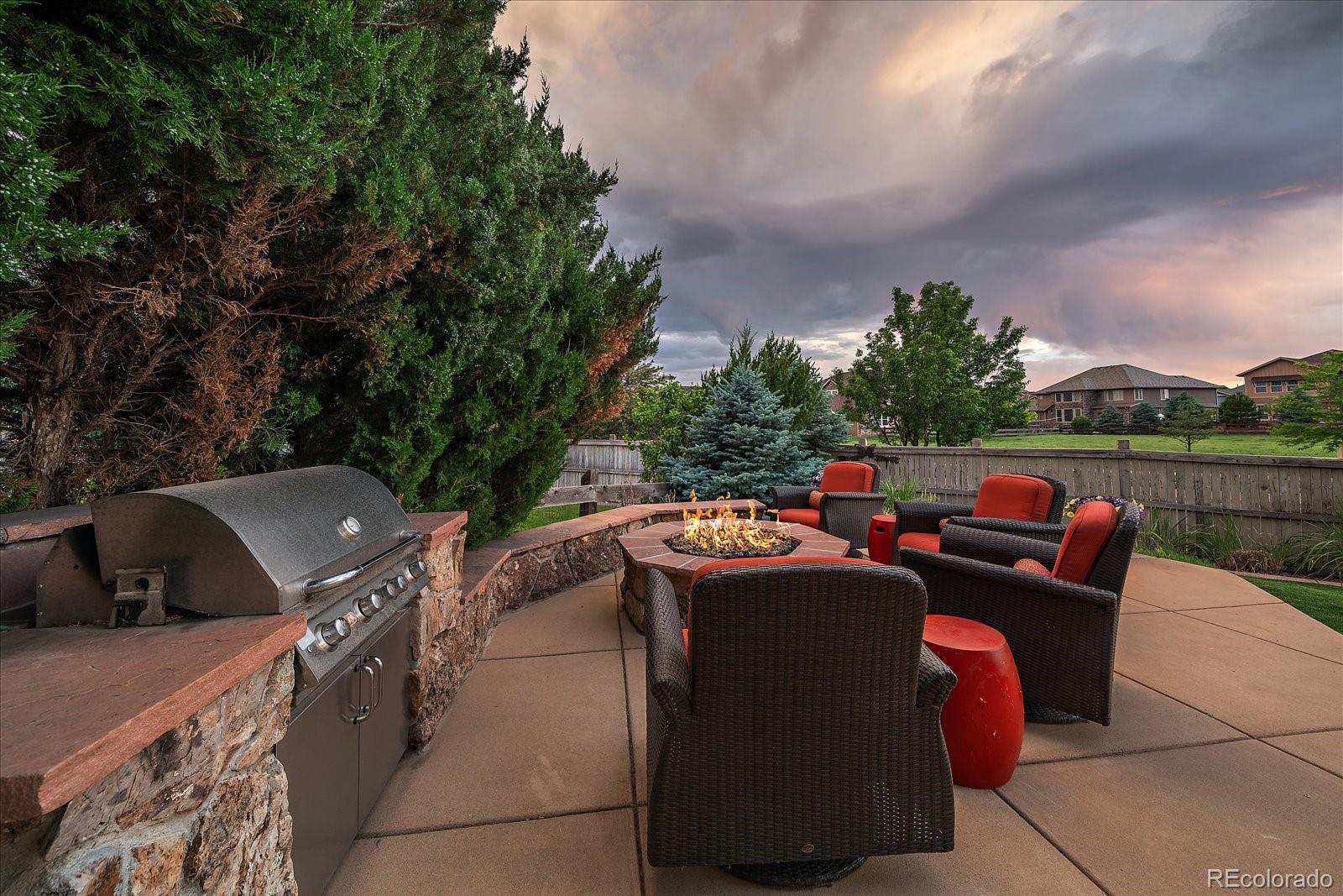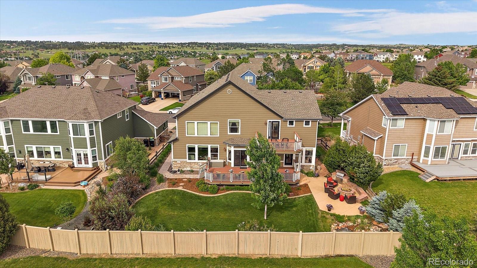 Perfectly perched to take in stunning mountain views, this four-bedroom, four-bathroom gem is the entertainer’s dream you’ve been waiting for. From the moment you enter, you're greeted with dramatic vaulted ceilings, an elegant curved staircase, and sophisticated finishes throughout. The open-concept main level boasts a spacious formal living and dining area, a large private office with hardwood floors, a sunroom and an effortless flow into the heart of the home—an updated kitchen featuring sleek stainless-steel appliances, a double oven, gas range in the island, and granite countertops. Gather in the spacious family room with a cozy gas fireplace and large windows that flood the space with natural light. Just outside, your Colorado outdoor lifestyle awaits—a massive custom deck with breathtaking mountain views, concrete patio featuring an outdoor grill and fire pit connected to natural gas, outdoor audio system, a calming water feature and meticulously manicured landscaping that truly sets the scene. Upstairs, your generously sized primary retreat includes a spa-inspired ensuite with dual vanities, jetted tub, and a large walk-in shower—plus private deck to soak in those gorgeous Colorado sunsets. Three additional spacious bedrooms with large closets including one with an ensuite bathroom, and another full bath with dual vanities round out the upper level. The 1800+ sq ft unfinished basement is ready for your finishes. Recent updates include a Class 4 roof installed in 2023, the exterior of the home and deck painted in 2022, multiple new windows, and the majority of the upper level was just painted in 2025. This home blends elegance, comfort, and a truly unbeatable setting. Come see it before someone else calls it theirs.