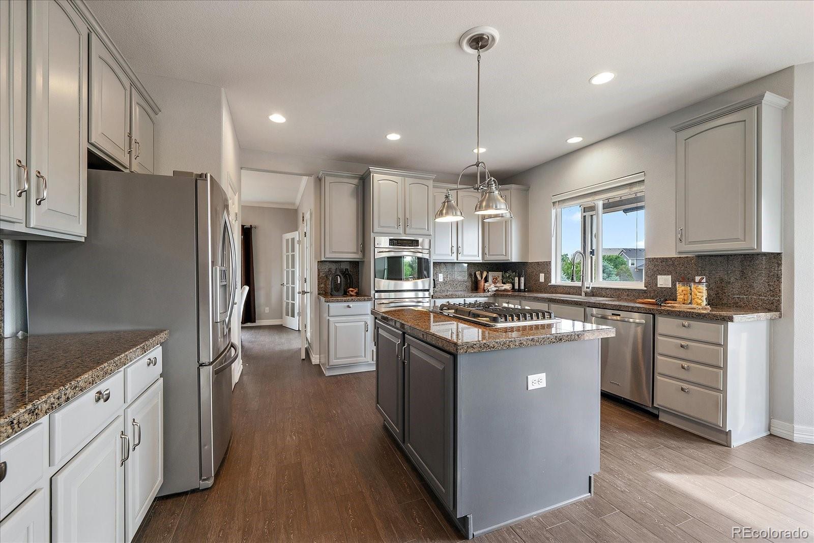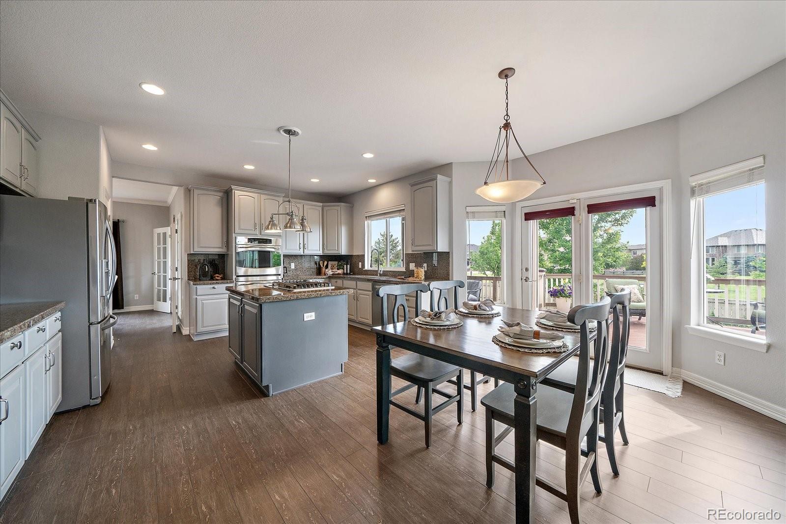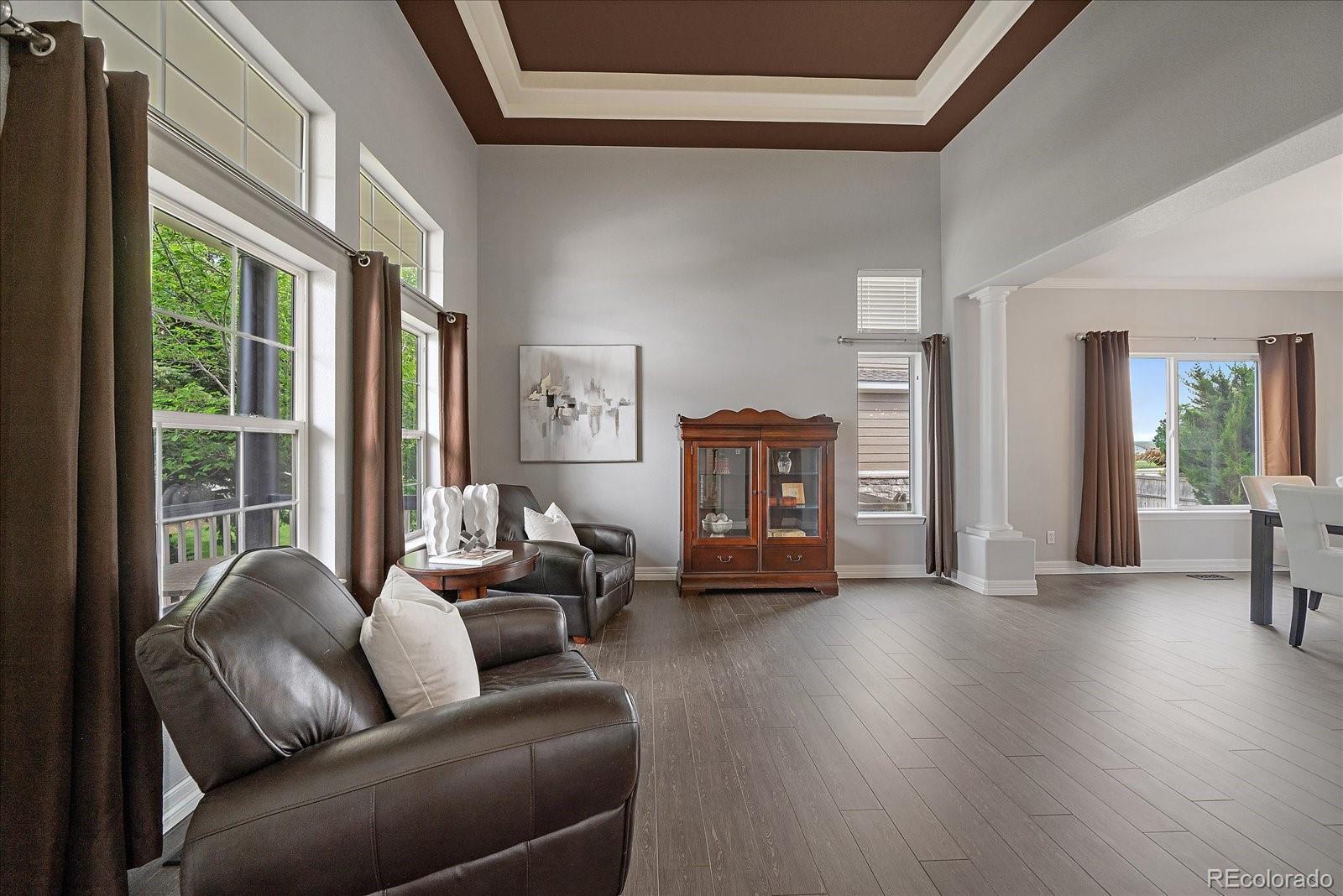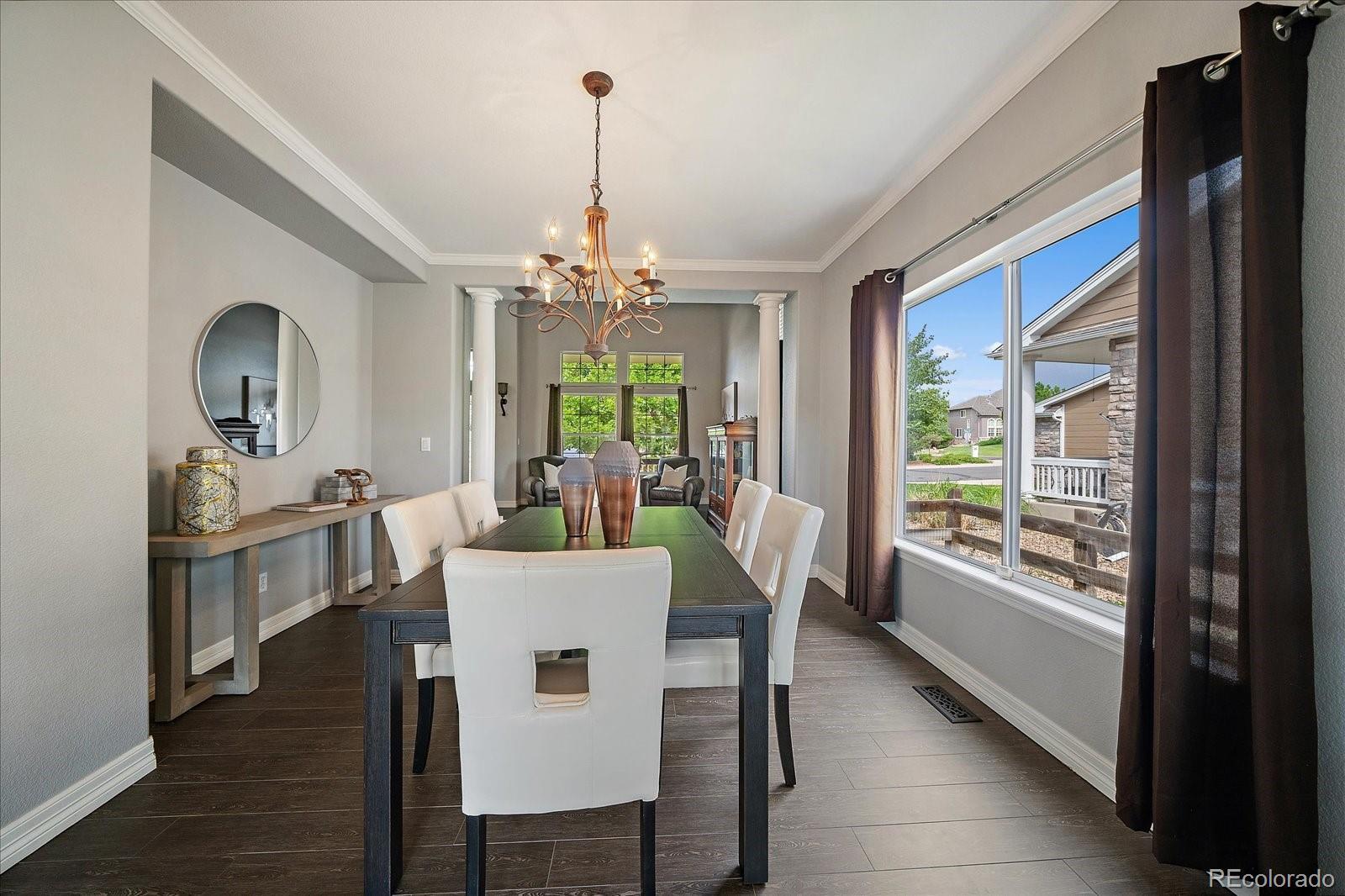 Perfectly perched to take in stunning mountain views, this four-bedroom, four-bathroom gem is the entertainer’s dream you’ve been waiting for. From the moment you enter, you're greeted with dramatic vaulted ceilings, an elegant curved staircase, and sophisticated finishes throughout. The open-concept main level boasts a spacious formal living and dining area, a large private office with hardwood floors, a sunroom and an effortless flow into the heart of the home—an updated kitchen featuring sleek stainless-steel appliances, a double oven, gas range in the island, and granite countertops. Gather in the spacious family room with a cozy gas fireplace and large windows that flood the space with natural light. Just outside, your Colorado outdoor lifestyle awaits—a massive custom deck with breathtaking mountain views, concrete patio featuring an outdoor grill and fire pit connected to natural gas, outdoor audio system, a calming water feature and meticulously manicured landscaping that truly sets the scene. Upstairs, your generously sized primary retreat includes a spa-inspired ensuite with dual vanities, jetted tub, and a large walk-in shower—plus private deck to soak in those gorgeous Colorado sunsets. Three additional spacious bedrooms with large closets including one with an ensuite bathroom, and another full bath with dual vanities round out the upper level. The 1800+ sq ft unfinished basement is ready for your finishes. Recent updates include a Class 4 roof installed in 2023, the exterior of the home and deck painted in 2022, multiple new windows, and the majority of the upper level was just painted in 2025. This home blends elegance, comfort, and a truly unbeatable setting. Come see it before someone else calls it theirs.