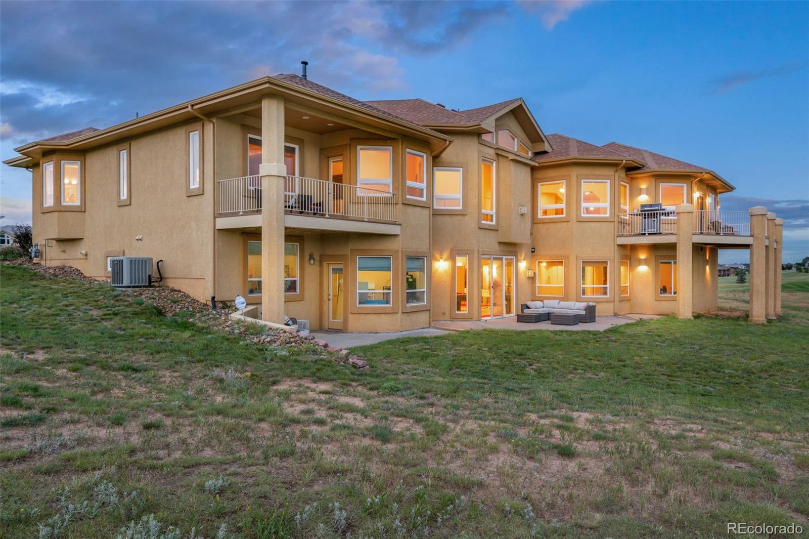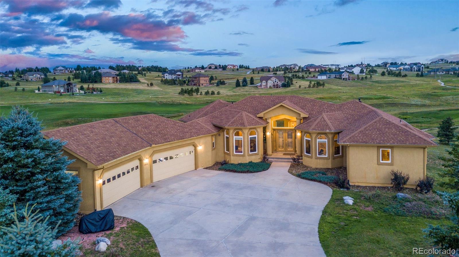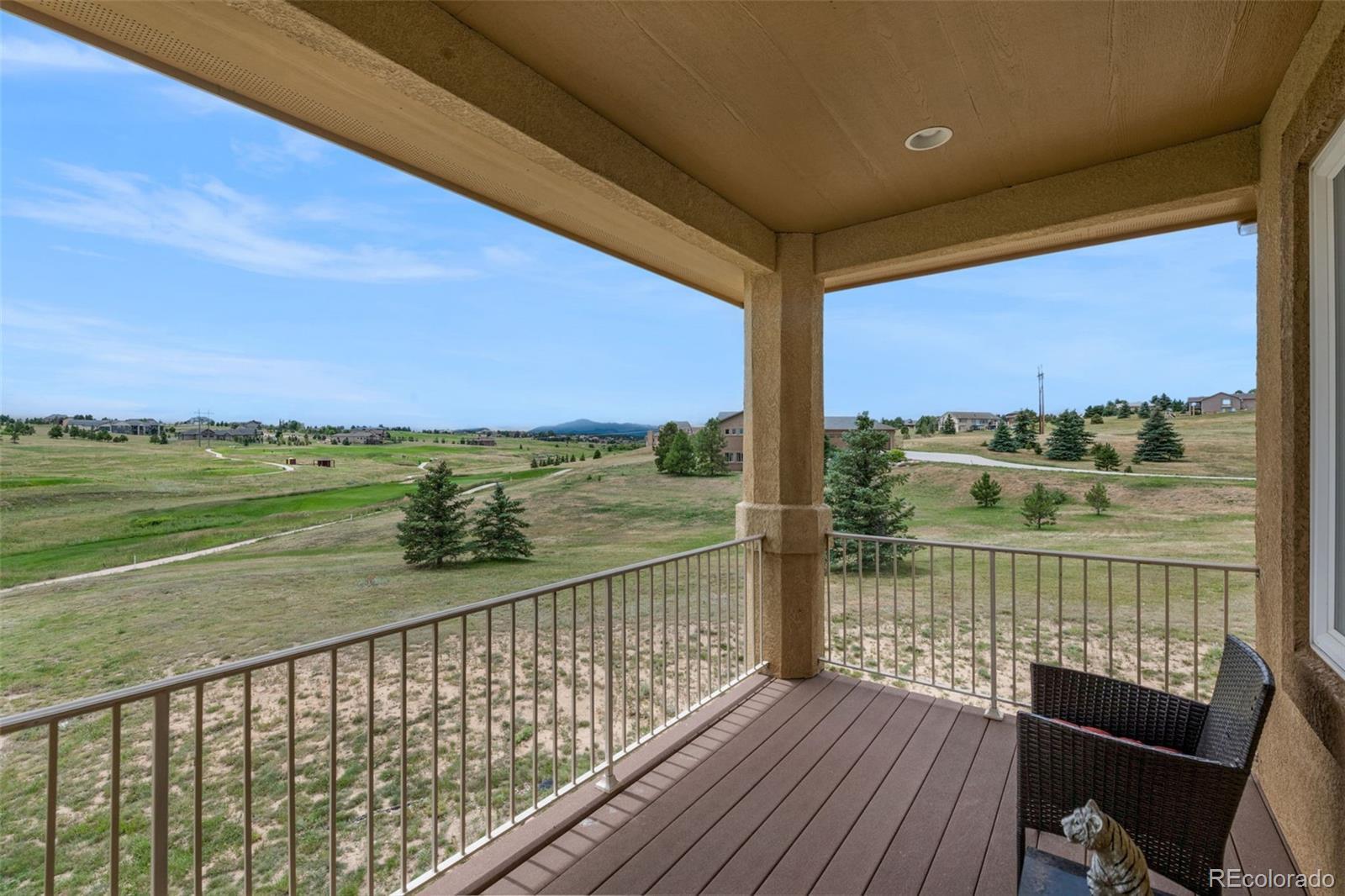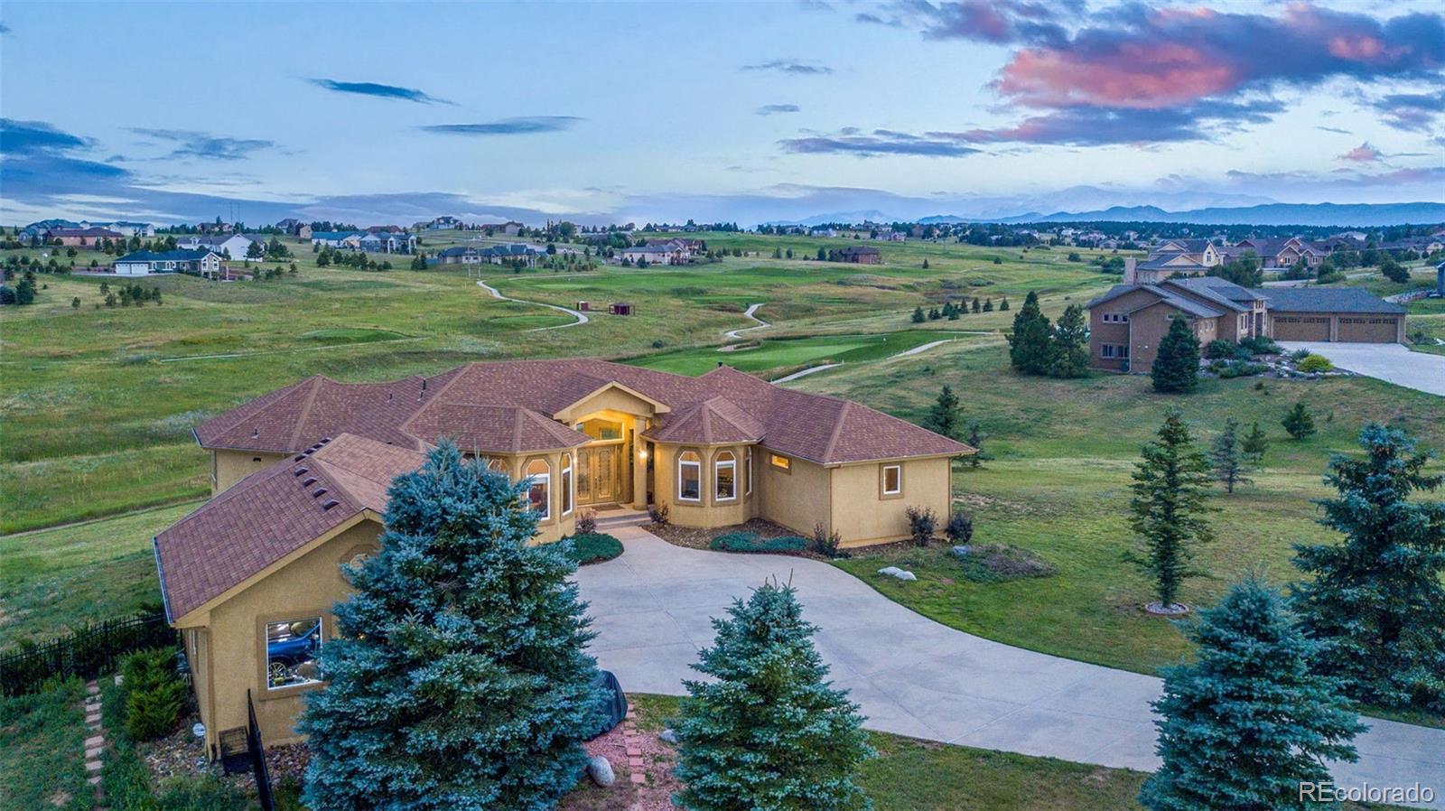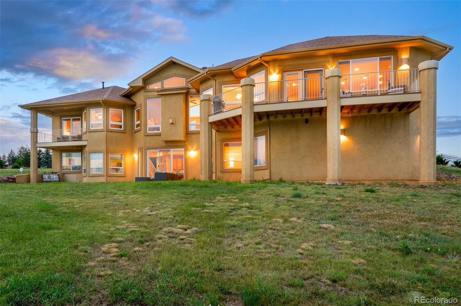 Experience exceptional Colorado living in this luxurious 2.5-acre estate located in the highly desirable Kings Deer community of Monument. Ideally positioned with convenient access to Denver, Colorado Springs, Castle Rock and the Denver Tech Center, this custom residence offers breathtaking Pikes Peak and golf course views, no HOA and a layout for multi-generational living. This expansive ranch-style home features true main-level living with an open floor plan, vaulted ceilings, large windows, central air conditioning and multiple gas fireplaces. The main level showcases a private primary suite designed as a retreat, complete with its own fireplace, sitting area with mountain views, spacious walk-in closet and a spa-inspired five-piece bath with jetted tub, dual shower and dual vanities. Additional main-level highlights include a formal dining room with bay window overlooking Pikes Peak, an open-concept family room with gas fireplace and a gourmet kitchen ideal for entertaining. The kitchen offers solid surface countertops, breakfast bar seating, high-end appliances and a Butler’s Pantry providing abundant storage and prep space. The fully finished walkout basement expands the living area with a large recreation room, wet bar, dedicated media or home theater room and walk-out access to outdoor entertaining spaces. Multiple en-suite bedrooms throughout the home each offer private bathrooms, providing comfort and privacy for guests or extended family. Convenient laundry rooms are located on both the main level and basement. Additional features include newer carpet, whole-house water filtration system with UV purification, radon mitigation system, security system and ample storage throughout. The oversized four-car garage offers abundant space, while the adjacent fenced area is ideal for pets. This remarkable Kings Deer property combines luxury, functionality, acreage and sweeping mountain views in one of Monument’s most sought-after communities.