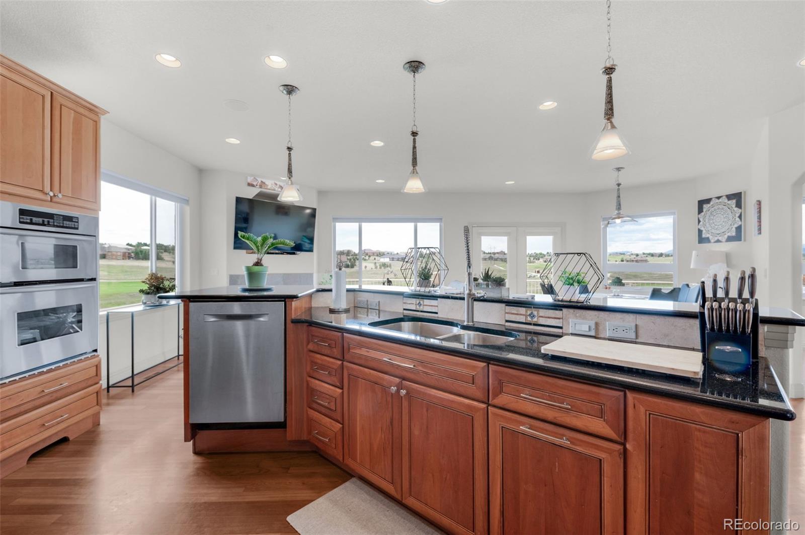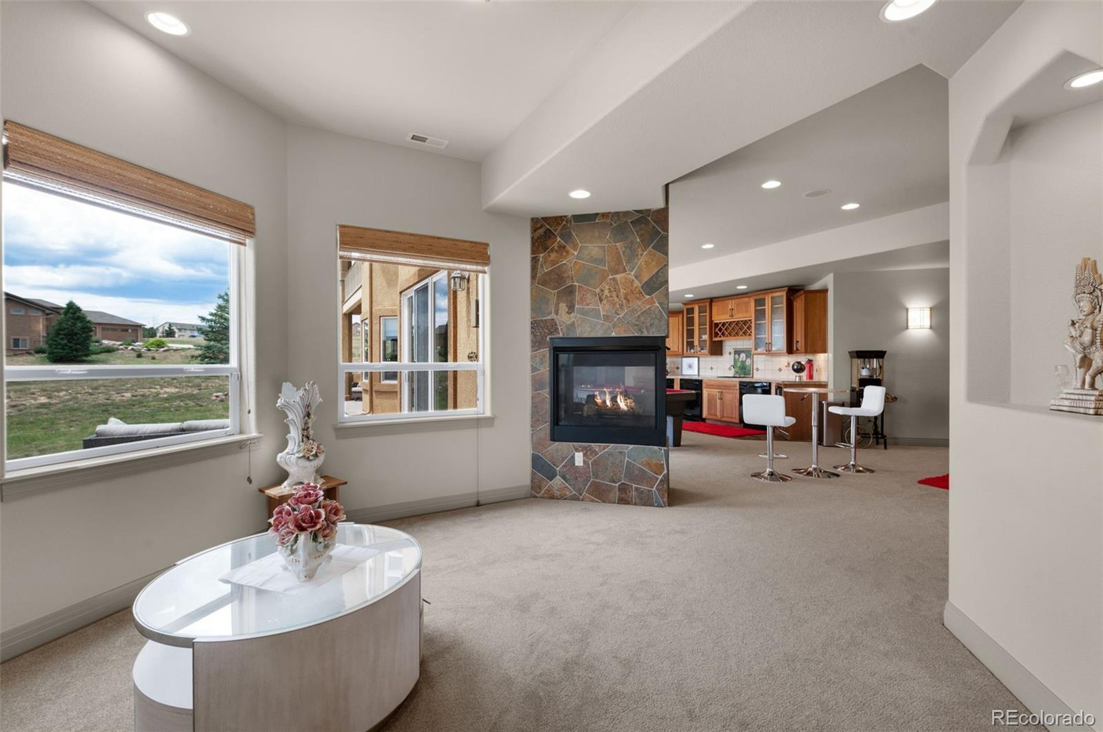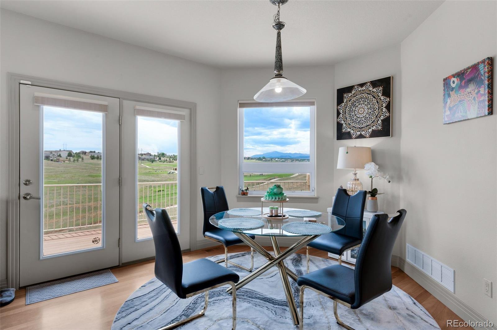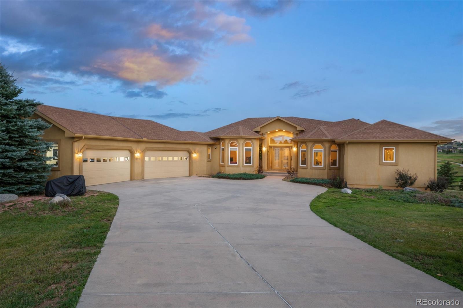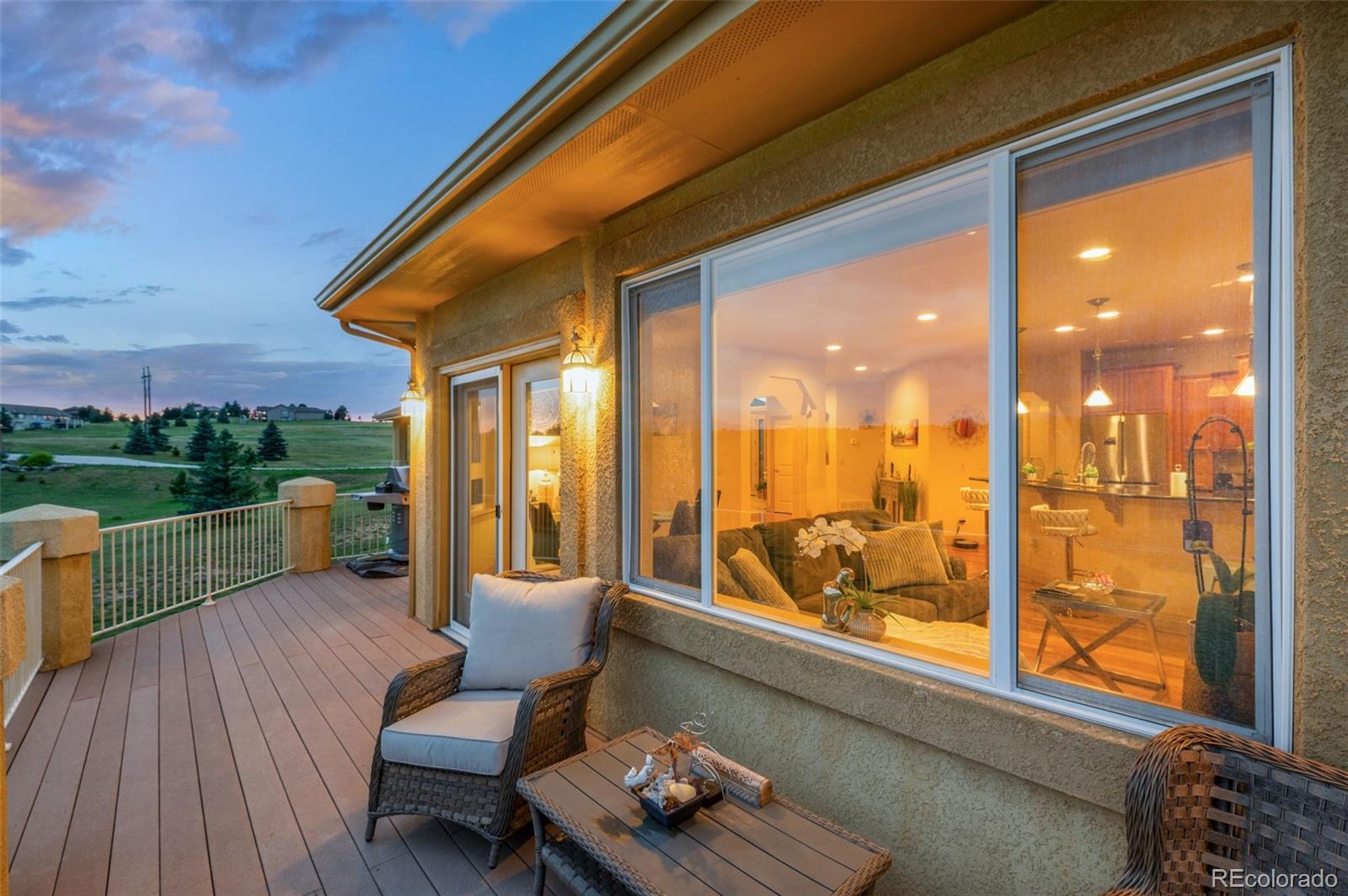 Experience exceptional Colorado living in this luxurious 2.5-acre estate located in the highly desirable Kings Deer community of Monument. Ideally positioned with convenient access to Denver, Colorado Springs, Castle Rock and the Denver Tech Center, this custom residence offers breathtaking Pikes Peak and golf course views, no HOA and a layout for multi-generational living. This expansive ranch-style home features true main-level living with an open floor plan, vaulted ceilings, large windows, central air conditioning and multiple gas fireplaces. The main level showcases a private primary suite designed as a retreat, complete with its own fireplace, sitting area with mountain views, spacious walk-in closet and a spa-inspired five-piece bath with jetted tub, dual shower and dual vanities. Additional main-level highlights include a formal dining room with bay window overlooking Pikes Peak, an open-concept family room with gas fireplace and a gourmet kitchen ideal for entertaining. The kitchen offers solid surface countertops, breakfast bar seating, high-end appliances and a Butler’s Pantry providing abundant storage and prep space. The fully finished walkout basement expands the living area with a large recreation room, wet bar, dedicated media or home theater room and walk-out access to outdoor entertaining spaces. Multiple en-suite bedrooms throughout the home each offer private bathrooms, providing comfort and privacy for guests or extended family. Convenient laundry rooms are located on both the main level and basement. Additional features include newer carpet, whole-house water filtration system with UV purification, radon mitigation system, security system and ample storage throughout. The oversized four-car garage offers abundant space, while the adjacent fenced area is ideal for pets. This remarkable Kings Deer property combines luxury, functionality, acreage and sweeping mountain views in one of Monument’s most sought-after communities.