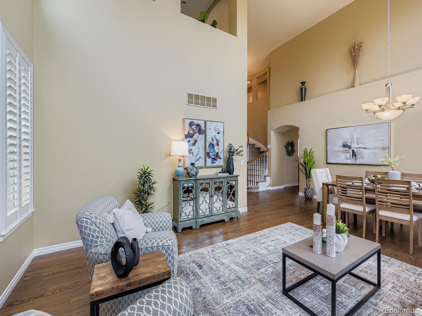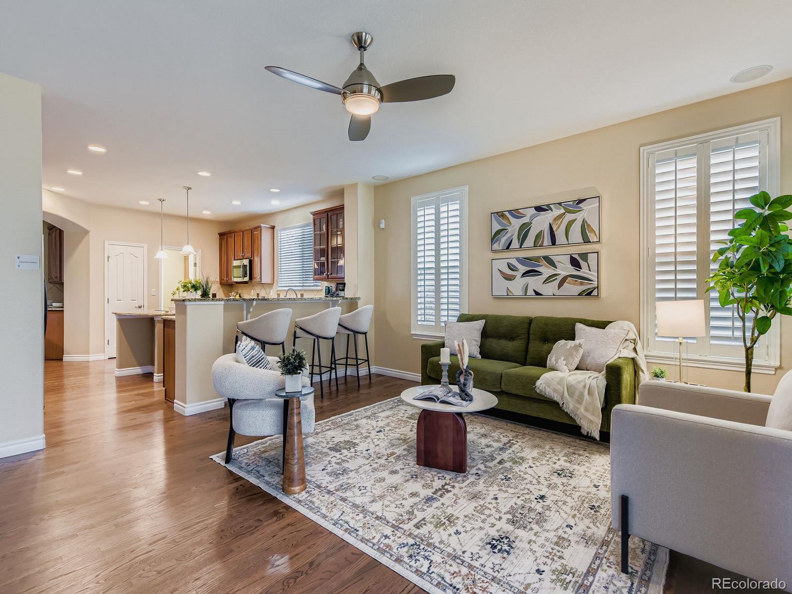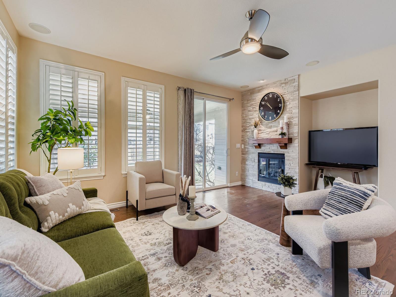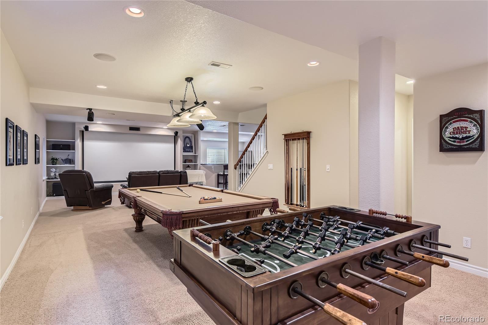 Perfectly positioned on one of the neighborhood’s most coveted streets, this exceptional home offers front-row access to hundreds of acres of open space and future trail systems just steps from your front door. Inside, you’ll find gleaming hardwood floors across the main level, brand-new upstairs carpet, and an abundance of natural light throughout. The main floor is thoughtfully designed with a full bath, a spacious office with French doors, and a warm, inviting family room centered around a cozy fireplace. The kitchen is both functional and elegant, featuring granite countertops, stainless steel appliances, an induction cooktop, double ovens, and a sunny breakfast nook with a butler’s pantry. Upstairs, an open loft with built-ins and a mini fridge overlooks peaceful open space, creating a flexible retreat or hangout area. It could also easily be converted to a bedroom if extra space is needed. Two front bedrooms capture beautiful views, one with a walk-in closet, while a full bath serves the level. The primary suite is a true sanctuary with two walk-in closets and a luxurious five-piece bath complete with dual sinks and a soaking tub. The finished basement is built for entertaining, offering a wet bar, home theater setup, and generous space for games. A pool table, foosball table, and home theater equipment are all included. Outside, relax on the covered patio with ceiling fan, ideal for summer evenings. Additional highlights include a three-car garage, plantation shutters, main-floor laundry, new exterior paint, and access to top-rated schools, extensive trail systems, and all four community recreation centers. From porch-side elk sightings and neighborhood block parties to nearby parks and rec centers, this home truly delivers the Colorado lifestyle at its best.