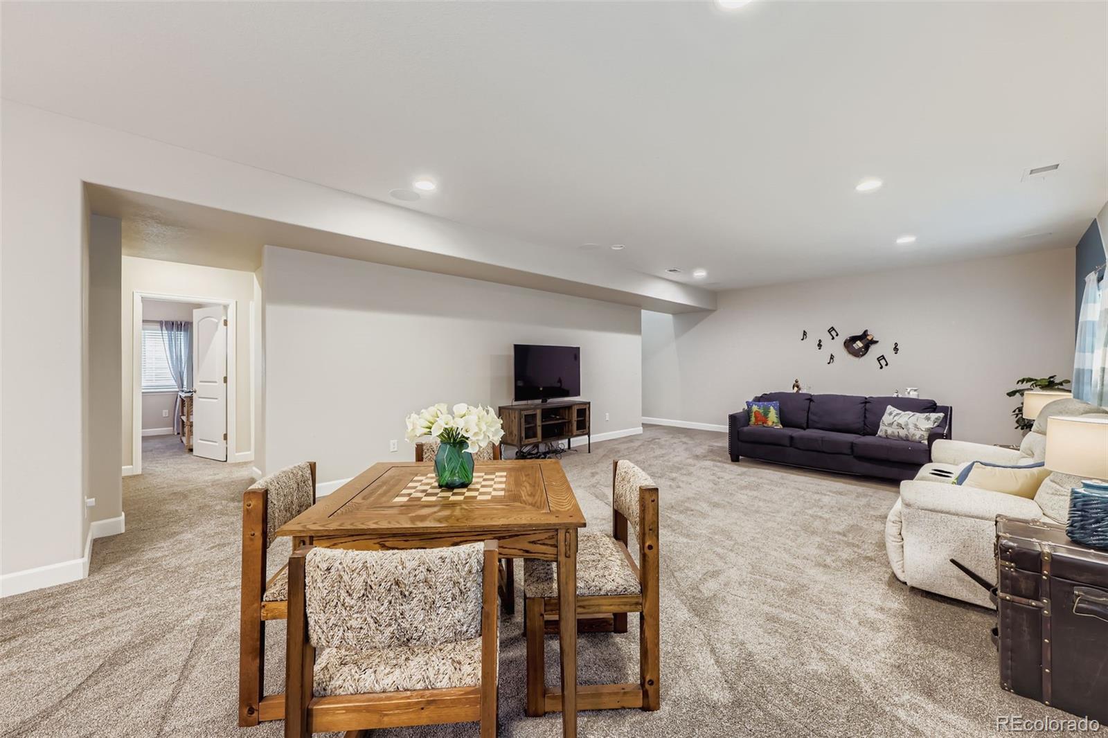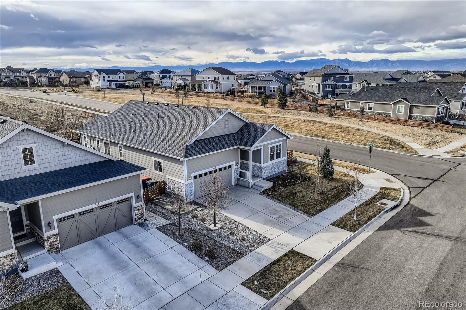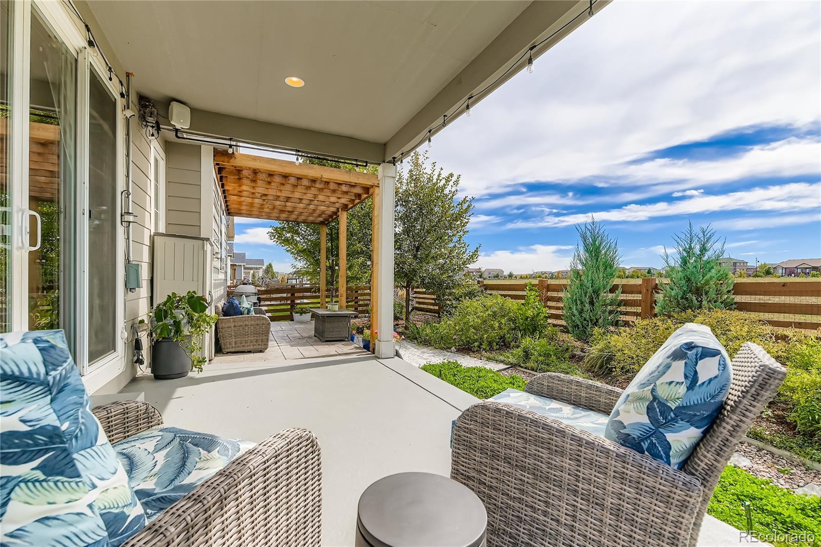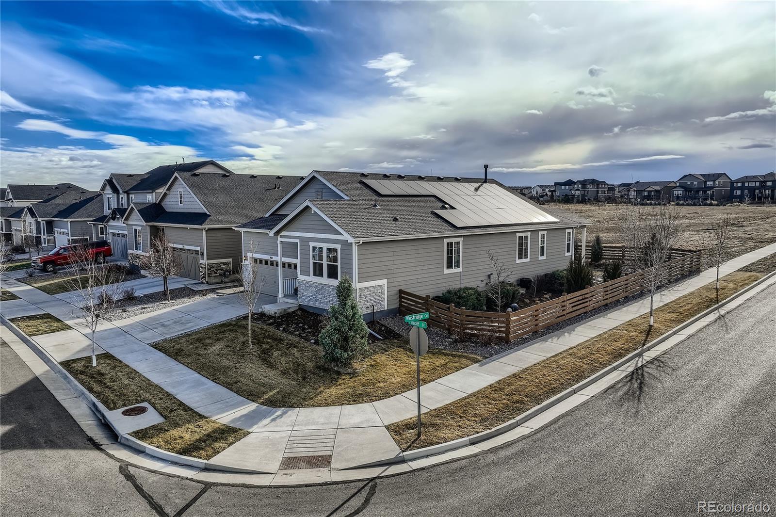 Welcome to this exceptional and like-new ranch on a premium corner lot in Collier Hills offering unparalleled privacy with no homes directly behind (land scheduled for elementary school to start in Spring-this home will be backing to softball and soccer fields of elementary school). This home incorporates nearly every available builder upgrade, a true value. The home is further enhanced by the seller's addition of a fully paid for active solar system ensuring low utility bills. The upgraded gourmet kitchen is a chef's dream, featuring an expansive center island, solid wood cabinetry, top-of-the-line appliances, quartz countertops, and large pantry. Flowing seamlessly from the kitchen the living room offers a stylish tile fireplace, integrated surround sound, and direct access to your private outdoor oasis: a 2-tier covered patio with pergola and a vibrant xeriscaped yard showcasing over 100 native perennial flowering plants and bushes. The oversized primary suite is a retreat with a coffered ceiling, spacious walk-in closet, and an upgraded 5-piece deluxe bath with a separate soaking tub and shower. Two additional main-floor bedrooms offer flexibility, with one perfectly suited as a study/home office. A convenient large main-floor laundry/mud room offers one level living with the washer and dryer being included. The finished basement offers a remarkable secondary living space with 9-foot ceilings, a large wet bar designed like a full kitchen (with quartz counters and extensive cabinetry), a spacious recreation room with surround sound, two additional bedrooms, and a versatile exercise/hobby room. The finished two-car garage features a 220-volt Powerhub for convenient electric vehicle charging, epoxy floor and additional storage space. Throughout the home you'll find engineered wood floors, upgraded carpet, quartz countertops, and more. A dream home move in ready. Colliers Hill is a planned community with pools, clubhouse, parks, playgrounds, and trails.