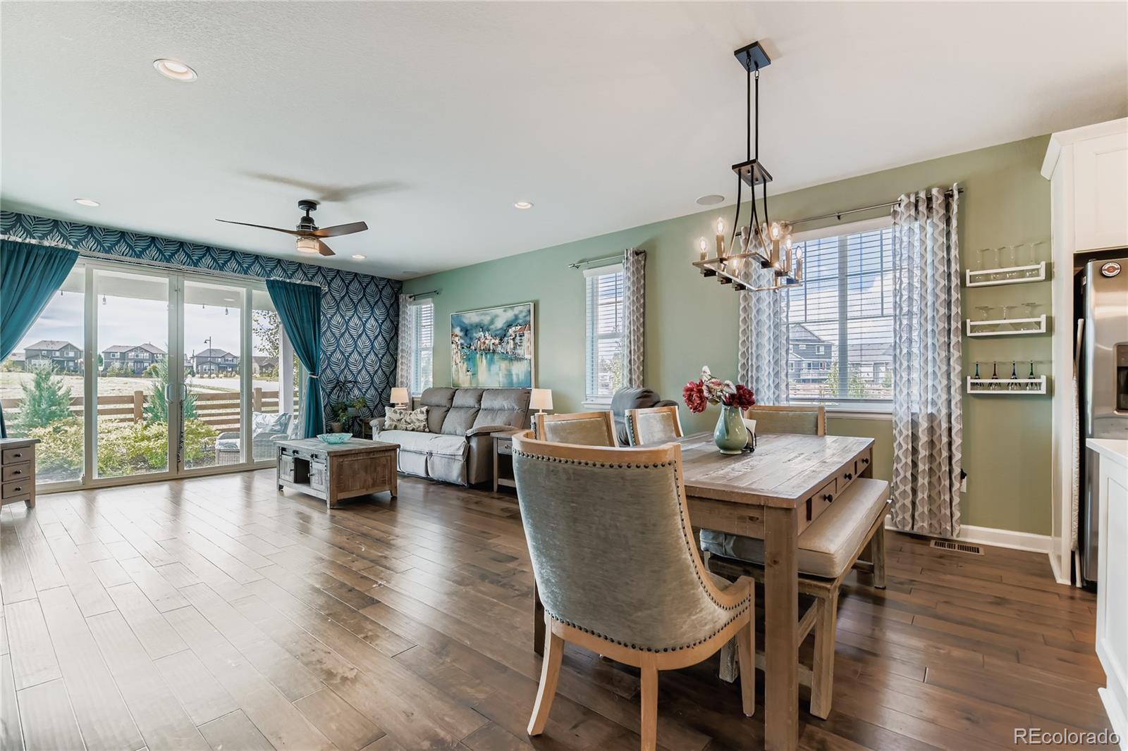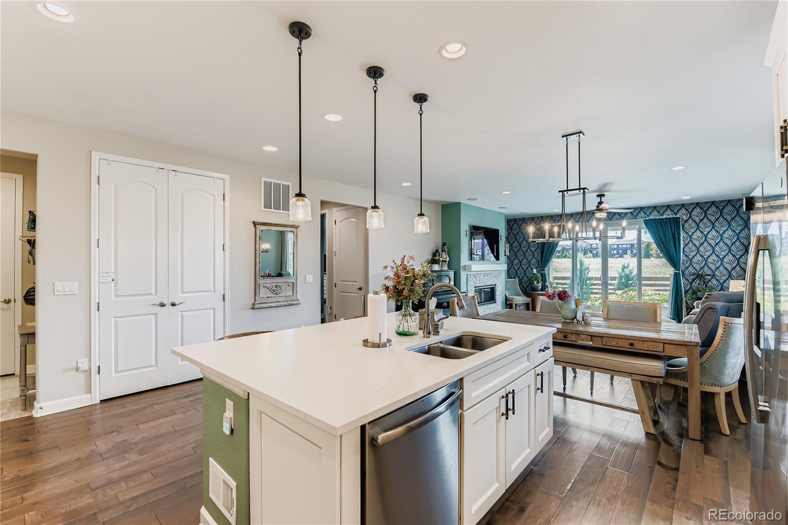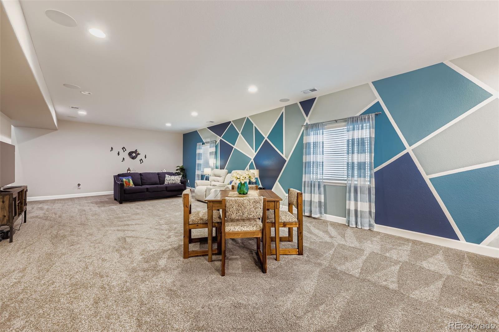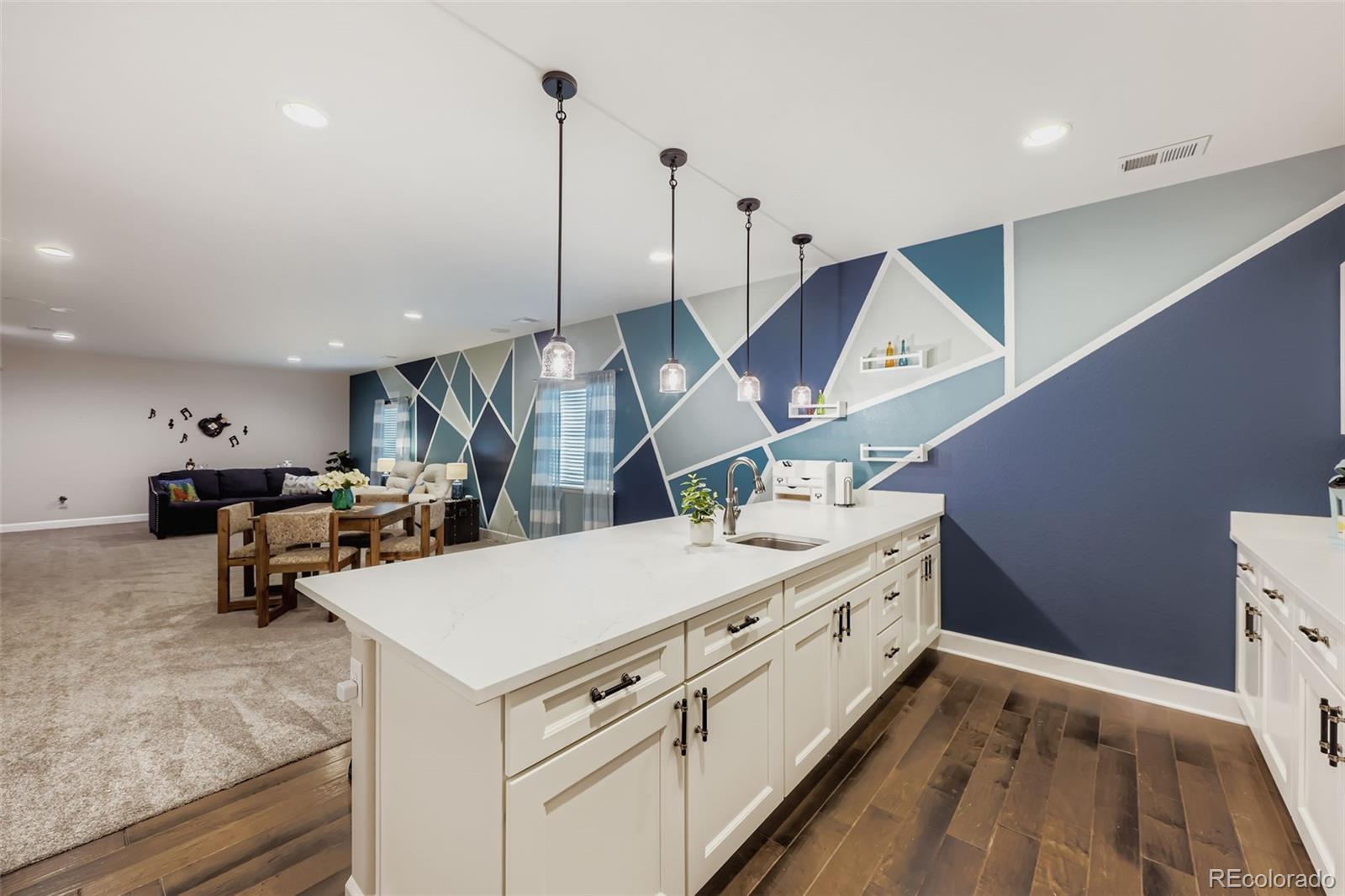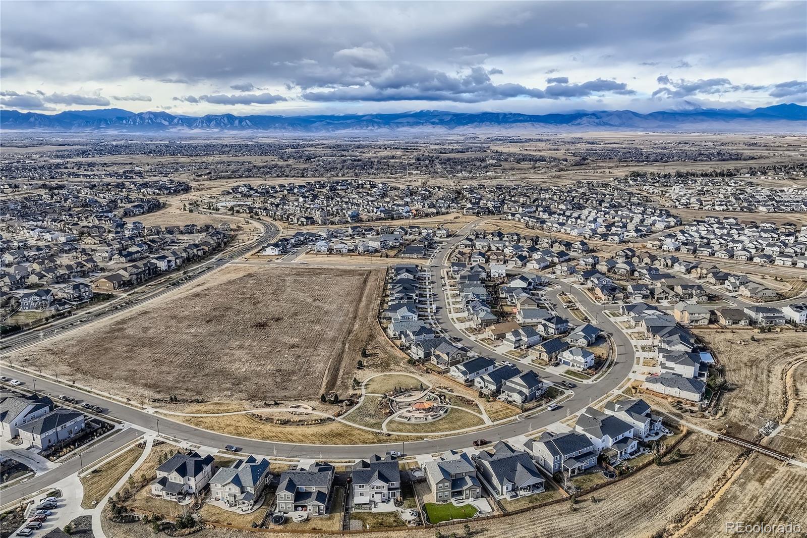 Welcome to this exceptional and like-new ranch on a premium corner lot in Collier Hills offering unparalleled privacy with no homes directly behind (land scheduled for elementary school to start in Spring-this home will be backing to softball and soccer fields of elementary school). This home incorporates nearly every available builder upgrade, a true value. The home is further enhanced by the seller's addition of a fully paid for active solar system ensuring low utility bills. The upgraded gourmet kitchen is a chef's dream, featuring an expansive center island, solid wood cabinetry, top-of-the-line appliances, quartz countertops, and large pantry. Flowing seamlessly from the kitchen the living room offers a stylish tile fireplace, integrated surround sound, and direct access to your private outdoor oasis: a 2-tier covered patio with pergola and a vibrant xeriscaped yard showcasing over 100 native perennial flowering plants and bushes. The oversized primary suite is a retreat with a coffered ceiling, spacious walk-in closet, and an upgraded 5-piece deluxe bath with a separate soaking tub and shower. Two additional main-floor bedrooms offer flexibility, with one perfectly suited as a study/home office. A convenient large main-floor laundry/mud room offers one level living with the washer and dryer being included. The finished basement offers a remarkable secondary living space with 9-foot ceilings, a large wet bar designed like a full kitchen (with quartz counters and extensive cabinetry), a spacious recreation room with surround sound, two additional bedrooms, and a versatile exercise/hobby room. The finished two-car garage features a 220-volt Powerhub for convenient electric vehicle charging, epoxy floor and additional storage space. Throughout the home you'll find engineered wood floors, upgraded carpet, quartz countertops, and more. A dream home move in ready. Colliers Hill is a planned community with pools, clubhouse, parks, playgrounds, and trails.