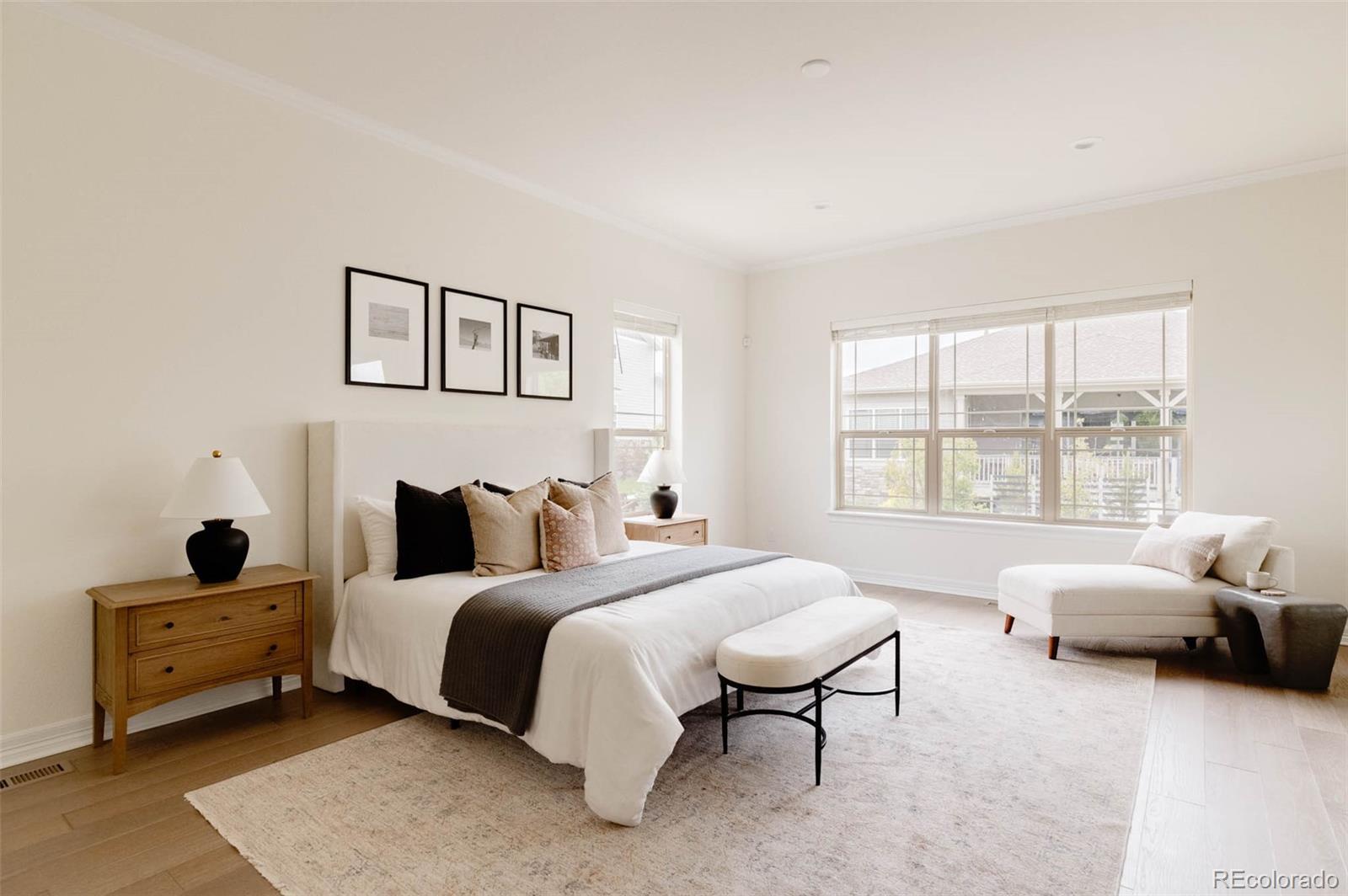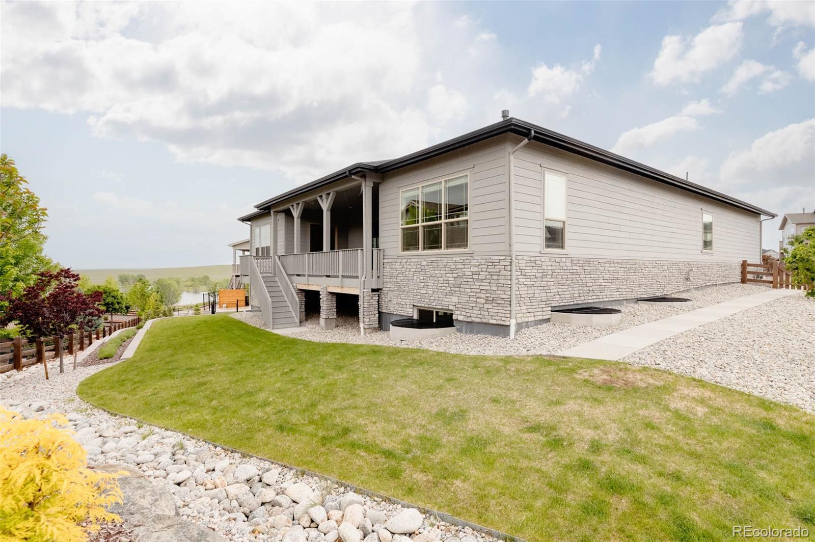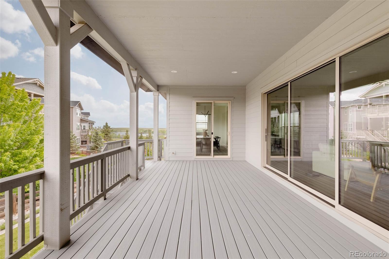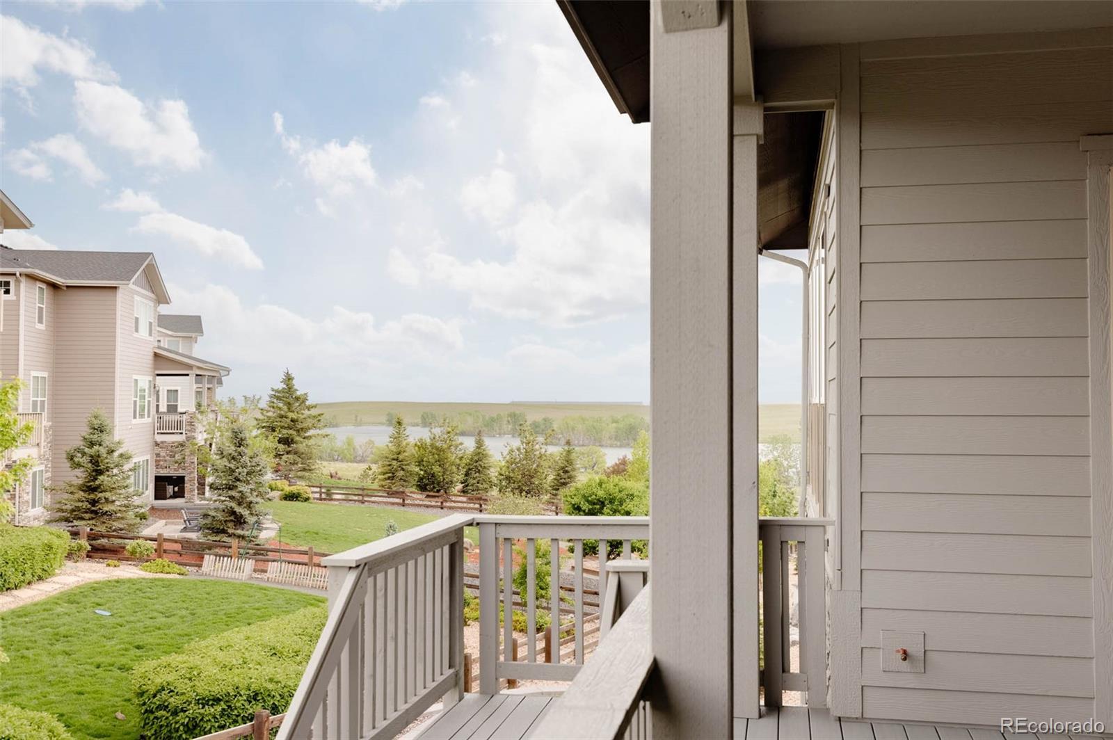 Nestled between two resort-style clubhouses & pools, & part of the award-winning Cherry Creek School District, this home offers the best of Colorado living with scenic trails, vibrant parks, state-of-the-art fitness centers, & the Aurora Reservoir just steps away. Inside, the great room impresses with soaring 12-ft ceilings and a stunning 15-ft stacked slider framing reservoir views. A gas fireplace with tile surround anchors the space, complemented by engineered wide-plank oak floors & recessed LED lighting throughout. The kitchen shines with stacked white cabinetry to the ceiling, quartz countertops, designer lighting, an extended island perfect for entertaining, & upgraded stainless steel appliances including a gas range. A large pantry completes this space. The main level features a secondary bedroom with its own en-suite bath, providing comfort & privacy for guests or family. An additional bedroom with French doors can be used as a study, showcasing water views for an ideal work-from-home retreat. The primary suite is a sanctuary with a luxurious en-suite bath boasting double vanities, upgraded countertops, a large walk-in shower with floor-to-ceiling tile, a soaking tub & a large walk-in closet. The convenient mud/laundry room enhances daily organization. The garden-level unfinished basement is bright with six large windows & ready for your custom vision, including plumbing rough-in. Upgrades include custom blinds, enhanced sound & garage insulation, gas fireplace fan, in-line humidifier, & radon detection system. The three-car garage is pre-wired for an EV charger; the backyard is wired for a swim spa or hot tub. Outdoors, enjoy a beautifully landscaped yard with dual retaining walls & a custom water runoff channel. Relax on an expanded rear deck w/ water views. The deck includes a gas line is perfect for grilling & entertaining, while a hot/cold hose bib in the front yard adds extra convenience. A south-facing driveway ensures easy snowmelt in winter.